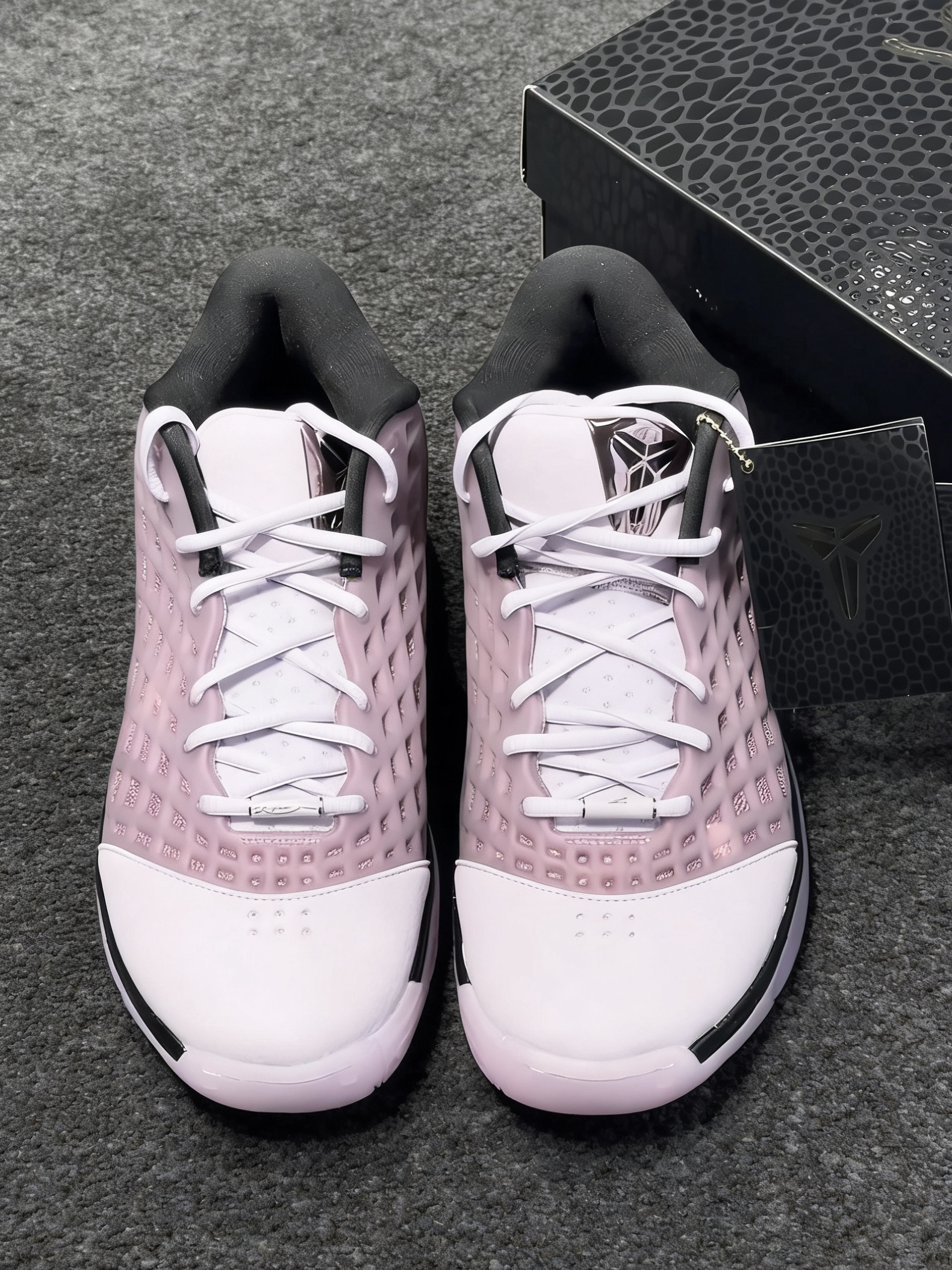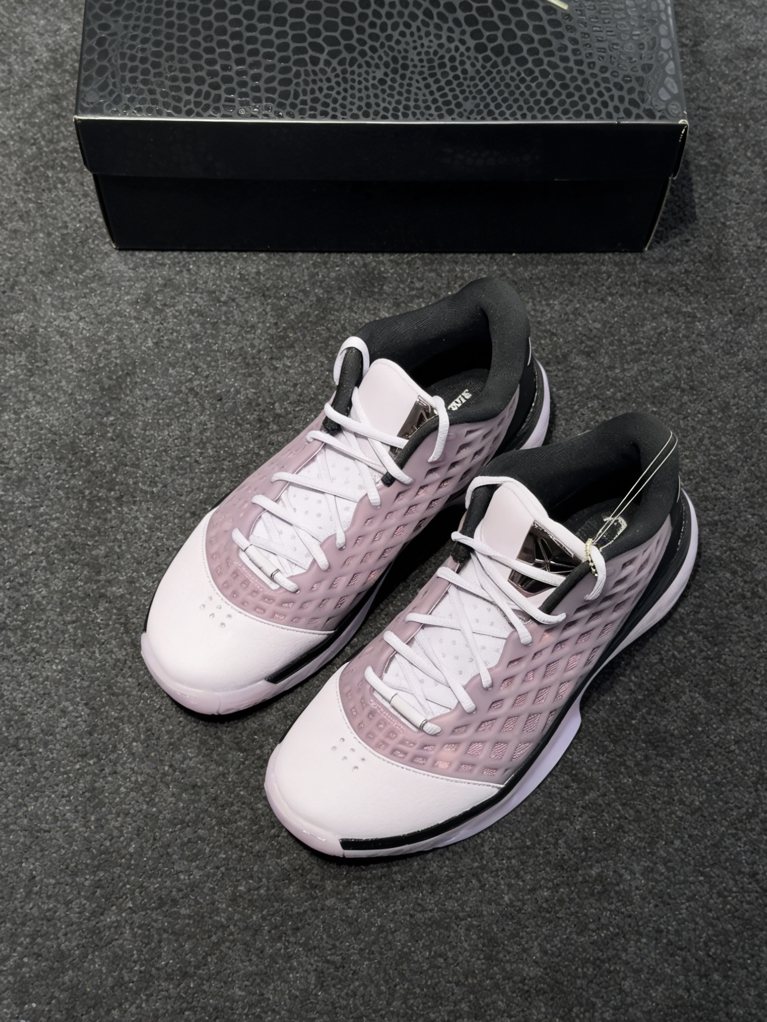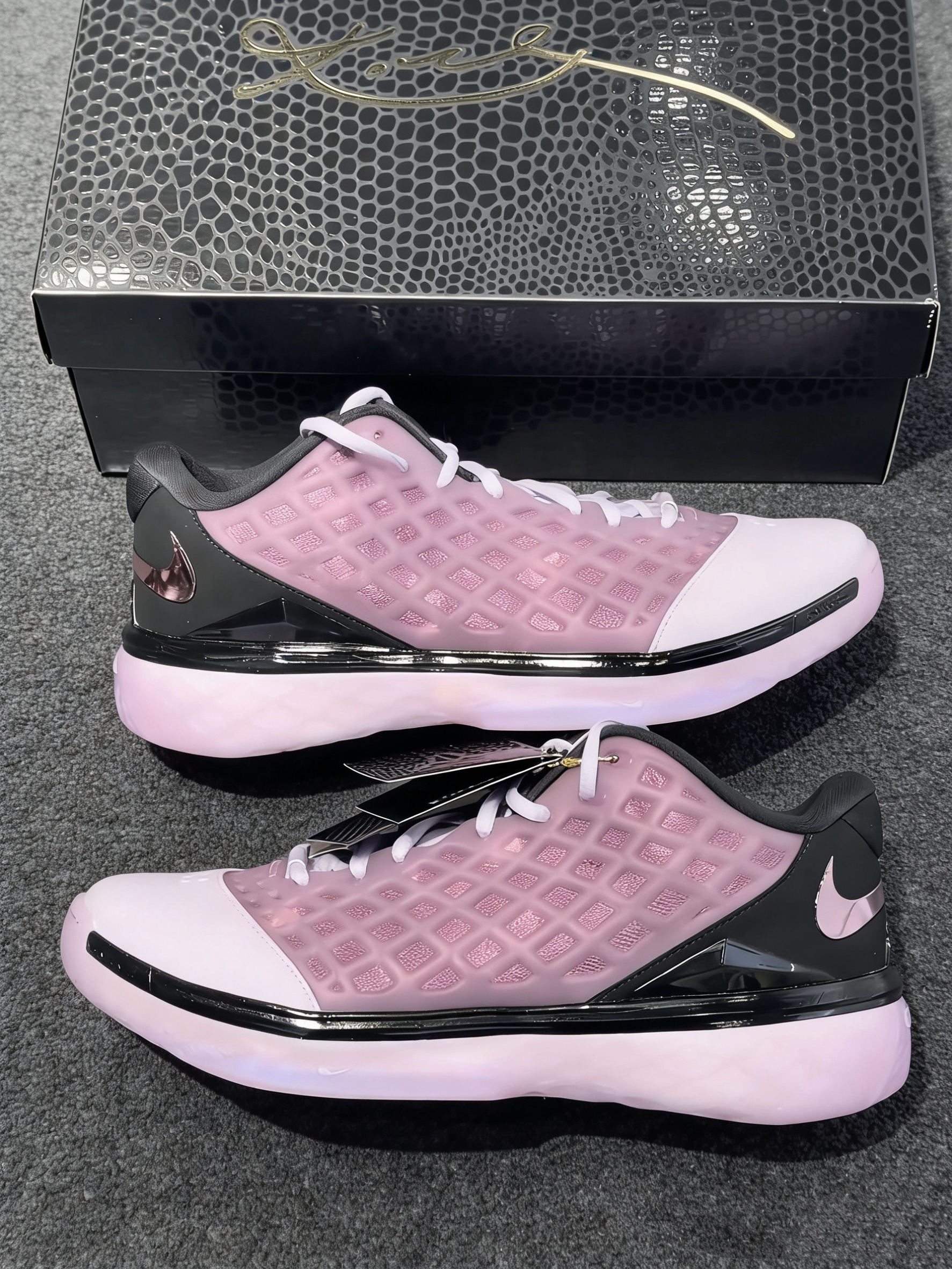 鞋身完美还原了ZK3标志性的网格状工程网布设计,半透明的材质自带通透质感,既能看清鞋身内部的细节,又把当年的经典设计1:1复刻到位,鞋跟的金属光泽Swoosh搭配黑色鞋尾,和粉紫鞋身形成了恰到好处的反差感,细节控直接狂喜。就连中底都做了淡粉渐变的幻彩处理,在光线下自带细腻的光泽感,每一处细节都拉满了诚意。