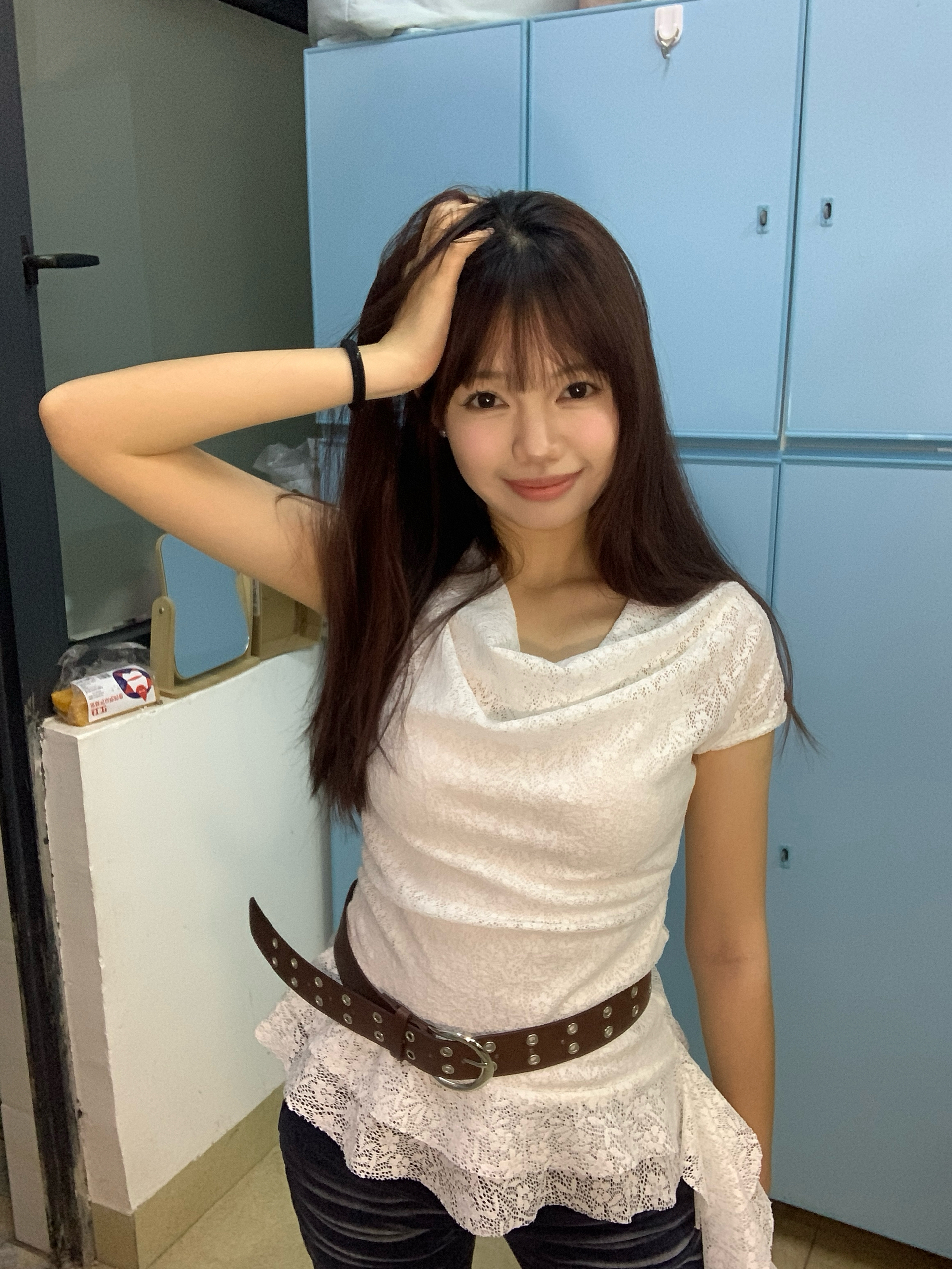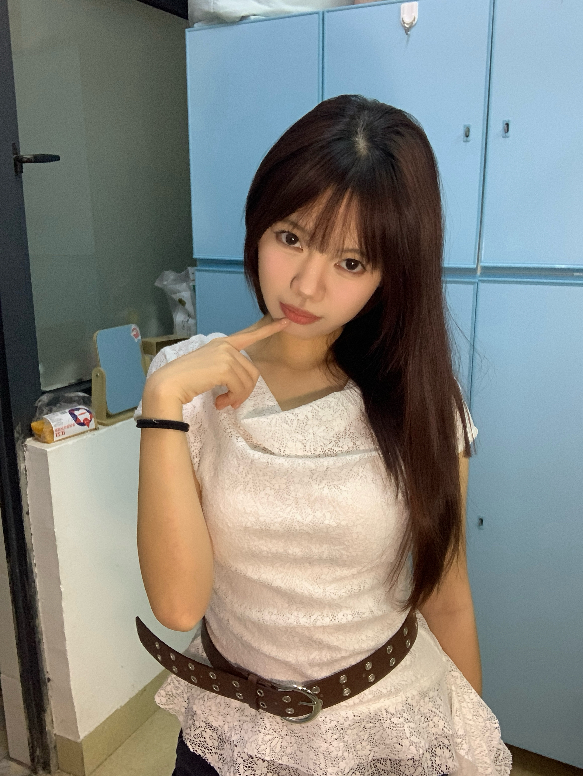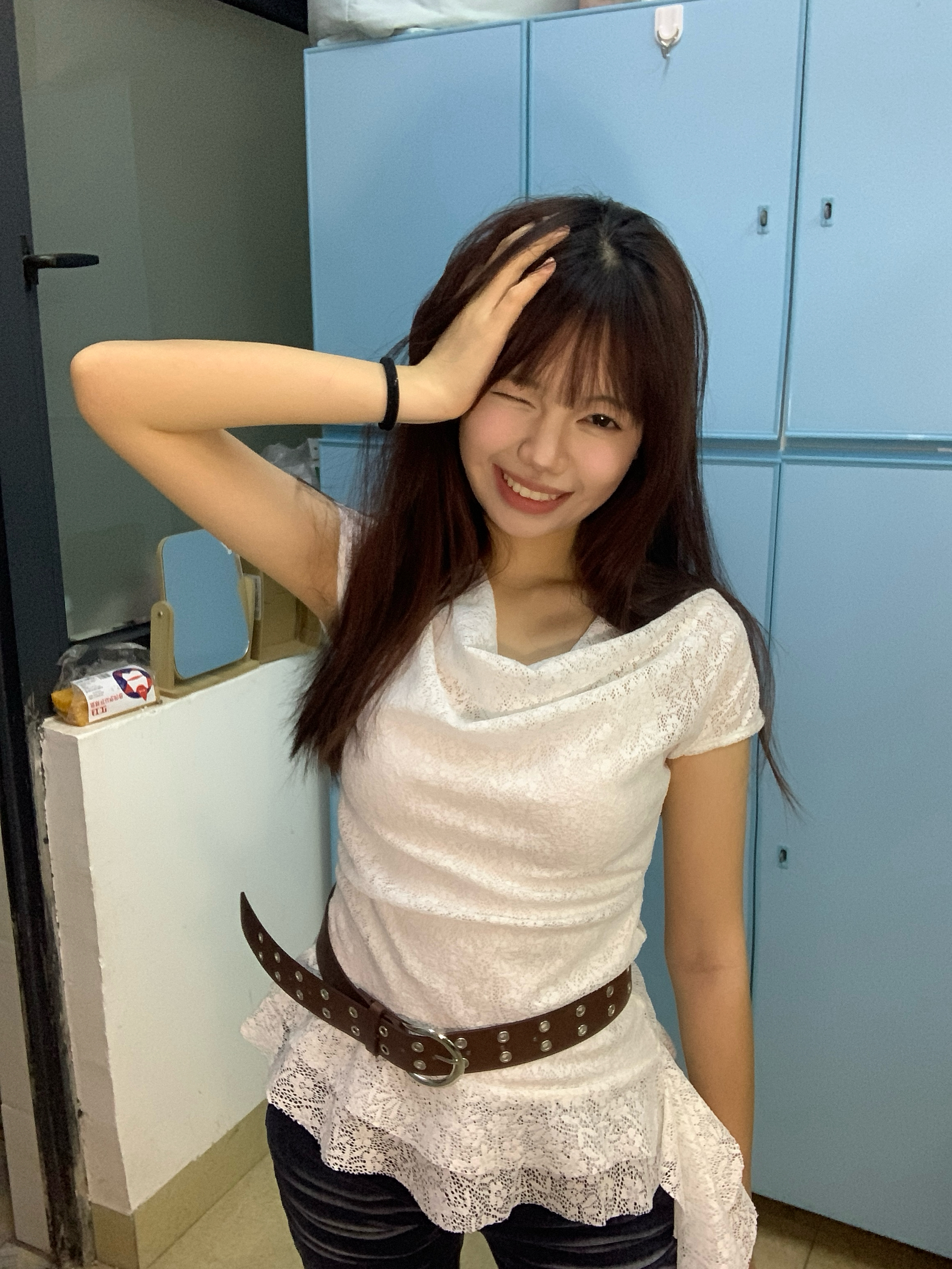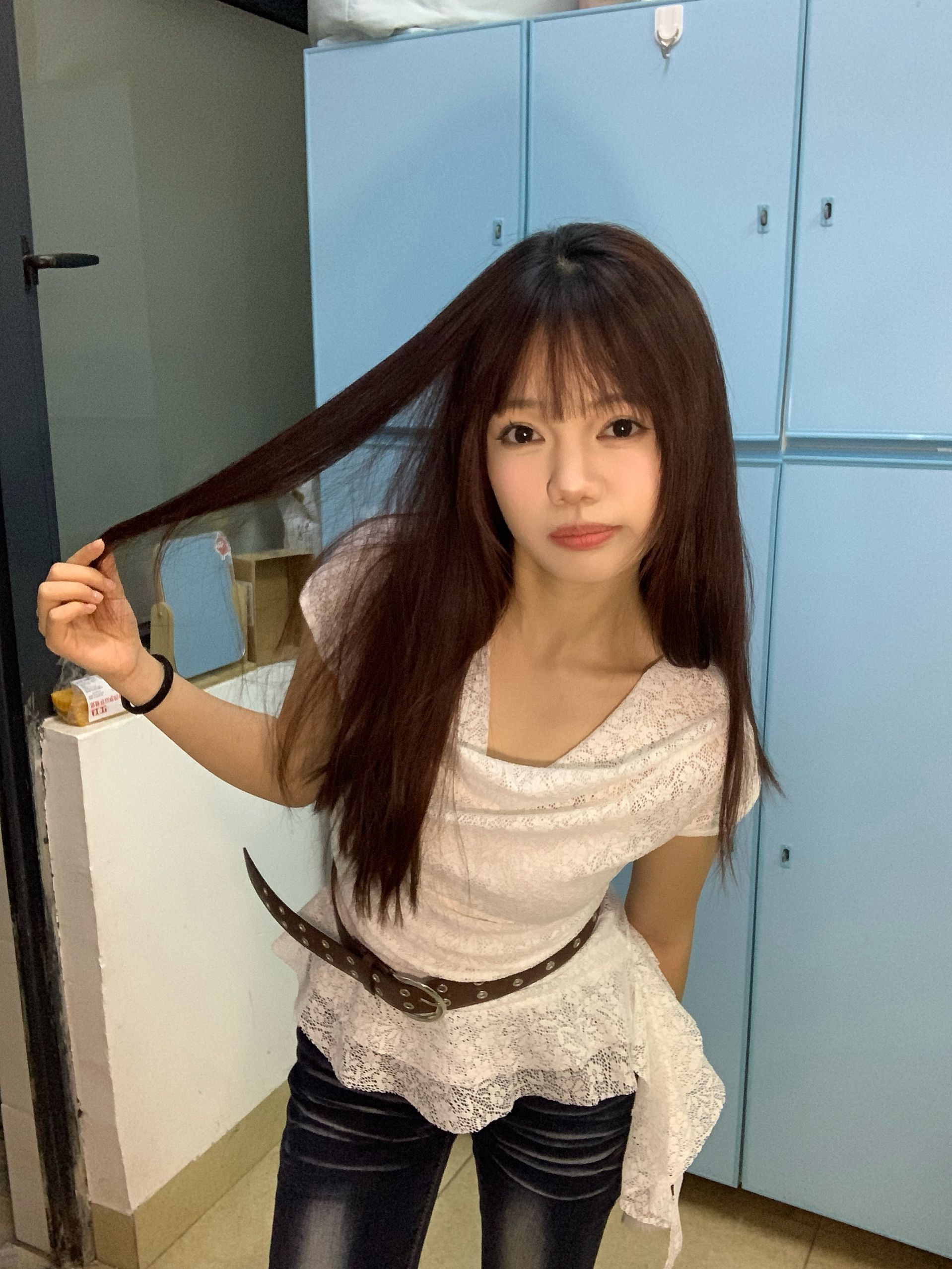 身高|体重:160 90 🧍♂️ 穿搭风格:许妍风 👔 上衣:不规则下摆蕾丝上衣 👖 下装:牛仔裤 🎒配饰:珍珠耳钉
