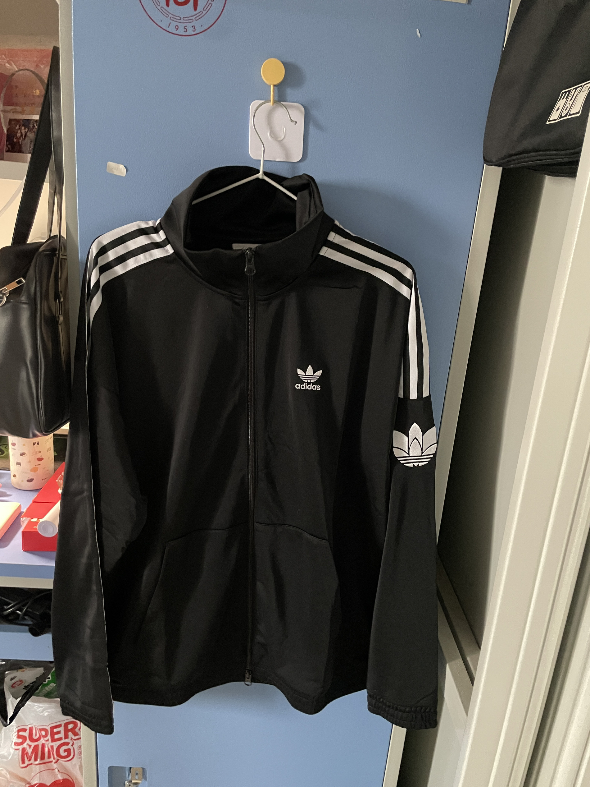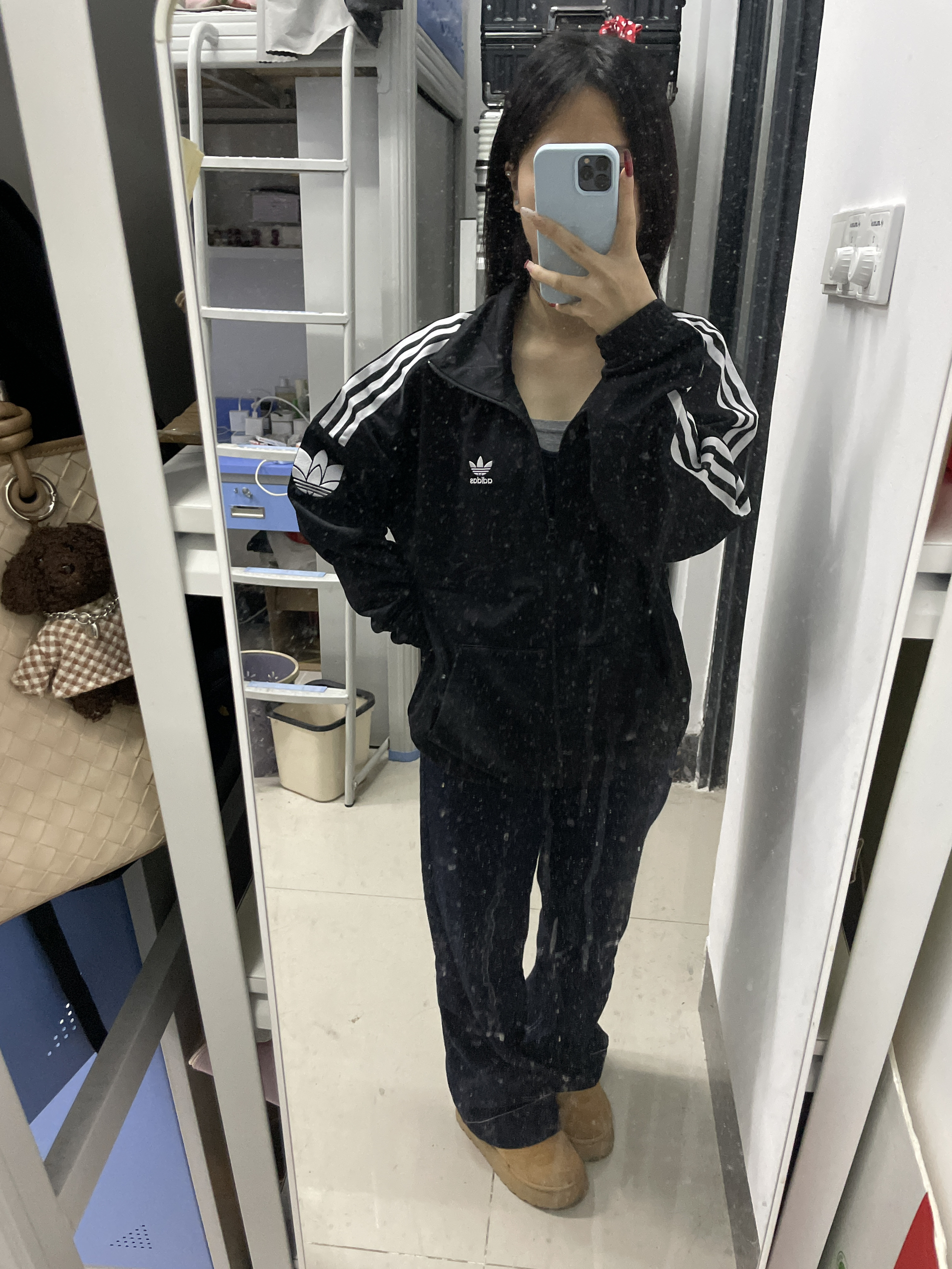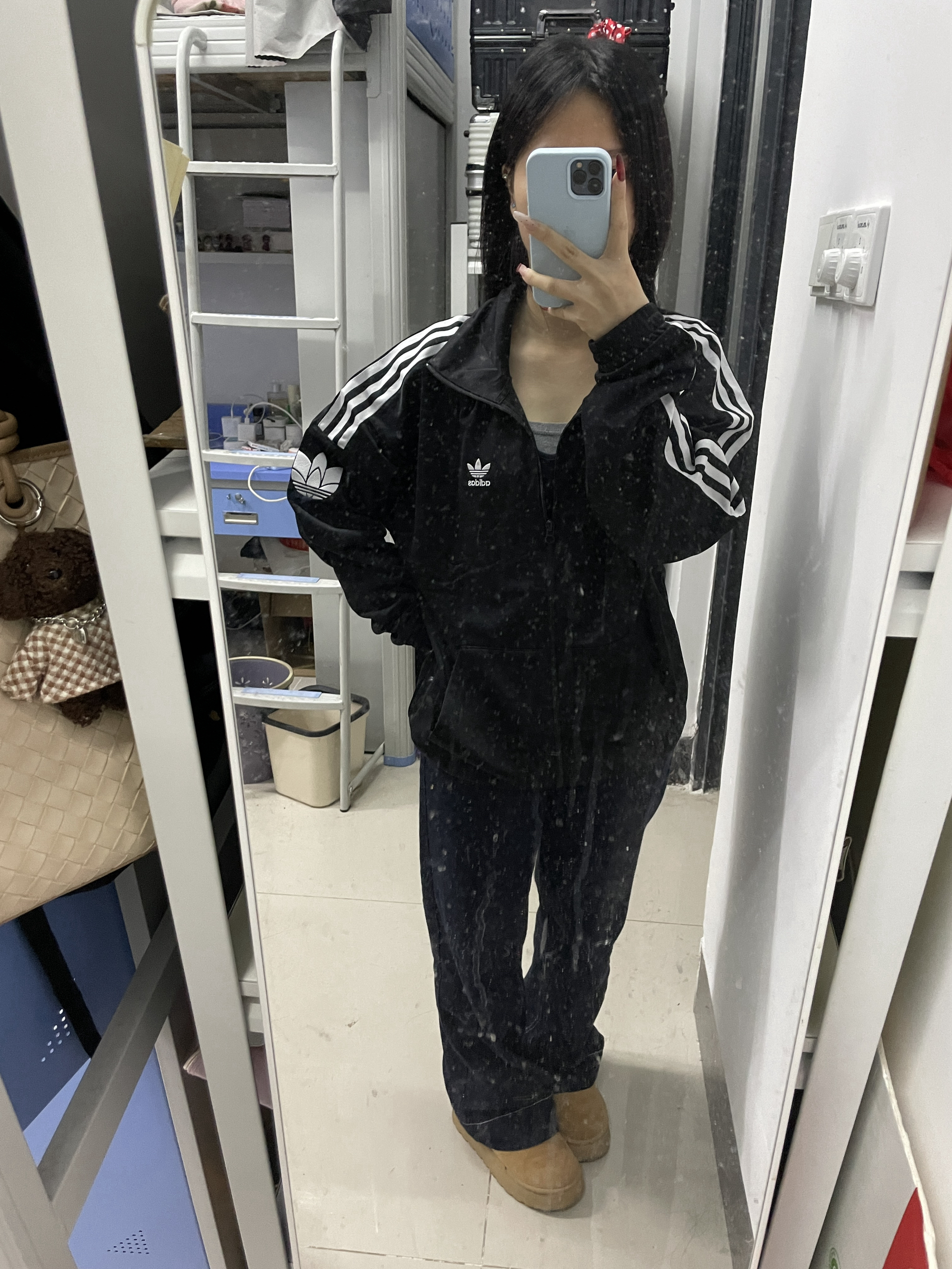 被阿迪JL8396这件丝绒外套狠狠拿捏了✨ 经典黑底白三条杠设计,丝绒面料自带高级雾面光泽,宽松版型慵懒又藏肉,胸口小logo低调有细节,随便搭条牛仔裤和勃肯鞋,随性酷感直接拉满,甜酷女孩的本命外套没跑了!