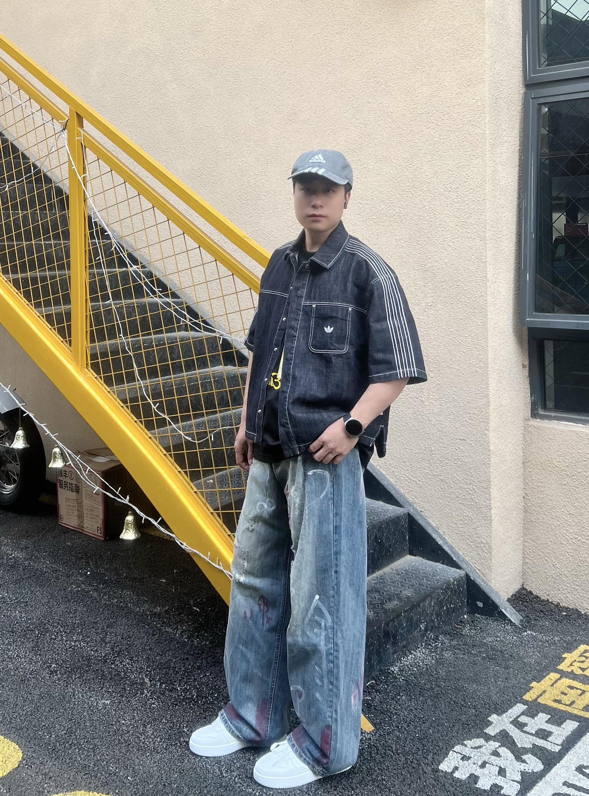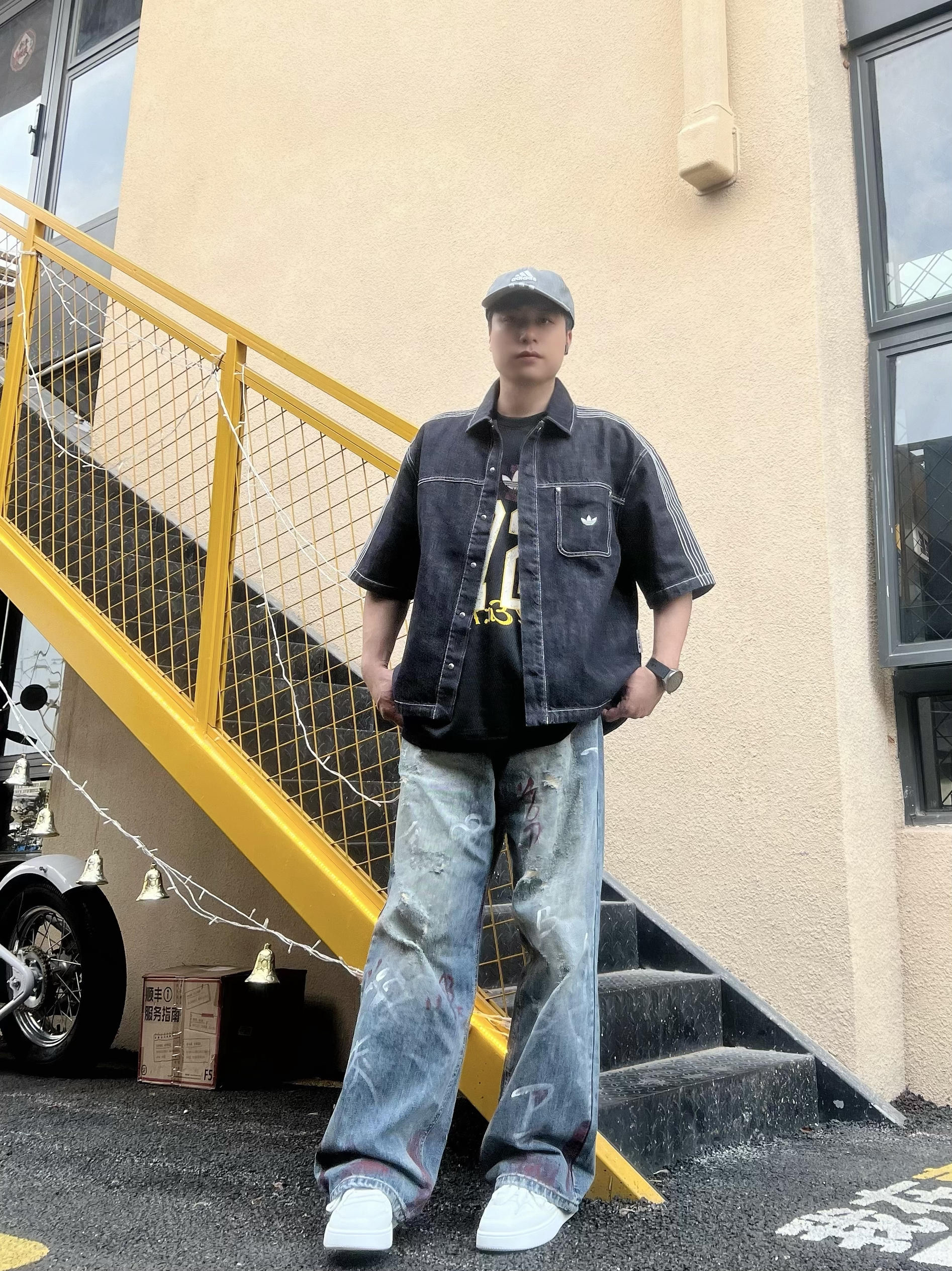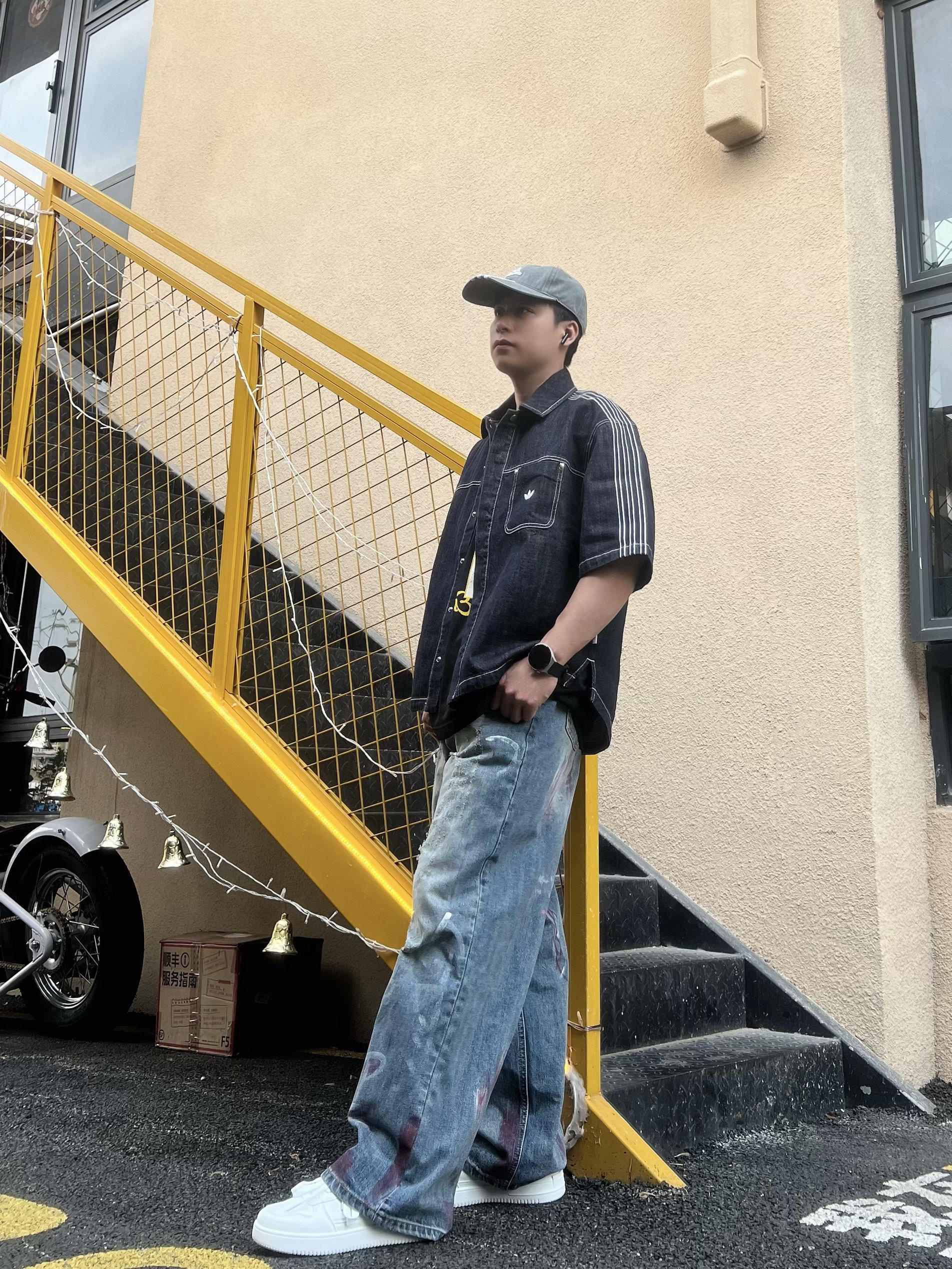 夏天真的不想在穿搭上费脑子的兄弟👦直接锁死这套! 短袖牛仔衬衫完全解决了长袖牛仔闷汗的痛点📸透气挺括不软塌😎落肩版型对溜肩、宽肩都友好,小标+明线设计不浮夸,日常穿完全不突兀✨ 搭配做旧涂鸦阔腿牛👖一套上下呼应,不用费心想配色,内搭一件黑T就能出门💕 不管是日常通勤、周末出街还是和朋友约会都能穿🔥