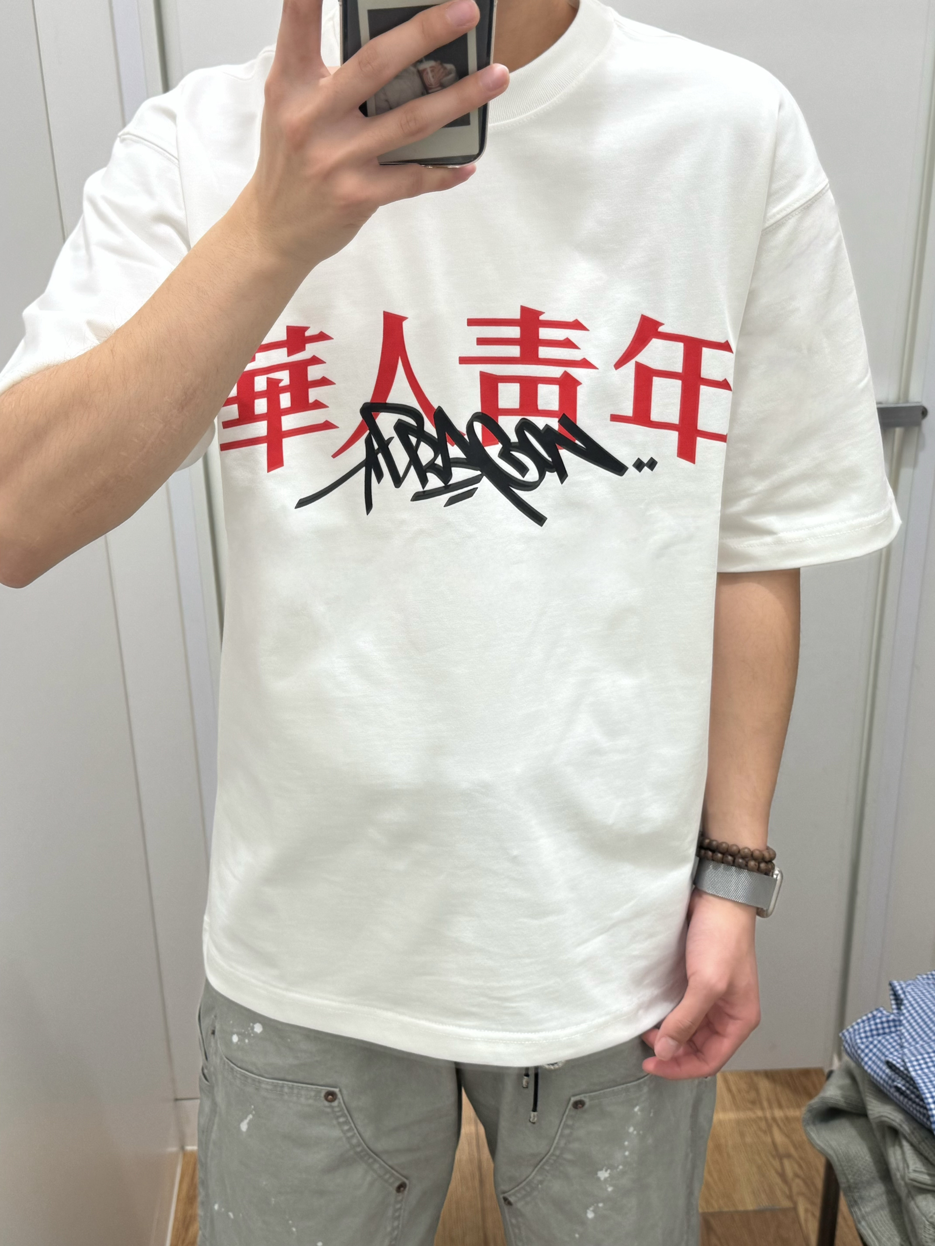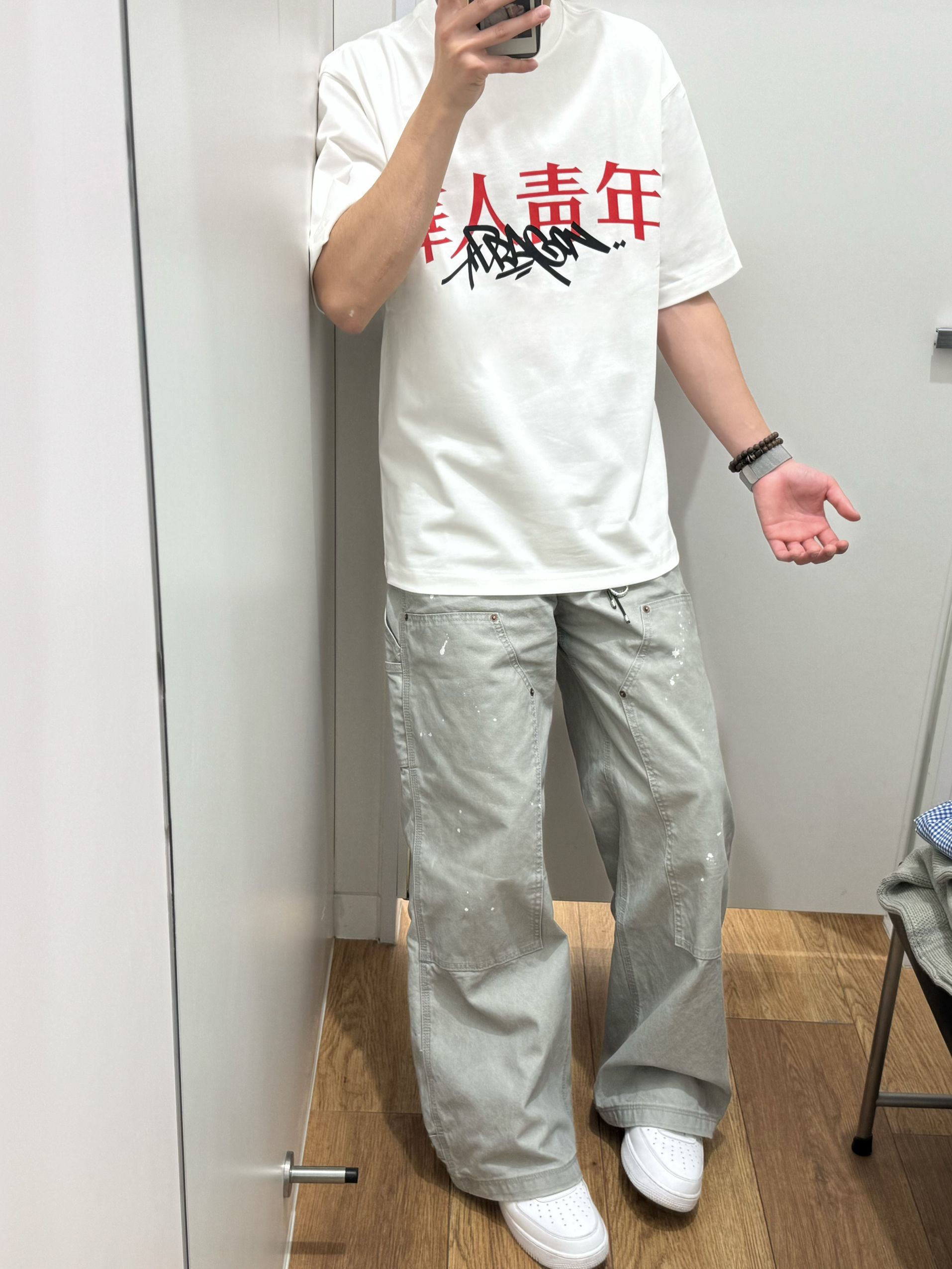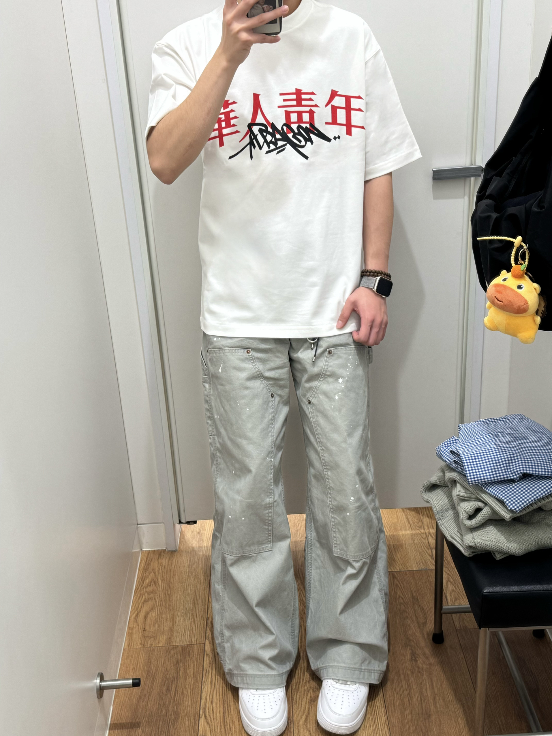 👕 最近超爱这套!华人青年白T版型很正,落肩设计不挑身材,红黑印花很有辨识度,配浅灰泼墨工装裤,宽宽松松的很舒服,夏天穿不闷汗,配小白鞋就是干净少年感,日常出门随便一套就很耐看。