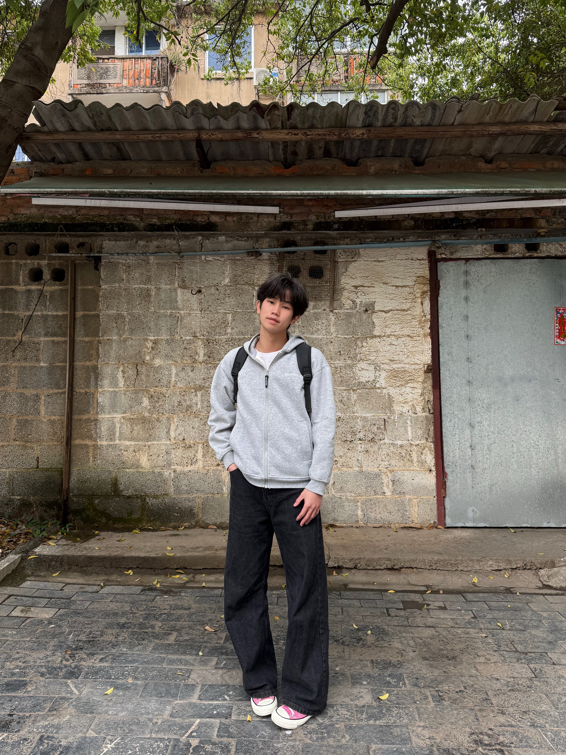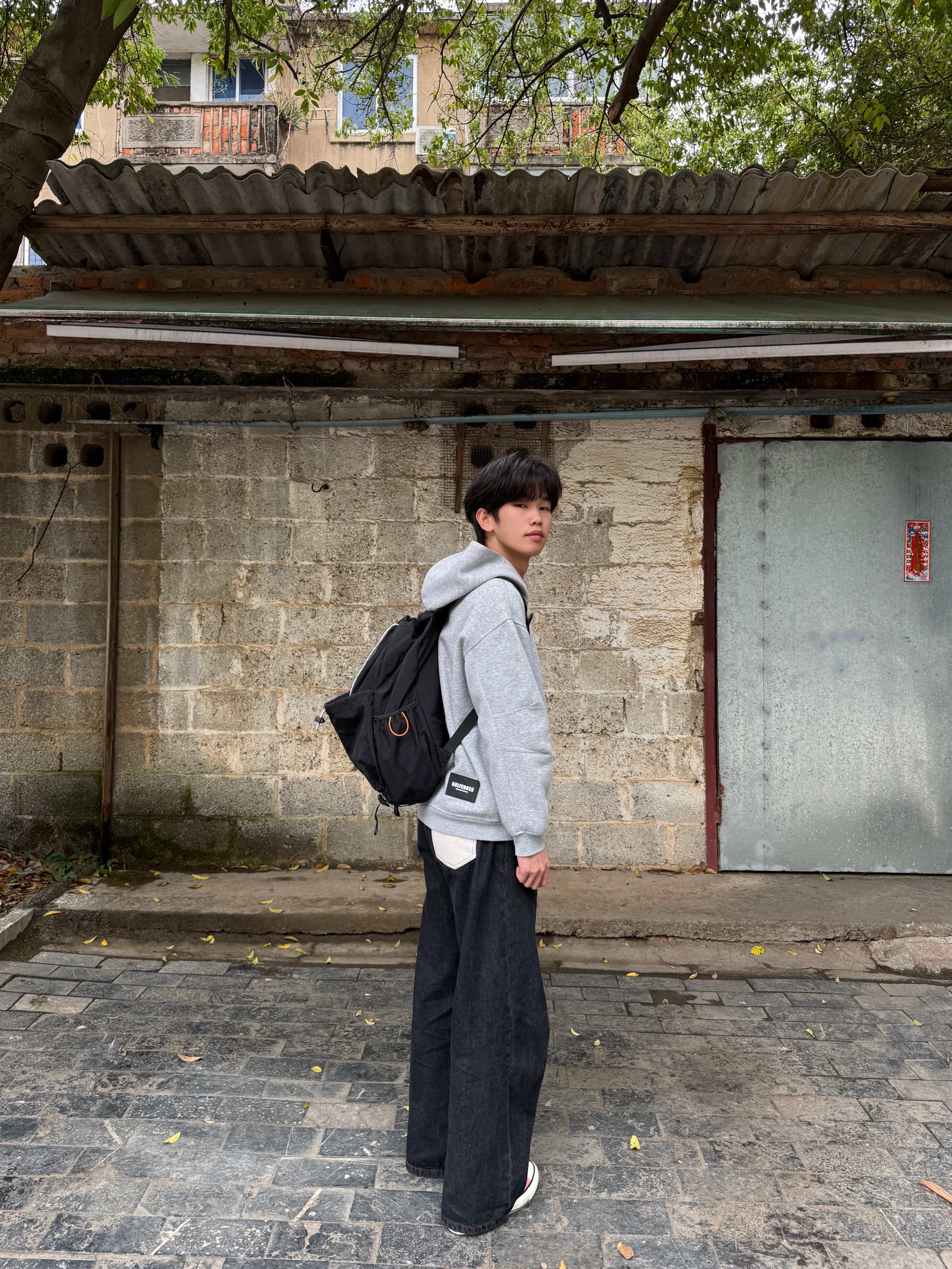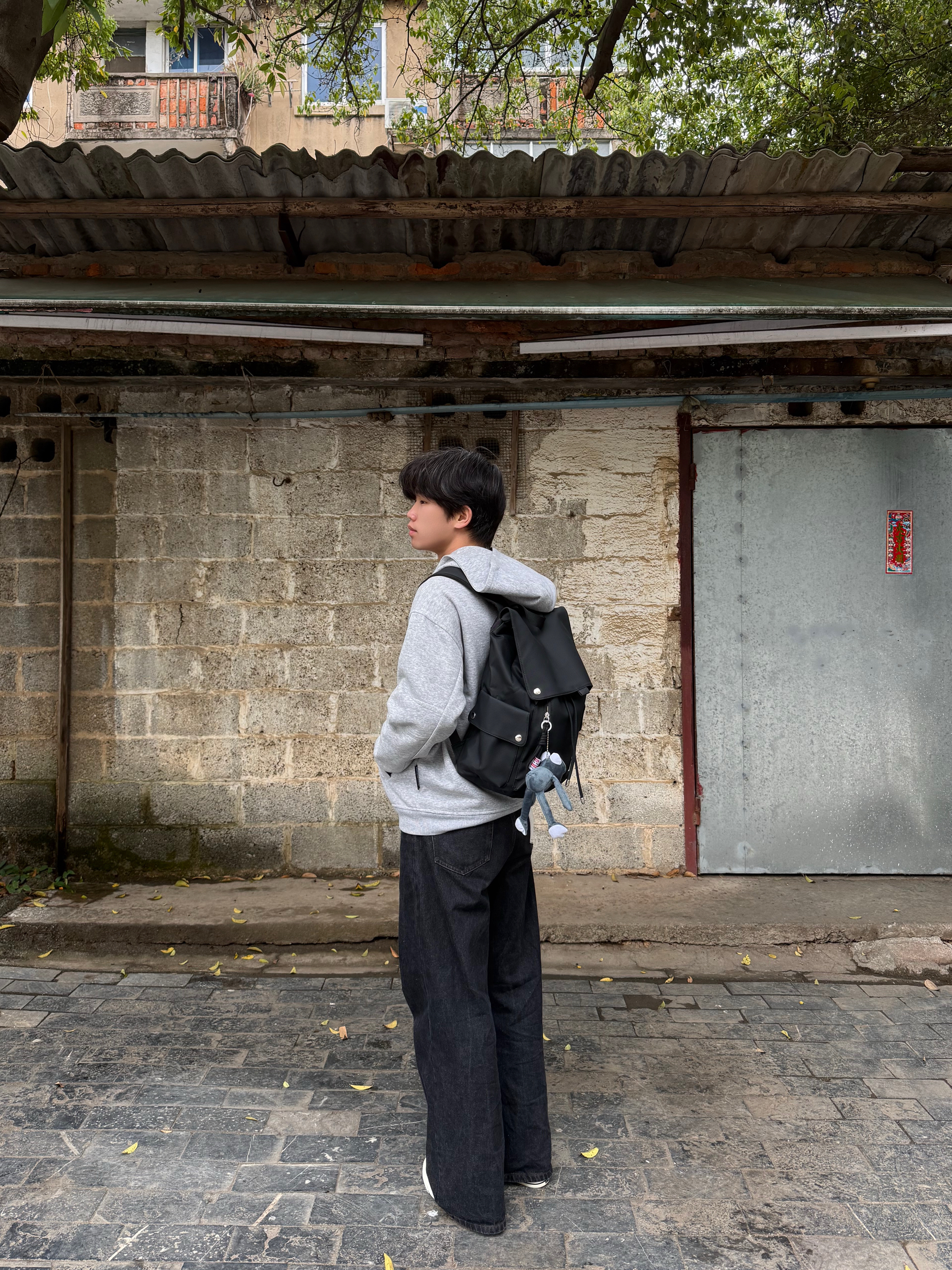 周末在老巷子里晃悠,随手拍了张ootd~ 浅灰色连帽卫衣软乎乎的,宽松版型真的藏肉又舒服,随便搭都很有少年感👕 黑灰色阔腿牛仔裤是本命!垂感满满👍 小个子也能轻松驾驭👖 再背个黑色双肩包,挂个可爱的小挂饰,瞬间就有那味儿了~ 整体灰黑配色干净又耐看,春日出门散步、上课都超合适,慵懒感直接拉满💯