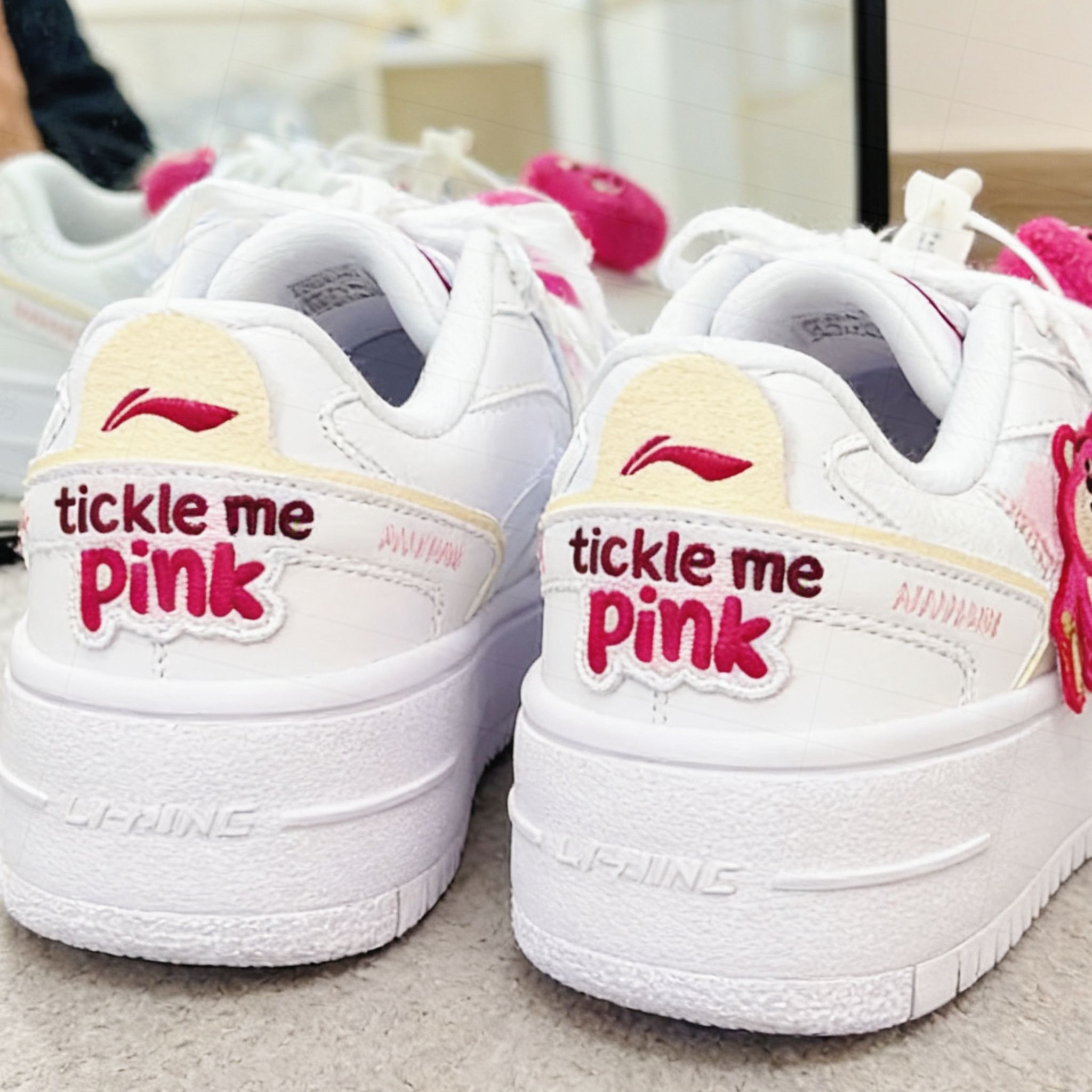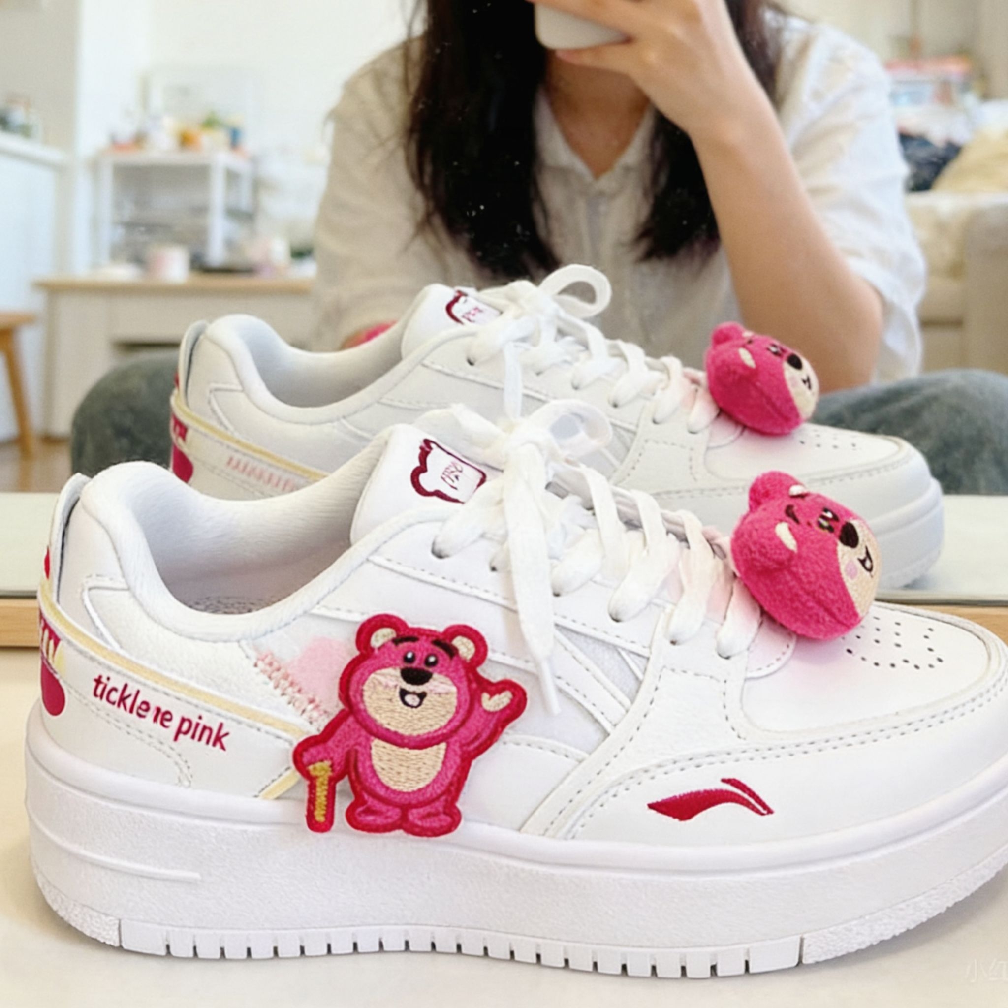 厚底踩上去软软的,逛街走久也不累。侧边刺绣小熊+鞋带挂饰的细节真的绝,粉色“tickle me pink”字样俏皮加分。鞋型显脚小,配裙子或阔腿裤都好看。 室内随便拍了几张(光线有点暗),但鞋子的粉白配色很清新。纯分享给喜欢甜酷风的姐妹~