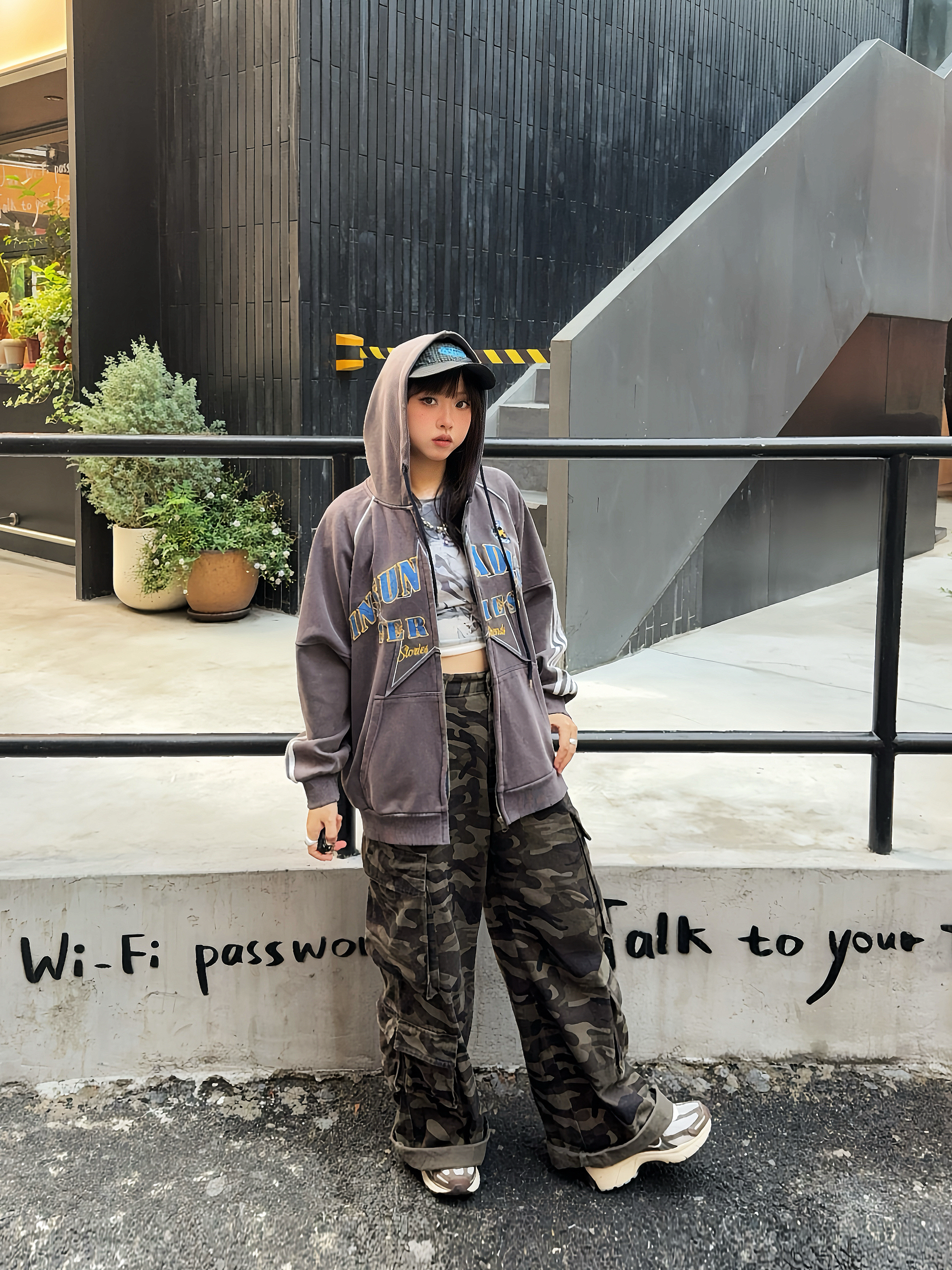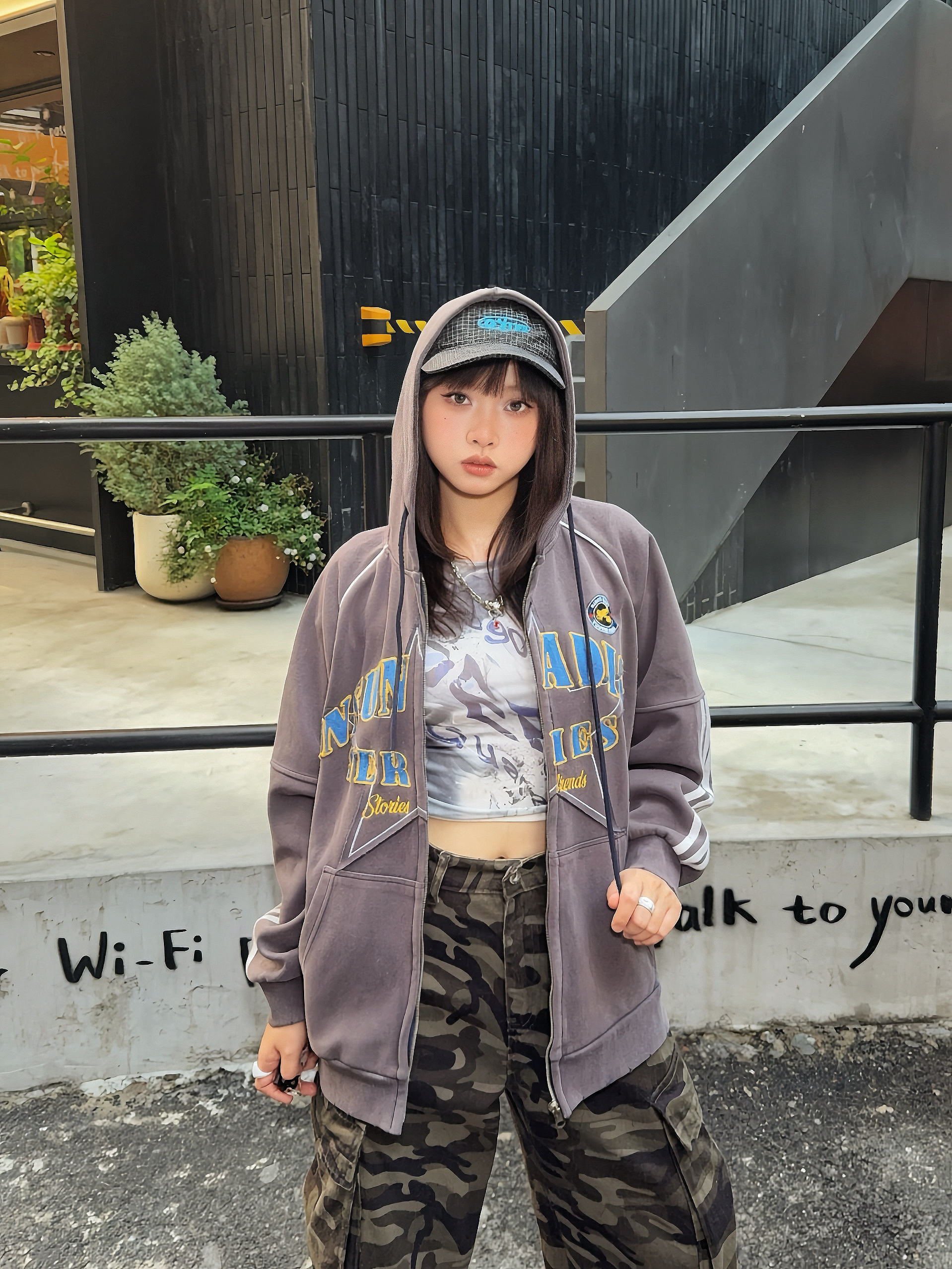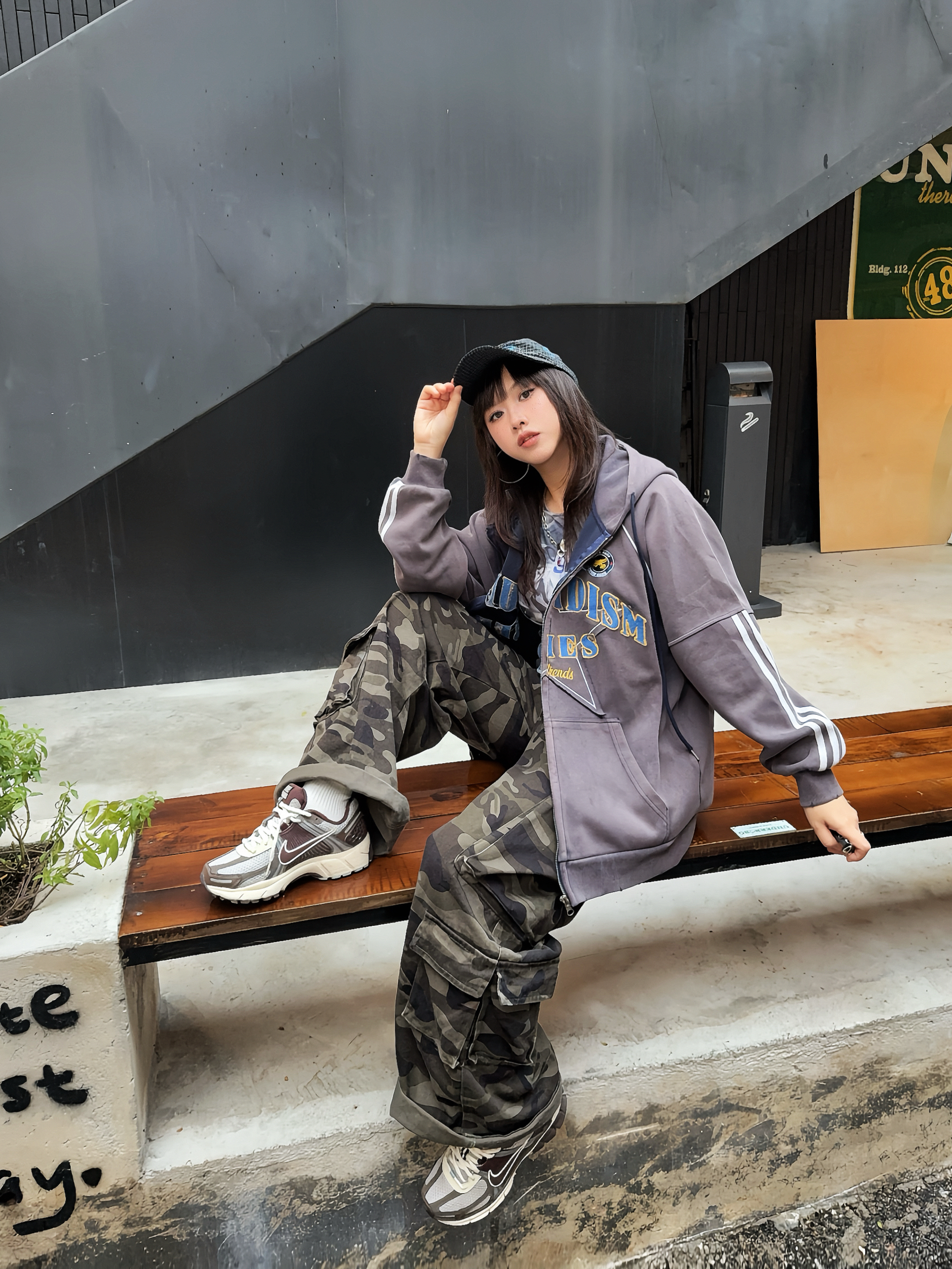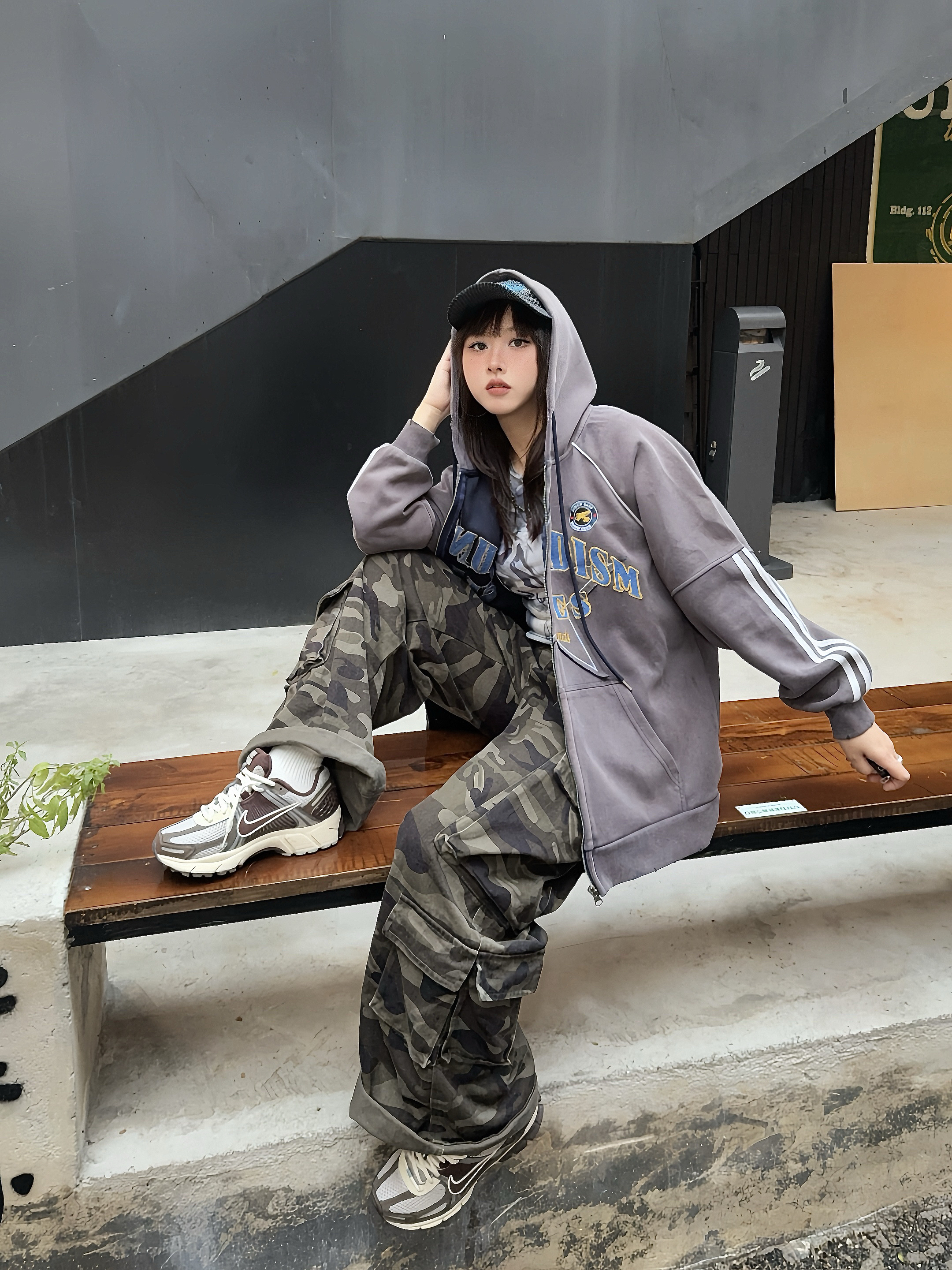 美式感低饱和度色系穿搭🚏马年ootd又酷又辣🔥 ☑️灰色系开衫卫衣搭配迷彩工装裤,整个穿搭很有美式vibe~ 💙还搭配了蓝色棒球帽,跟上衣的印花相呼应上,整个look更有亮点✨,👟鞋子也搭配棕色系复古跑鞋,这么搭hin有质感!