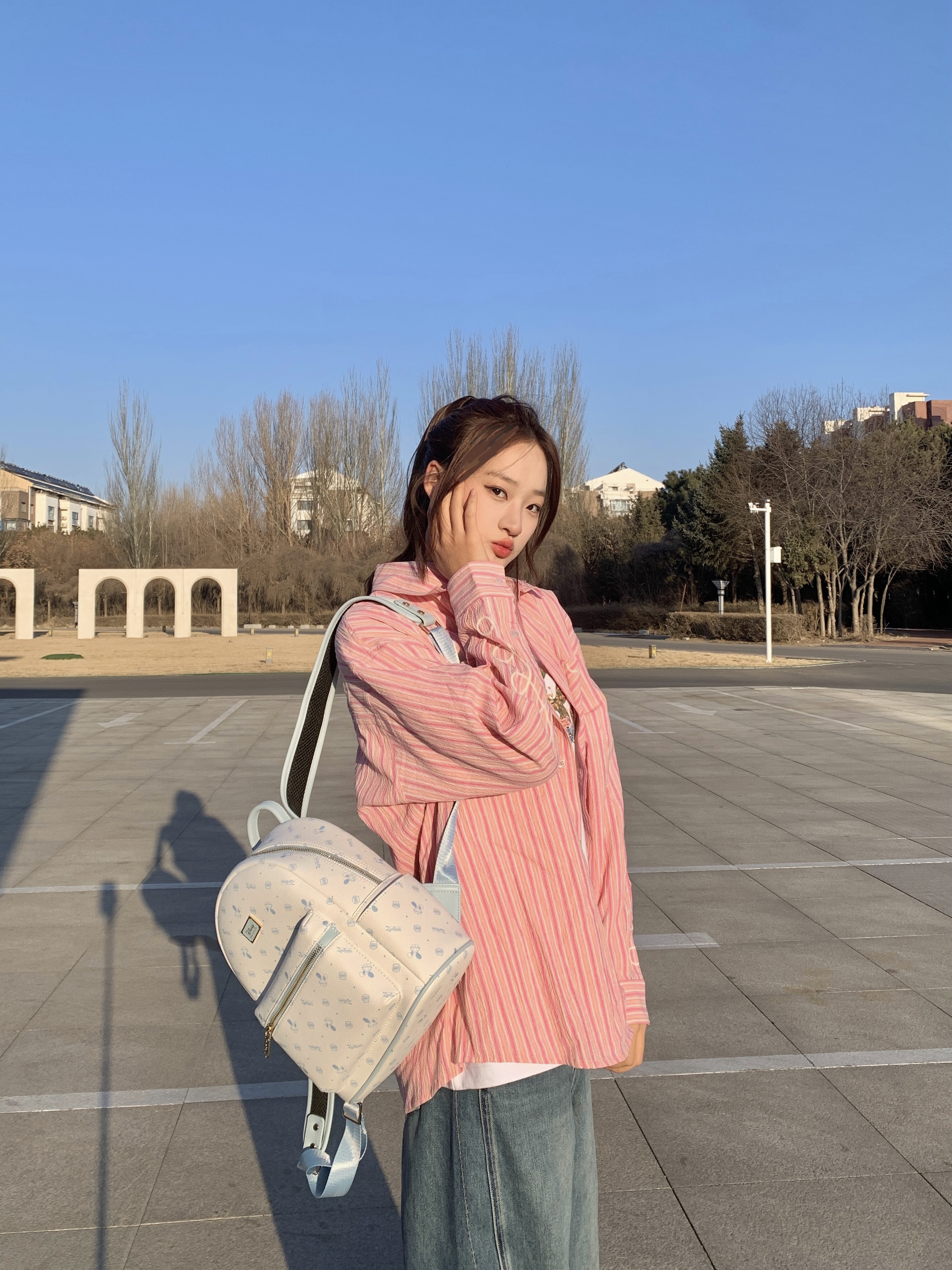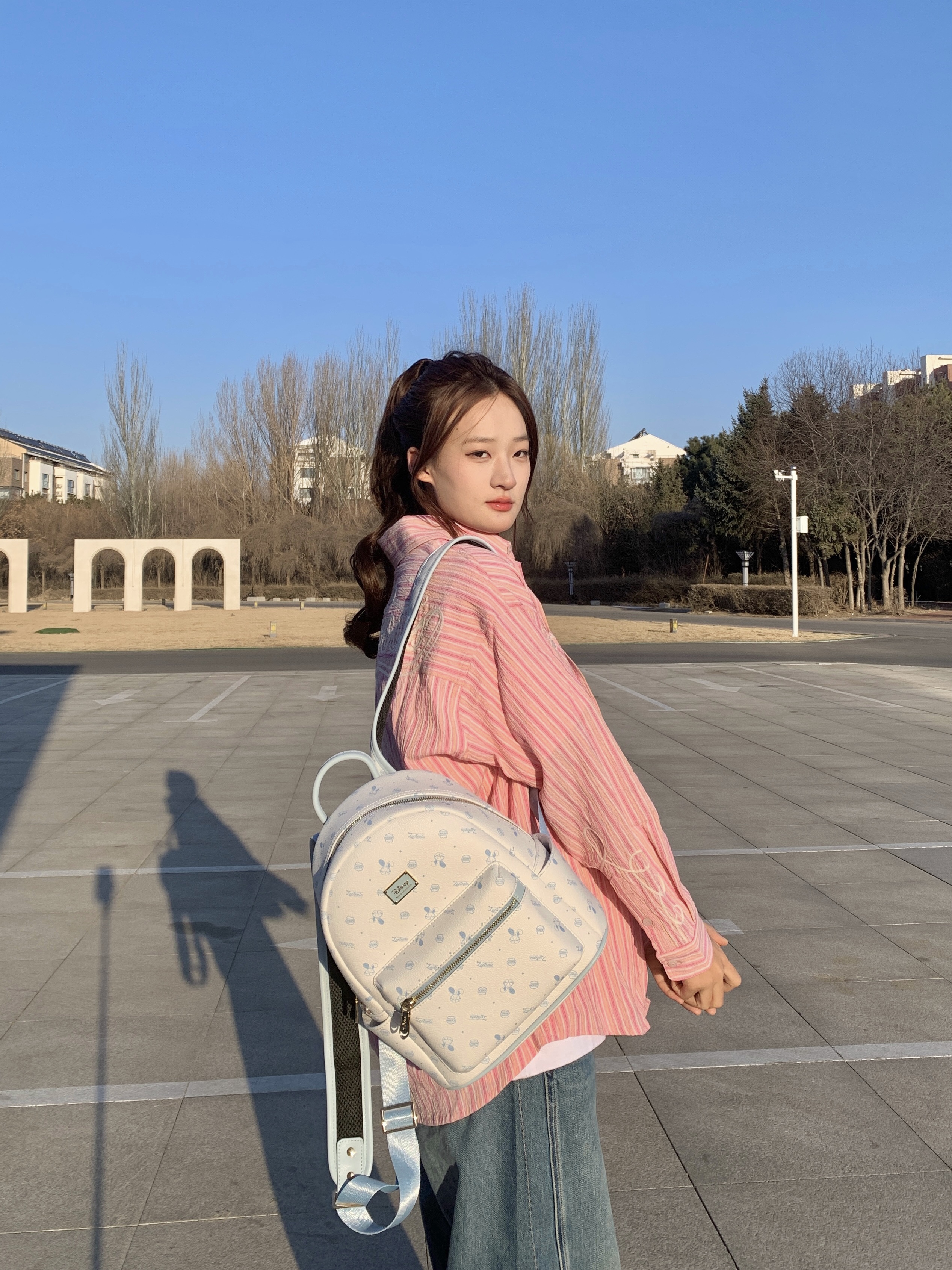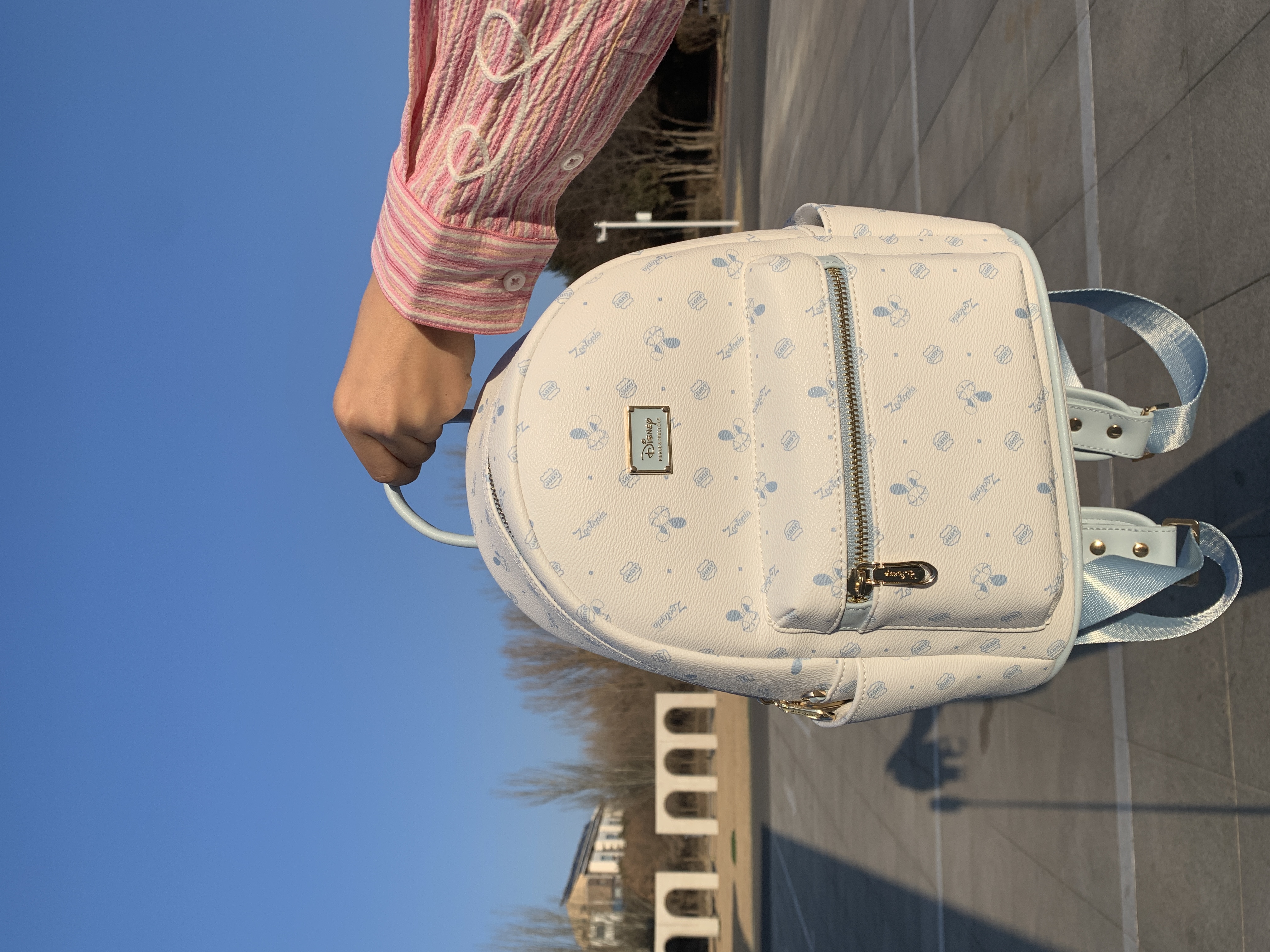 我宣布这是我今年挖到最适合我的双肩包🥹 早八赶课的时候,我把课本、iPad、水杯一股脑塞进去都没问题,小小的又方便又好看📚 奶白配浅蓝的唐老鸭满印,我搭卫衣衬衫都好看💙 皮质硬硬的很耐造,我不小心蹭到墙也没留印,放地上站点土 一擦就干净了 背着它去图书馆泡一下午,而且肩带软软的还不压肩,再也不会背得肩膀酸痛啦👌