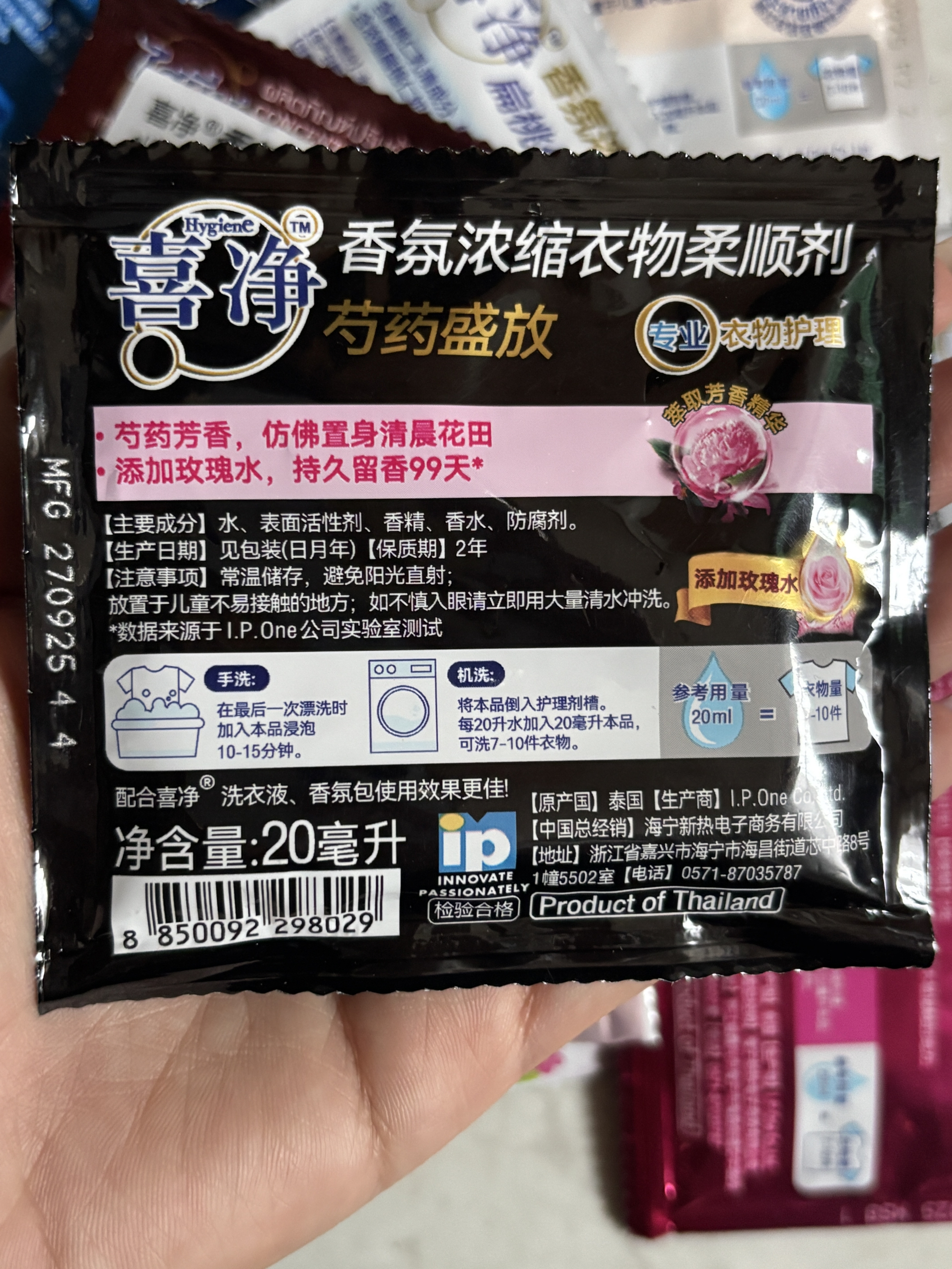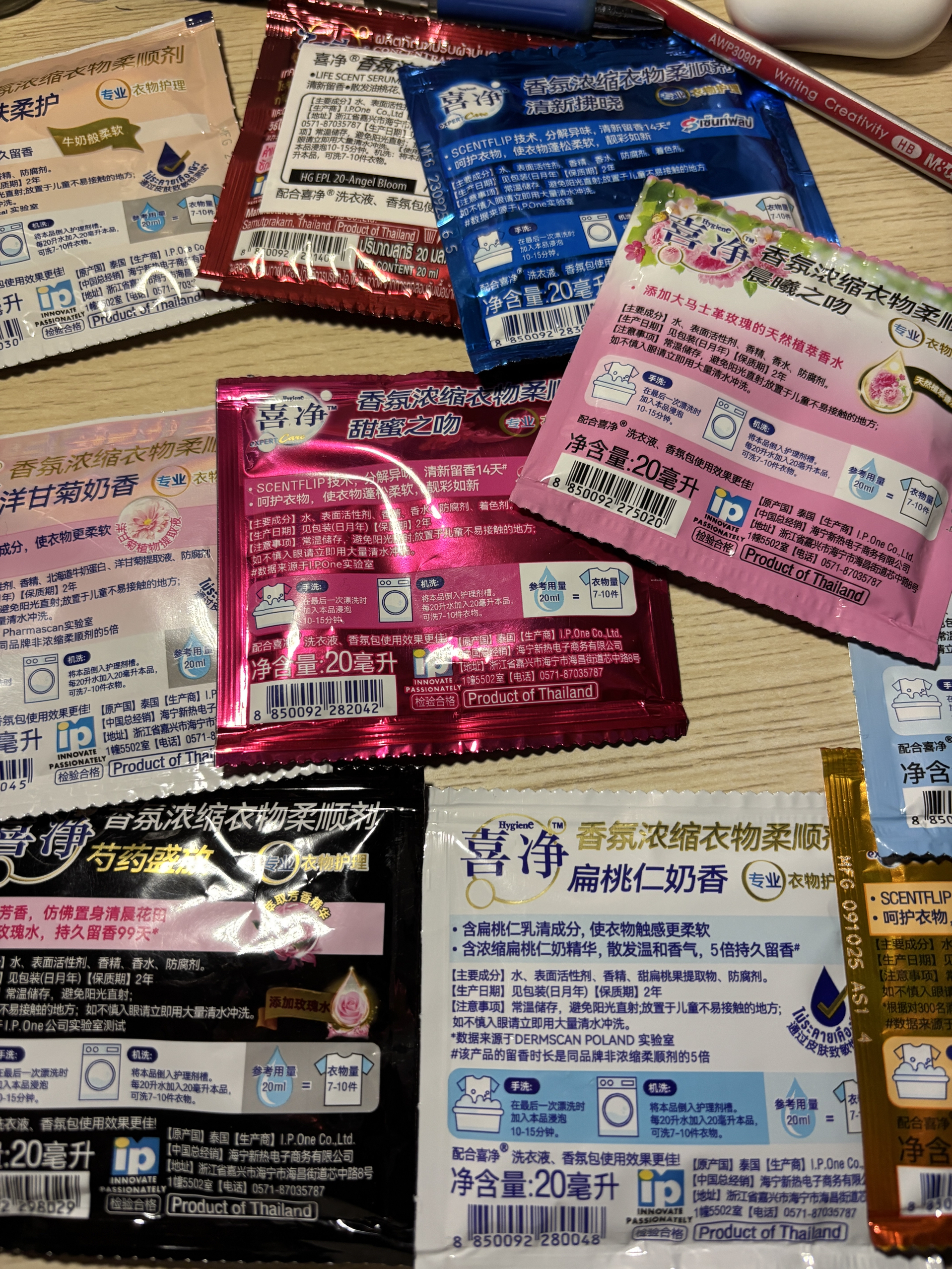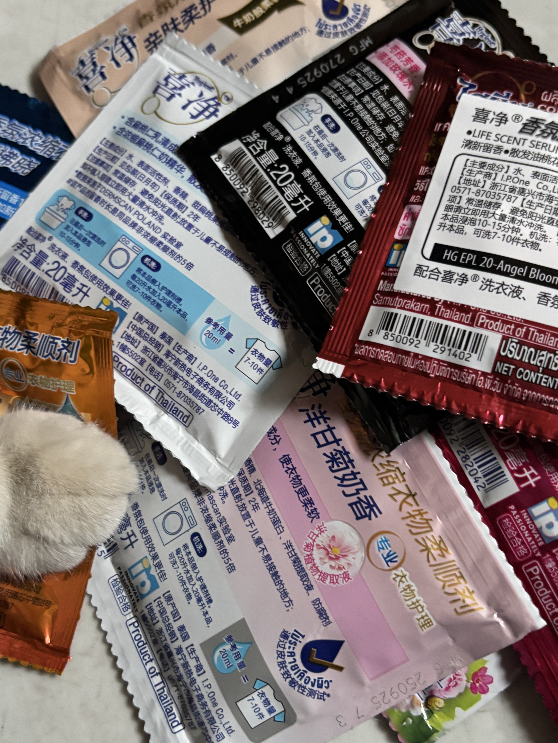 本篇笔记关联了Hygiene/喜净 纤维养护 衣物柔顺剂 20ml/袋 多香型组合装 防静电浸泡持久留香 10香型等商品,为用户提供真实的使用体验和购买参考。