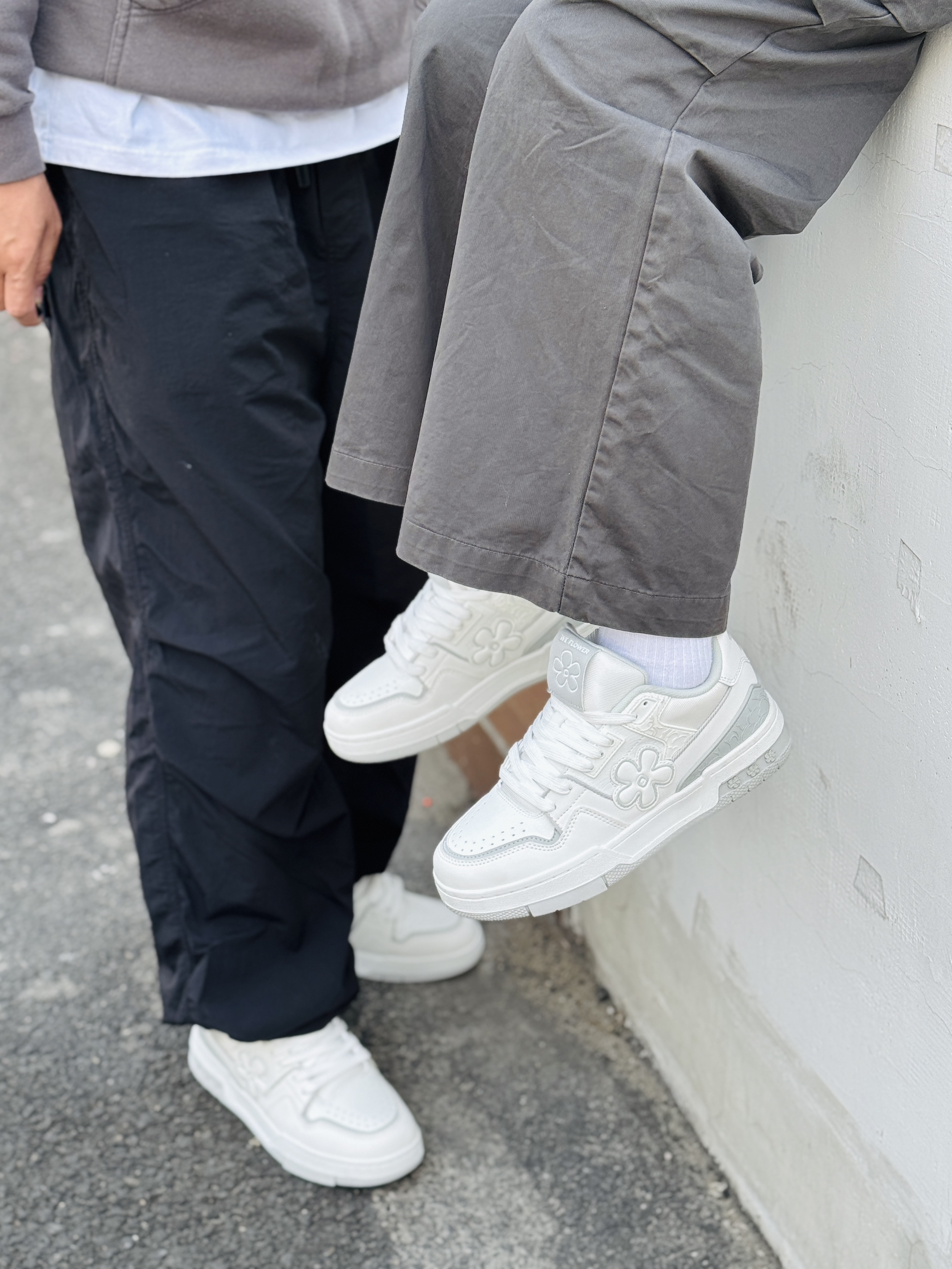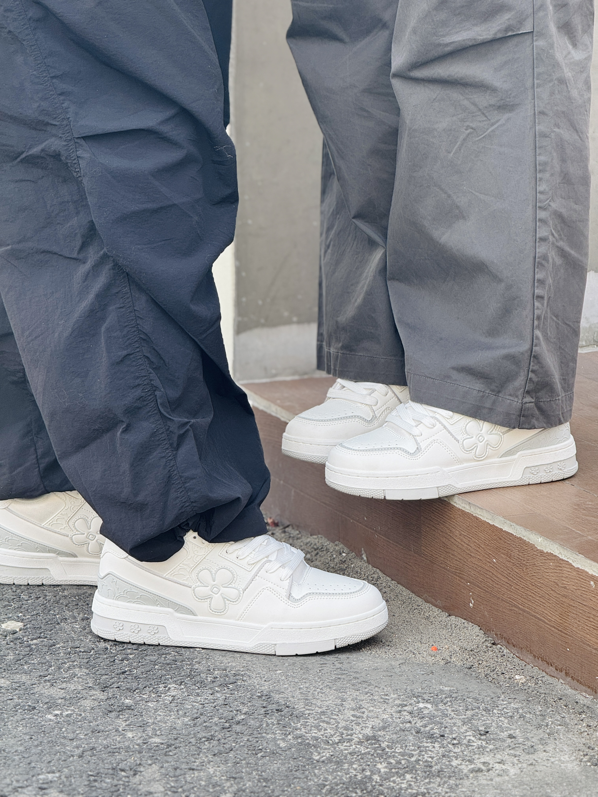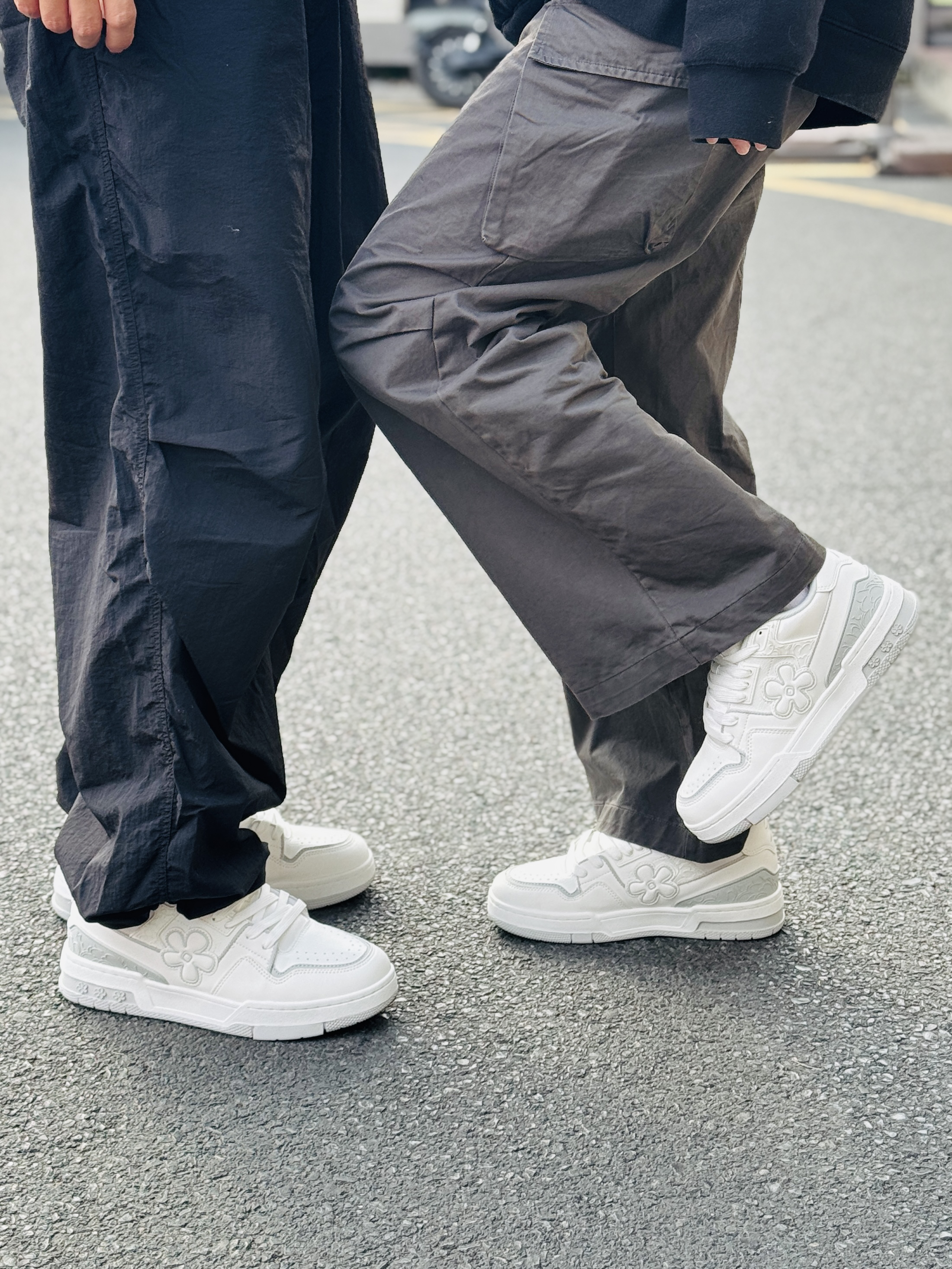 今天跟对象压马路,特意整了双情侣鞋,没想到回头率直接拉满👫 👟 WE FLOWER 这双小白鞋真的绝了: • 鞋身是细腻的皮革材质,摸起来软乎乎的,上脚巨舒服,走一天都不磨脚✨ • 侧面的花朵浮雕设计太戳我了,不是那种幼稚的图案,低调又有细节,情侣款的小心机直接拉满💘 • 纯白+浅灰的配色,干净又百搭,不管搭黑灰卫衣还是阔腿裤,都能hold住,懒人情侣穿搭福音🤙 今天我们搭了黑灰连...
