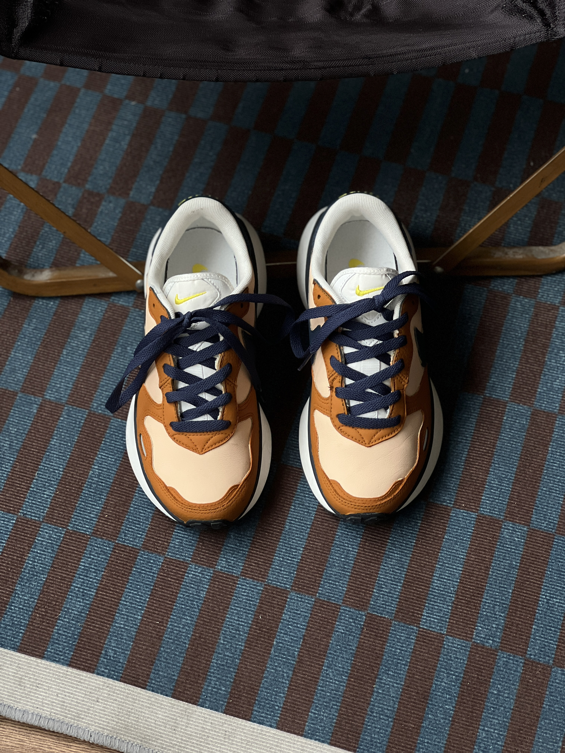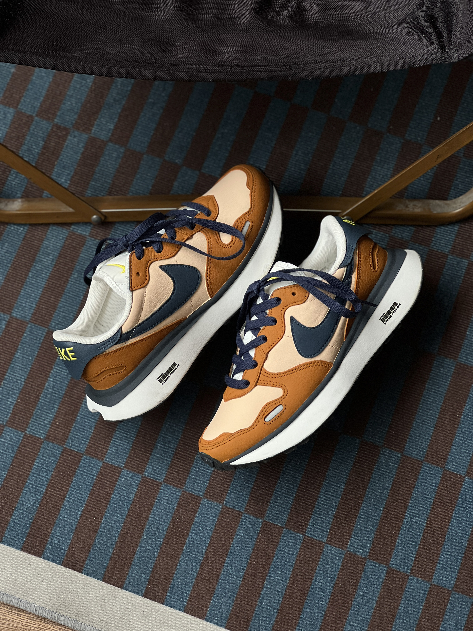 焦糖棕揉着奶杏温柔,藏青鞋带点睛灵动 这双Nike Phoenix Waffle「城市漫步」定制款,把复古与鬼马平衡得刚好。经典华夫底踩出软糯脚感,皮革拼接的层次肌理,适配户外徒步也hold住城市通勤。情侣同穿解锁默契氛围感,单穿亦是复古穿搭的点睛之笔,一双鞋,承包四季的潮流与自在。