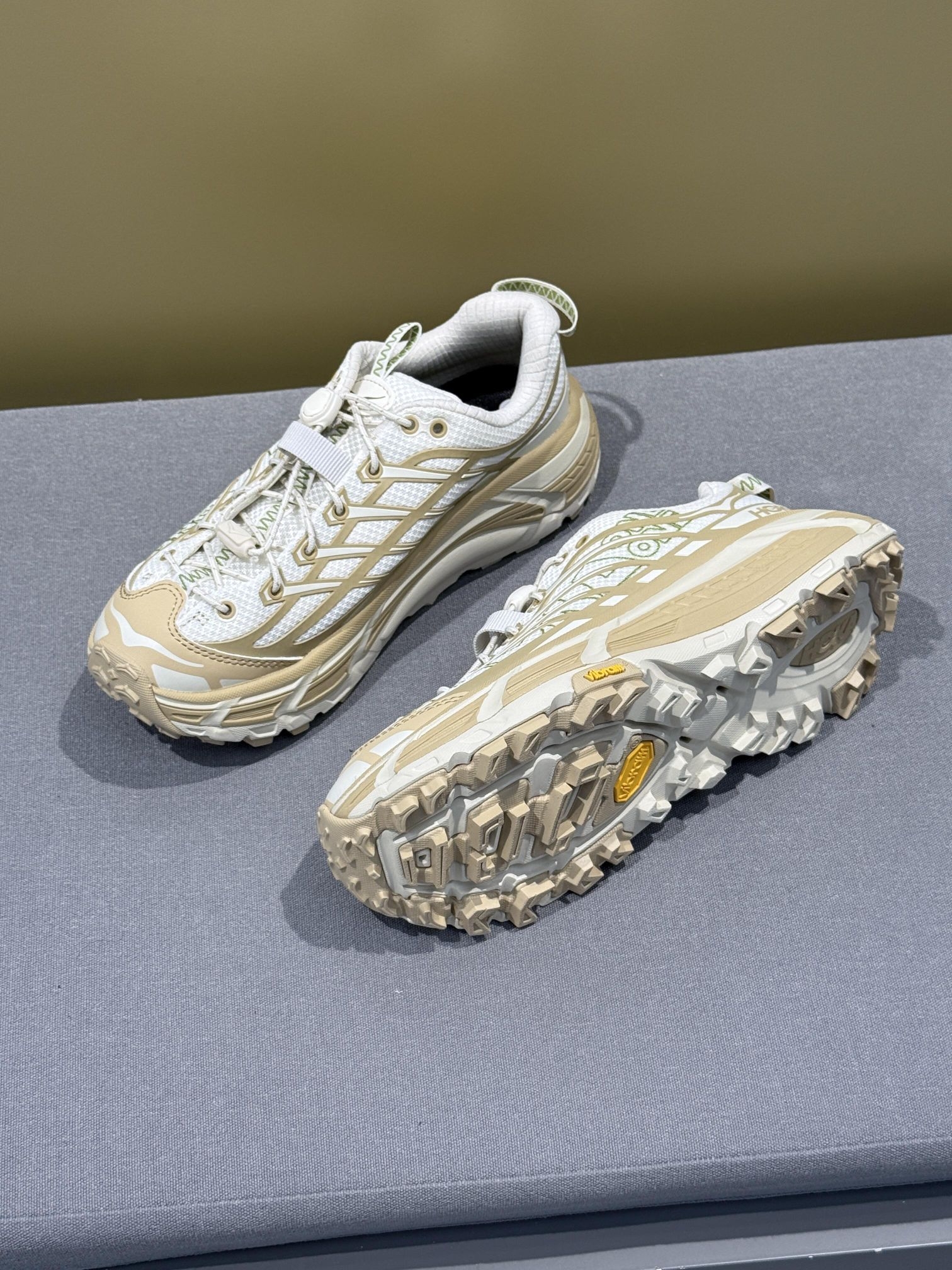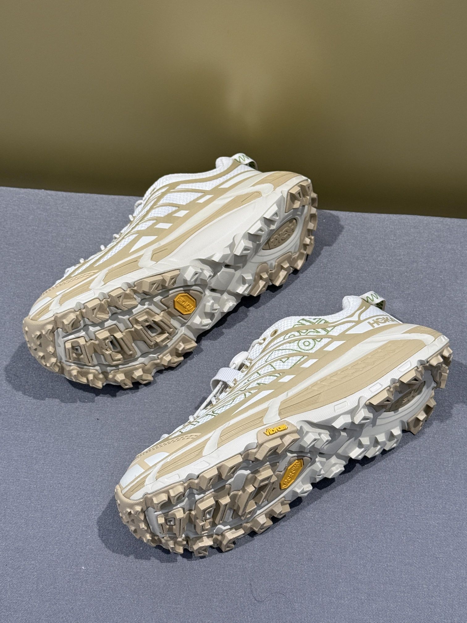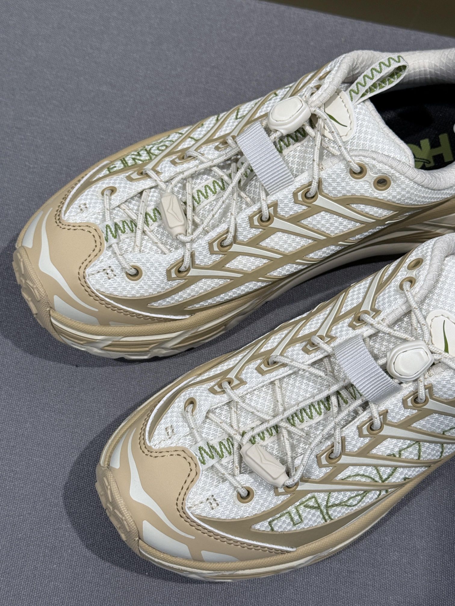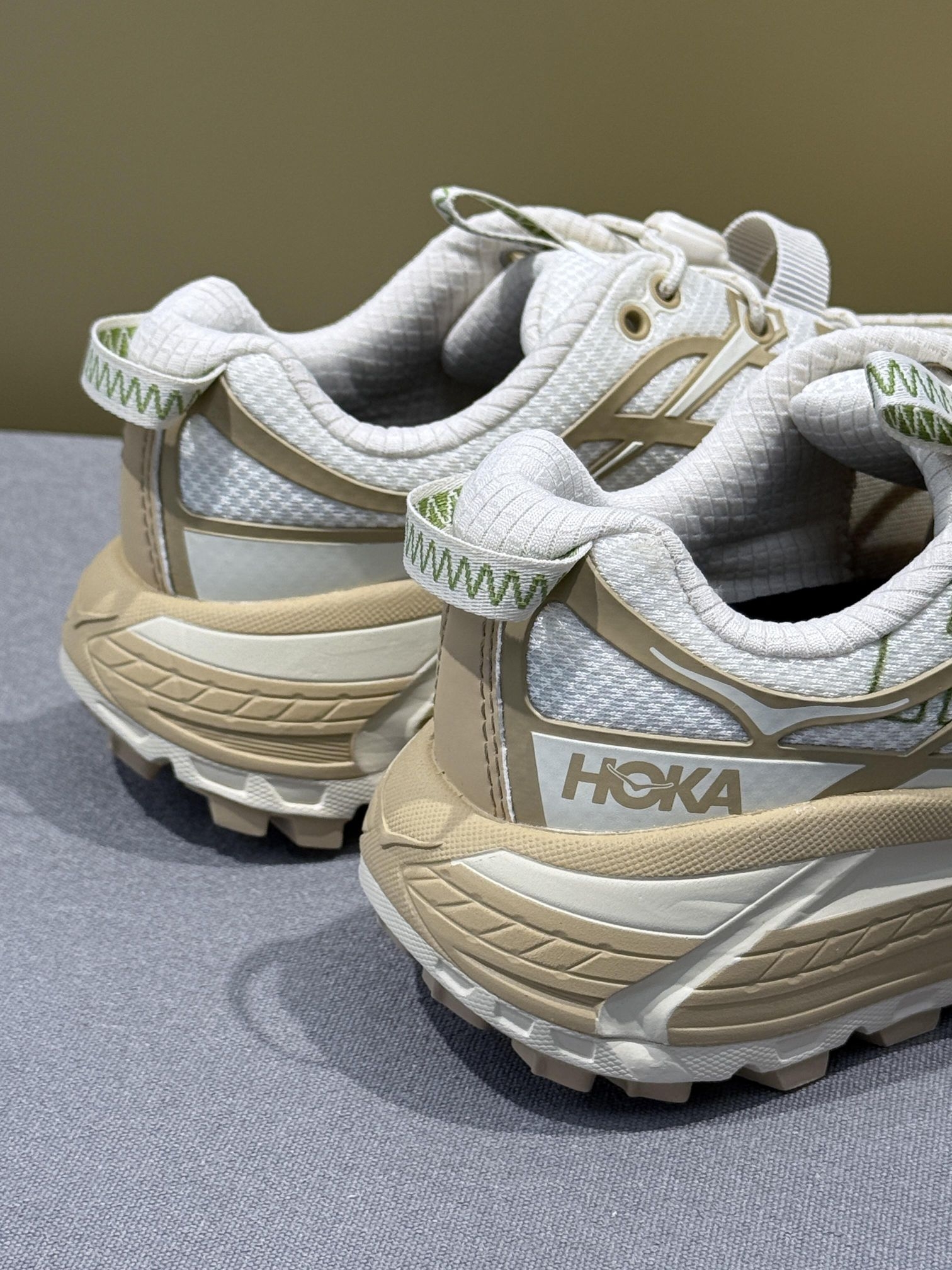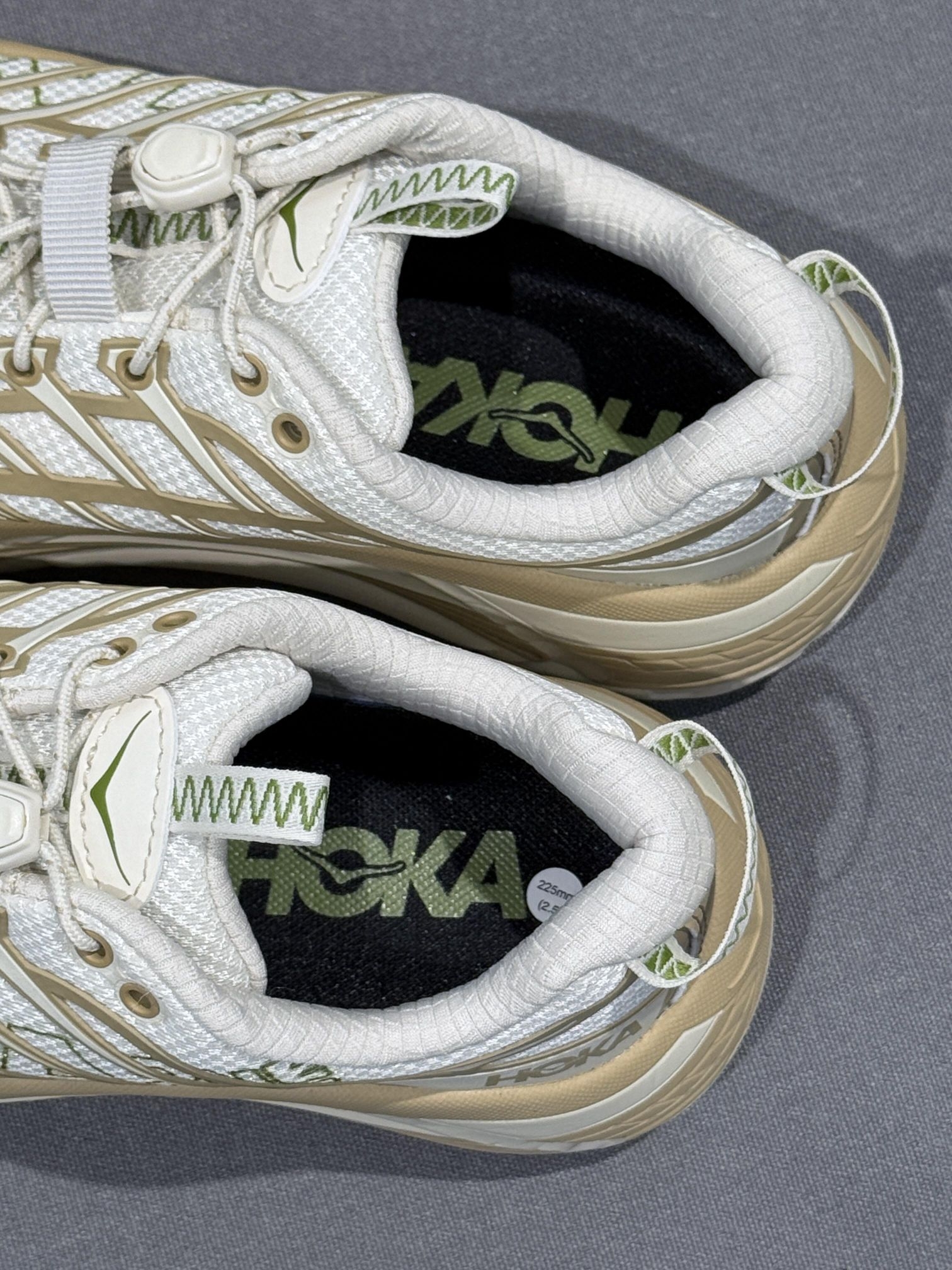 👟 这双鞋是 HOKA Mafate Three 2(玛法特3.2) 它是一双融合了复古越野基因与现代潮流设计的户外休闲鞋,图中这款是白浅卡其绿配色(也叫Wordmark/Grid系列),属于近年很火的“山系机能风”鞋款。
