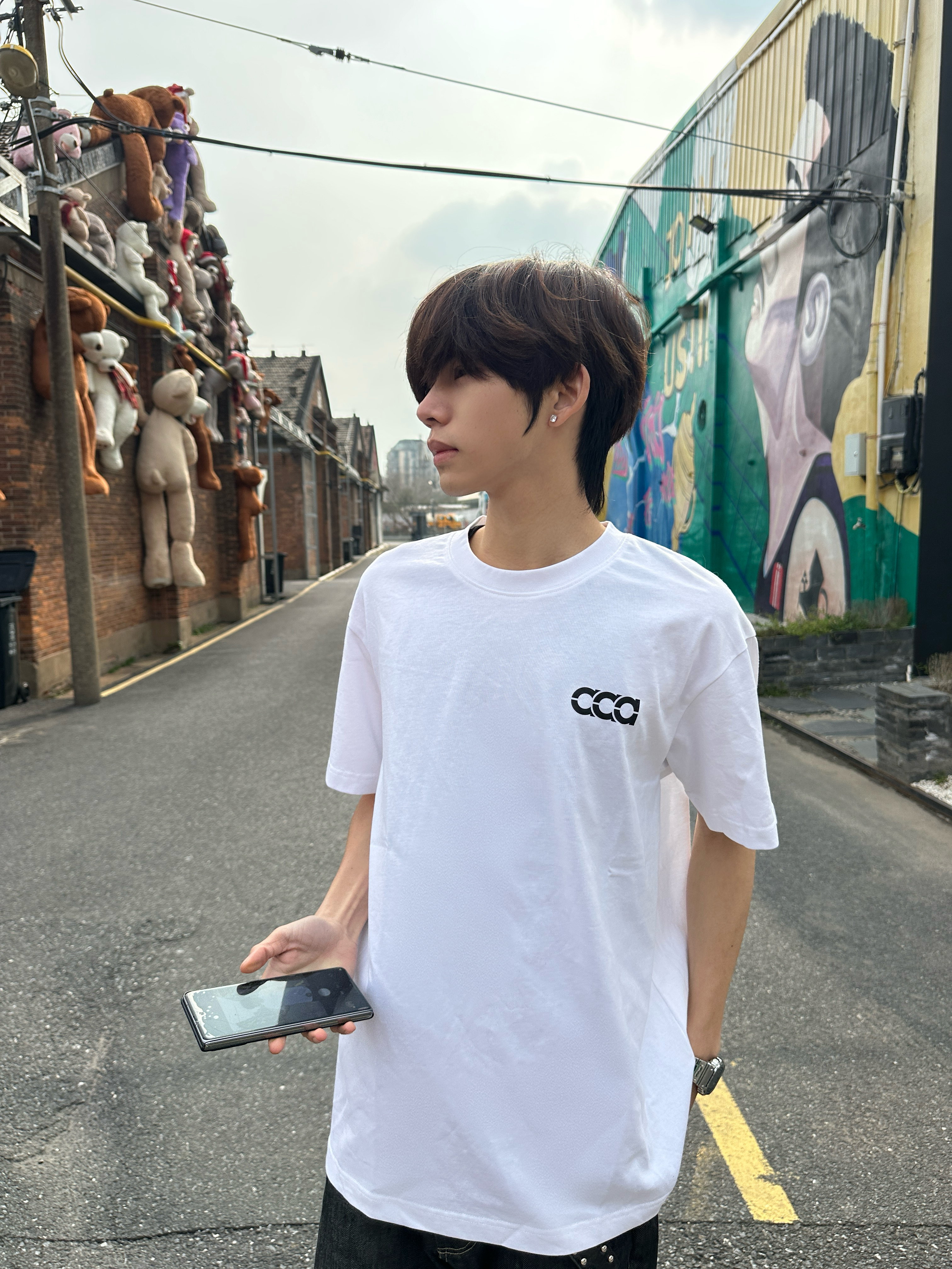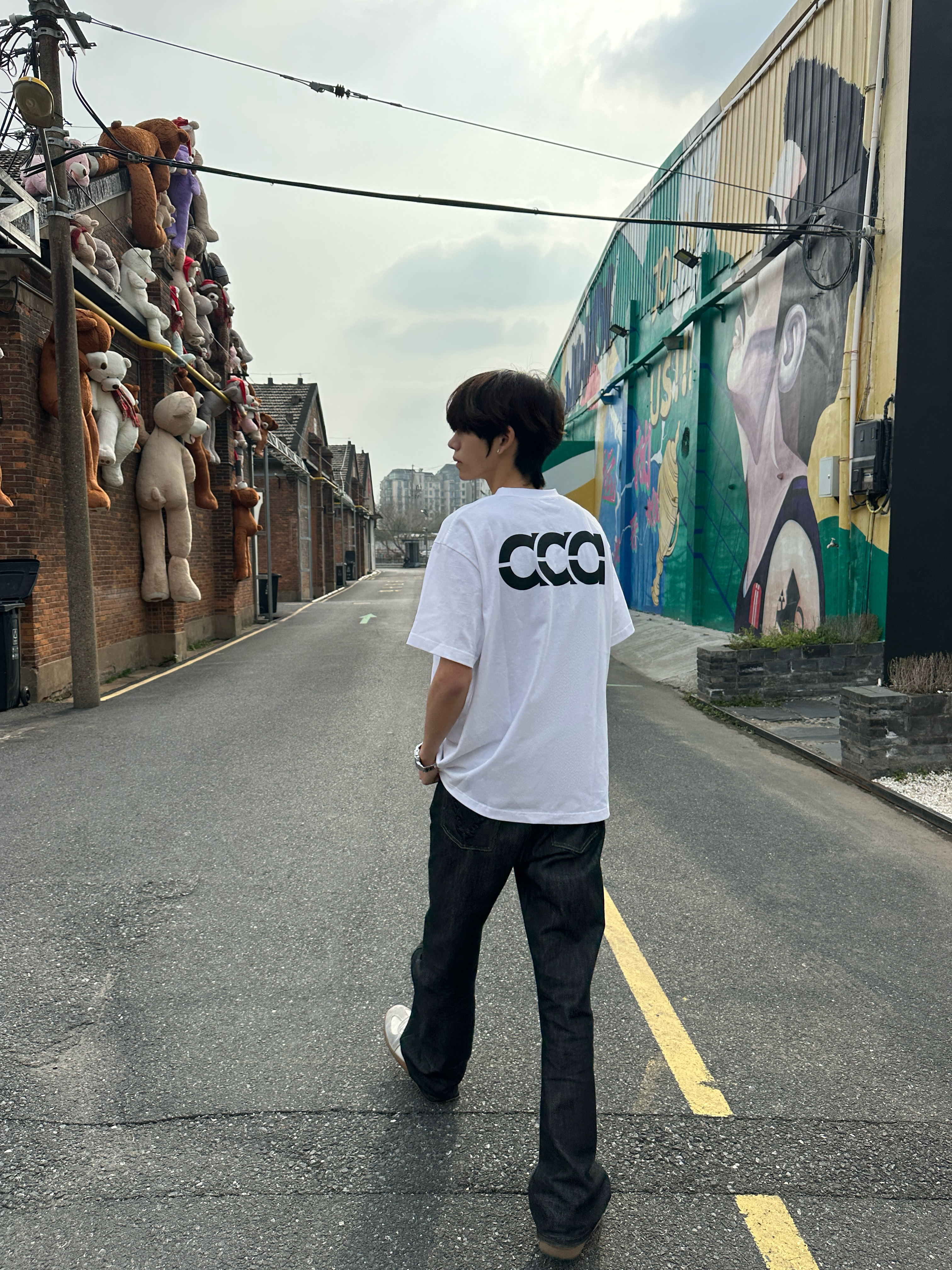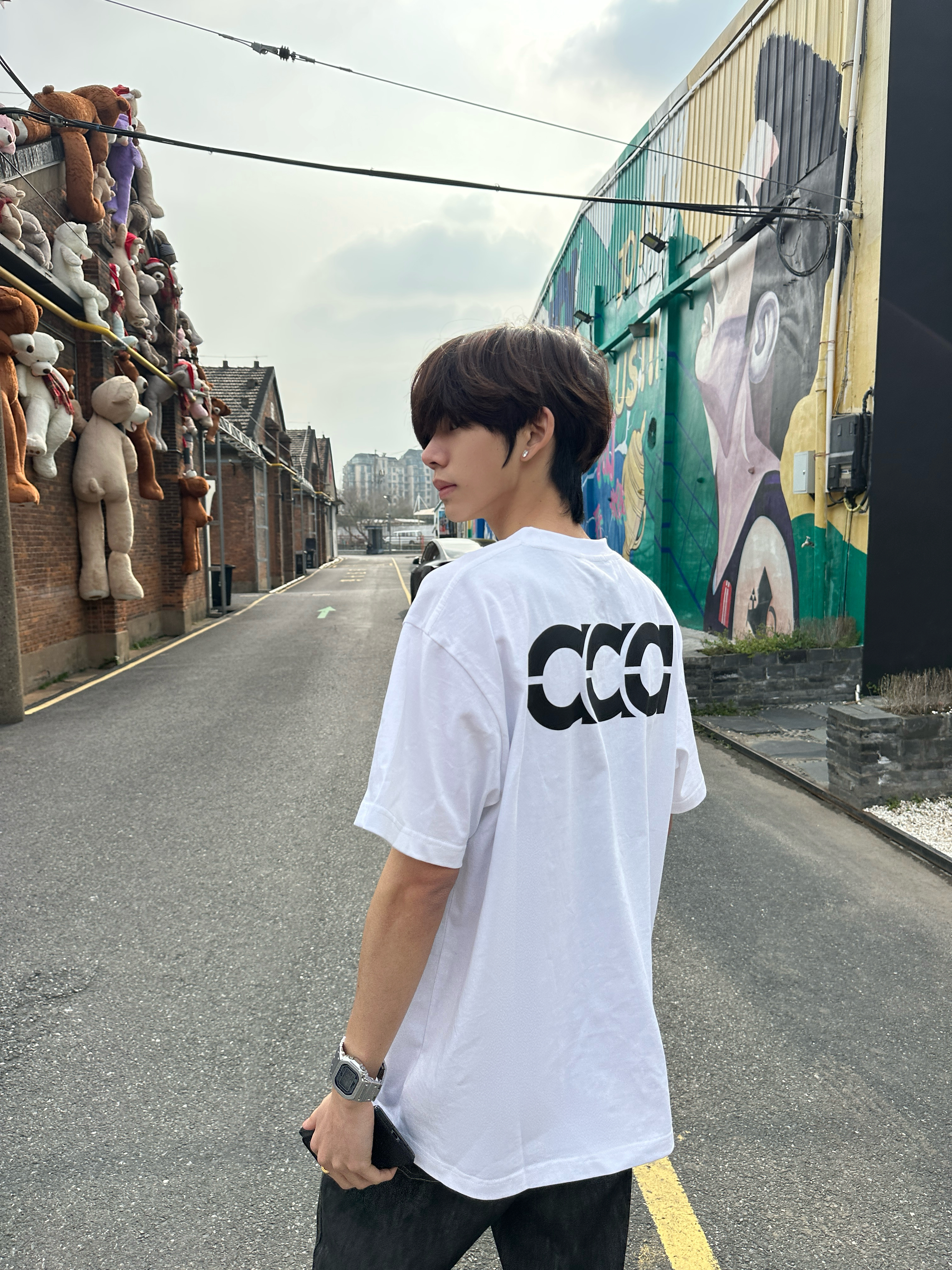 这件后背带“aaa”字母的白T 真的是春夏穿搭的万能打底✨ 宽松落肩版型,对各种身材都很友好 纯棉面料自带凉感,贴身穿不闷汗 日常通勤、户外出街都能hold住。 后背的极简字母印花是亮点 黑白撞色干净利落,不花哨却很有辨识度 随便搭条牛仔裤就很有美式复古那味儿。 站在挂满玩偶的红砖巷子里 随手一拍就是街头画报 松弛感直接拉满,出片率超高📸
