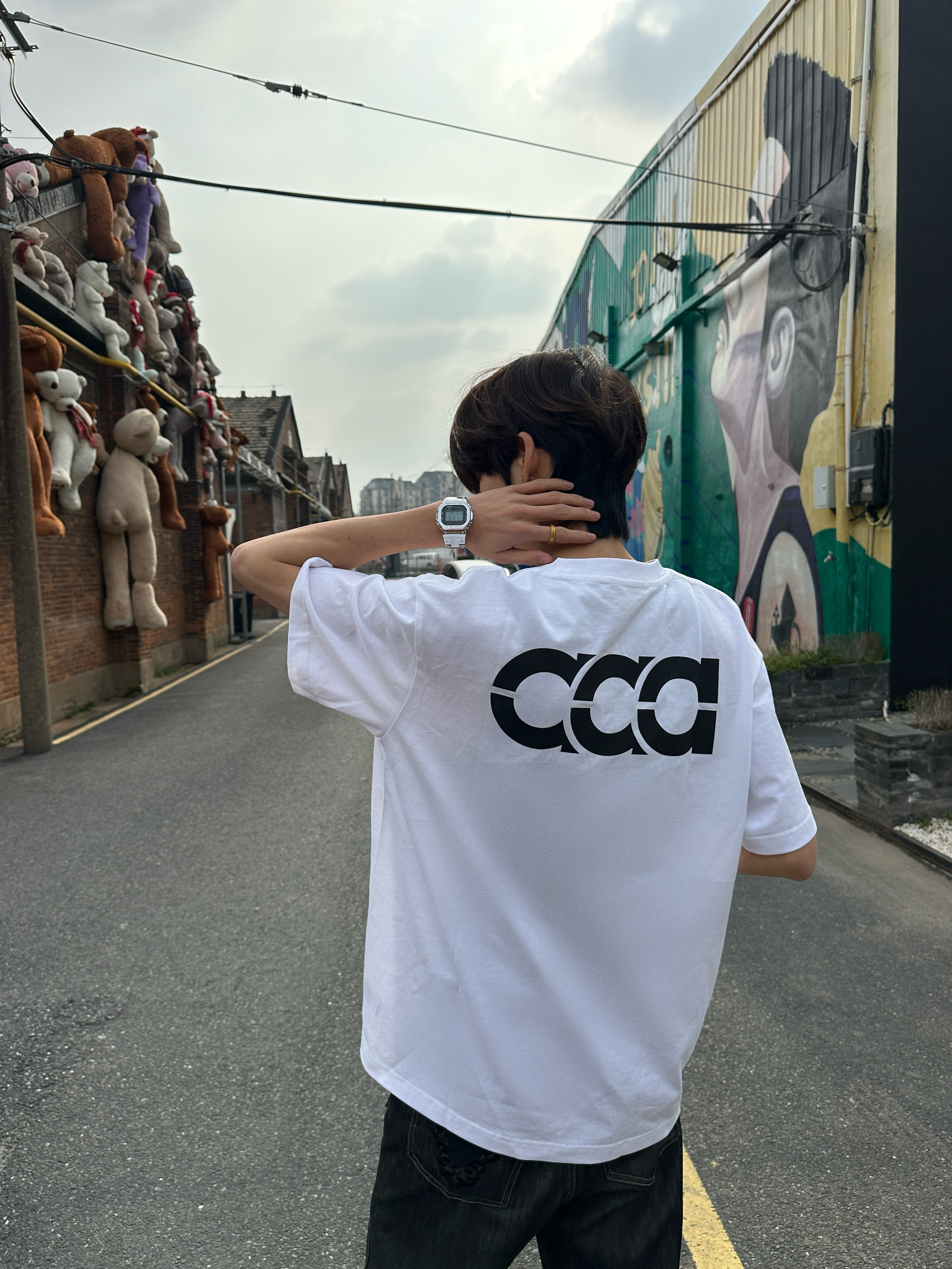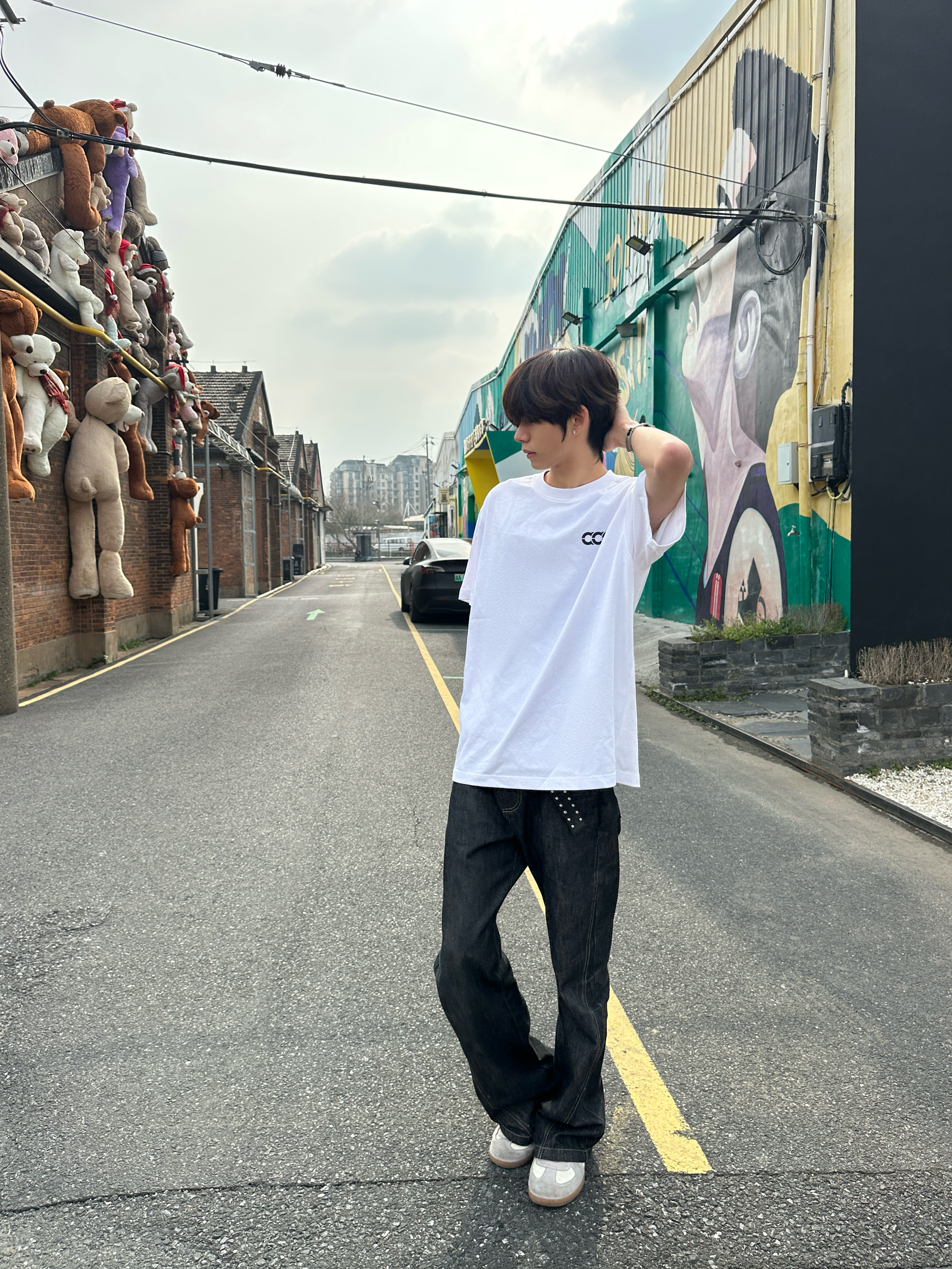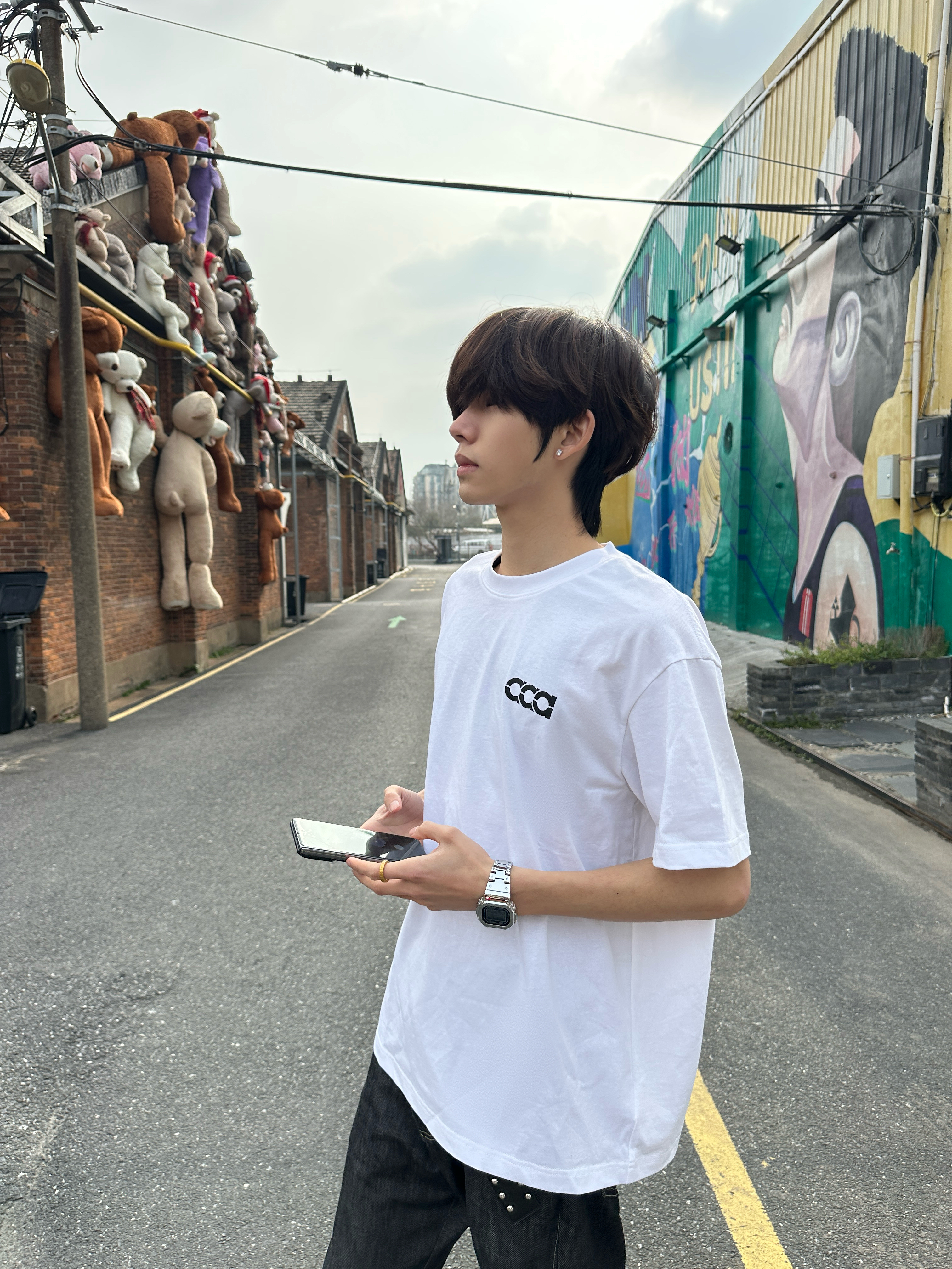 这件后背带“aaa”字母的白T 真的是春夏穿搭的万能打底✨ 宽松落肩版型,对各种身材都很友好 纯棉面料自带凉感,贴身穿不闷汗 日常通勤、户外出街都能hold住。 后背的极简字母印花是亮点 黑白撞色干净利落,不花哨却很有辨识度 随便搭条牛仔裤就很有美式复古那味儿。 站在挂满玩偶的红砖巷子里 随手一拍就是街头画报 松弛感直接拉满,出片率超高📸