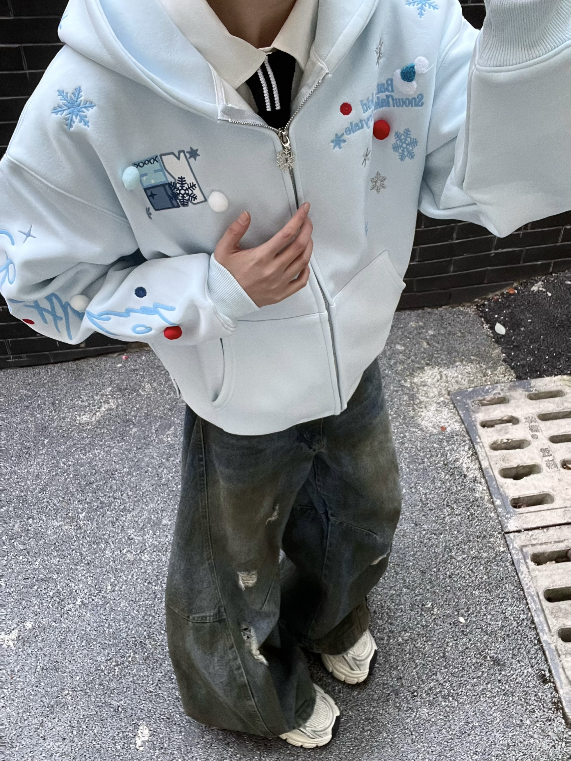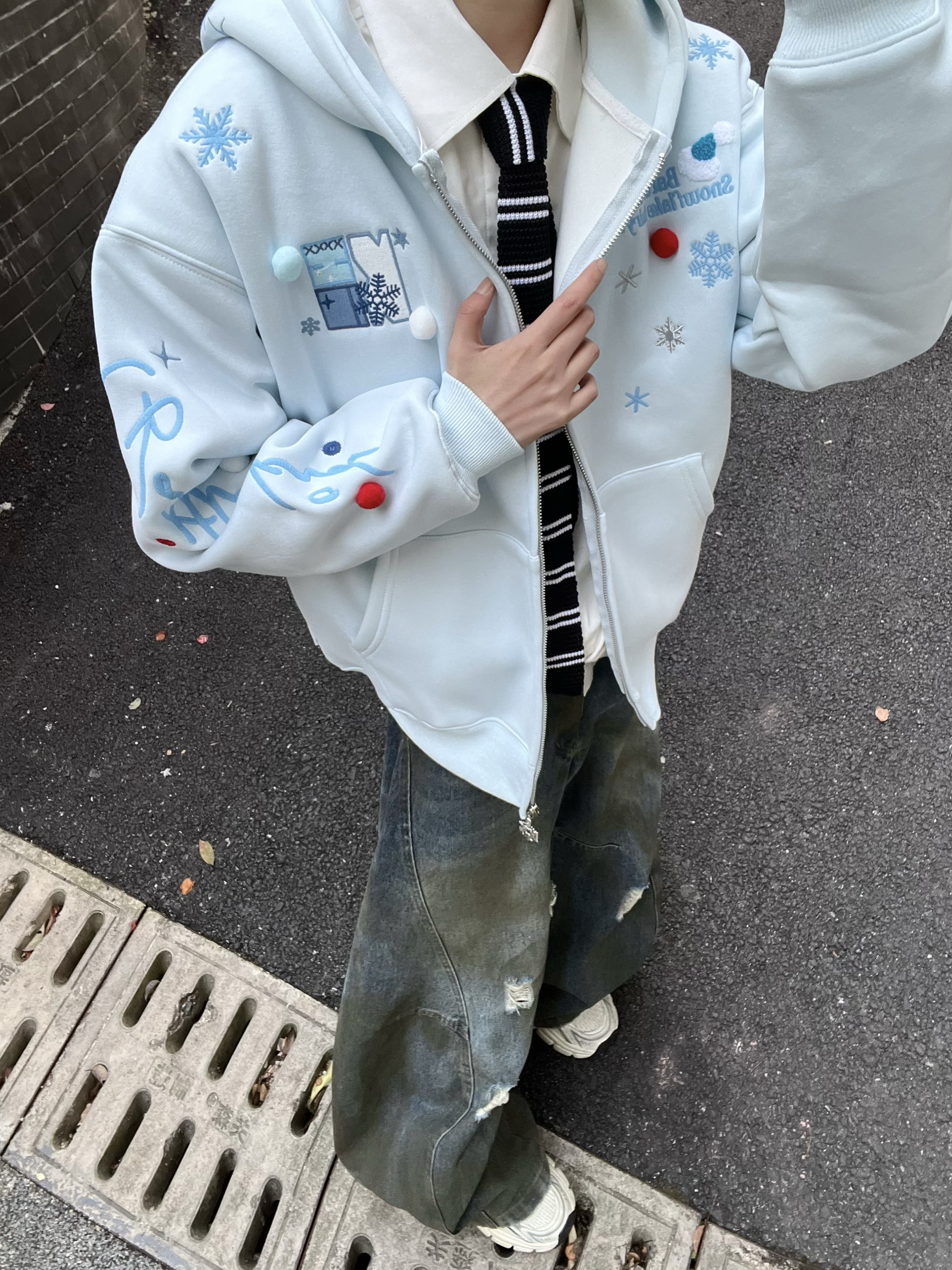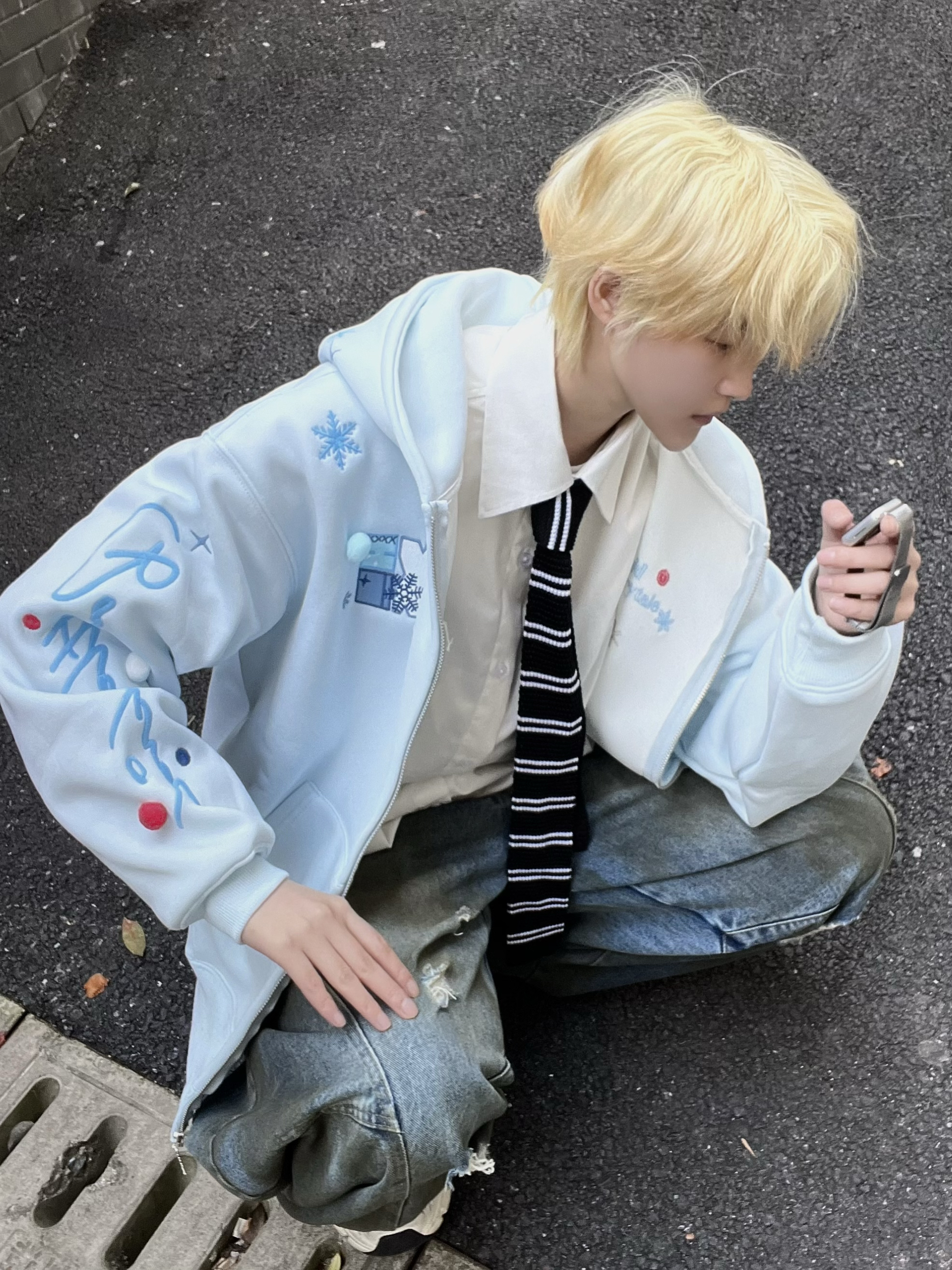 今日份街头松弛感穿搭。 CMPG这件浅蓝开衫连帽卫衣太戳我了,低饱和的天蓝色,自带清冷滤镜,不会显黑。雪花刺绣和彩色毛球的点缀很有巧思,细节感拉满但不浮夸。 内搭白衬衫+条纹领带,叠穿层次感一下就出来了。搭配做旧破洞阔腿牛仔裤,宽松版型对身材包容度很高,随性又不邋遢。 早春出门这么穿,自在又出片。