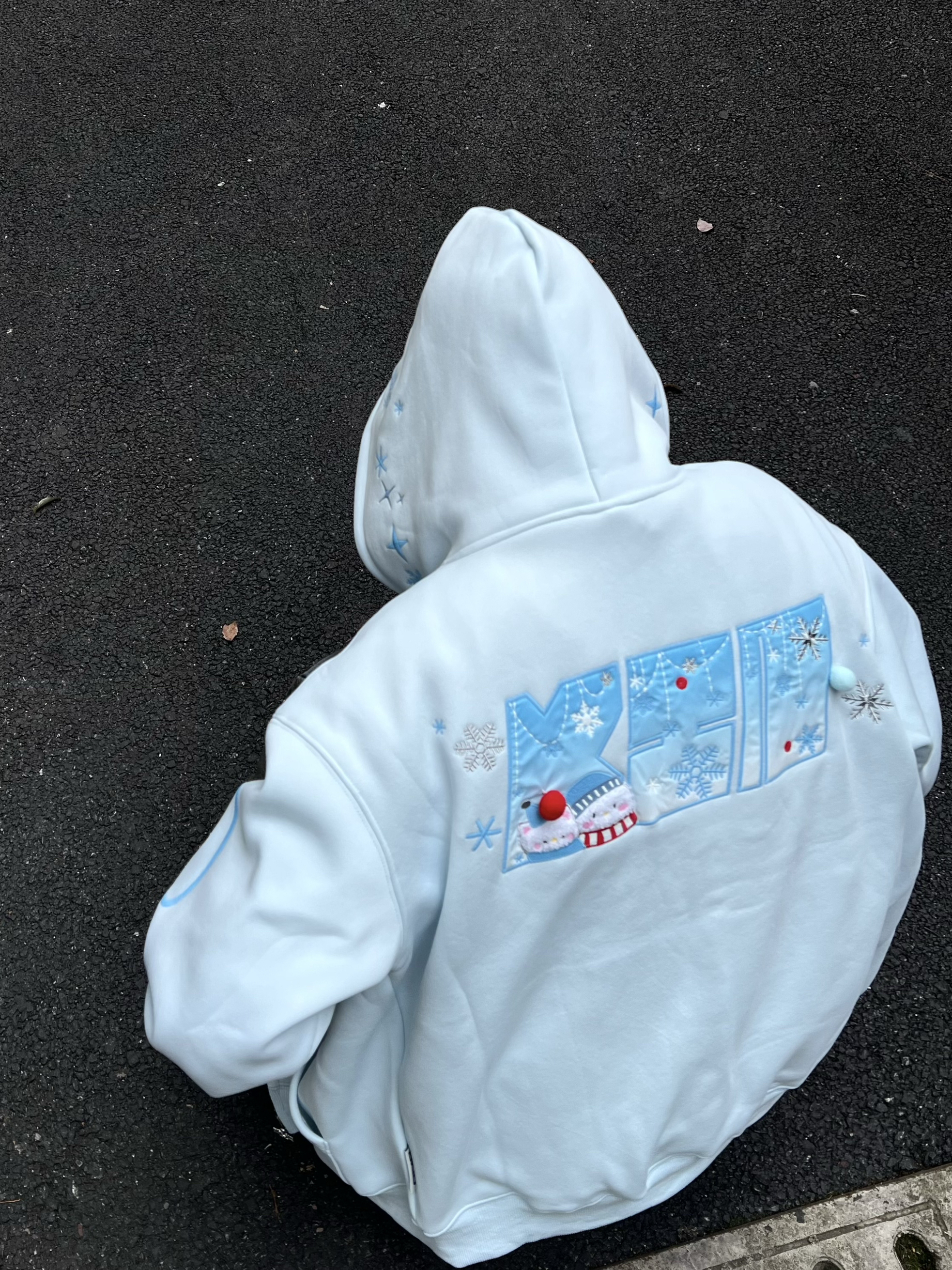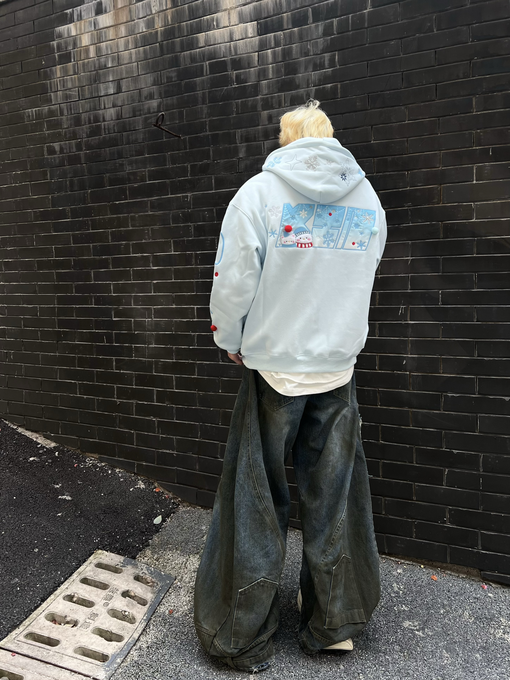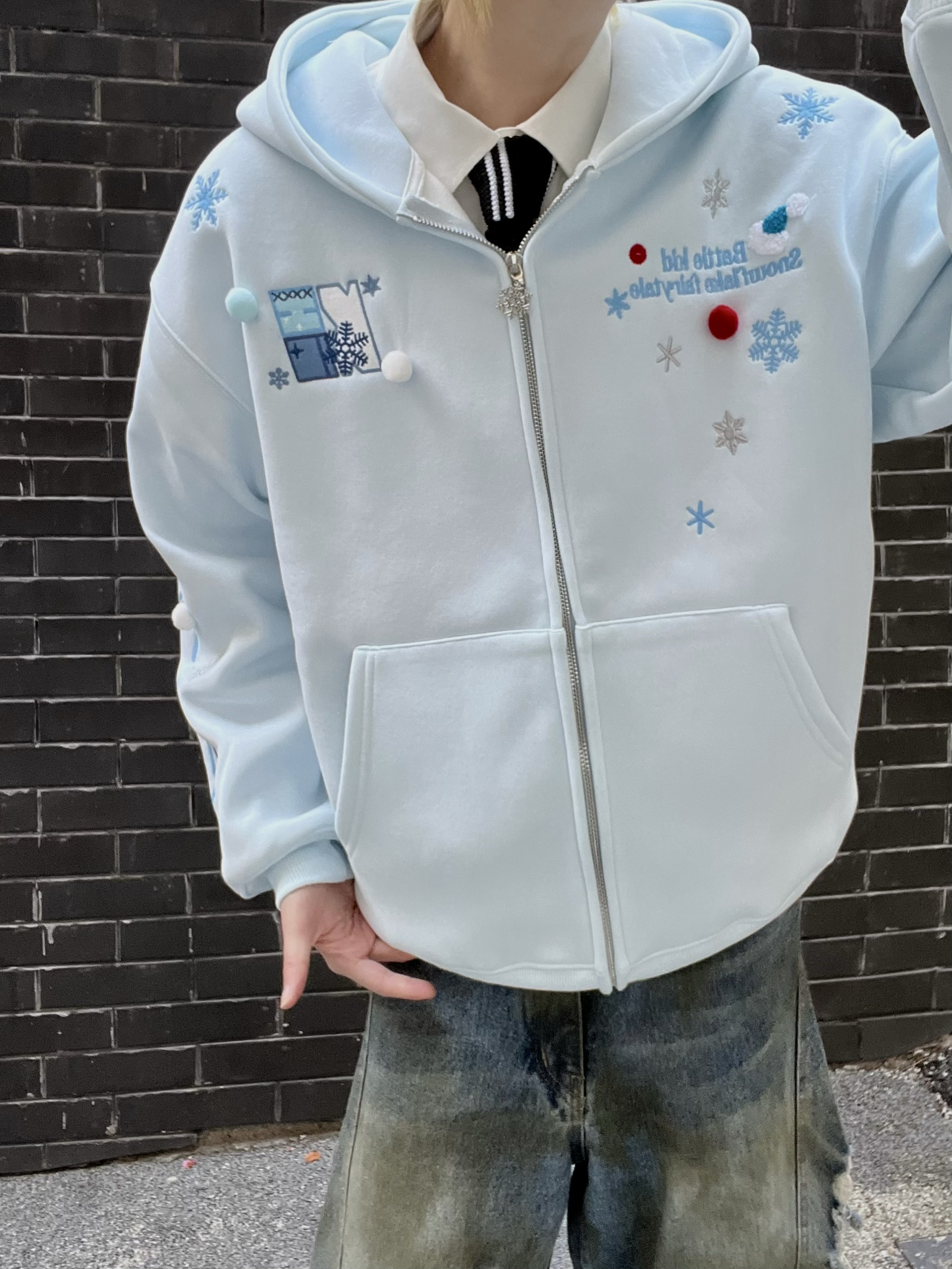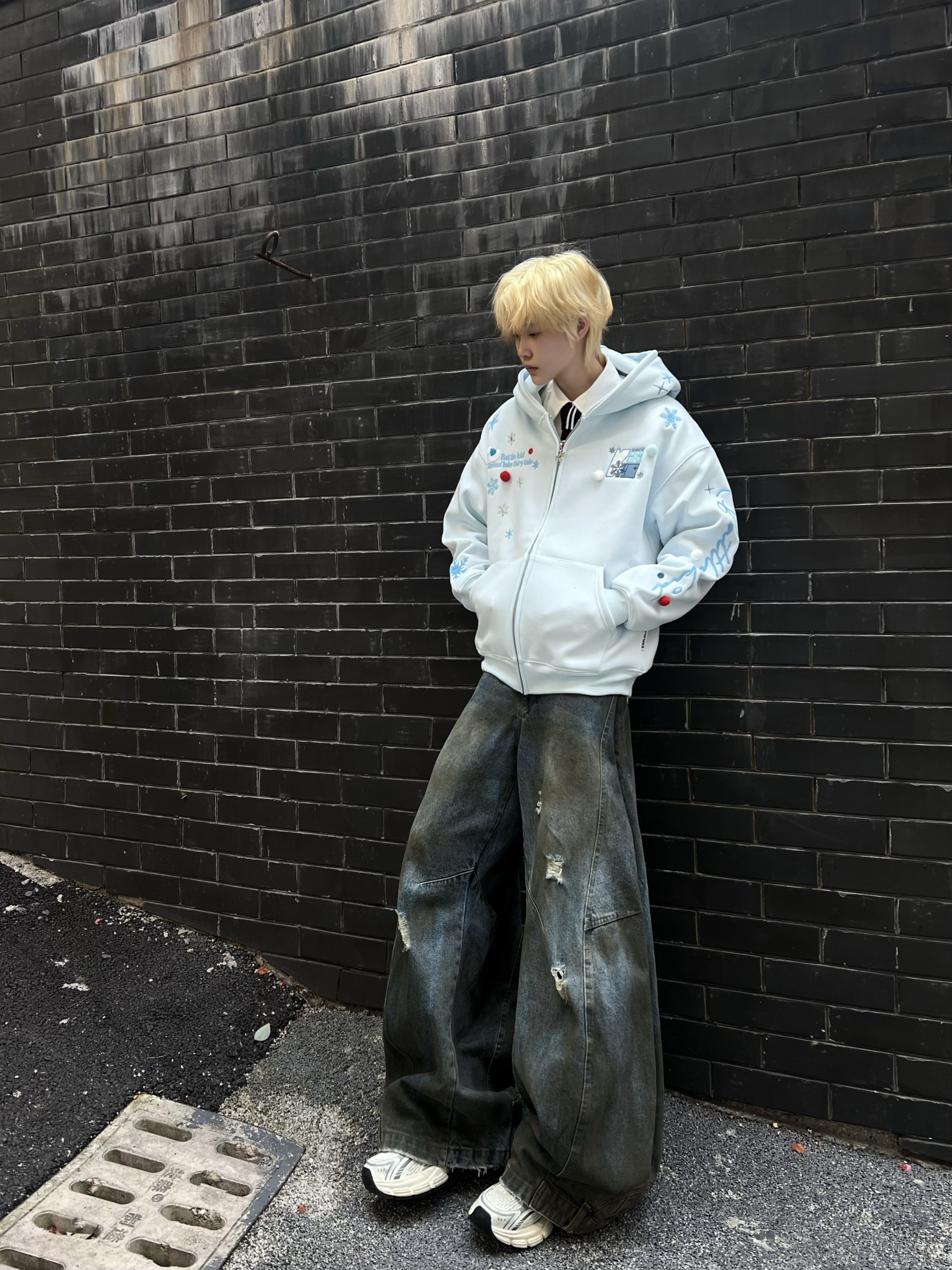 今日份街头松弛感穿搭。 CMPG这件浅蓝开衫连帽卫衣太戳我了,低饱和的天蓝色,自带清冷滤镜,不会显黑。雪花刺绣和彩色毛球的点缀很有巧思,细节感拉满但不浮夸。 内搭白衬衫+条纹领带,叠穿层次感一下就出来了。搭配做旧破洞阔腿牛仔裤,宽松版型对身材包容度很高,随性又不邋遢。 早春出门这么穿,自在又出片。