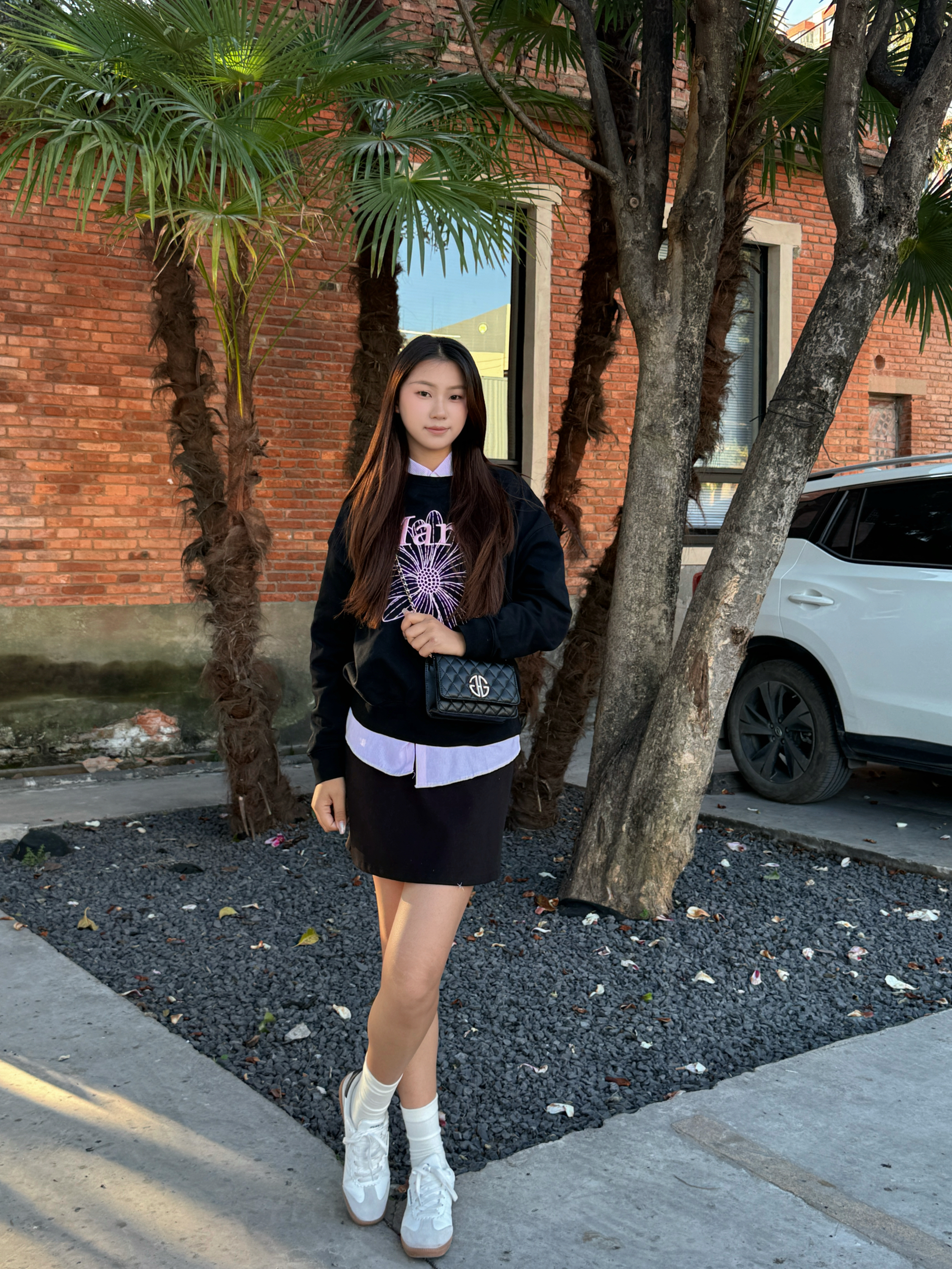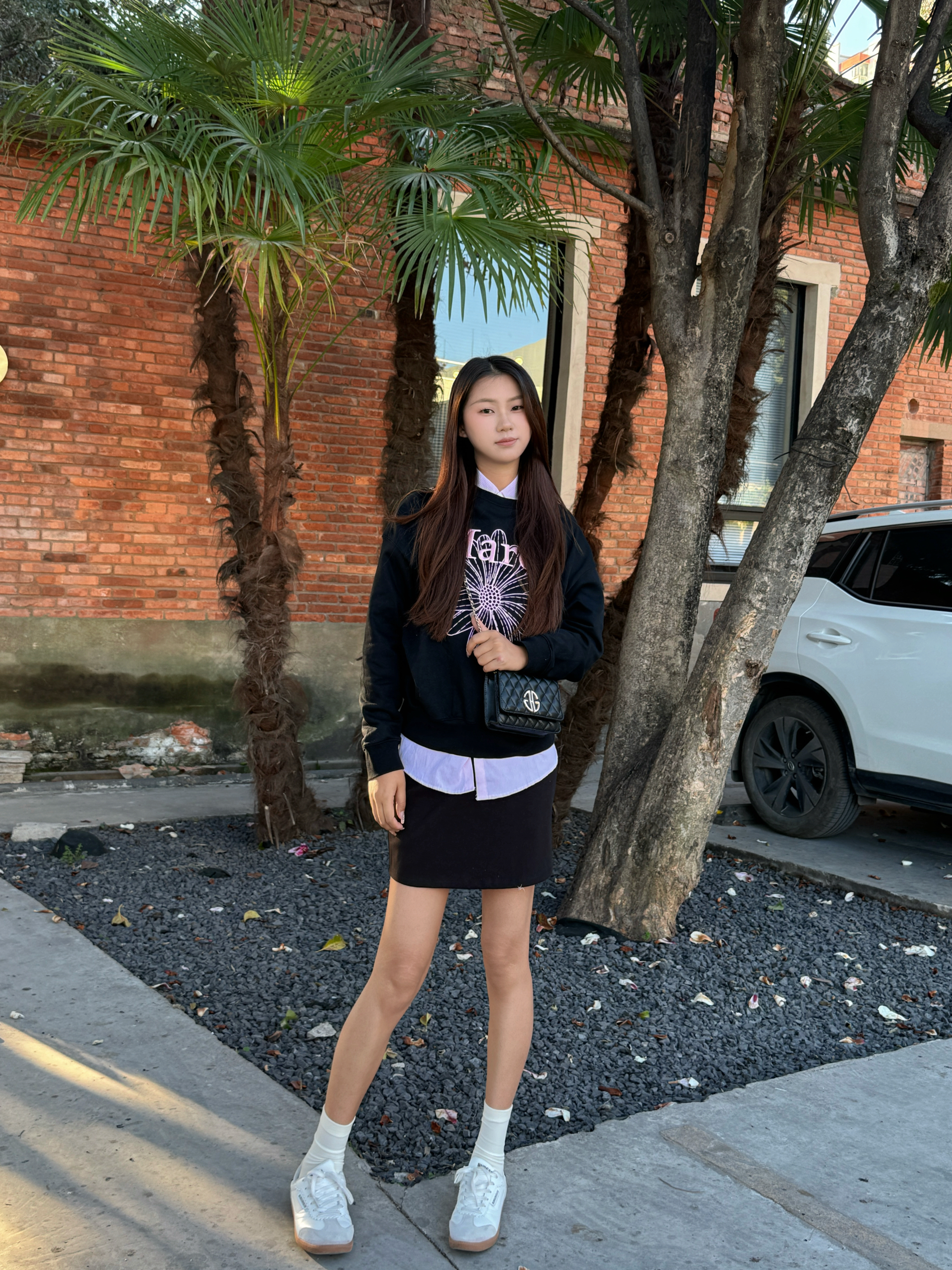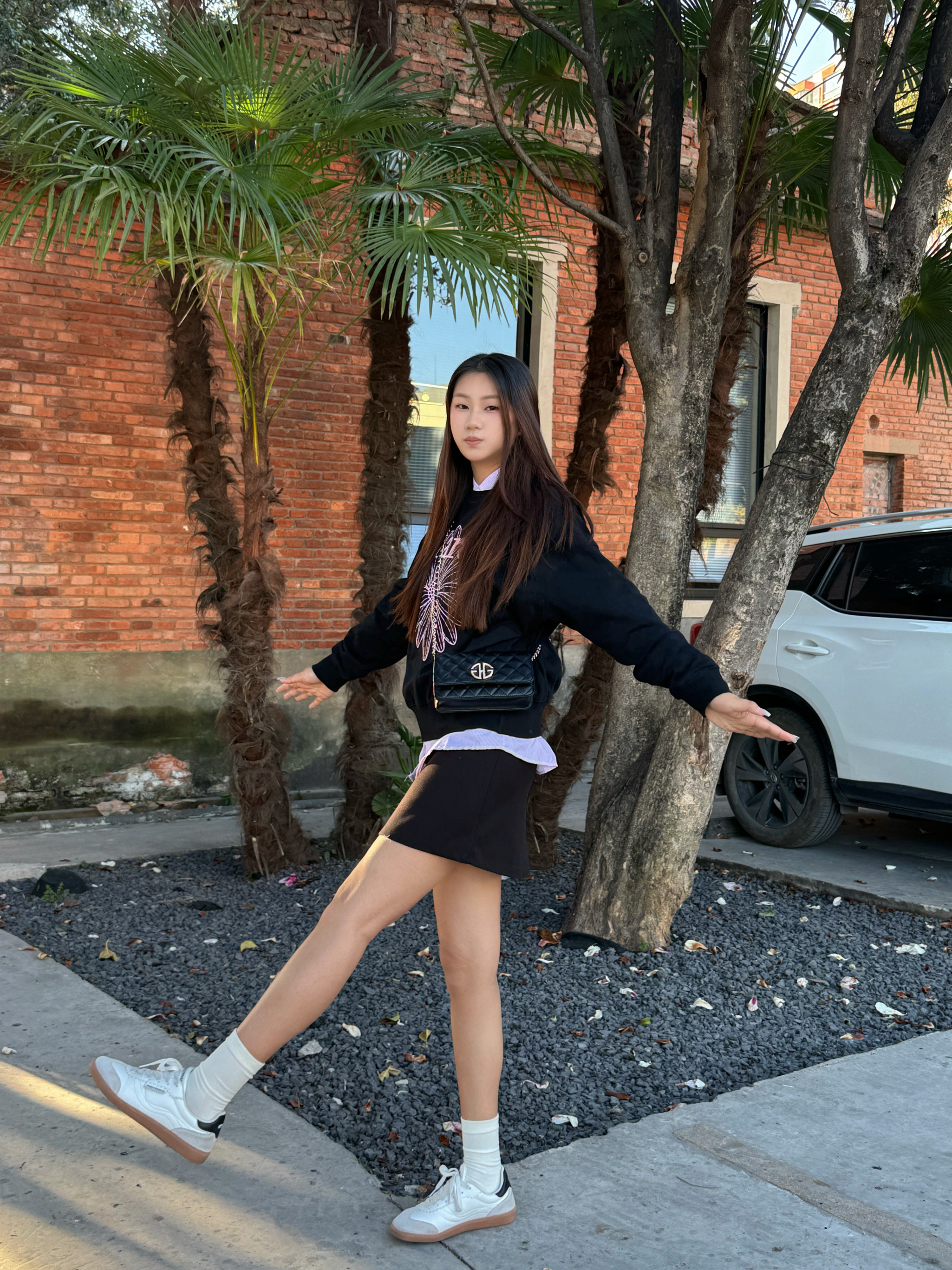 身高|体重:173/55 🧍♂️ 穿搭风格:韩系日常风 👔 上衣:mardi刺绣卫衣 👖 下装:黑色半身裙 👟 鞋子:白色德训鞋 🎒配饰:黑色菱格包