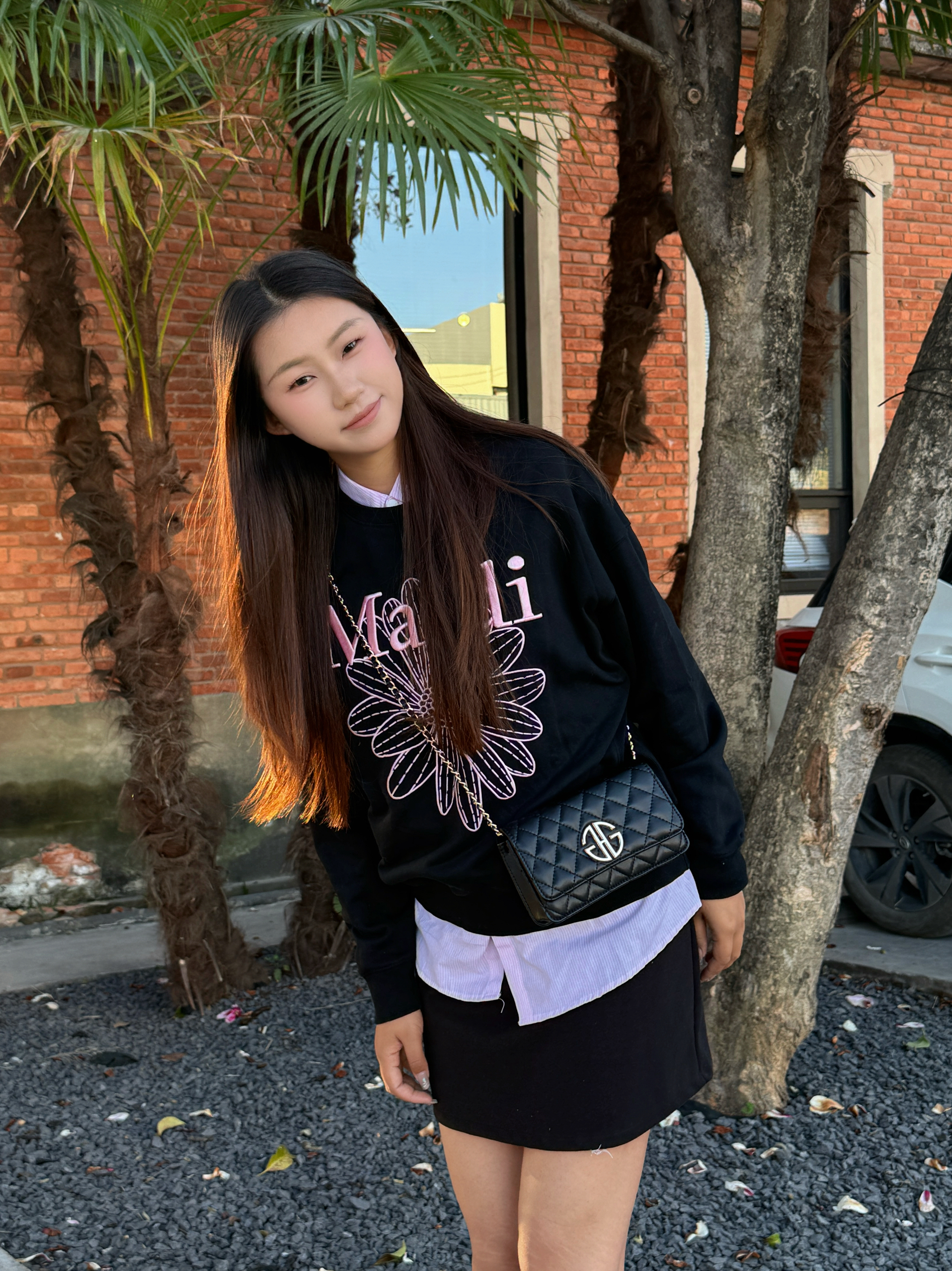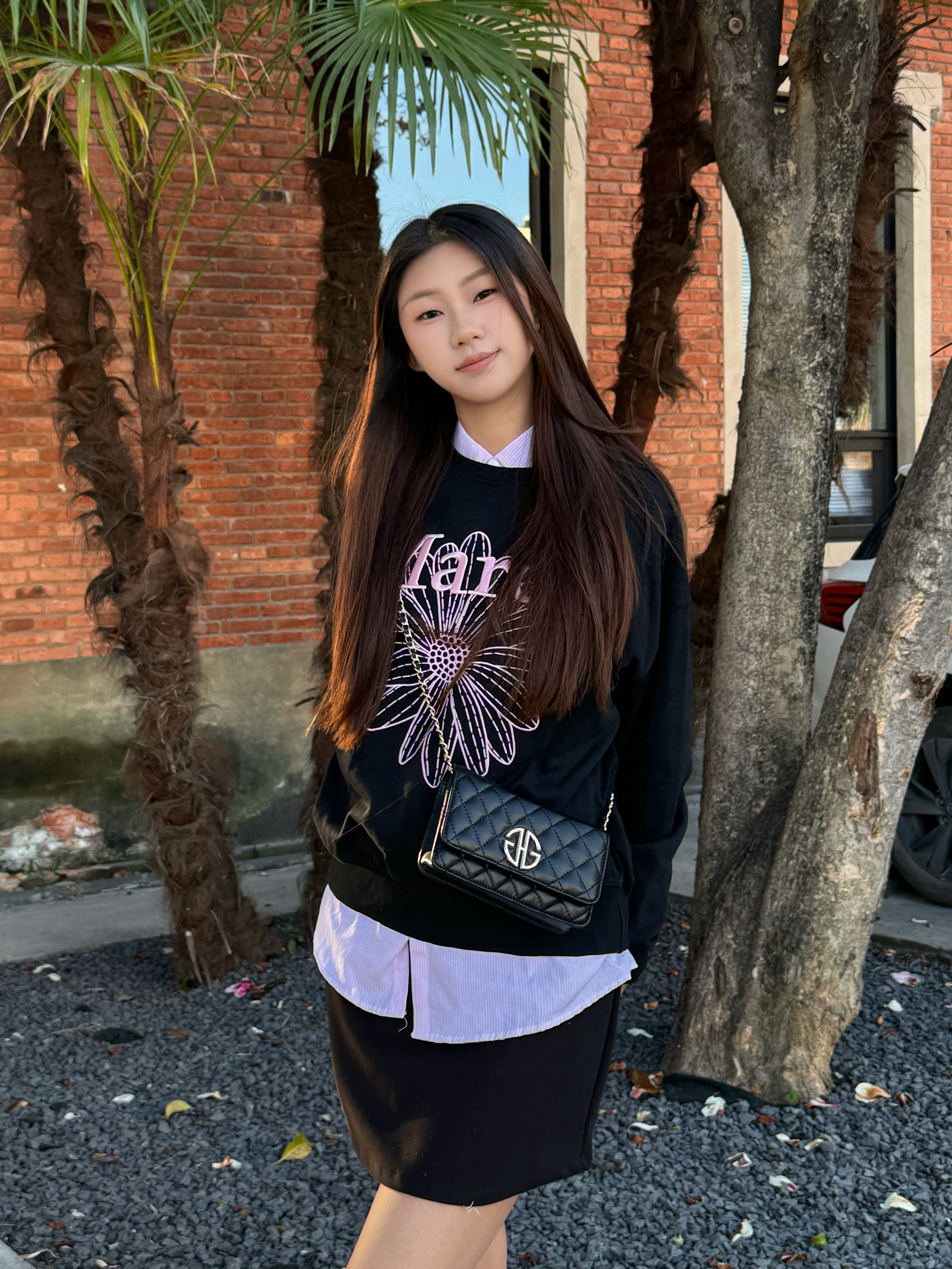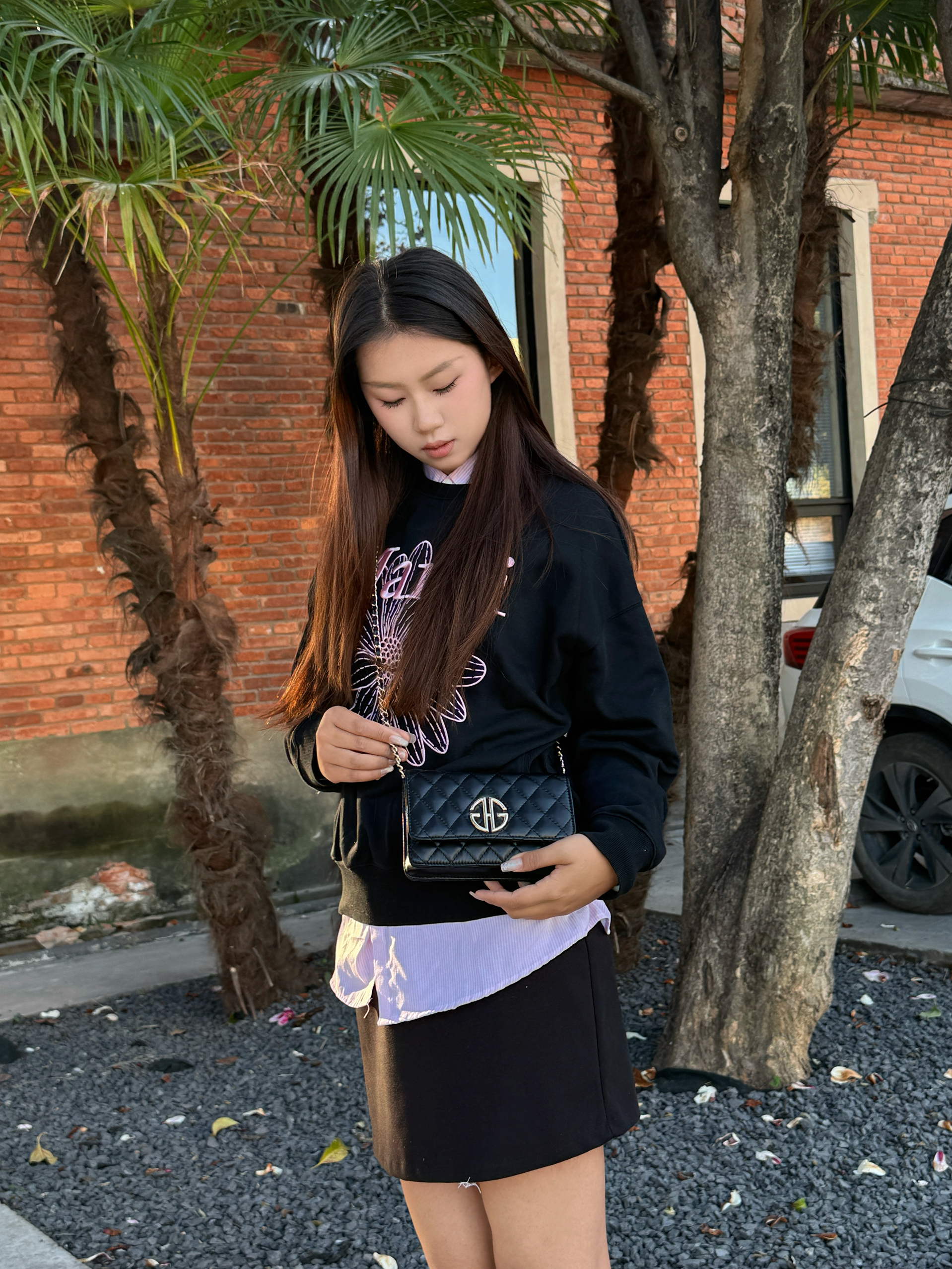 身高|体重:173/55 🧍♂️ 穿搭风格:韩系日常风 👔 上衣:mardi刺绣卫衣 👖 下装:黑色半身裙 👟 鞋子:白色德训鞋 🎒配饰:黑色菱格包