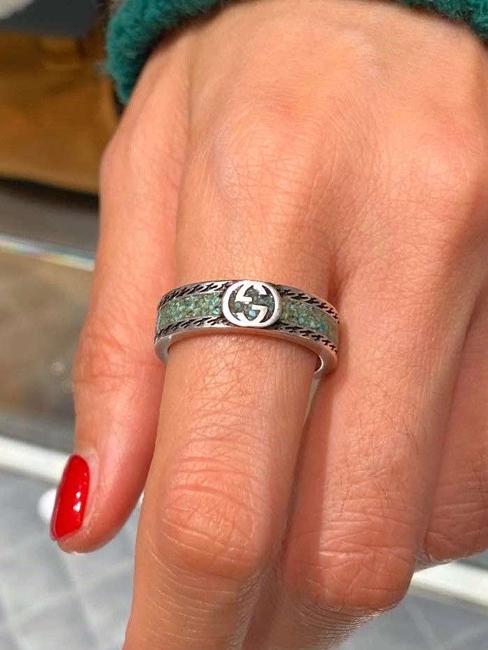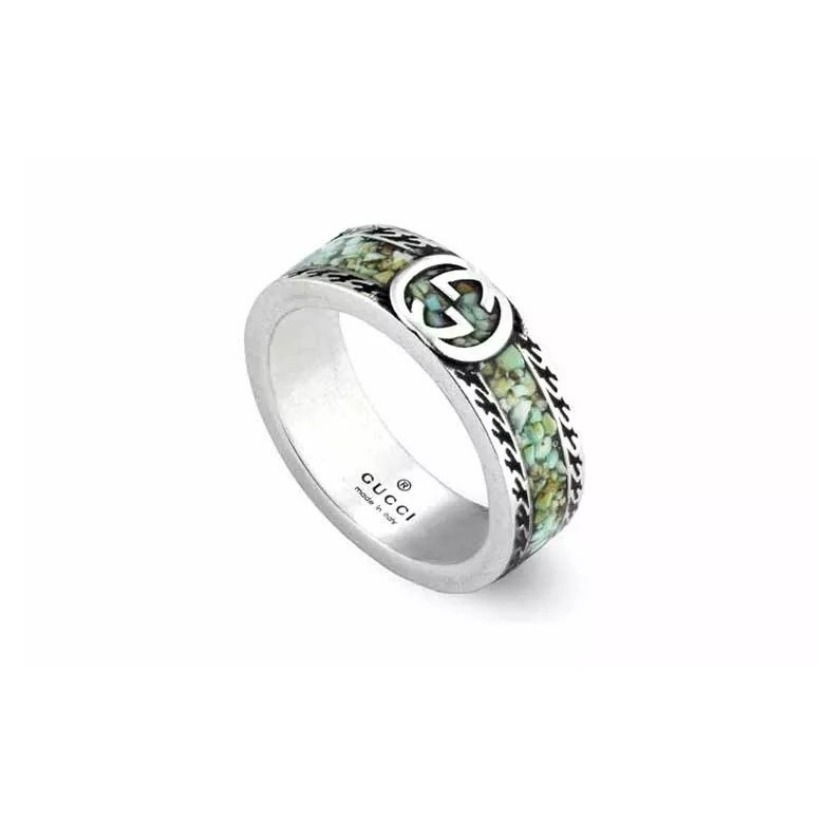 💍古驰GG绿松石戒指,银色金属搭配标志性双G浮雕,复古做旧工艺超有质感✨。绿松石镶嵌,纹理自然,色彩独特,宽版设计辨识度满分,男女都能轻松驾驭!日常佩戴或送礼都很出彩,搭配简约或复古风服饰,瞬间提升造型层次感,彰显个性品味💚。