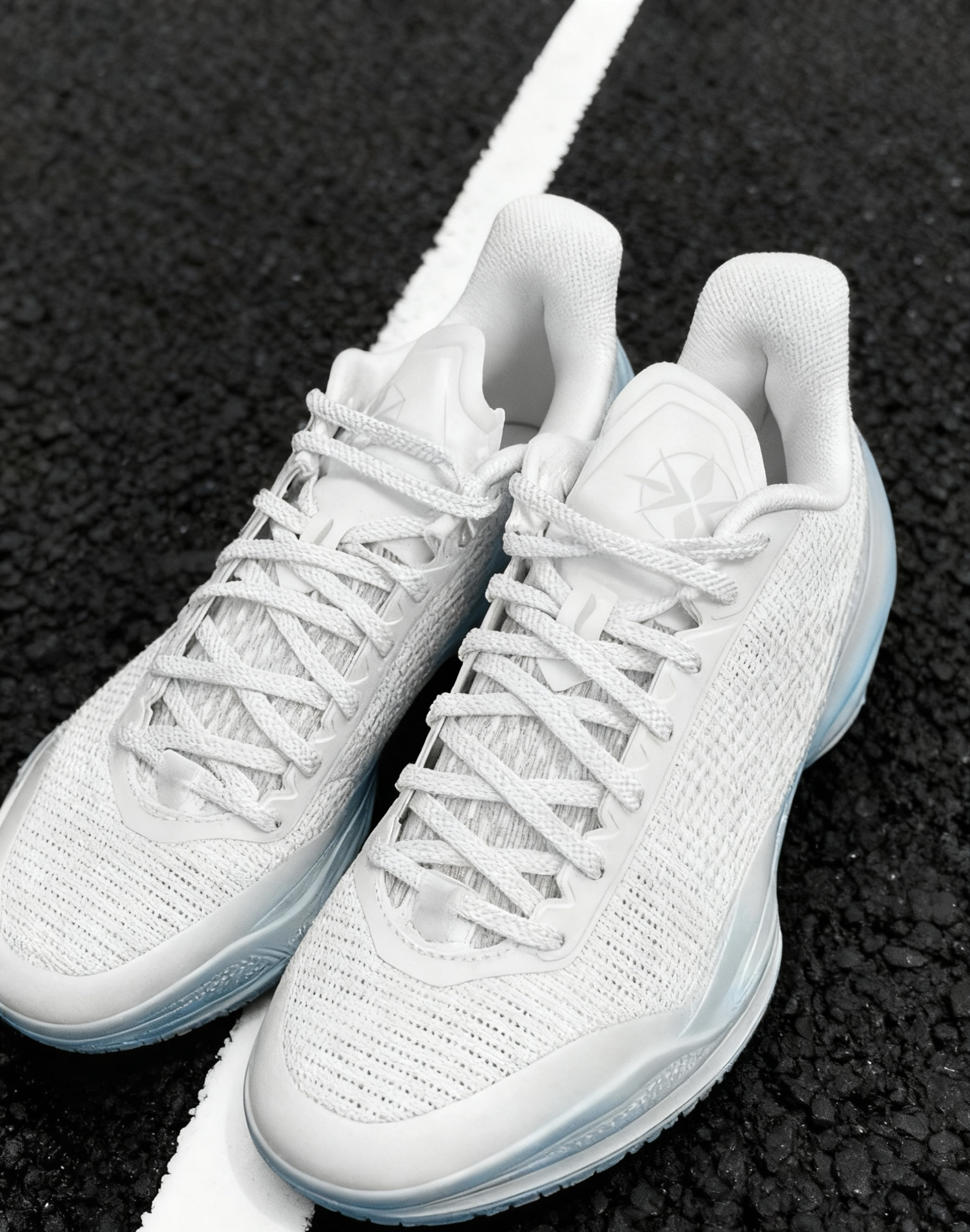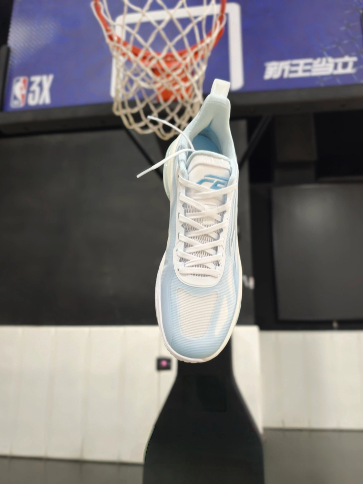 双利刃5V2的颜值真的焊死了!白蓝撞色清爽又百搭,出街回头率直接拉满✨ 实战几场实测,优缺点全透明: ✅ 加分项: 包裹感在线不挤脚,透气性拉满,启动响应超利落,变向、急停完全不拖沓, ❌ 小槽点要注意: 鞋码偏窄偏小!建议直接选大半码,不然容易压脚背; 外场耐磨性一般,水泥地实战几次就有磨损,硬核外场党慎冲