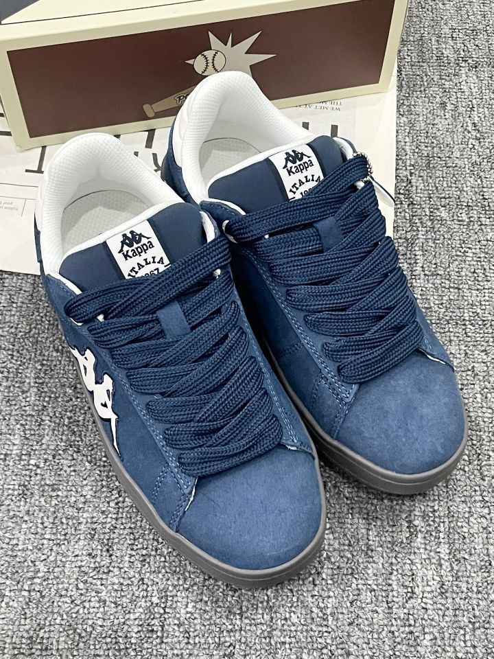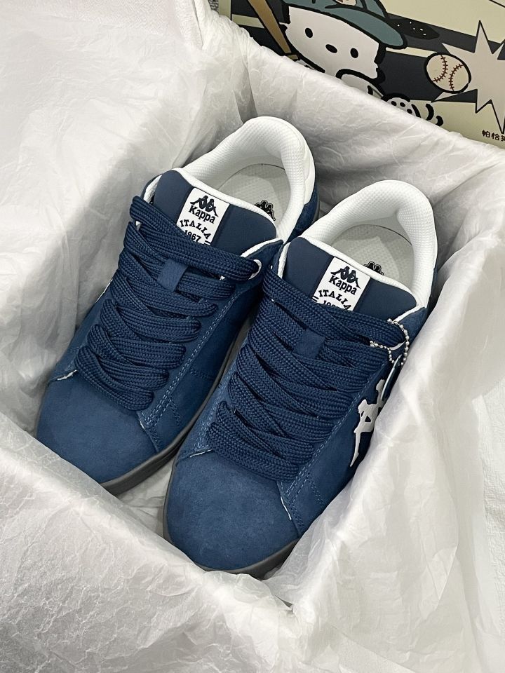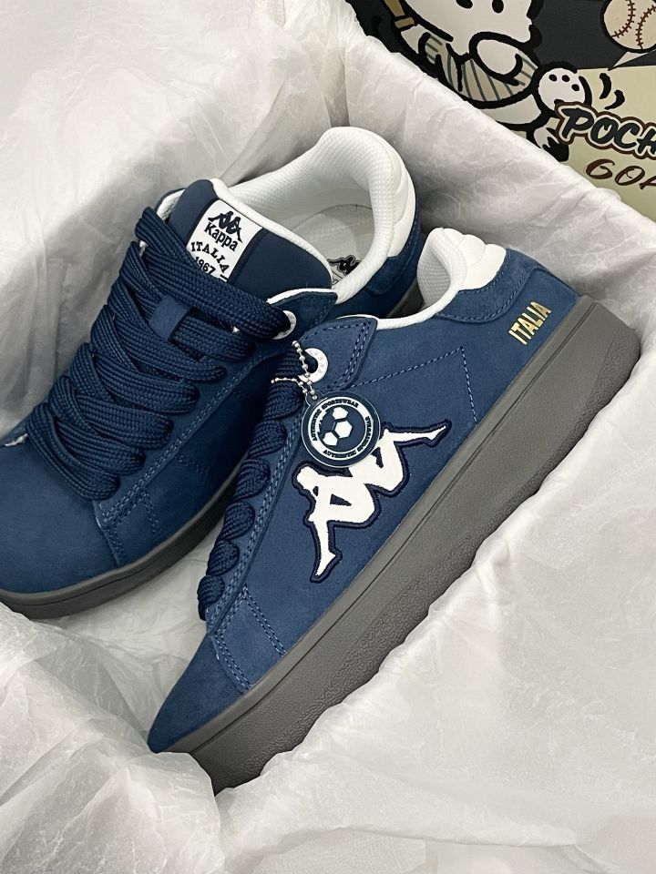 谁还没被这双Kappa藏青板鞋拿捏住! 翻毛皮材质+深海军蓝,复古德训风直接拉满💙 侧面大背靠背logo+后跟ITALIA字样,细节拉满,质感绝了~ 厚底设计悄悄增高,修饰腿型一绝,牛仔裤/工装裤都能搭! 上脚软乎乎的,走路久了也不累,学生党/通勤党闭眼冲!