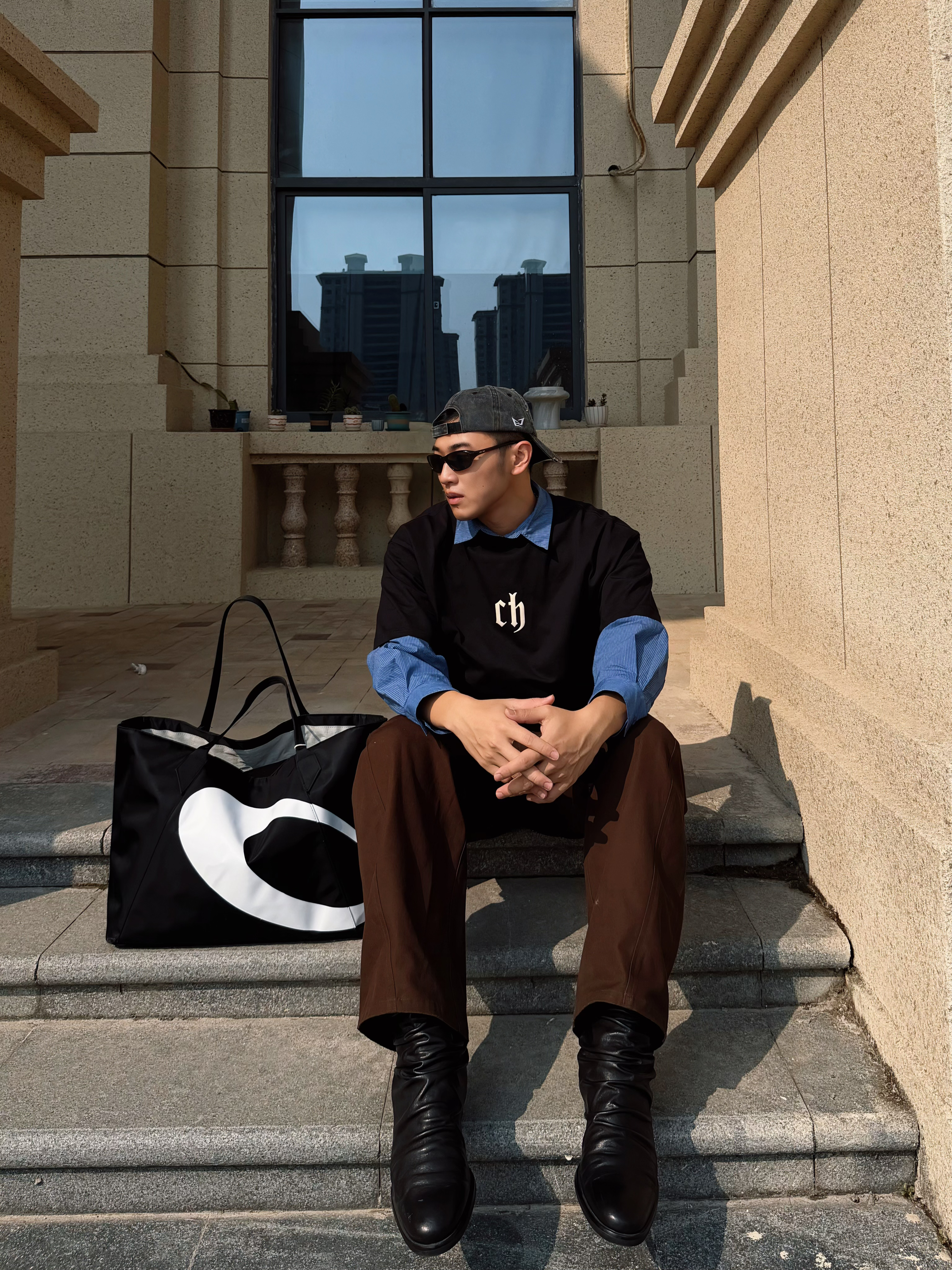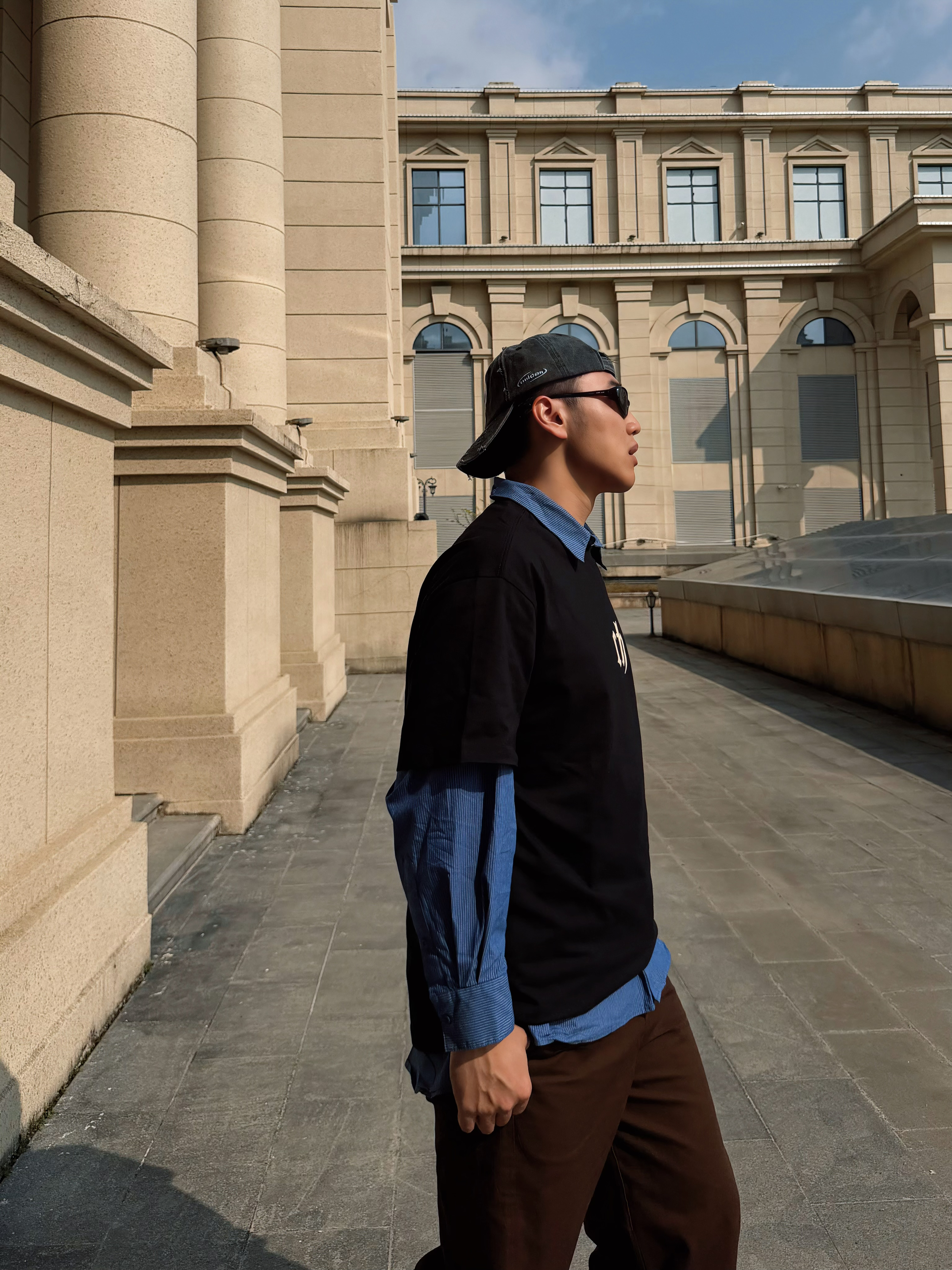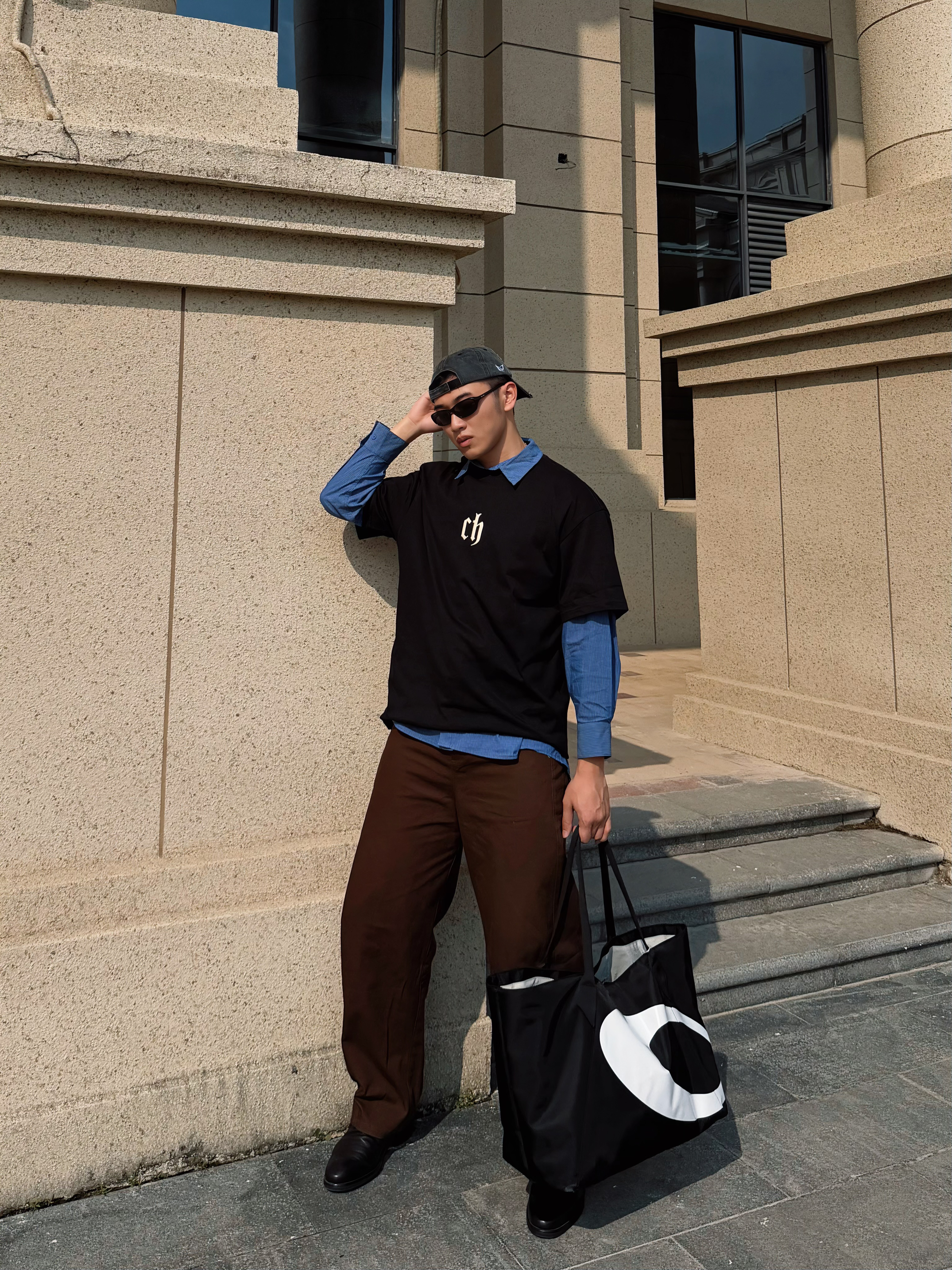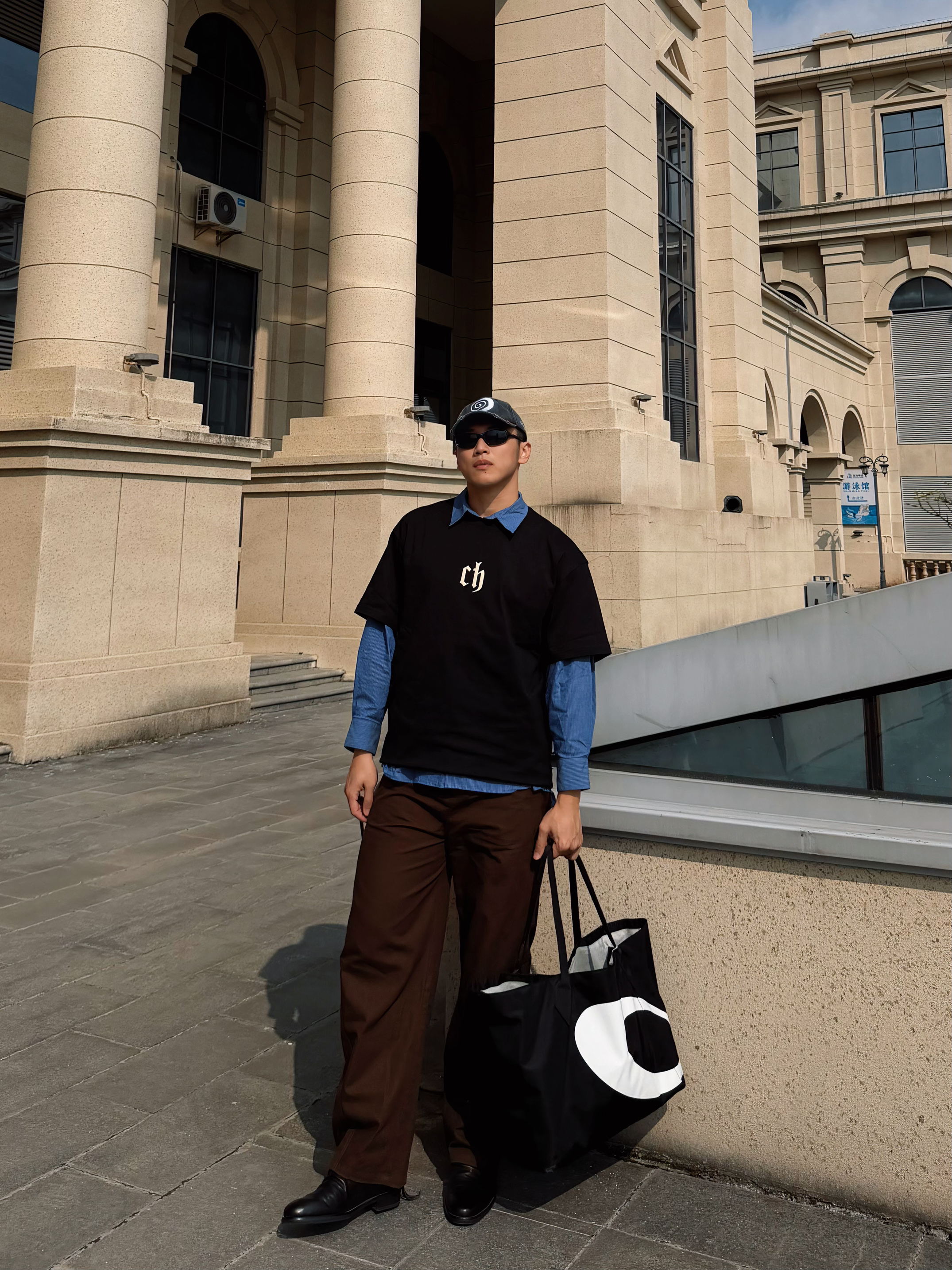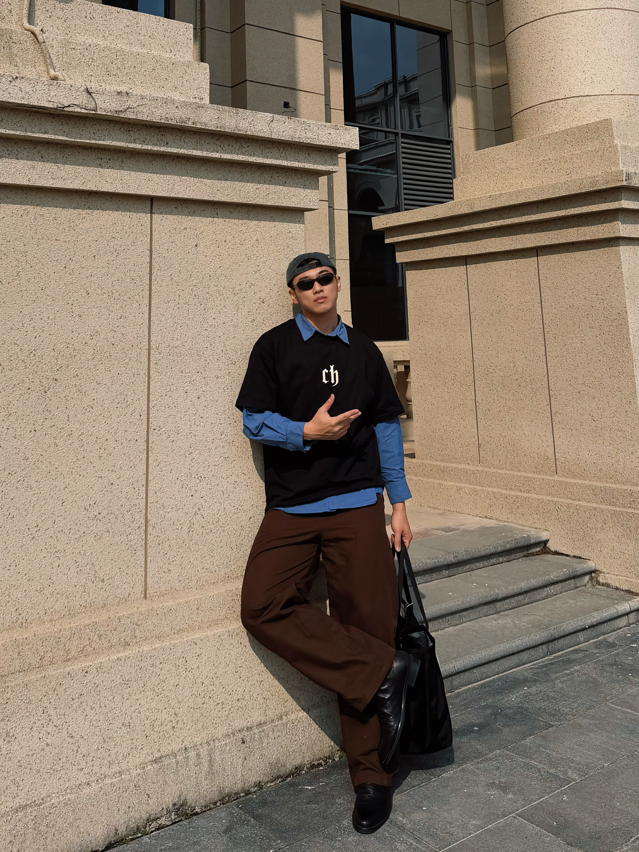 早春的风还带着凉意,用叠穿解锁层次美学。黑色oversize T恤叠穿蓝色衬衫,经典的“假两件”公式碰撞出复古学院感,胸口的字母印花注入街头基因。深棕色阔腿裤垂坠感拉满,中和了上半身的厚重,与黑色皮鞋?形成沉稳的色彩呼应。反戴棒球帽与墨镜,瞬间切换成随性的citywalk模式,在古典 建筑前形成新旧美学的碰撞。 这一套look精准踩中松弛感、复古回潮、无性别穿搭的时尚关键词,用基础款打造出不费力的...