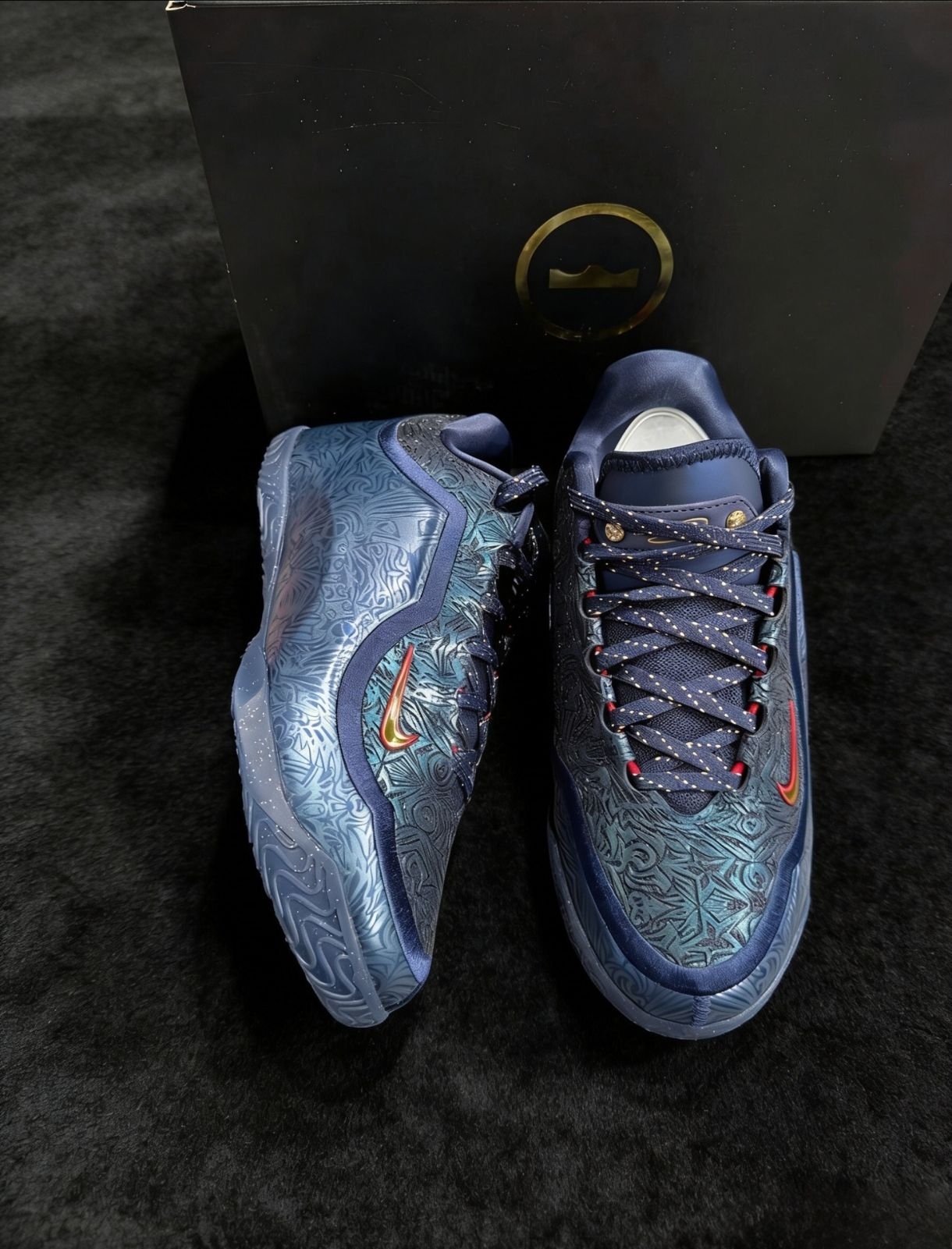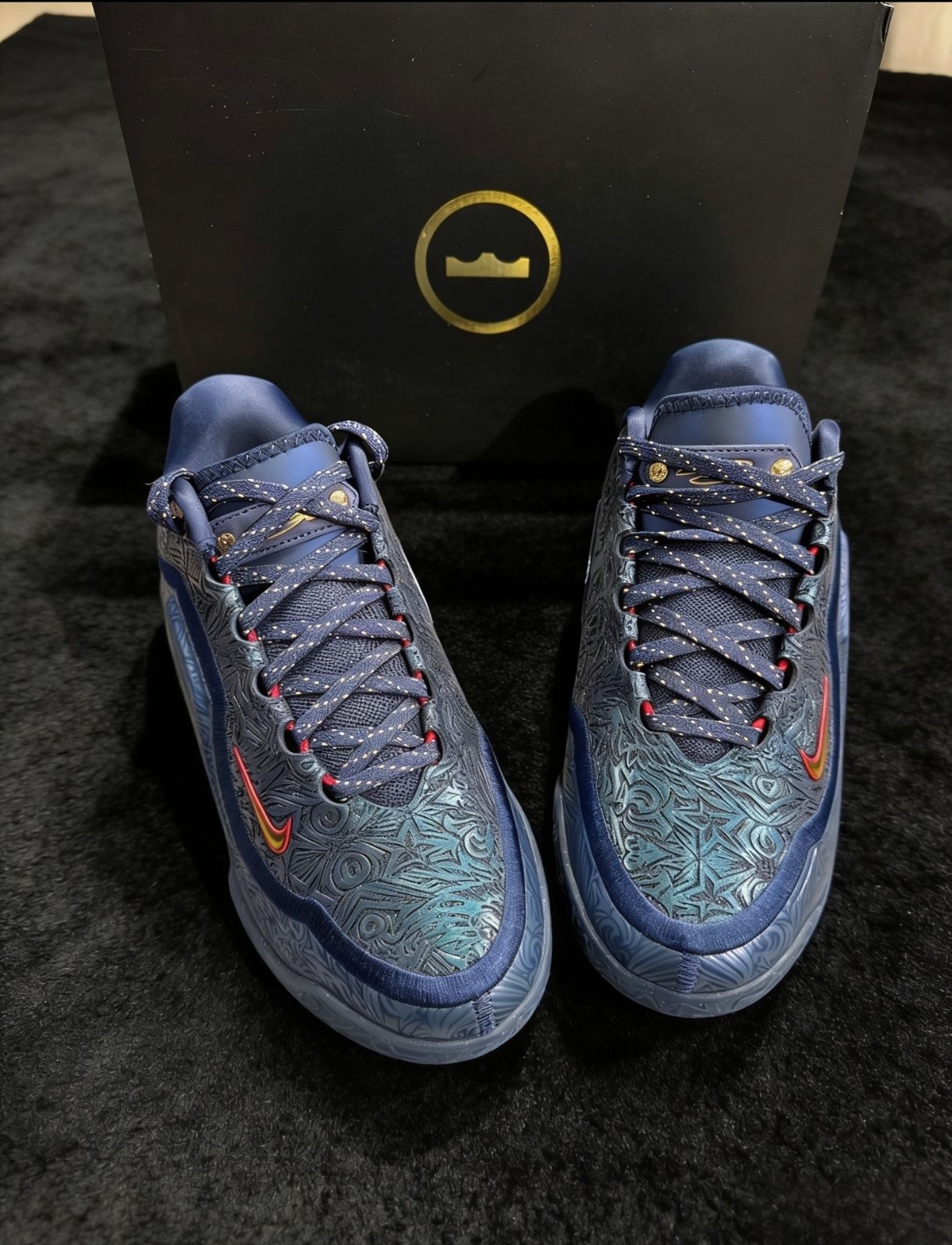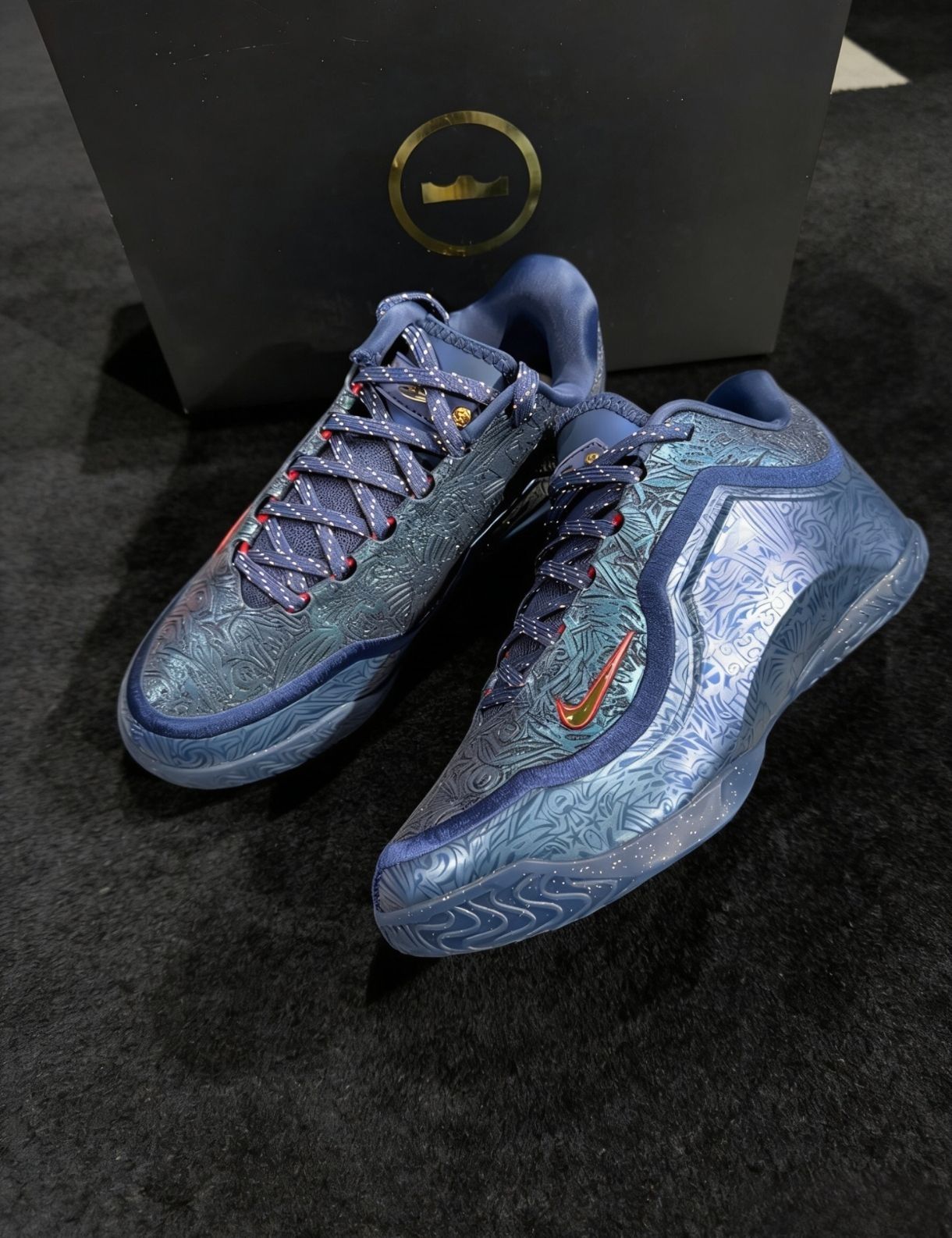 谁能拒绝这双满是细节的篮球鞋啊💙 Nike LeBron23「Out for Redemption」救赎之队配色,灵感来自2008年北京奥运会的传奇时刻,午夜蓝鞋面搭配镭射纹理,像把奥运赛场的星光都刻在了鞋上✨ 鞋带里的金丝点缀、鞋眼的红色细节,还有后跟的金色元素,处处都是致敬Hyperdunk 2008的小心思,质感直接拉满。 不管是上场实战还是日常出街,这双鞋都能hold住,詹姆斯球迷和球鞋控...