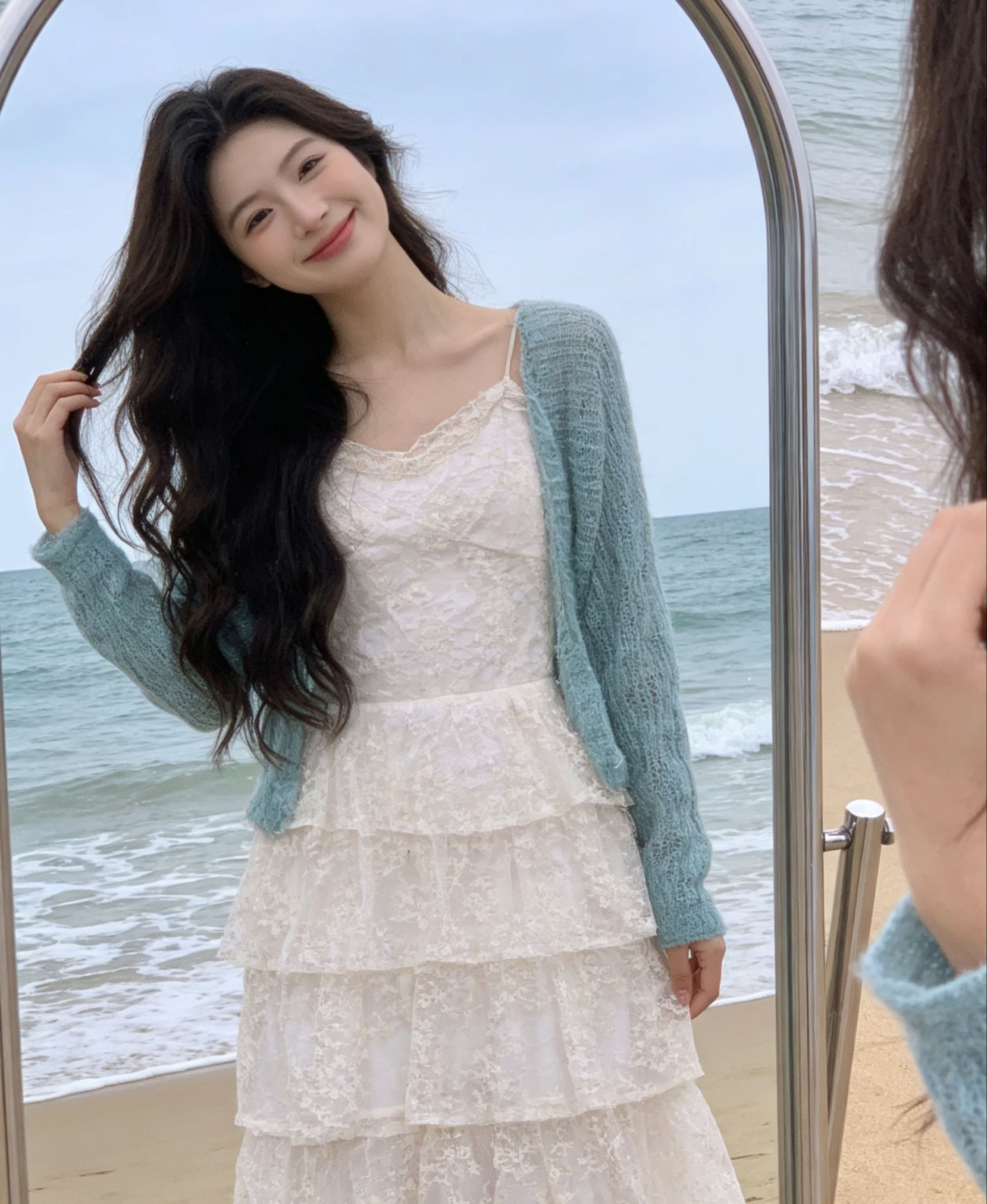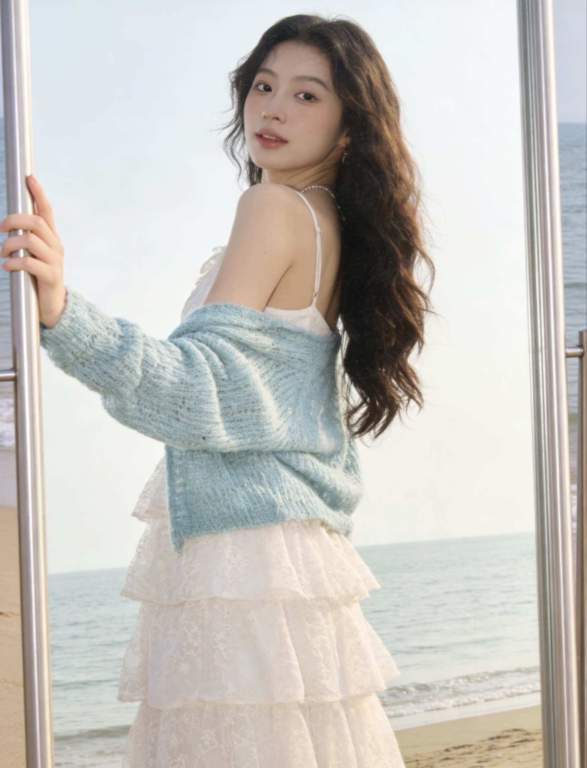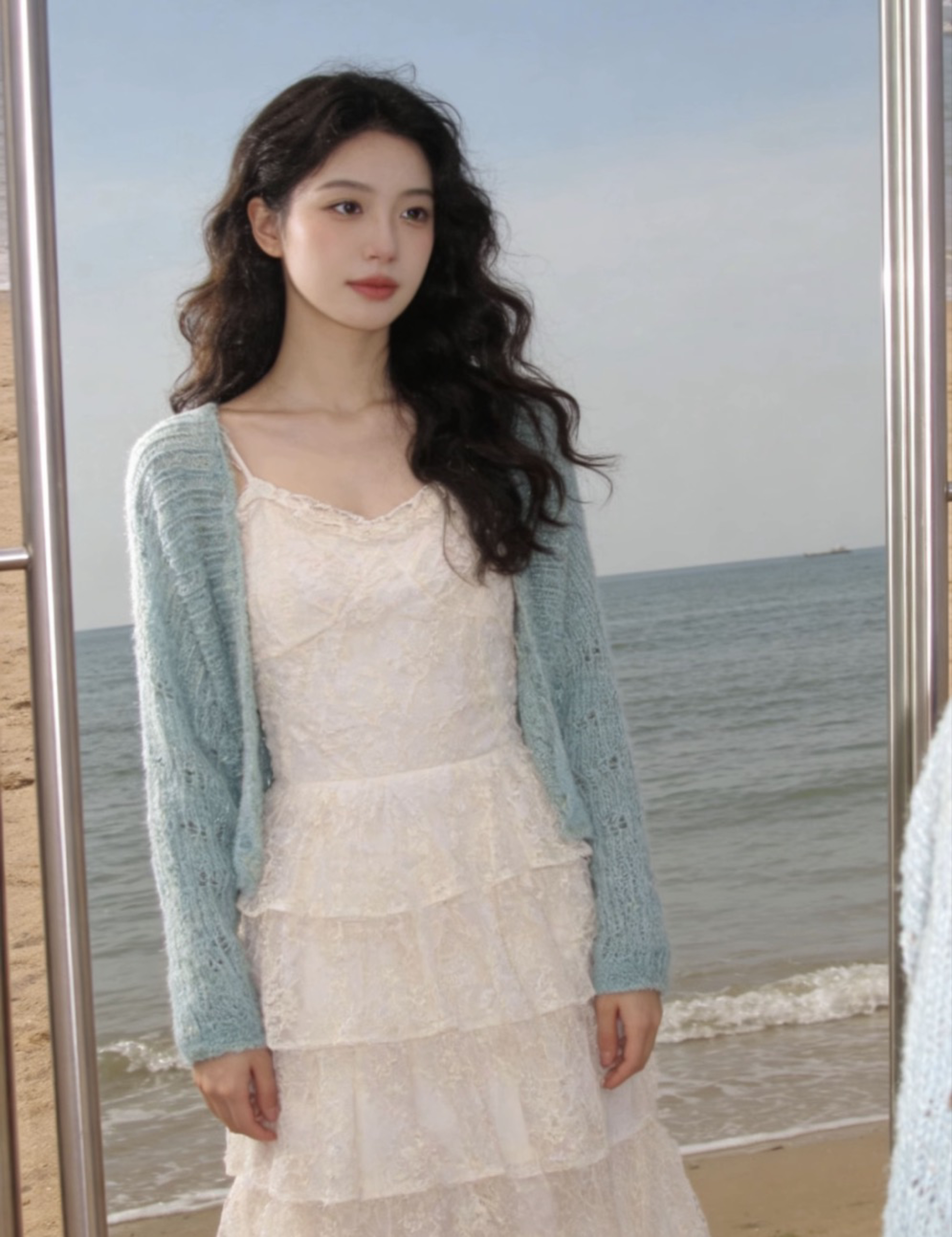 今日穿搭分享 薄荷绿针织外套➕白色蛋糕长裙 这套穿搭很适合春天 出门拍照很出片 裙子很修身 青春气息满满 薄荷绿很显白 这个版型也很显瘦~