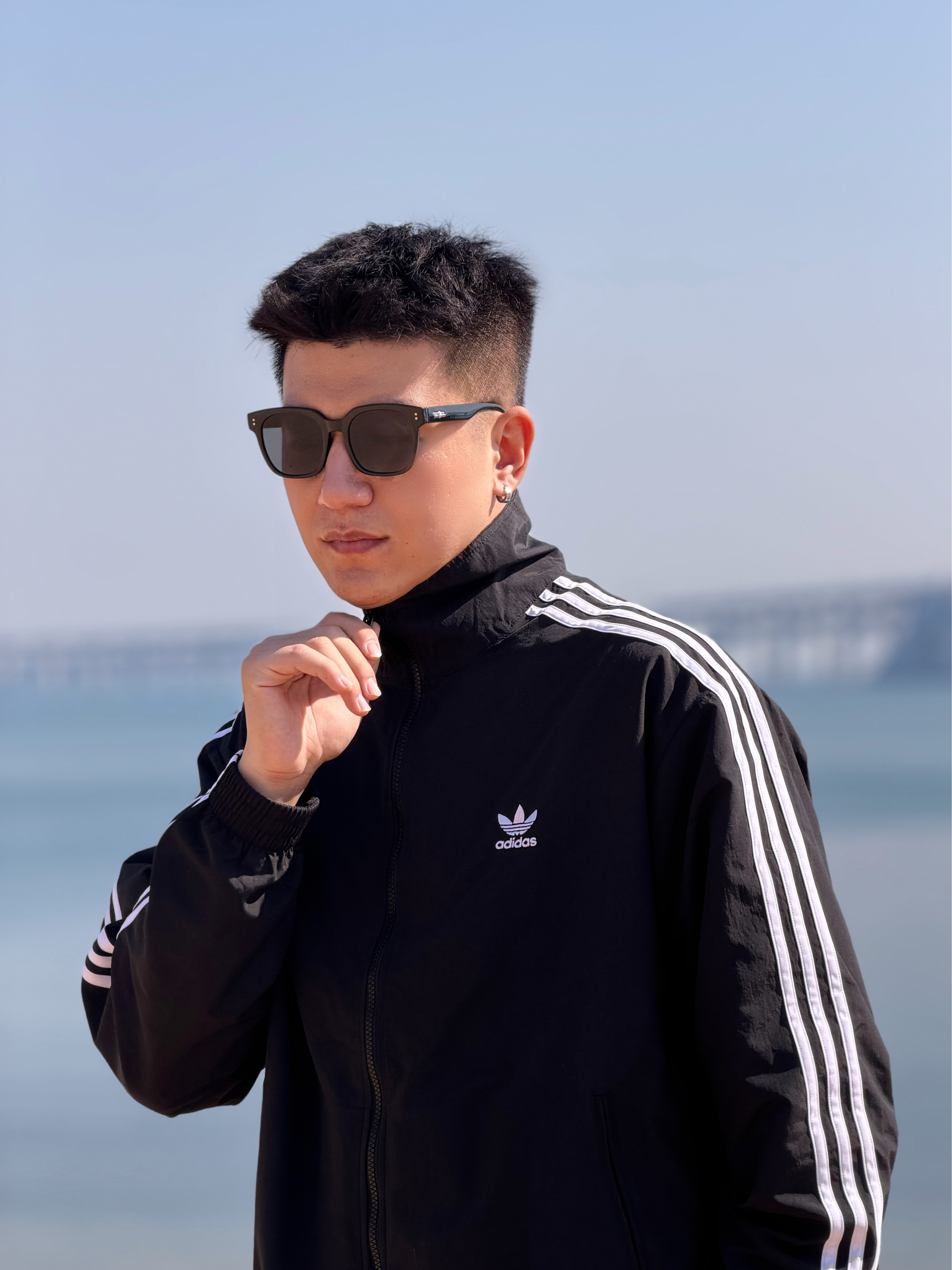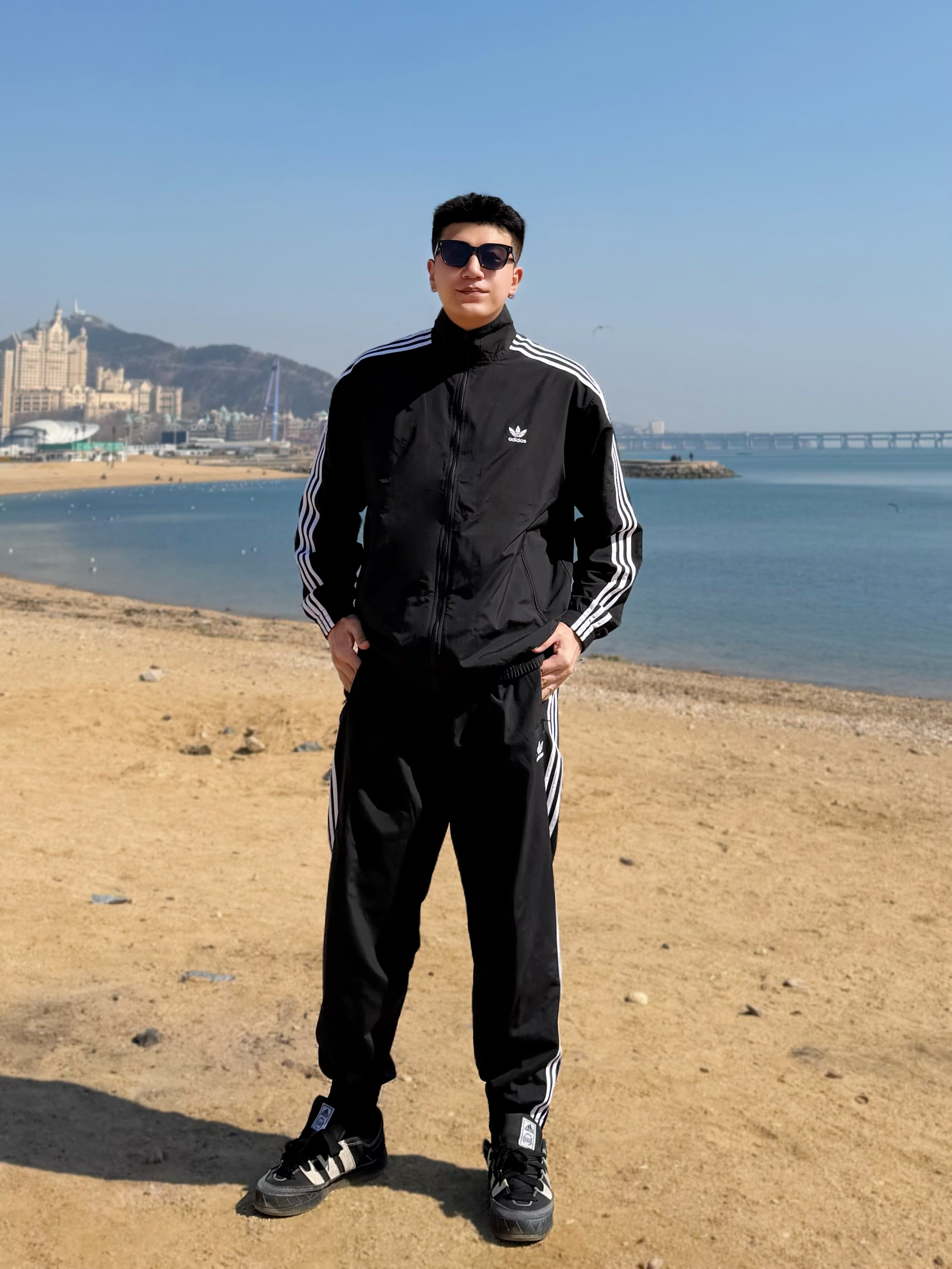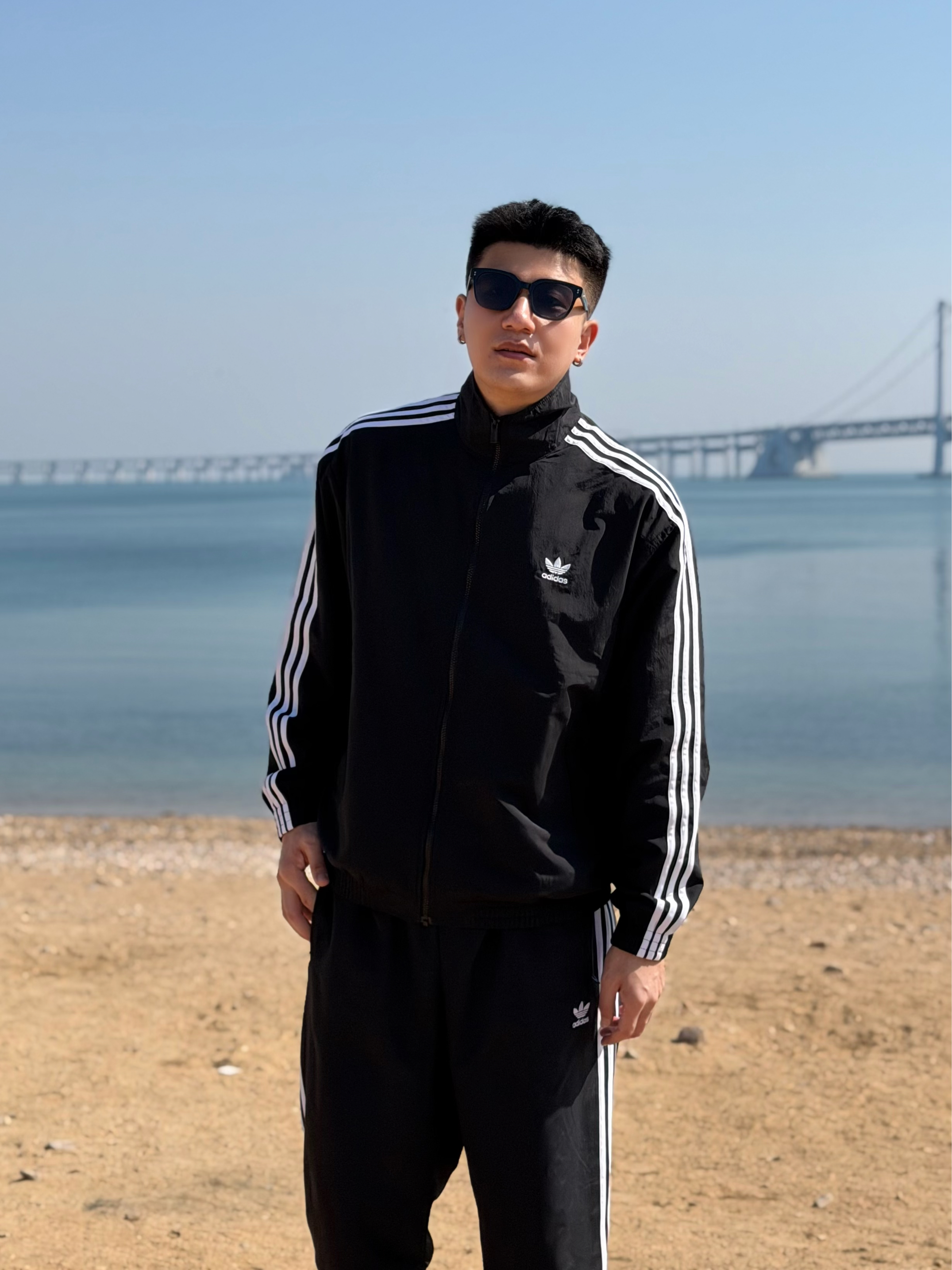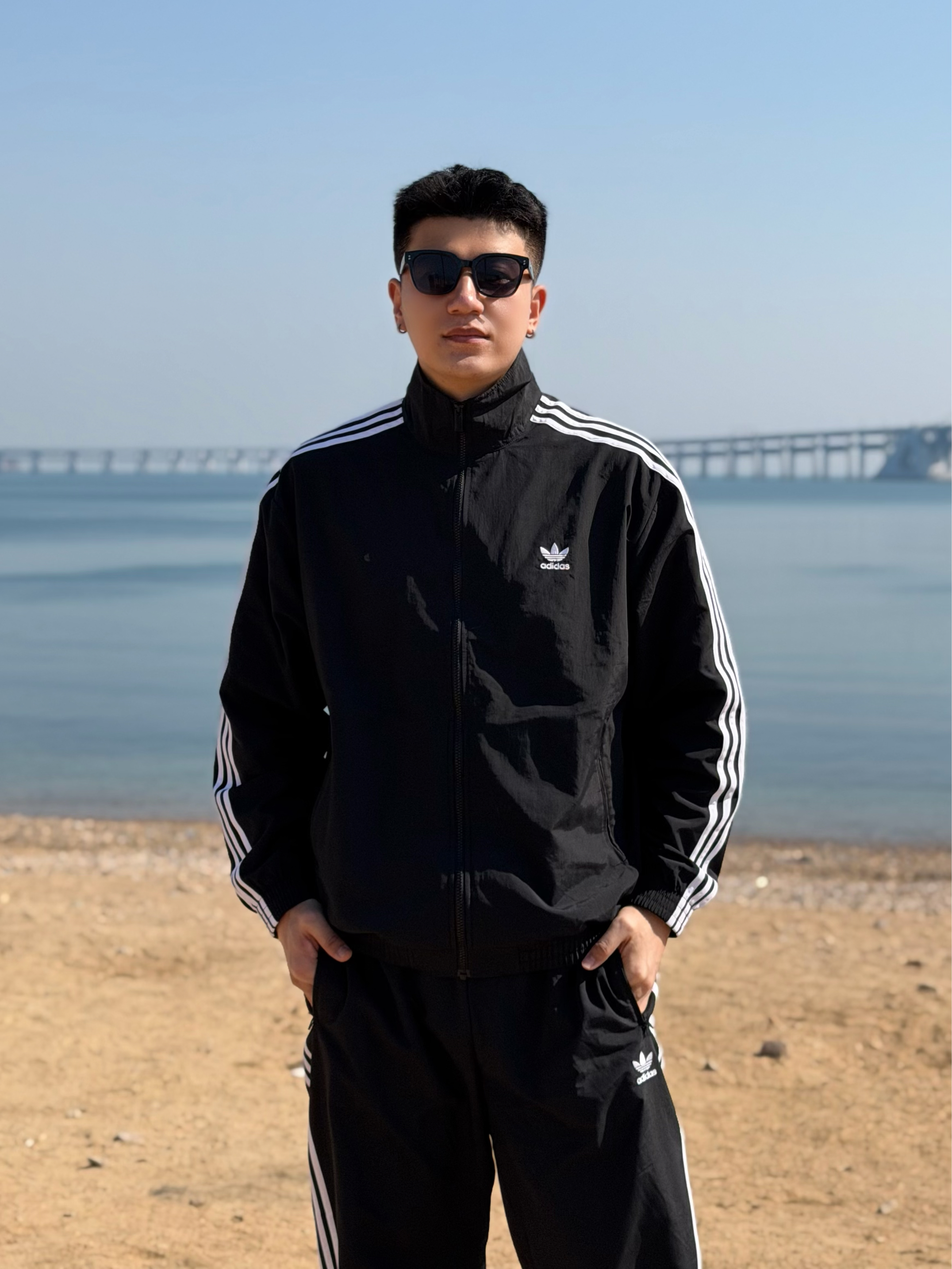 上身这套阿迪我真的爱住🖤 不用想太多 一套上身就很有型😎 外套是那种挺括的立领 白色条纹点缀得刚好 裤子也是同系列 宽松收腿设计 运动感十足 一身黑➕黑白配色板鞋 清爽又带点复古味 这一套真的就是运动感和痞酷感结合,太酷啦✌🏻 👦🏻:188 | 85 🧥:XXL 👖:XXL 大家觉得这套还能怎么搭~