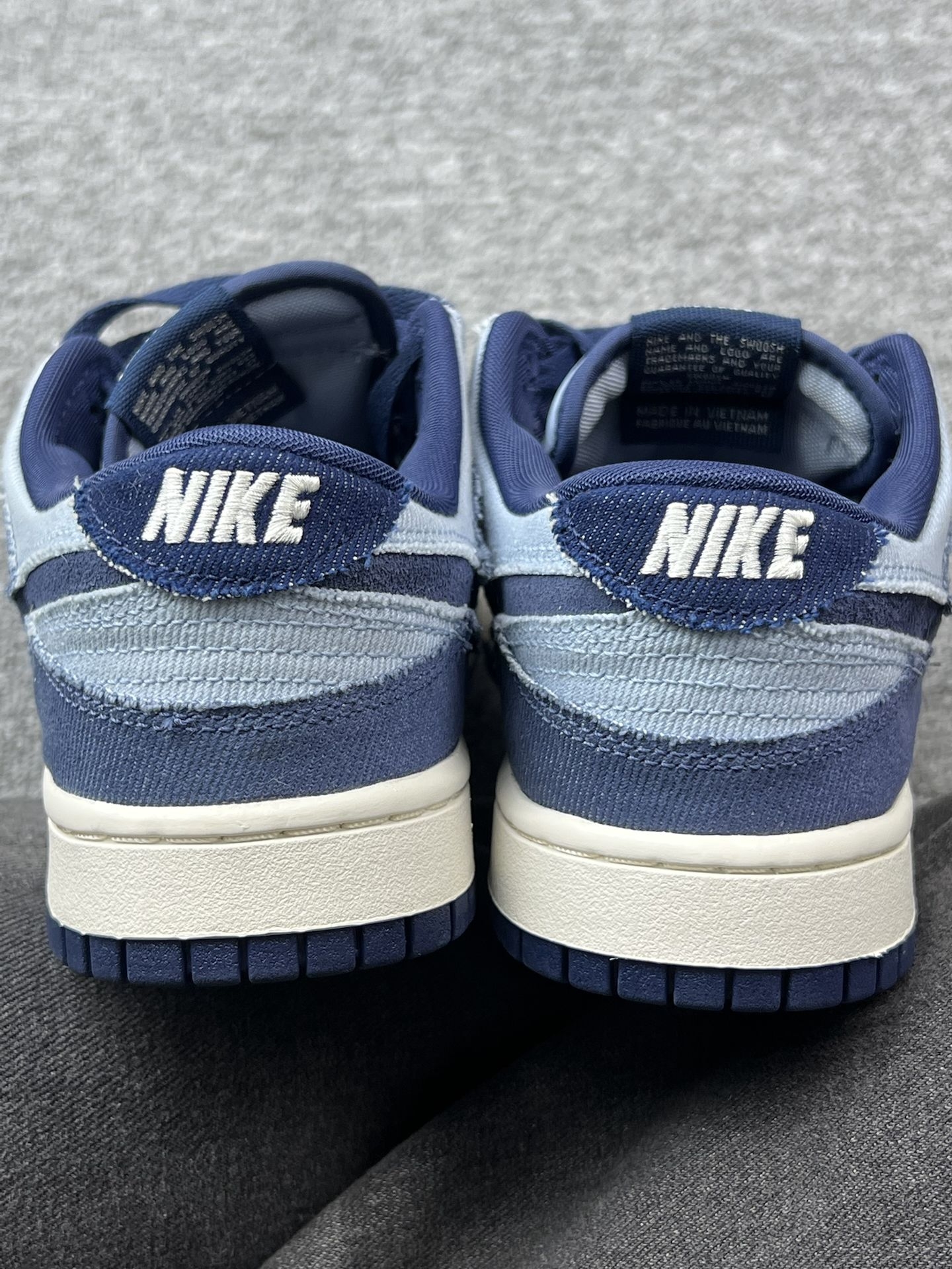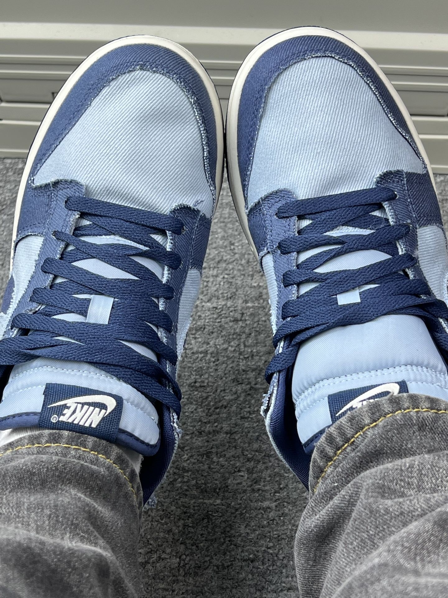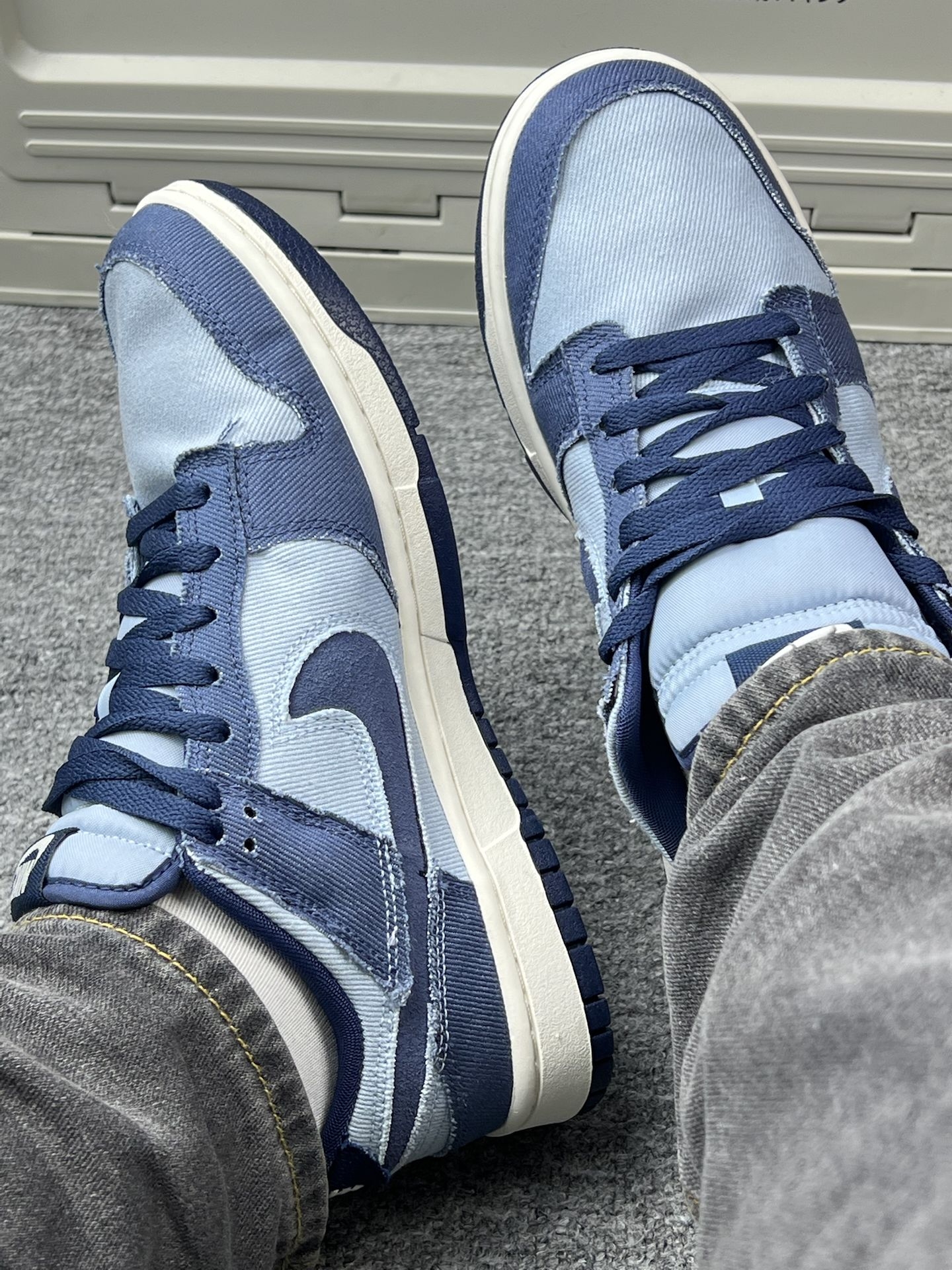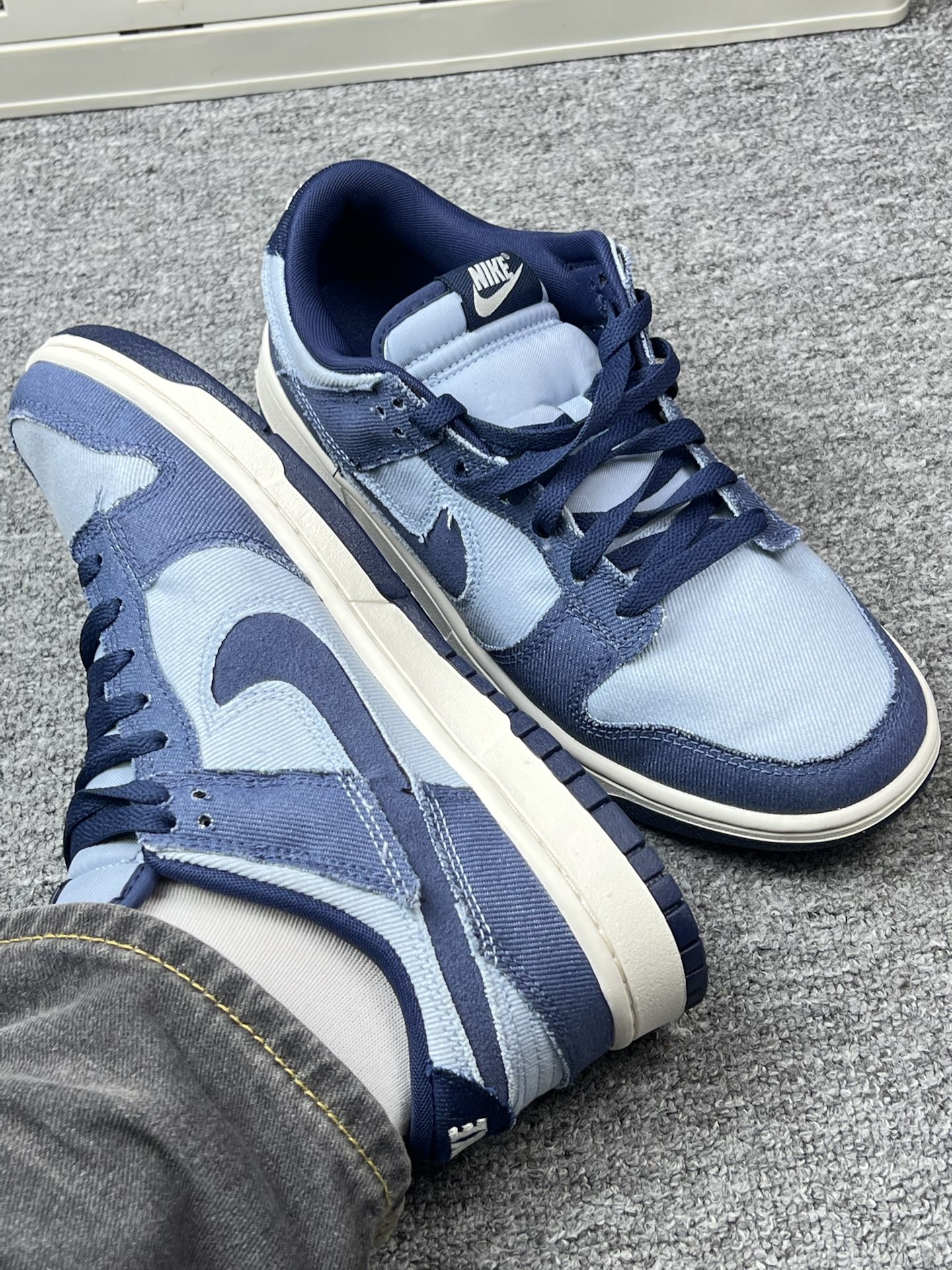 怪不得这么多男大学生都喜欢穿|||入手这双Nike Dunk低帮已经有段时间了,浅蓝和深蓝的牛仔布拼接,视觉上挺清爽的🌿。上脚第一感觉是鞋型挺贴合脚型,不会有挤脚的情况,日常通勤或者周末逛个街,走个大半天,脚也没觉得特别累[捂脸_blue][捂脸_blue] 牛仔布的材质摸起来有点糙糙的,但透气性还不错,夏天穿不会闷脚。搭配方面,我试过配牛仔裤、运动裤,休闲西装裤,风格都能搭得上,不会显得很突兀...