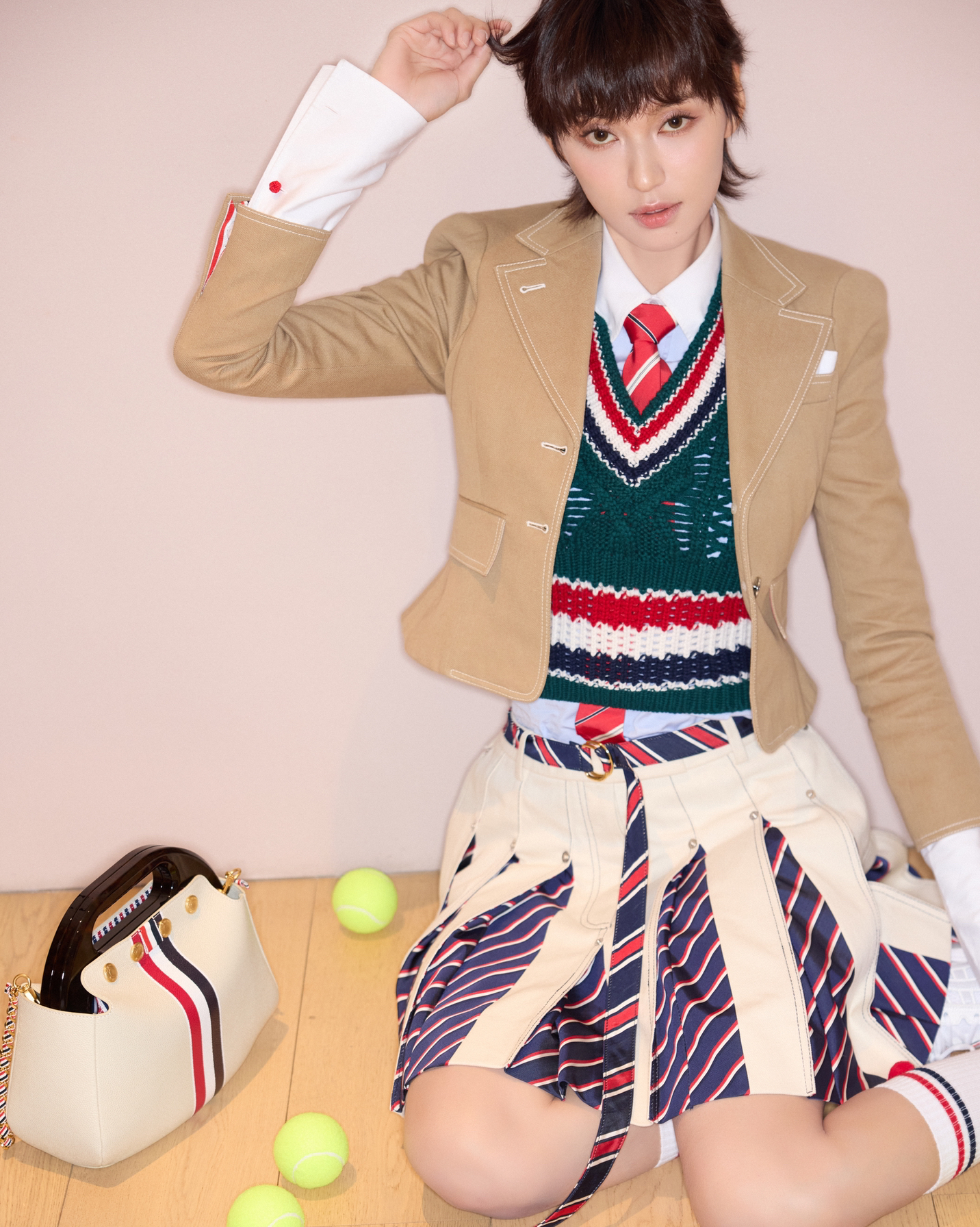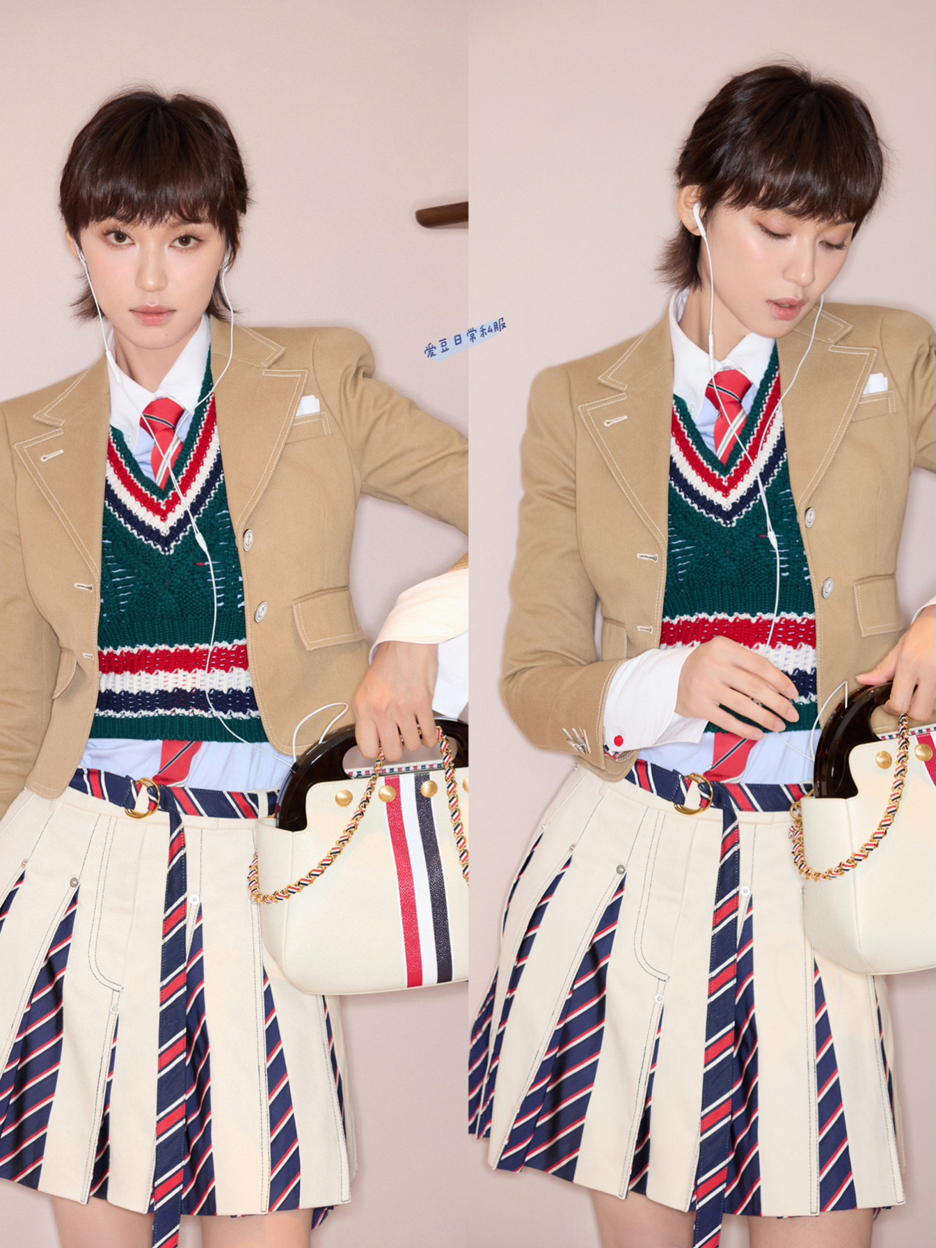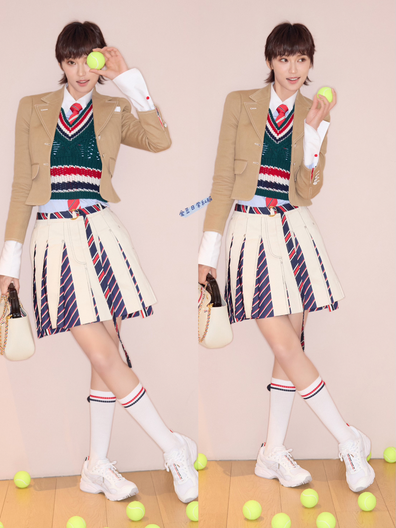 时髦学姐的短发造型搭配上这套韩系网球风🎾,清爽时髦又高级!最近王丹妮出席了某品牌活动,上脚的Thom browne x ASICS运动鞋搭配上卡其色西装和条纹条纹百褶裙,经典的红白蓝元素和姐姐短发利落的气质完全就是高级的老钱风!这套真的爱了! CR:@网络
