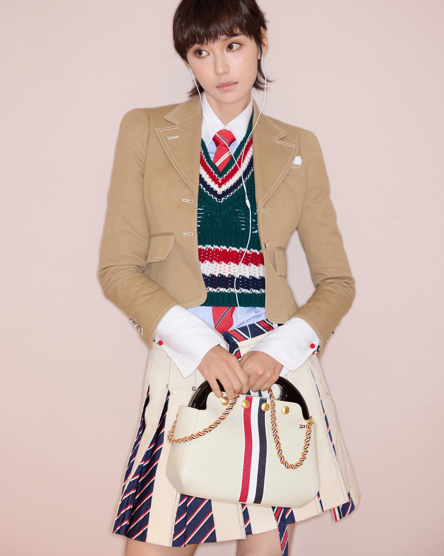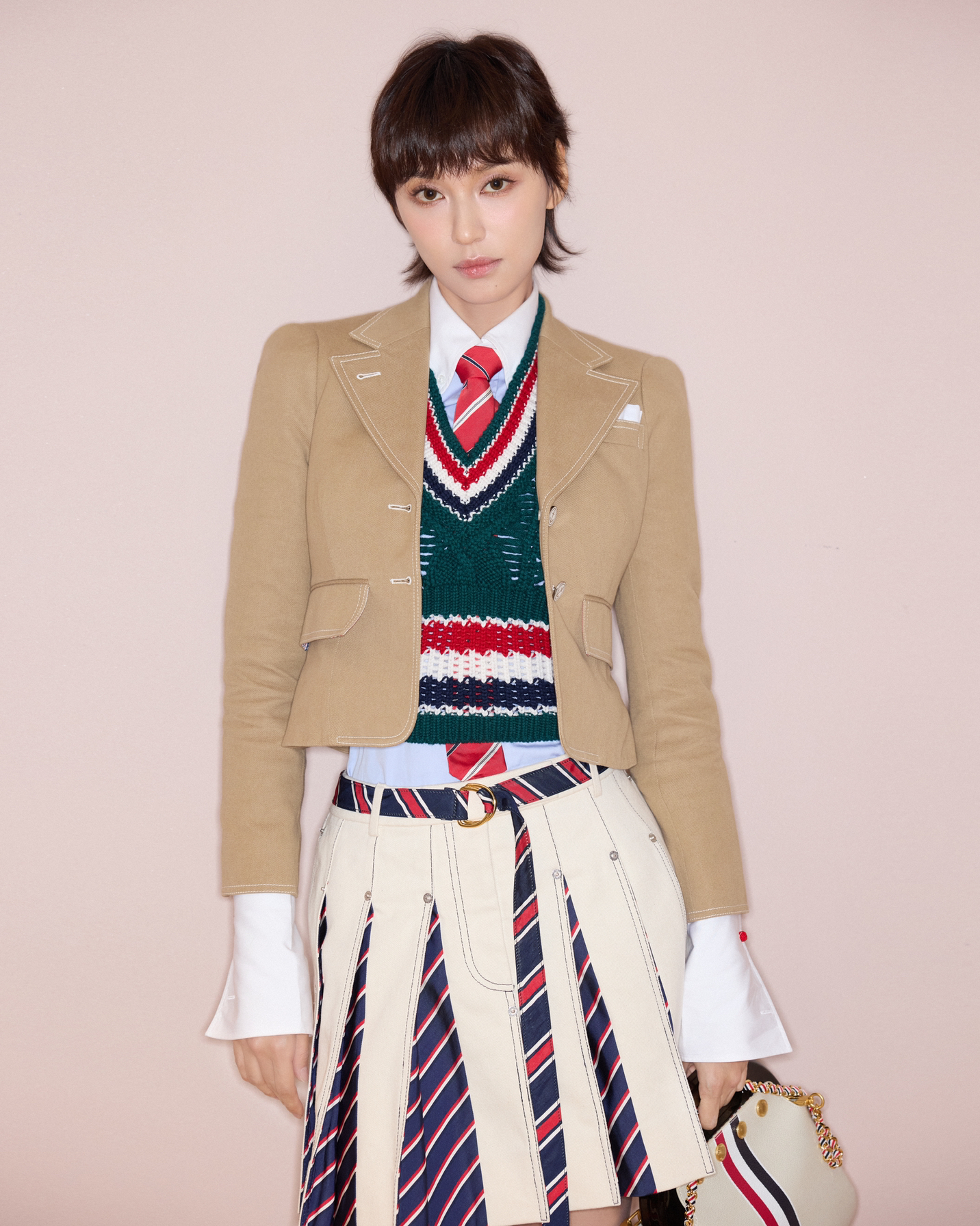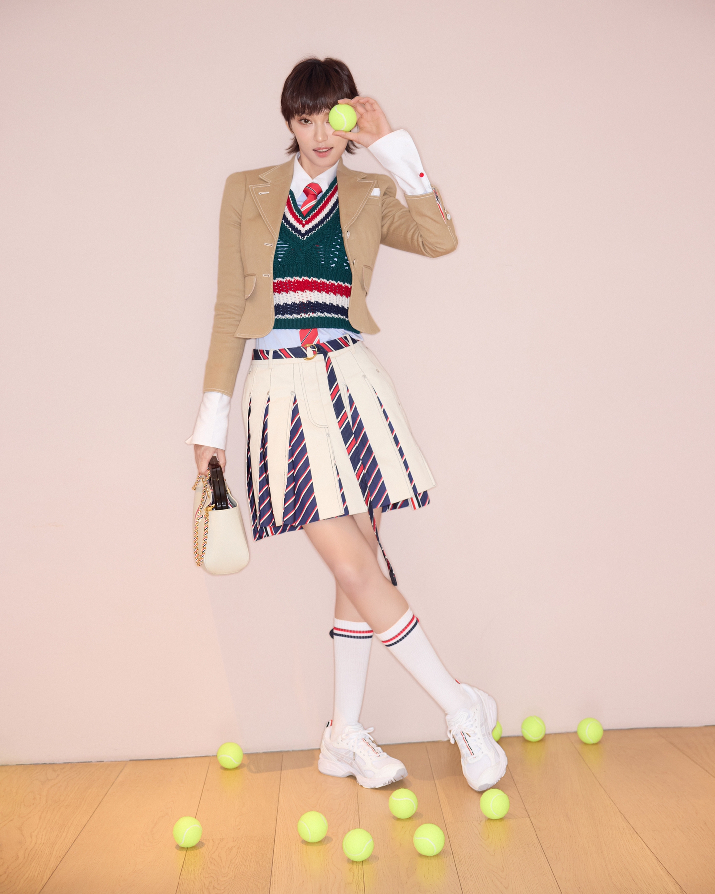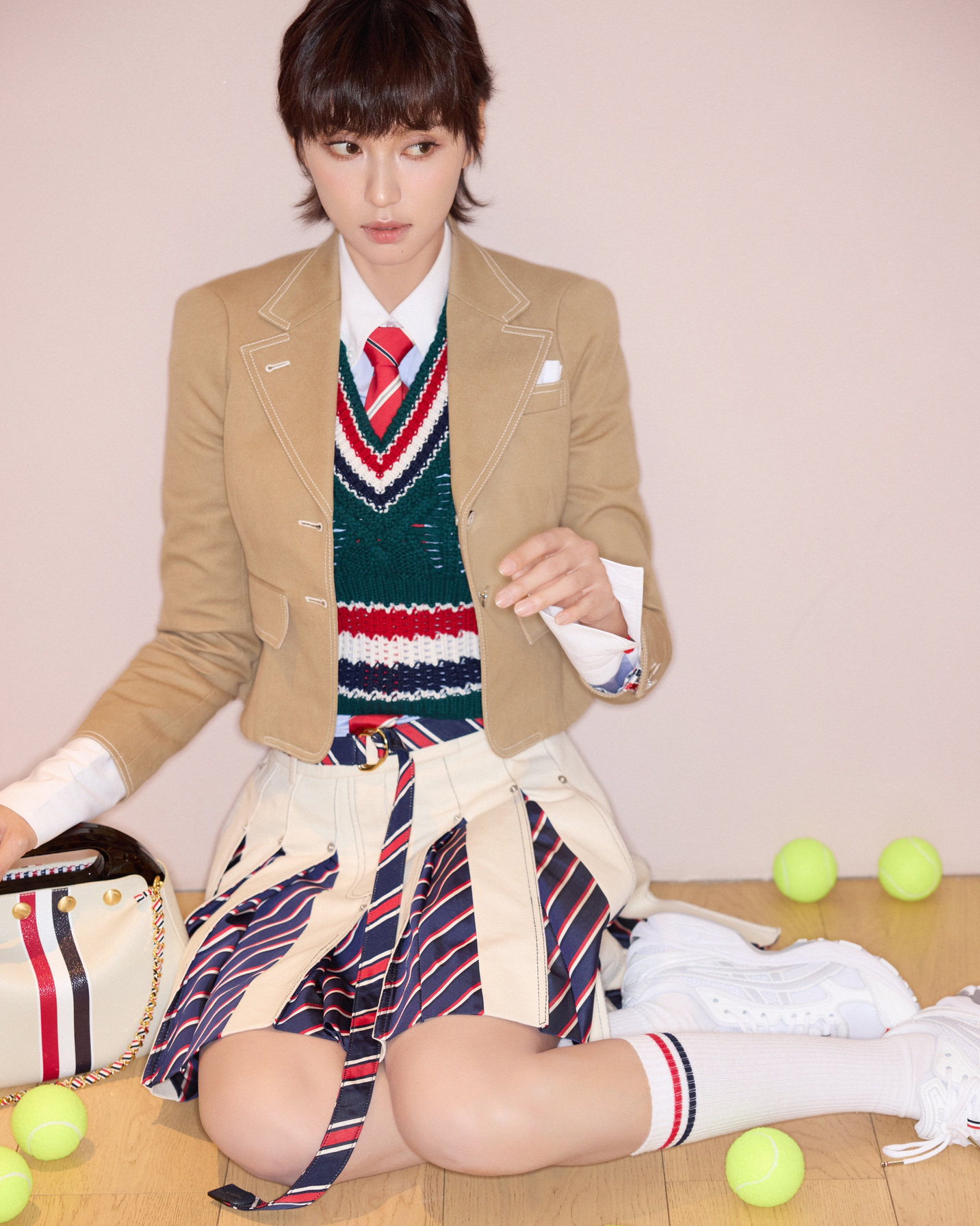 时髦学姐的短发造型搭配上这套韩系网球风🎾,清爽时髦又高级!最近王丹妮出席了某品牌活动,上脚的Thom browne x ASICS运动鞋搭配上卡其色西装和条纹条纹百褶裙,经典的红白蓝元素和姐姐短发利落的气质完全就是高级的老钱风!这套真的爱了! CR:@网络