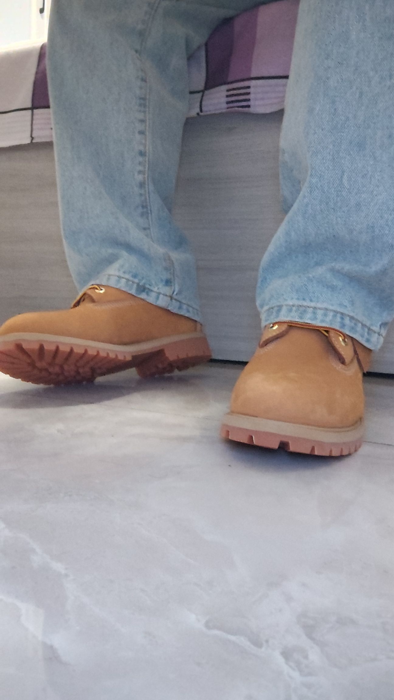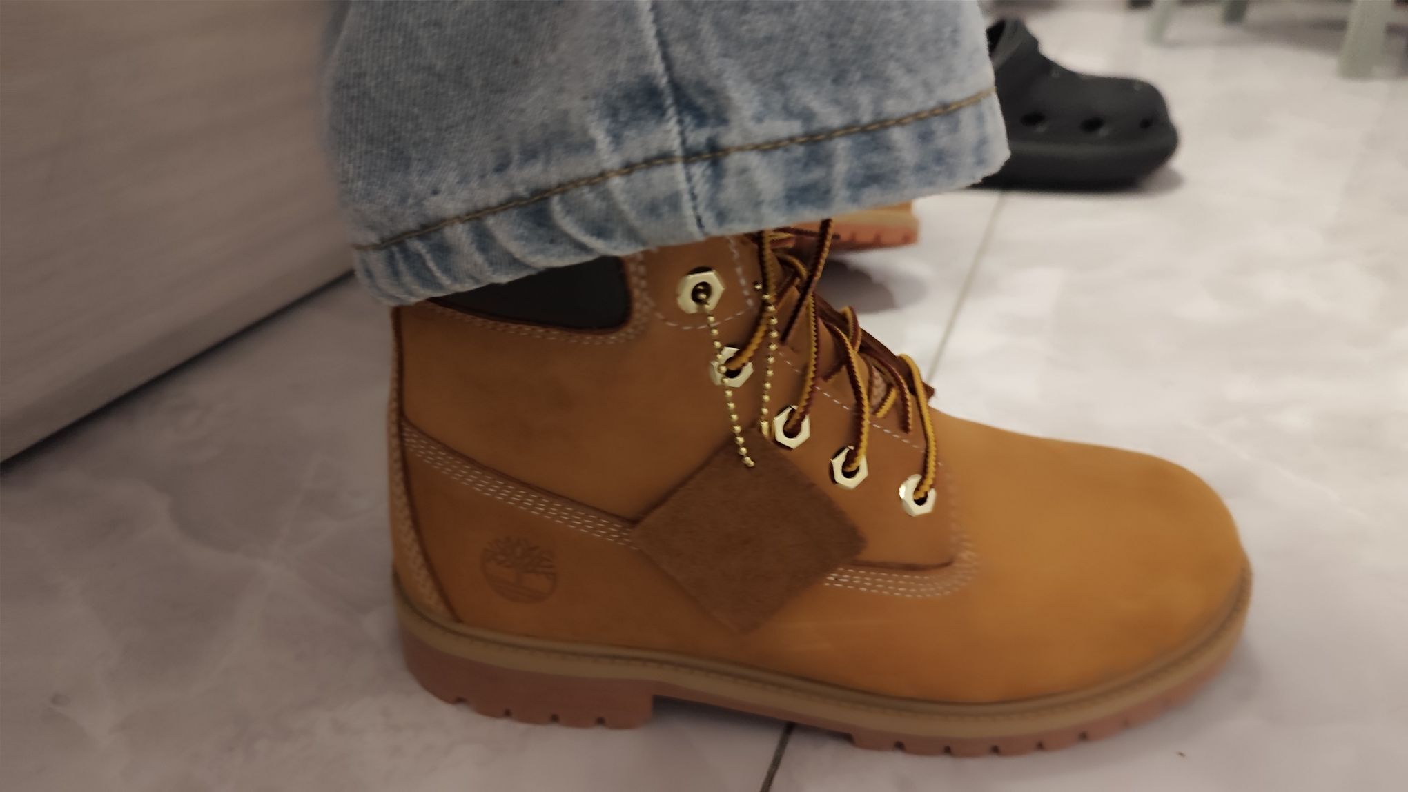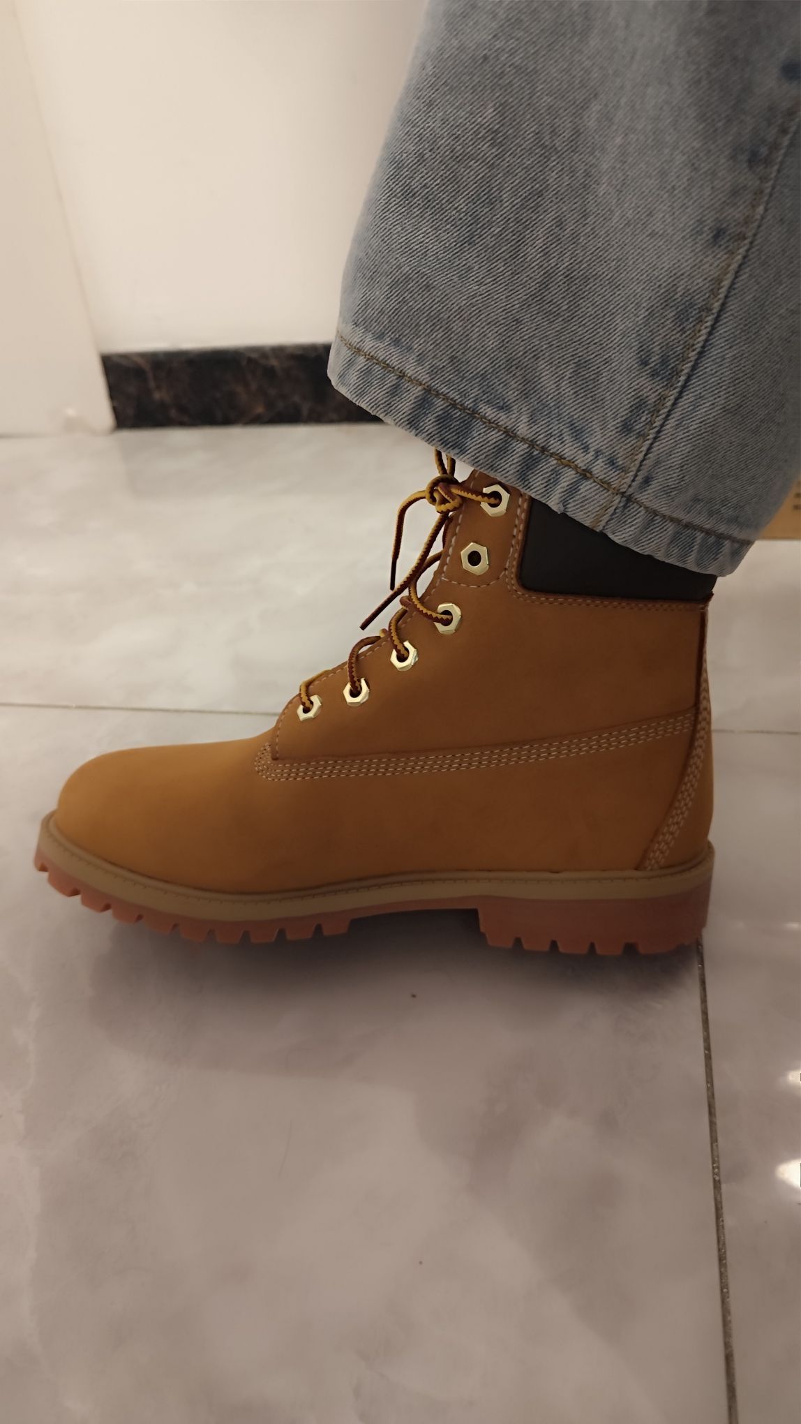 也是穿上这双很经典的大黄靴了啊,嗯,它的外表呢看起来没毛病,那确实是很好看了,但是如果一定要说的话,这双鞋真的是蛮捂脚的,而且穿上刚走几步路,就感觉脚脖子的位置有点卡。的话,所以如果真的很想穿的话,鞋舌里确实像网上说的一样,要进行一下稍微的修改,以及如果有条件的话,鞋垫可以换一个稍微软一点的,还有就是。这双鞋适合深秋或者是早春的时候来穿,因为冬天在东北的温度穿它会有点冻脚,而夏天就不用想了,完全穿...