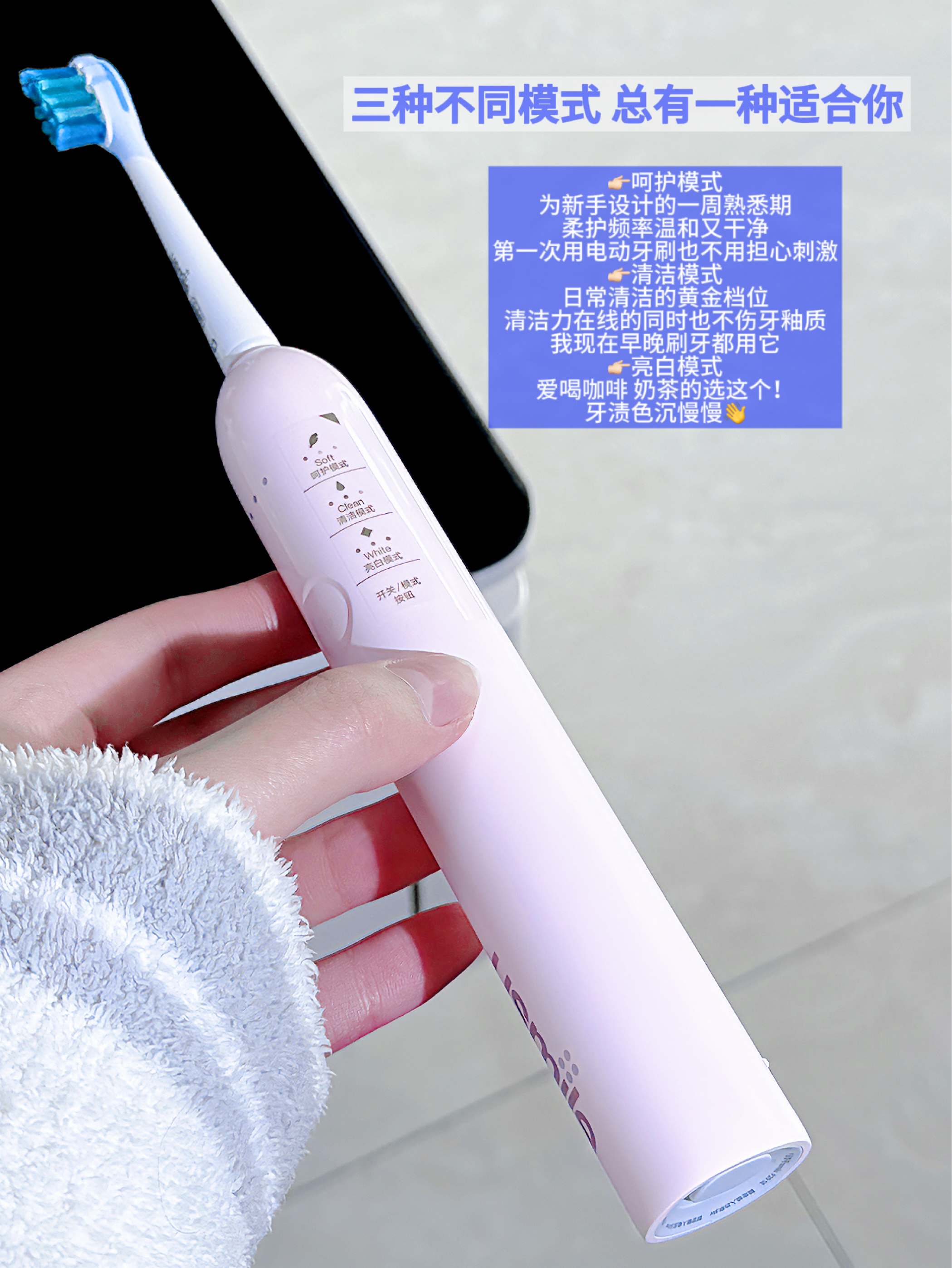 之前我总觉得电动牙刷是智商税 这不就是个会震动的塑料杆?还不如手动刷得干净… 直到我遇到了usmile 这把电动牙刷一开始我是冲着颜值入的! 但没想到实力也那么在线 不得不服!术业有专攻果然没错! - 粉嫩嫩的刷身有哪个小女孩能拒绝啊 放在洗漱台都是一道风景线~ 整个刷头都是包胶材质 刷毛也很柔软 即使强烈震动也只是把牙缝里的“脏东西”给震出来! 不用担心会伤到牙龈!