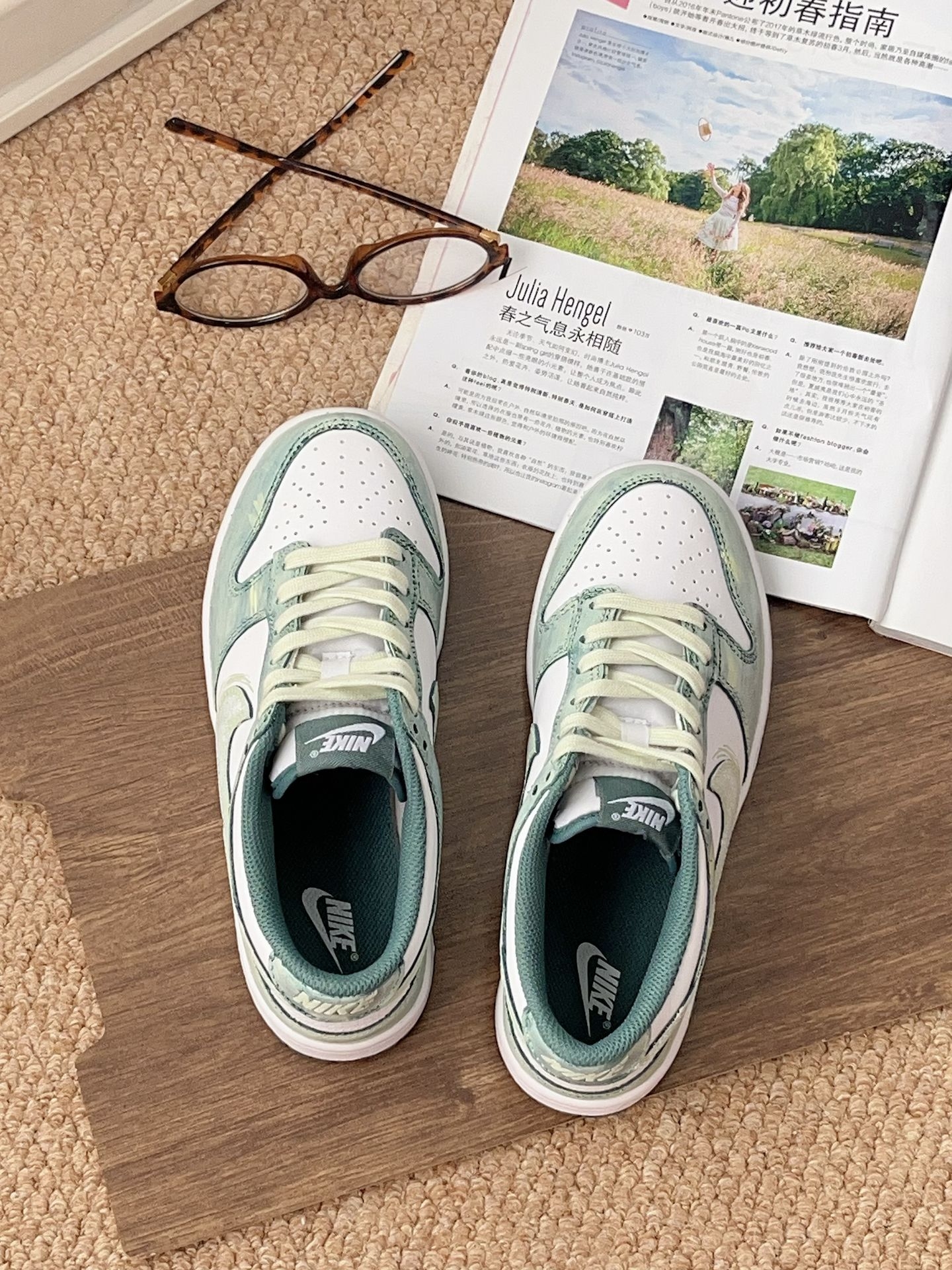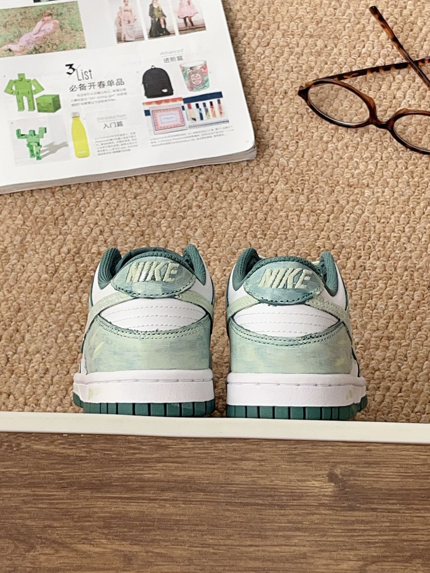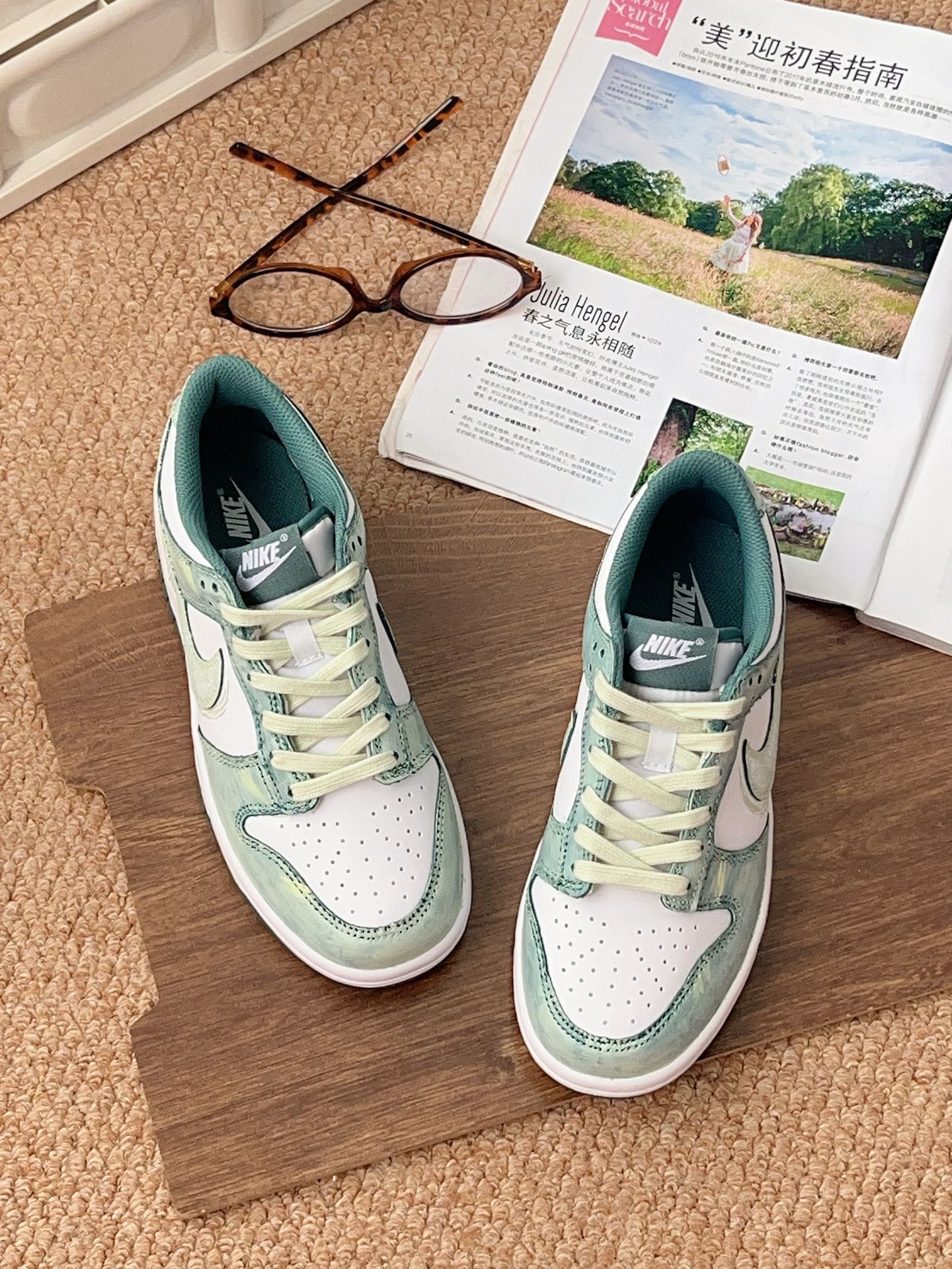 家人们!挖到宝了!这双Nike Dunk薄荷绿真的太绝了! 奶fufu的薄荷绿渐变,像一杯加了冰的青柠汽水,清爽又显白,手绘做旧的纹理直接戳中我的心巴💚 不管是配直筒牛仔裤还是百褶裙,都能秒变森系文艺少女,走路带风的感觉谁懂啊! 皮质鞋面质感在线,耐脏又好打理,学生党和打工人都能轻松驾驭~ 鞋底缓震超舒服,逛一天街都不累,鞋舌和内里的深绿撞色,细节拉满的设计感,拆箱仪式感直接拉满! 春天的第一双板...