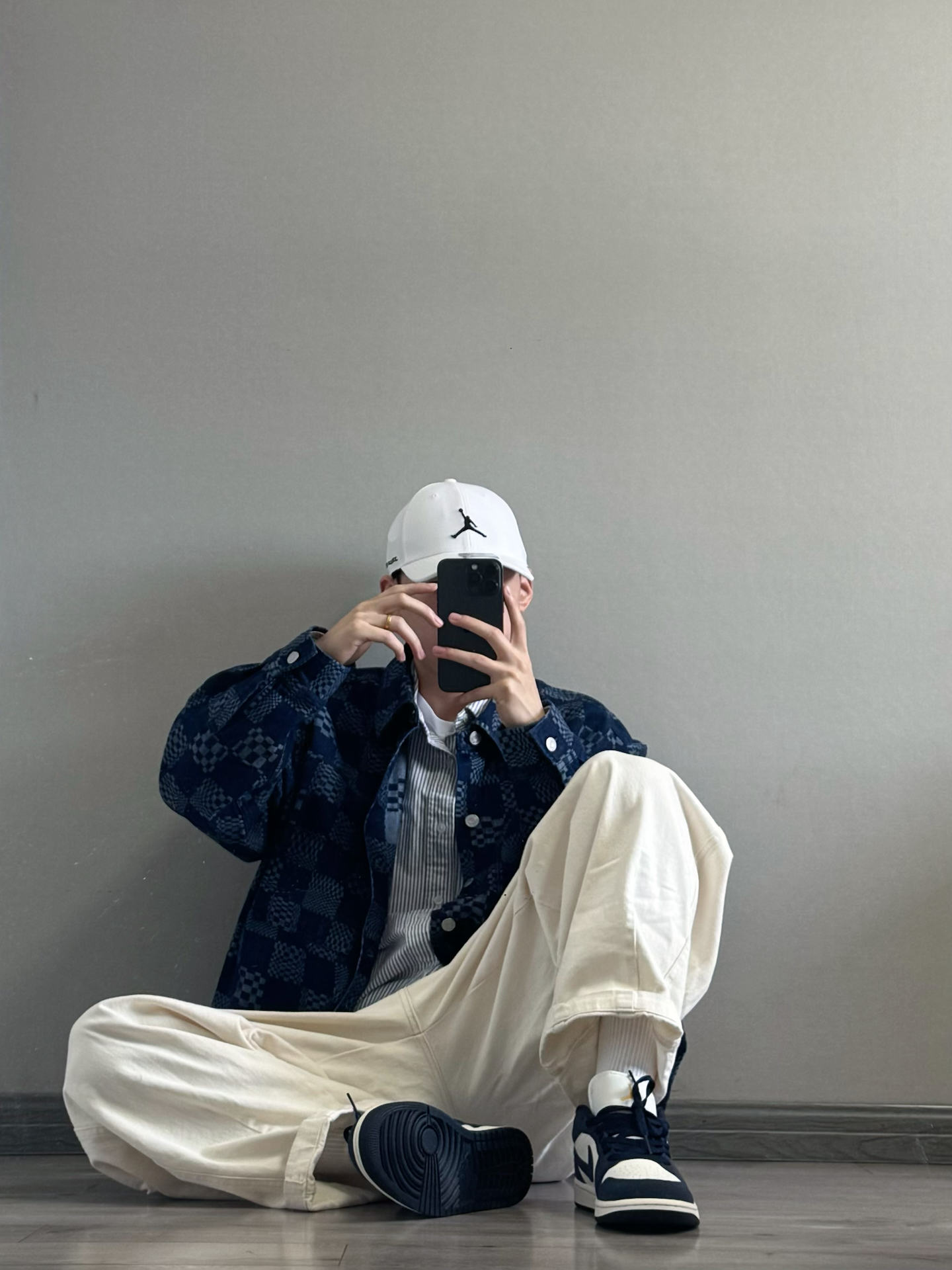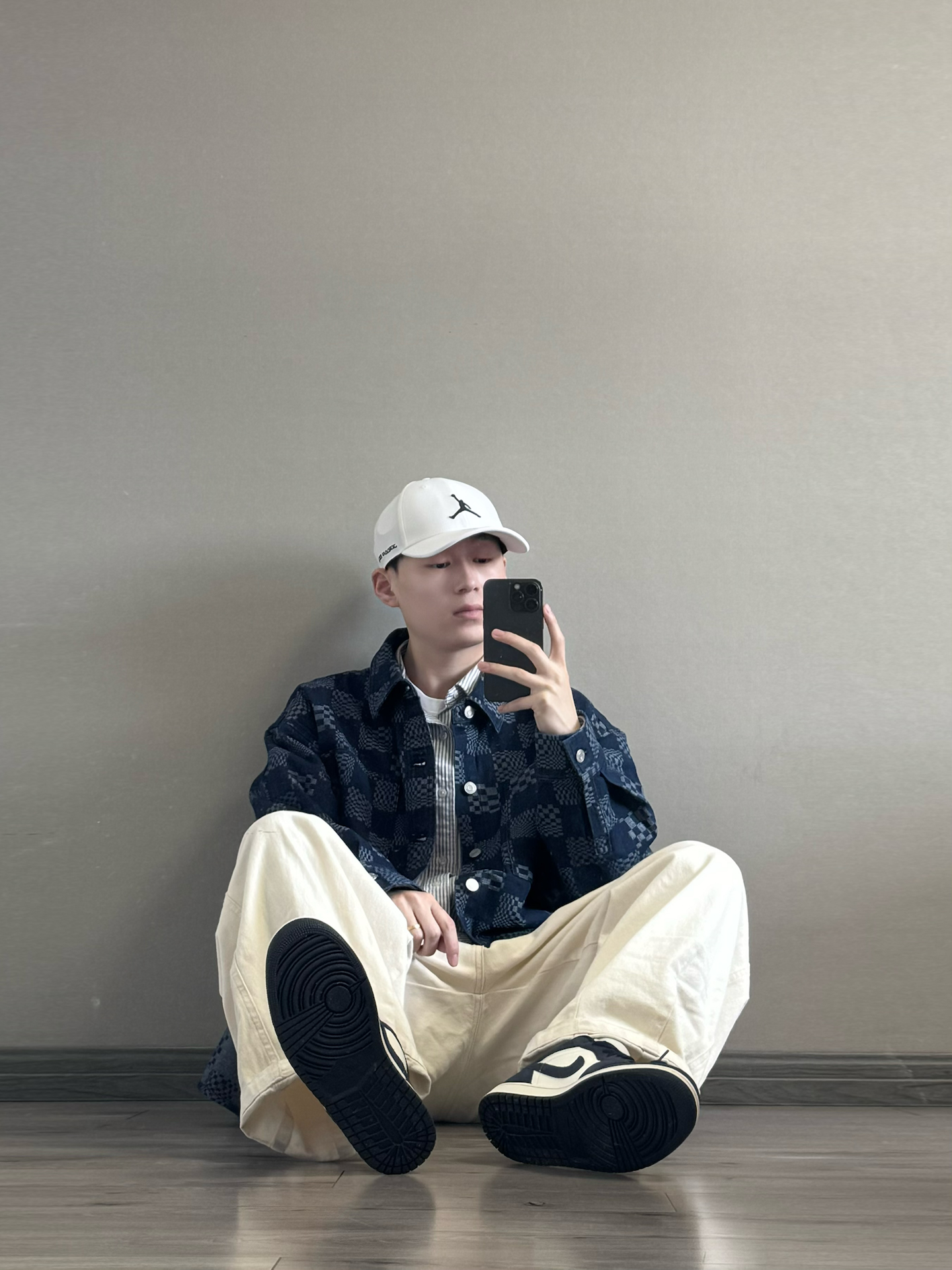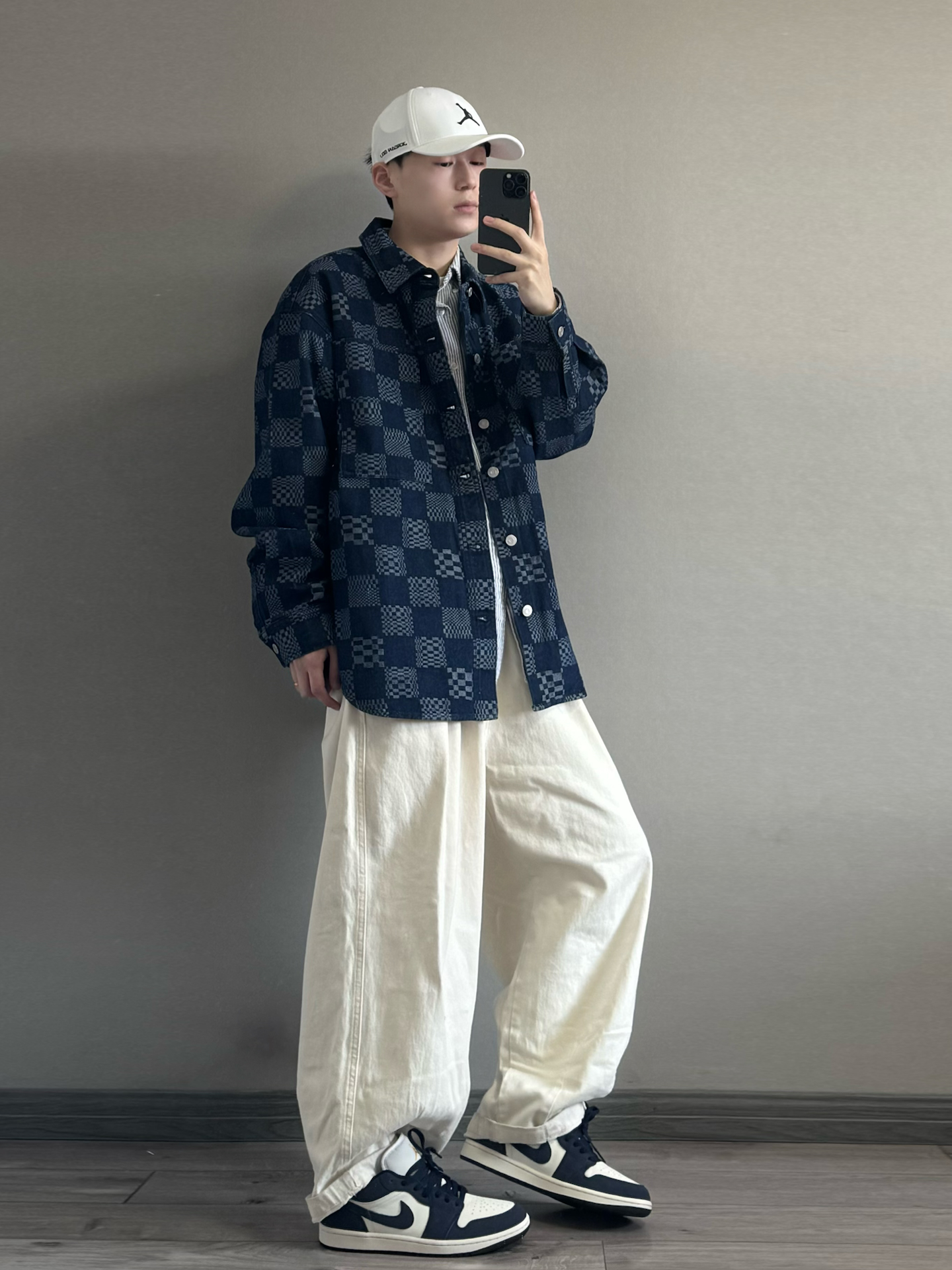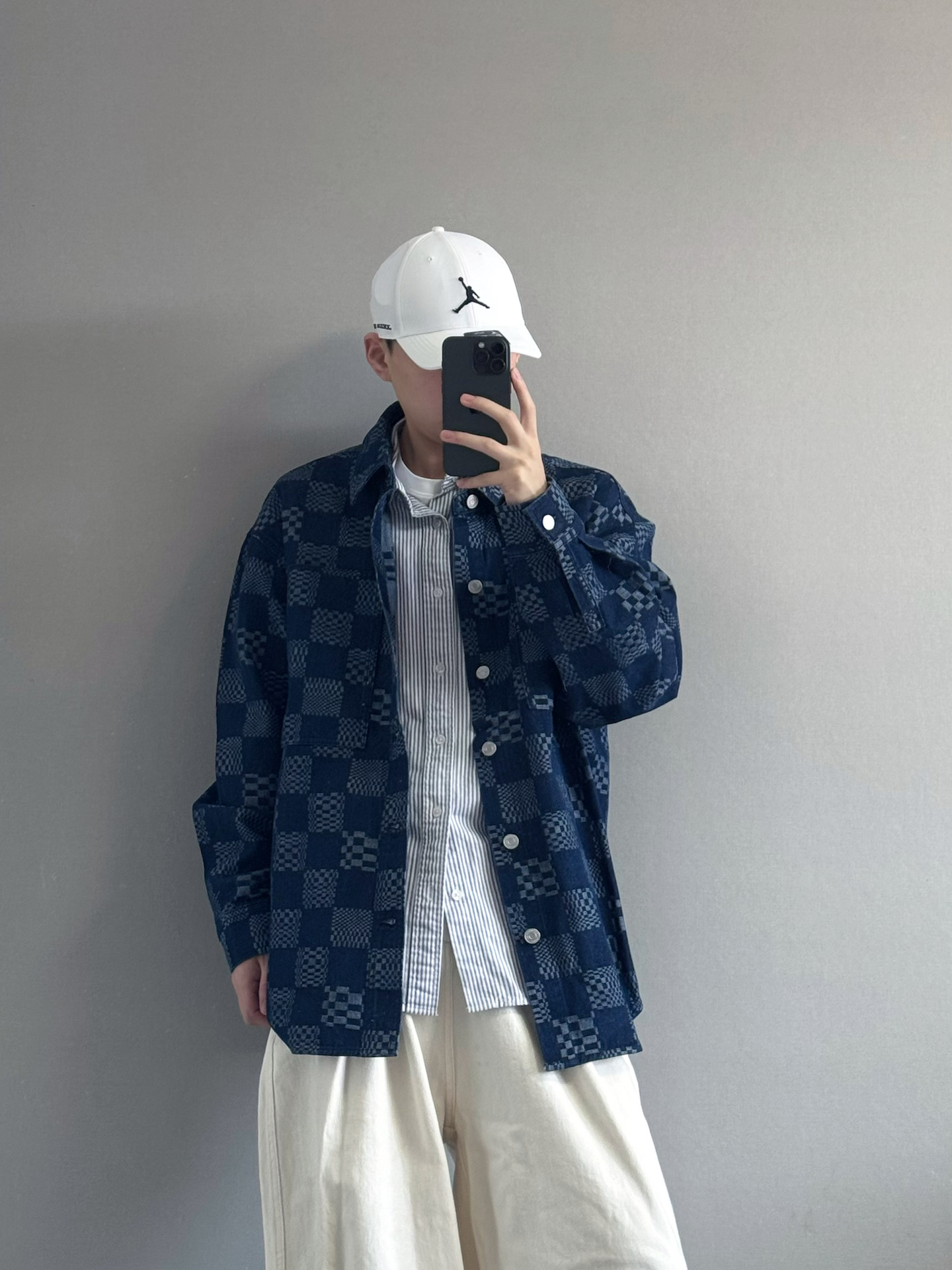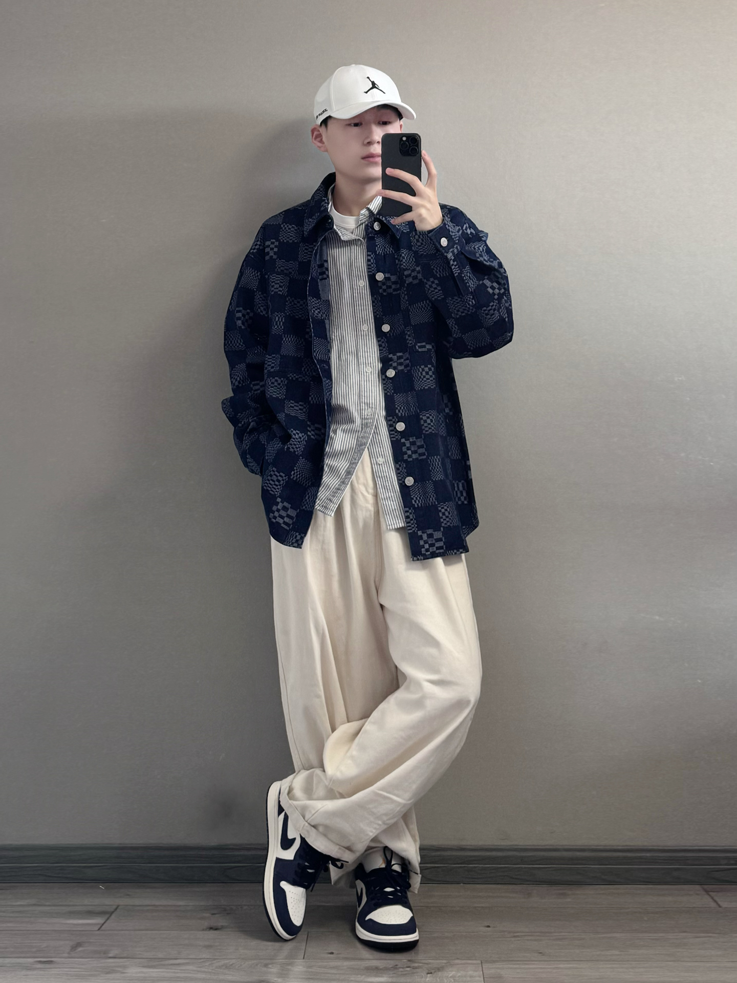 藏青棋盘格牛仔外套叠穿条纹衬衫,层次分明又不臃肿。 内搭白T打底,中和深色的厚重感,下装选米白阔腿裤,宽松版型藏肉显瘦,卷边露出鞋边更显利落。 黑白AJ与上衣配色呼应,棒球帽加持少年感。 叠穿技巧:同色系深浅过渡,宽松单品避免紧绷感,配饰点睛不抢戏。 🧢: #Jordan 👕:棋盘格外套 👟: #Jordan #潮人的春天来了 #早八无脑穿搭 #买双新鞋哄自己上学 #性价比从夯到拉 ...