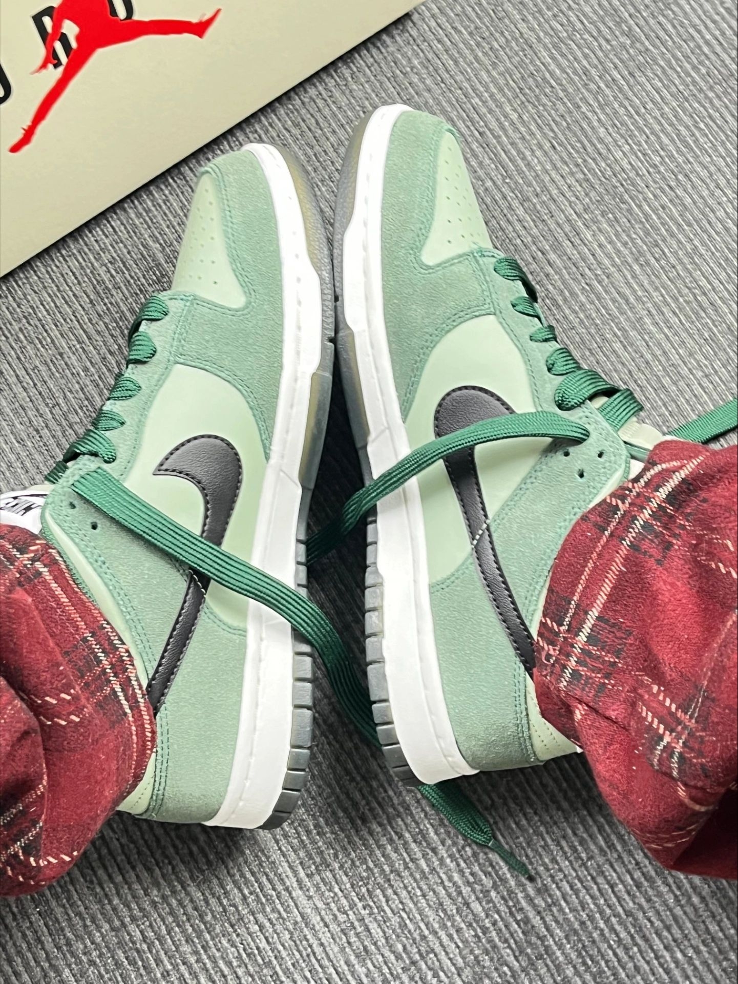 这双绿Dunk,是我又爱又嫌的日常款👟🥦|||拿到手先被这深浅绿撞色戳中🥹,翻毛皮+光面皮拼接,搭红格裤、牛仔裤都很和谐,出门不用纠结配色,懒人狂喜😌。 但槽点也很实在👇 - 脚感偏硬,Dunk祖传板鞋感,久走脚底板会酸🥲,必须垫软鞋垫救场。 - 翻毛皮太容易沾灰,风一吹就灰蒙蒙,清洁要专用刷子慢慢搓,懒癌真的会谢🙄。 - 鞋型偏窄,宽脚前几次穿会挤脚趾,穿开后包裹感才变舒服,磨合过程有点磨人😮...