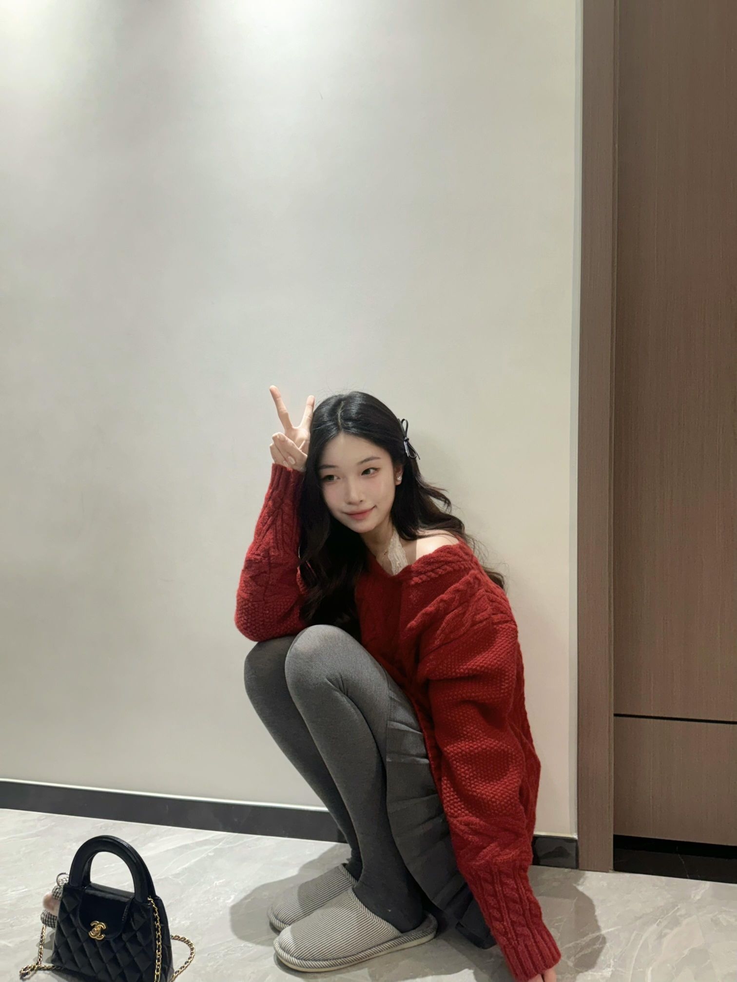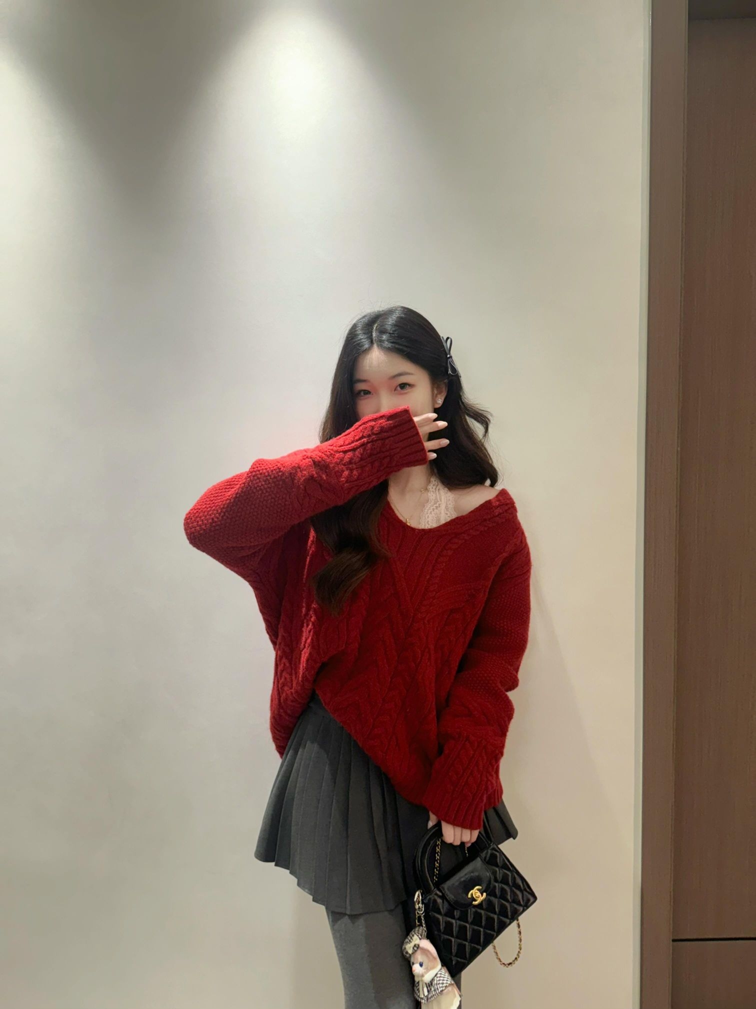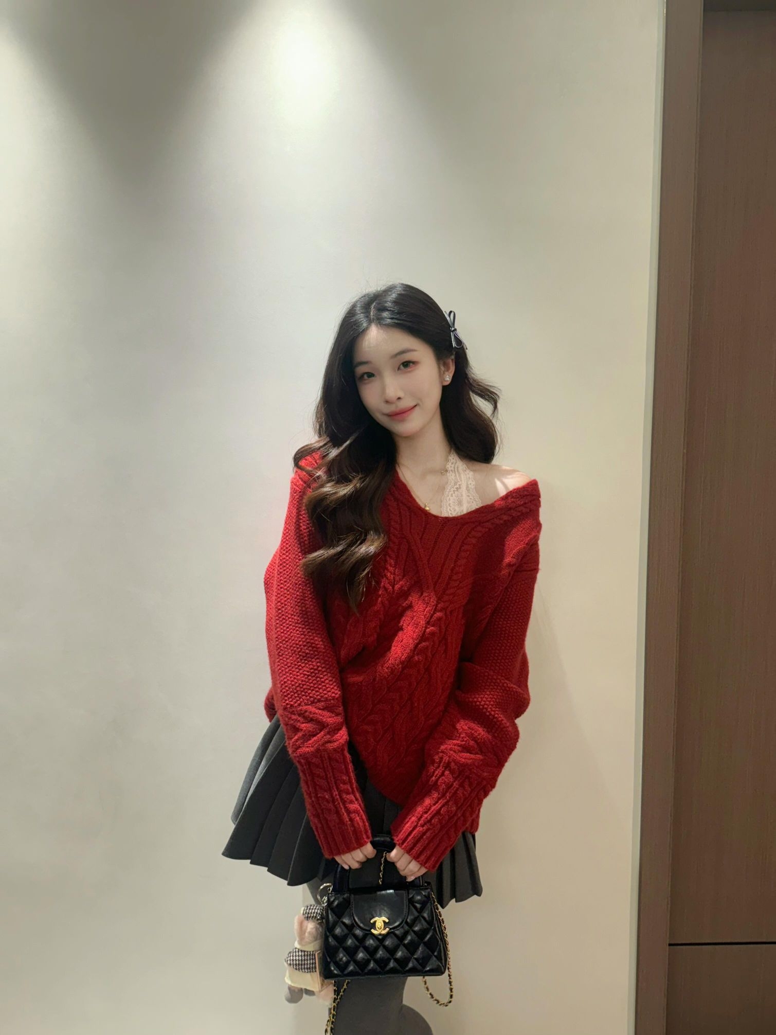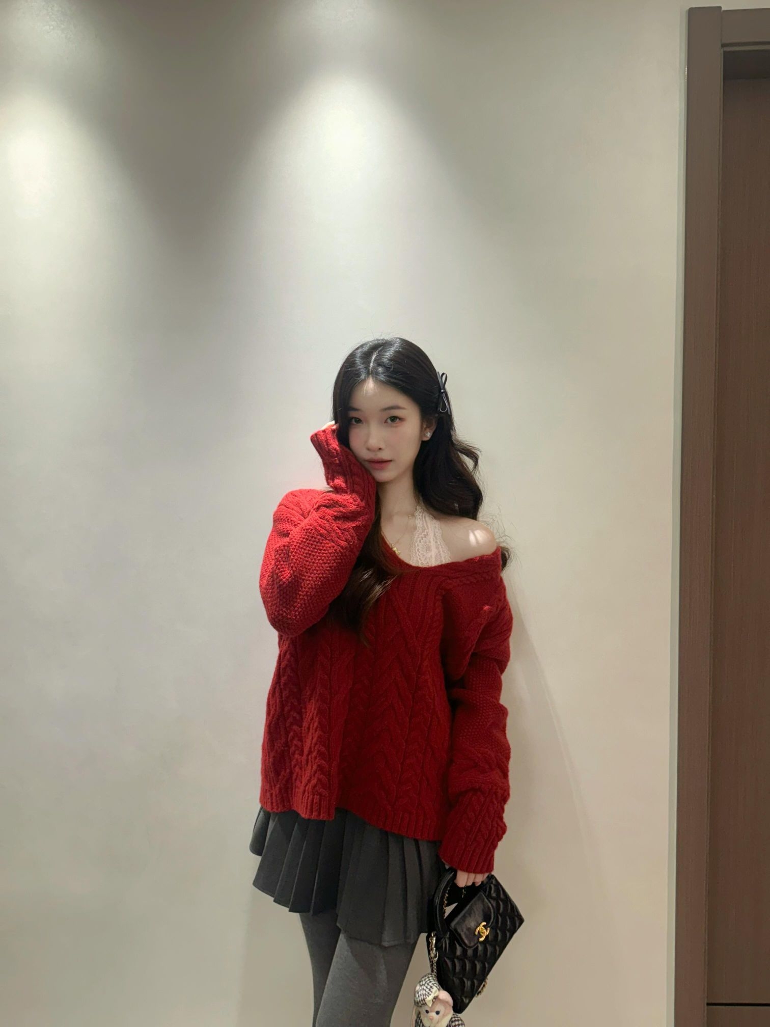 迟伞伞家的欧尼香气!已经成为预定的新年穿搭了 明媚亮眼的红色超有节日氛围感 其实也是很适合圣诞穿的是那种宽宽大大的毛衣版型 同时编制花纹多样 比较有垂感 v领斜肩带有一点点露肤度就一点也不显胖!面料是含羊毛的 摸着真的很舒服