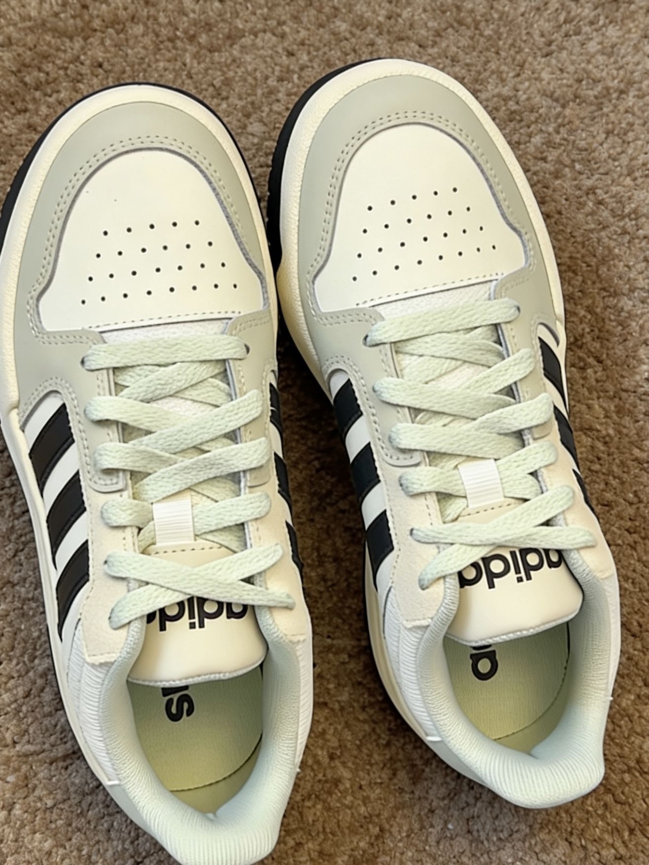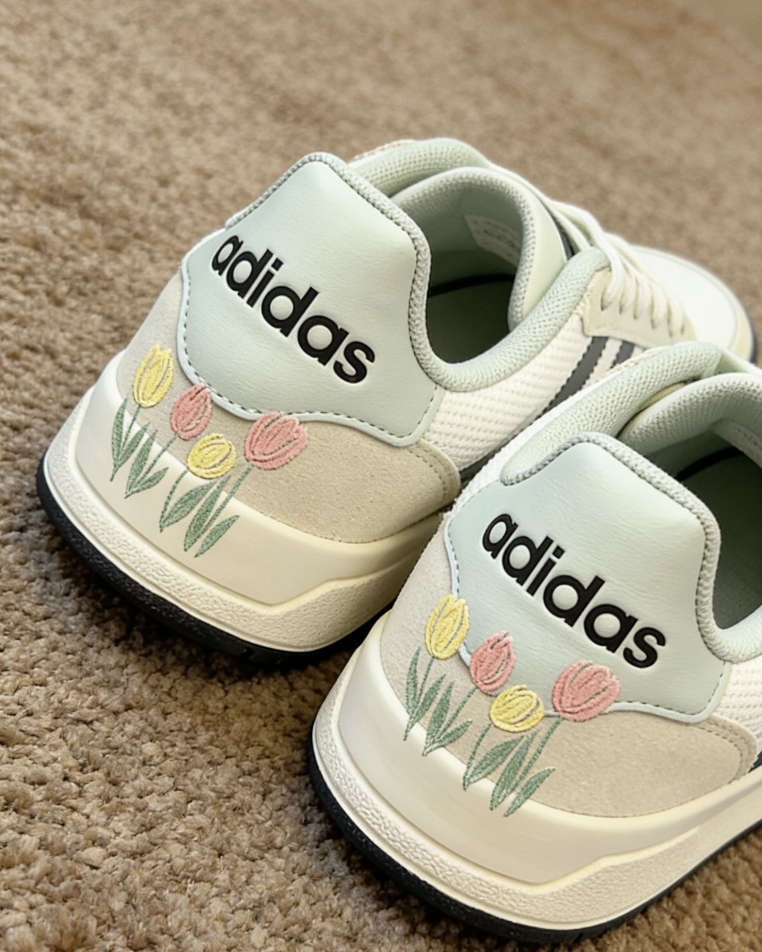 阿迪这双板鞋的薄荷奶绿配色看着就很温柔,颜色清新淡雅,特别适合春天穿出门。上脚的感觉挺惊喜,鞋底软乎乎的,不像有的板鞋底子硬,走久了也不会累。虽然是封闭式的板鞋,但透气性不错,穿久了也不用担心闷脚。搭配上很简单,配条浅色牛仔裤或者碎花裙都有那种干净清爽的氛围感,周末去公园逛逛或者和朋友约个下午茶都很合适。