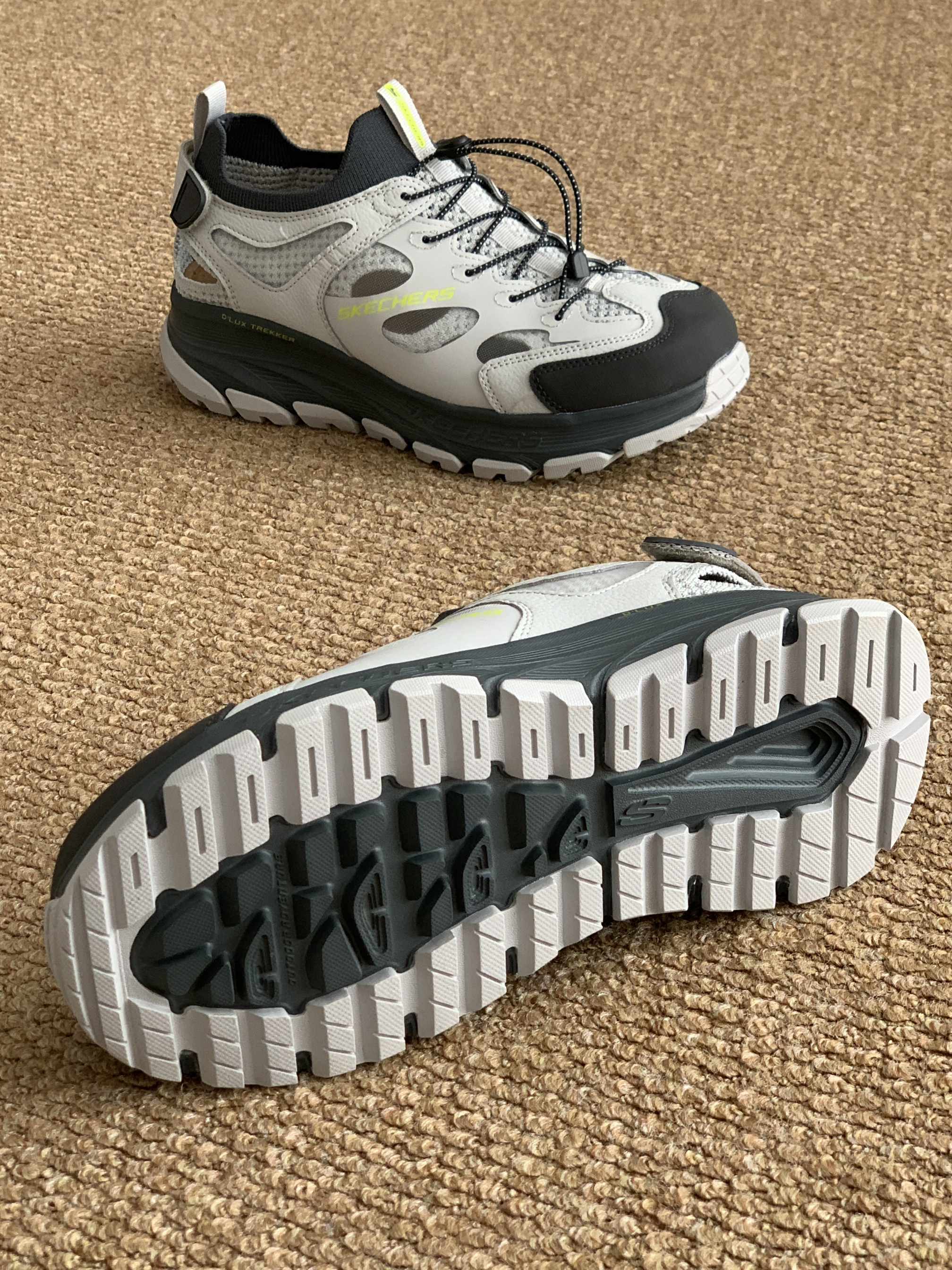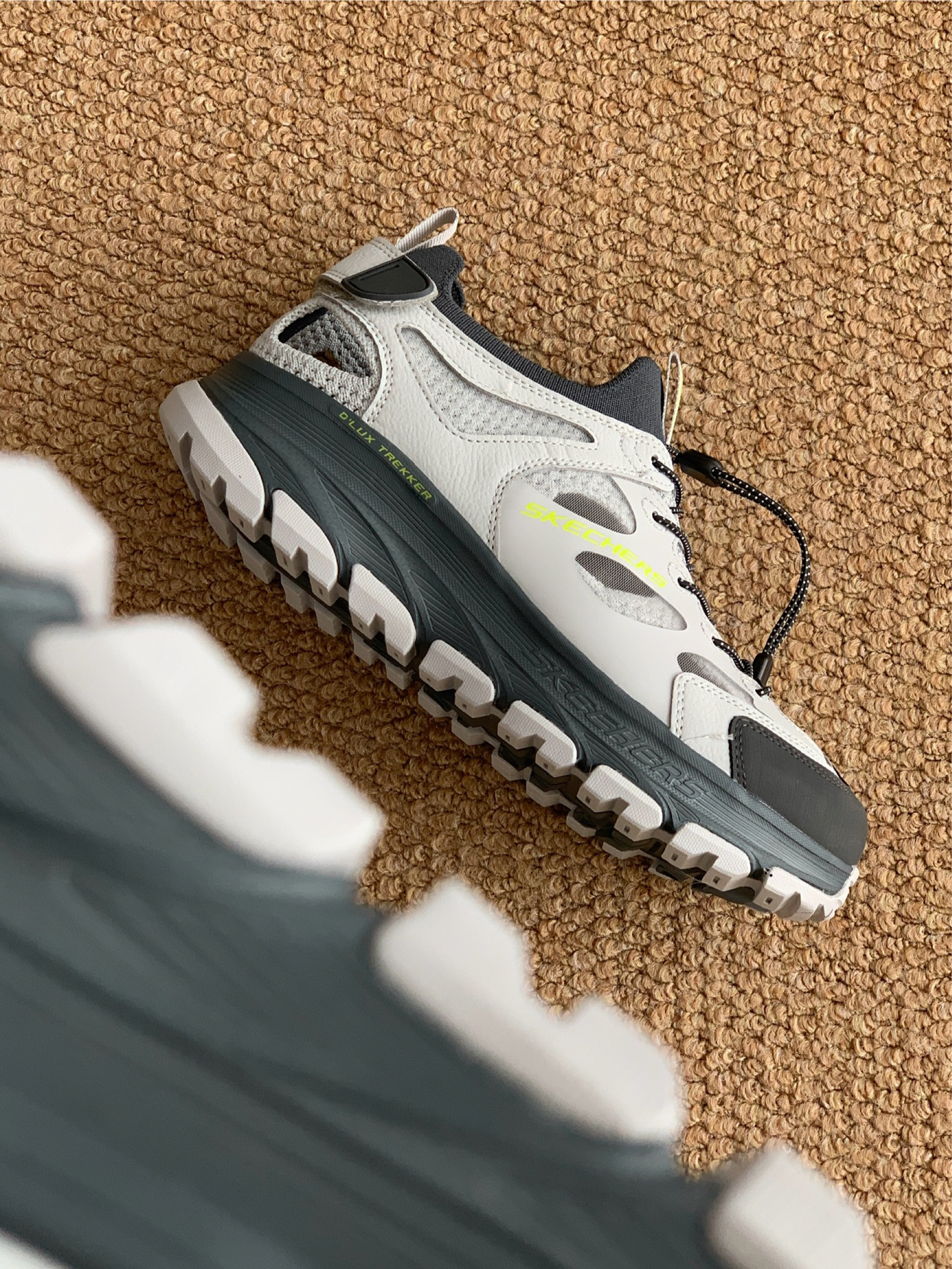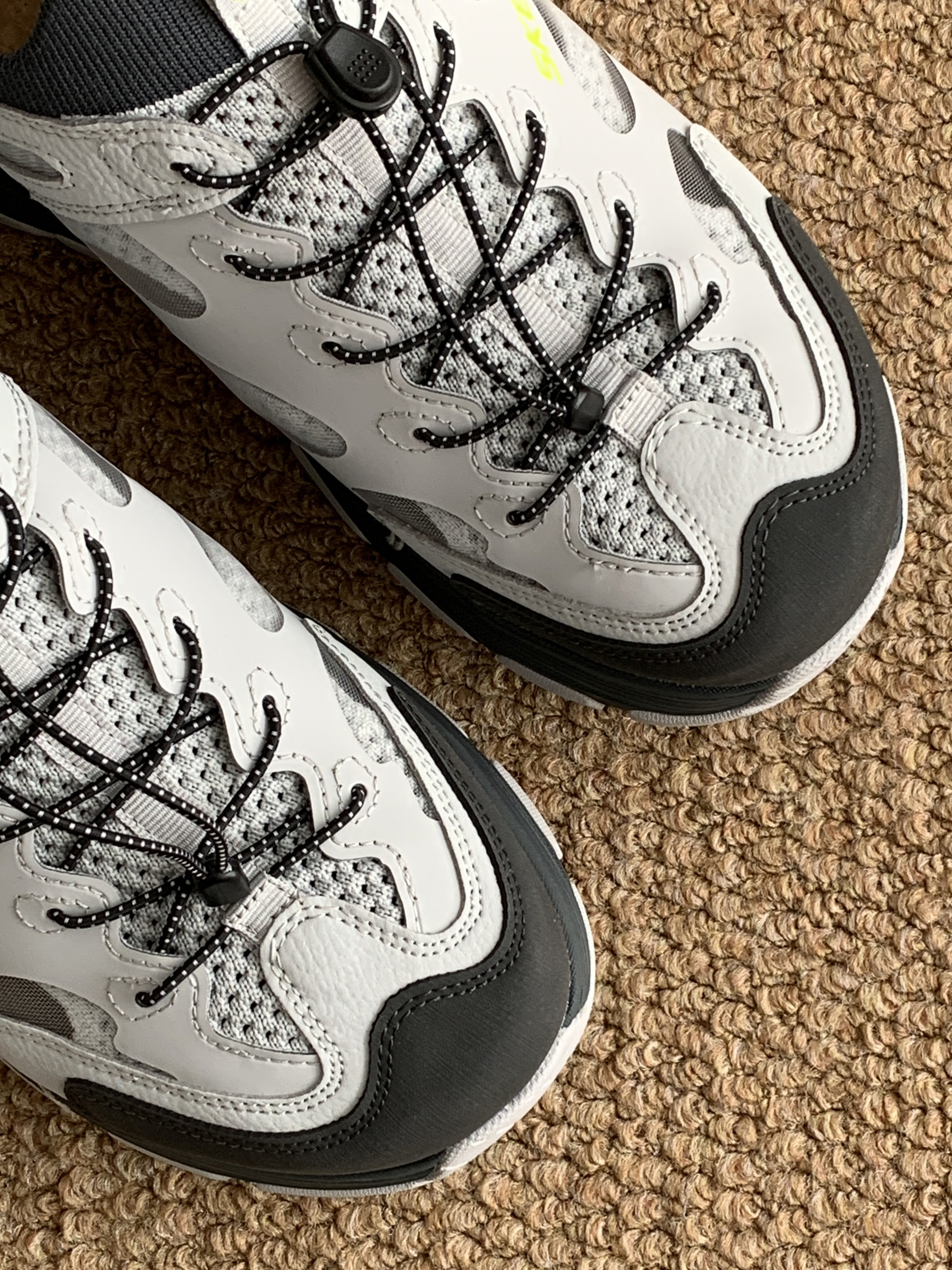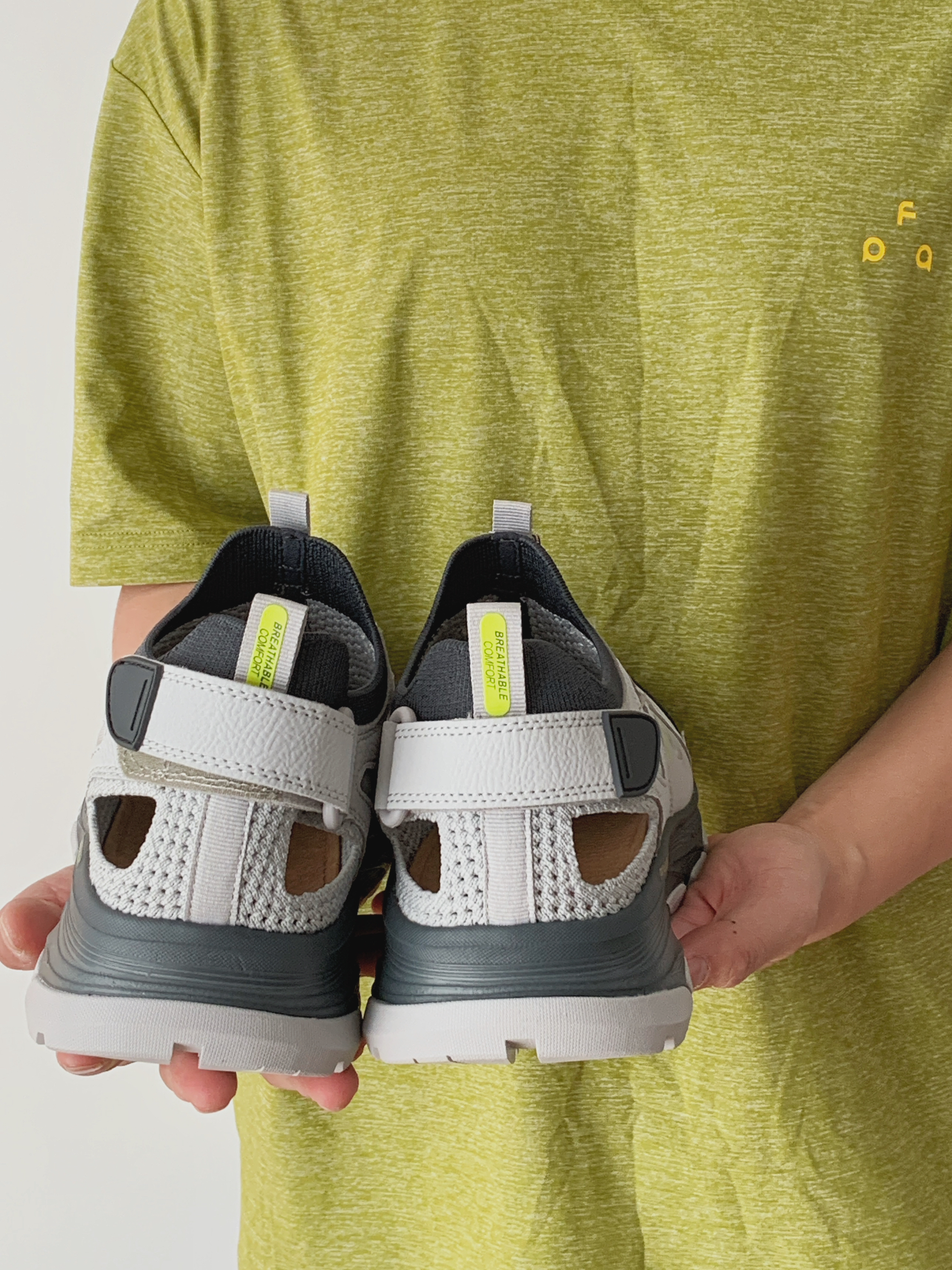 今天分享一双黑灰配色的溯溪鞋 颜值 很户外鞋的设计 整体配色挺春天的 单穿或者搭配袜子穿都好看 细节 荧光绿的这个logo撞色很春天 整体低饱和的浅灰色也很好搭 脚感 整体脚感还是蛮不错的挺舒适 鞋头处做了防撞的设计 鞋体蛮轻盈的 尾部的尼龙扣穿脱方便 搭配 春夏搭一些山系的单品包帅的