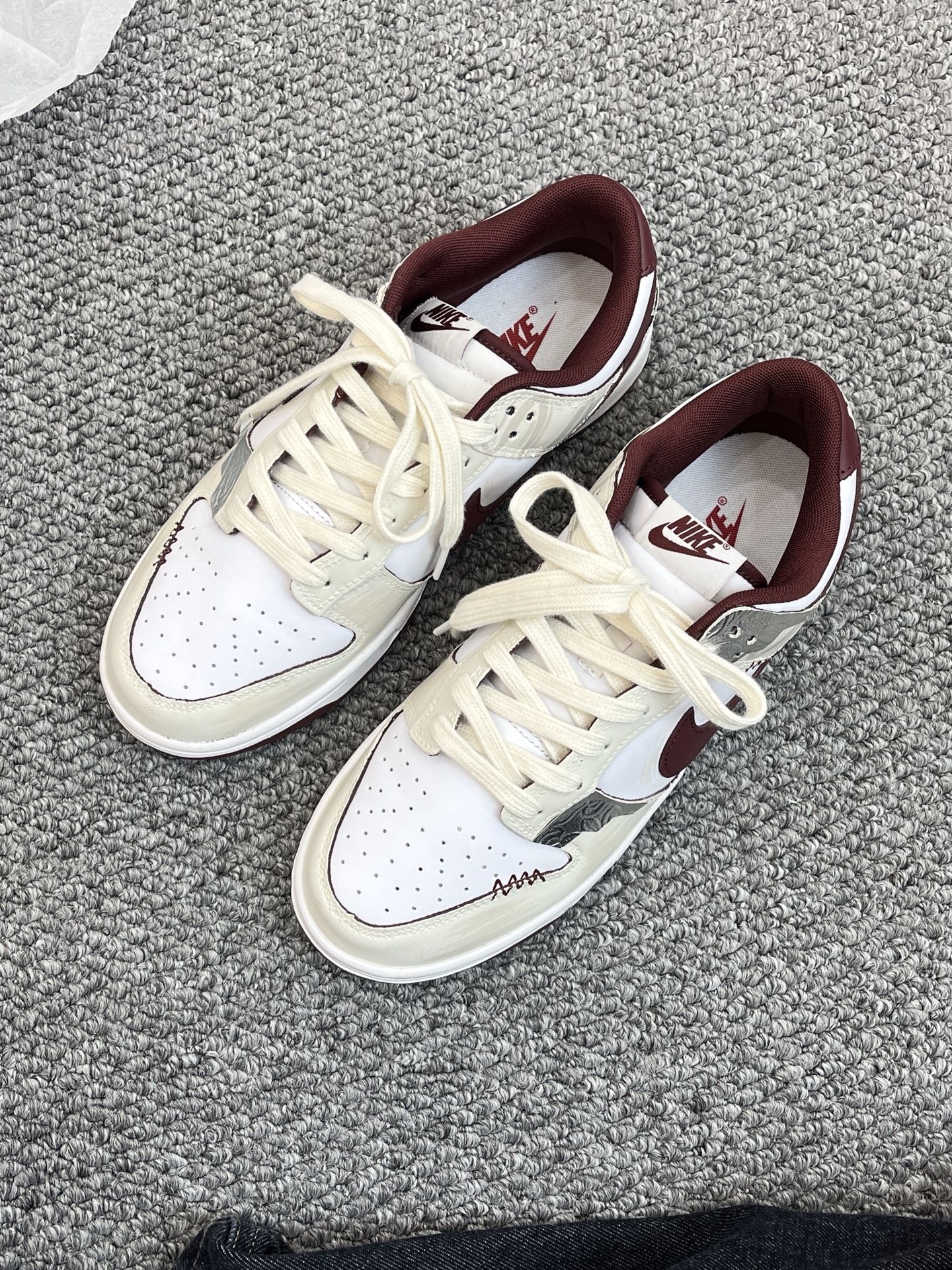 家人们!这双做旧酒红Dunk我真的要按头安利! 酒红+米白撞色温柔又复古,做旧工艺自带滤镜,银灰装饰细节拉满,上脚显白又显脚小,春天穿它出门回头率爆表! 皮质鞋面透气不闷脚,软弹鞋底不磨脚,日常通勤、上学、约会都能穿,实用性拉满! 搭配各种衣服都巨好看,男女同款,情侣穿也超甜! 已经被身边朋友追着问链接了,这双鞋我能穿到天荒地老!赶紧入手!🔥