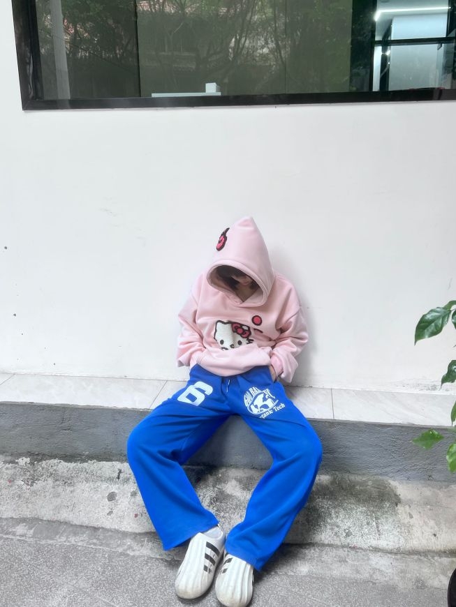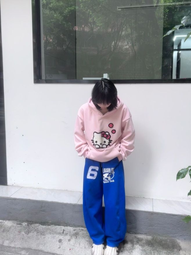 这款蓝色网红裤子超级好穿 舒服,有点弯刀的版型,宽松,显瘦 随便搭配卫衣外套都很好看,今日搭配粉色卫衣 粉蓝色的穿搭回头率百分百