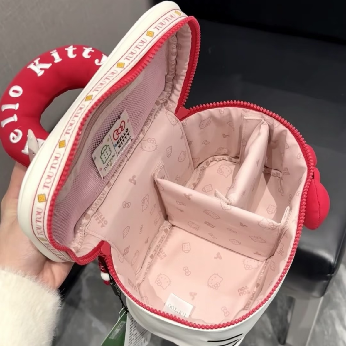 我尊嘟对介个化妆包狠狠心动啦 Kitty控尊嘟拒绝不了一点诶 这个化妆包的容量蛮大的做了分格的设计日常收纳挺方便嘟! 皮面的材质 也比较好打理~ 平时出们旅游带上它我觉得还挺方便呢