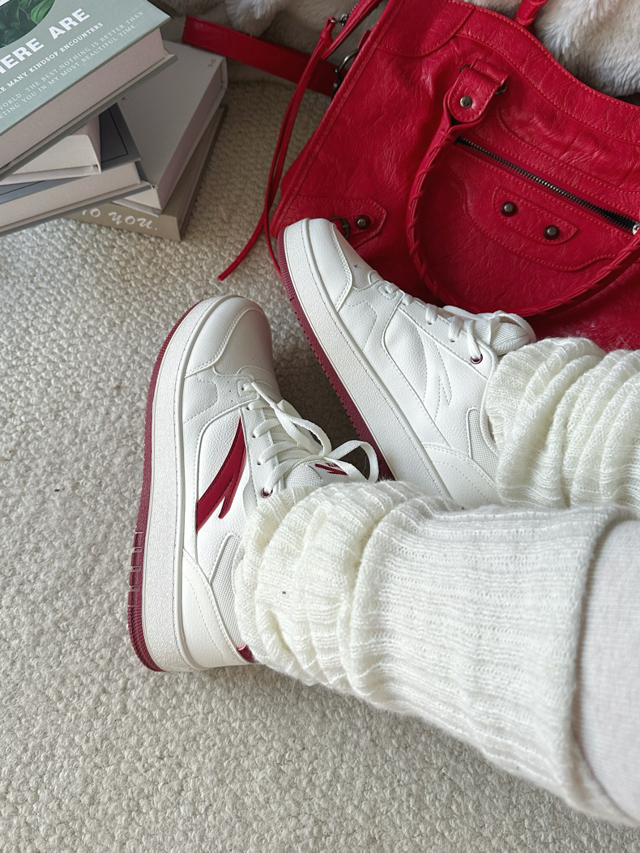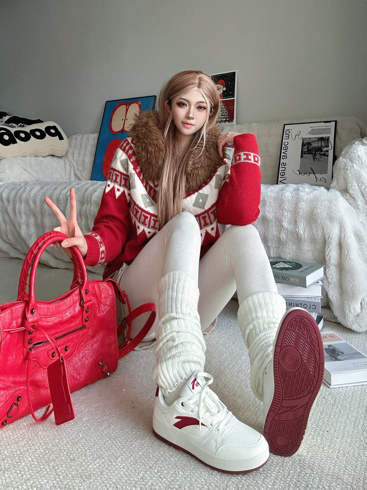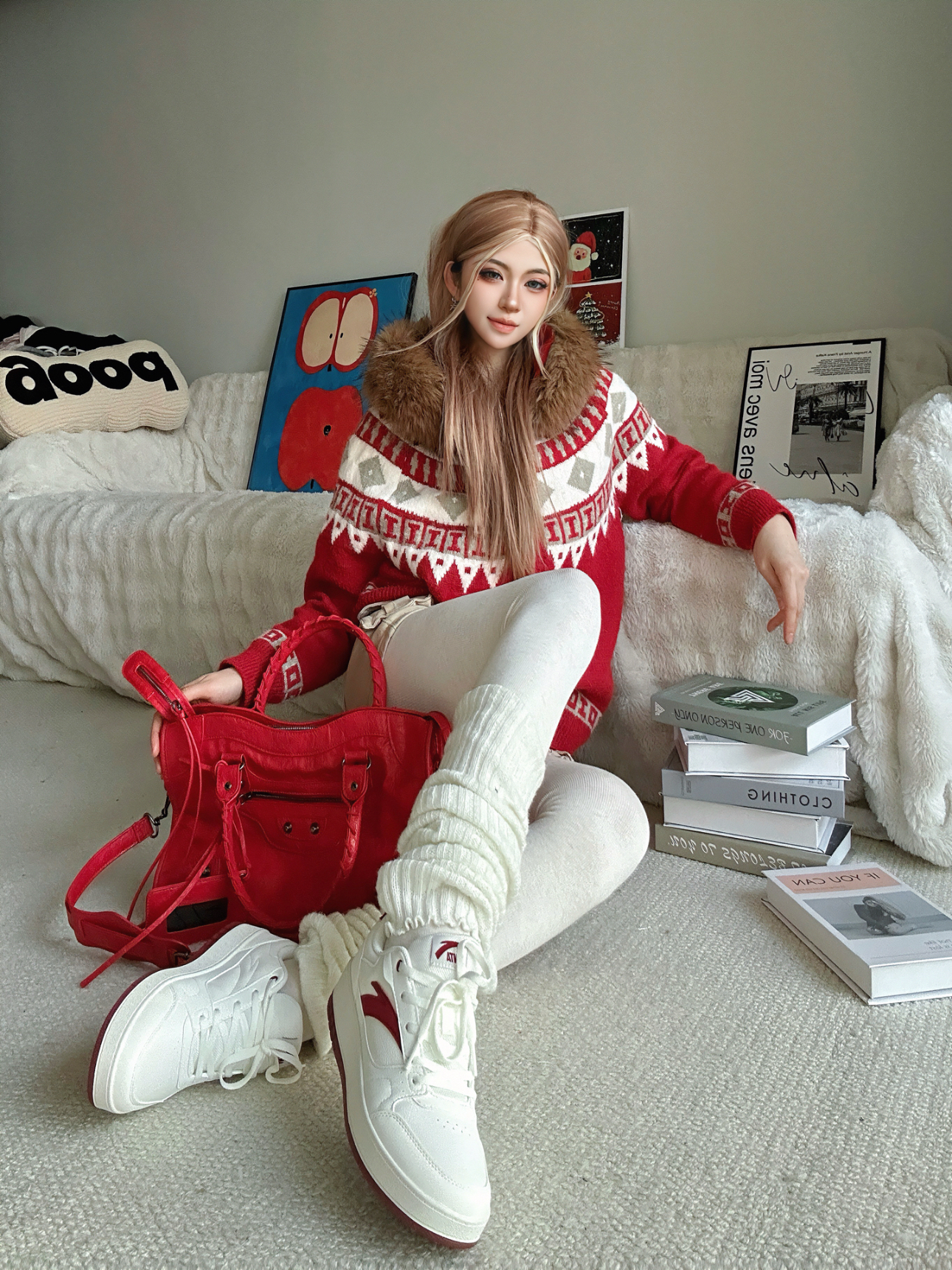 新年氛围感当然少不了红色系😊 今日分享新年喜庆穿搭(˶╹ꇴ╹˶)🧨 ⬇️ 上身红色费尔岛毛衣 加上毛茸茸的毛领设计o(^▽^)o 节假日的氛围感拉满了⬆️ 搭配米白色打底裤➕白色的腿套 鞋子自然也要带点红(◍•ᴗ•◍) 选择了安踏的元年2 老红色经典logo,抬脚鞋底也有细节红 最后拎上红色机车包😎 今年过年预定这套了✅