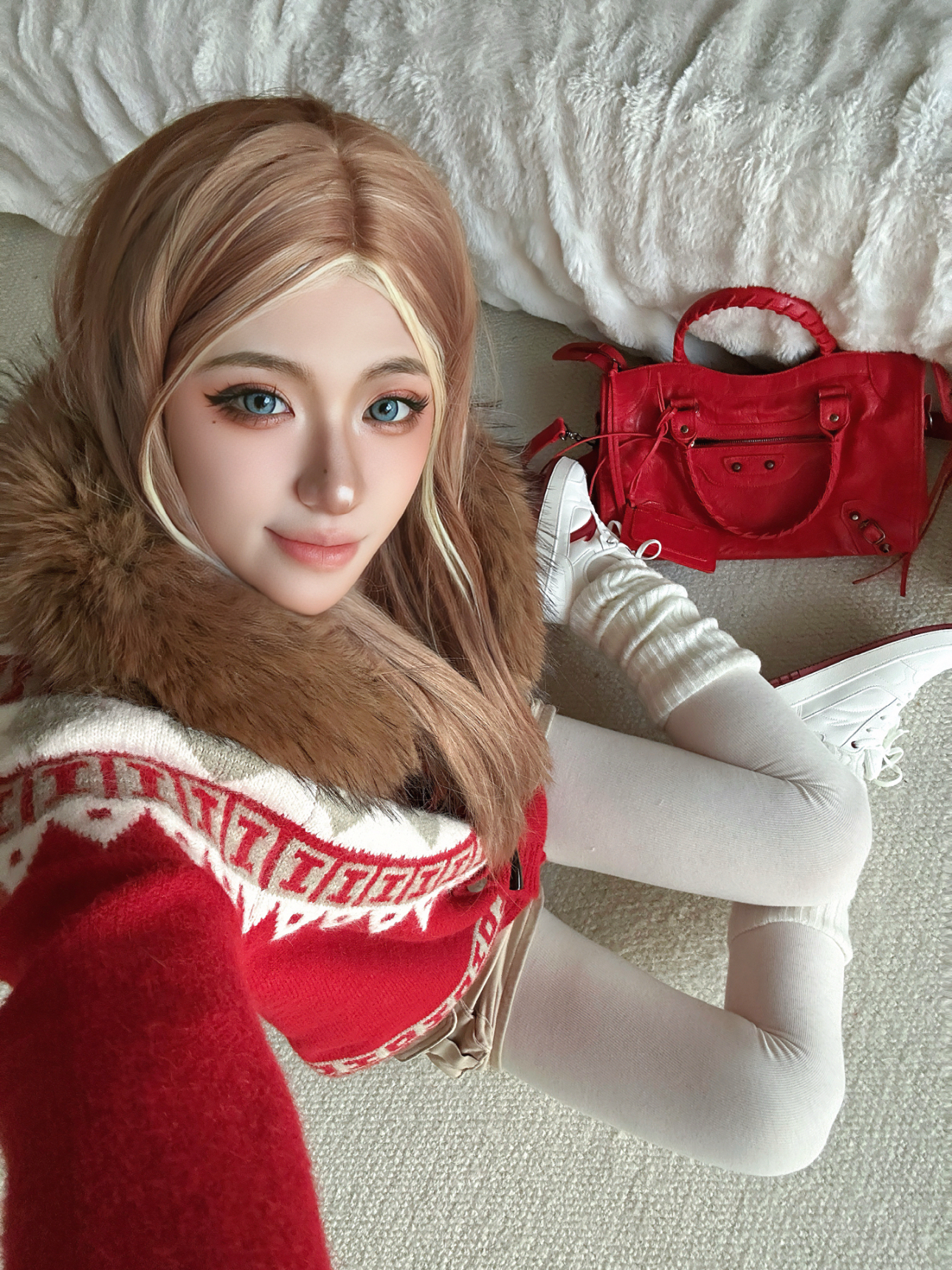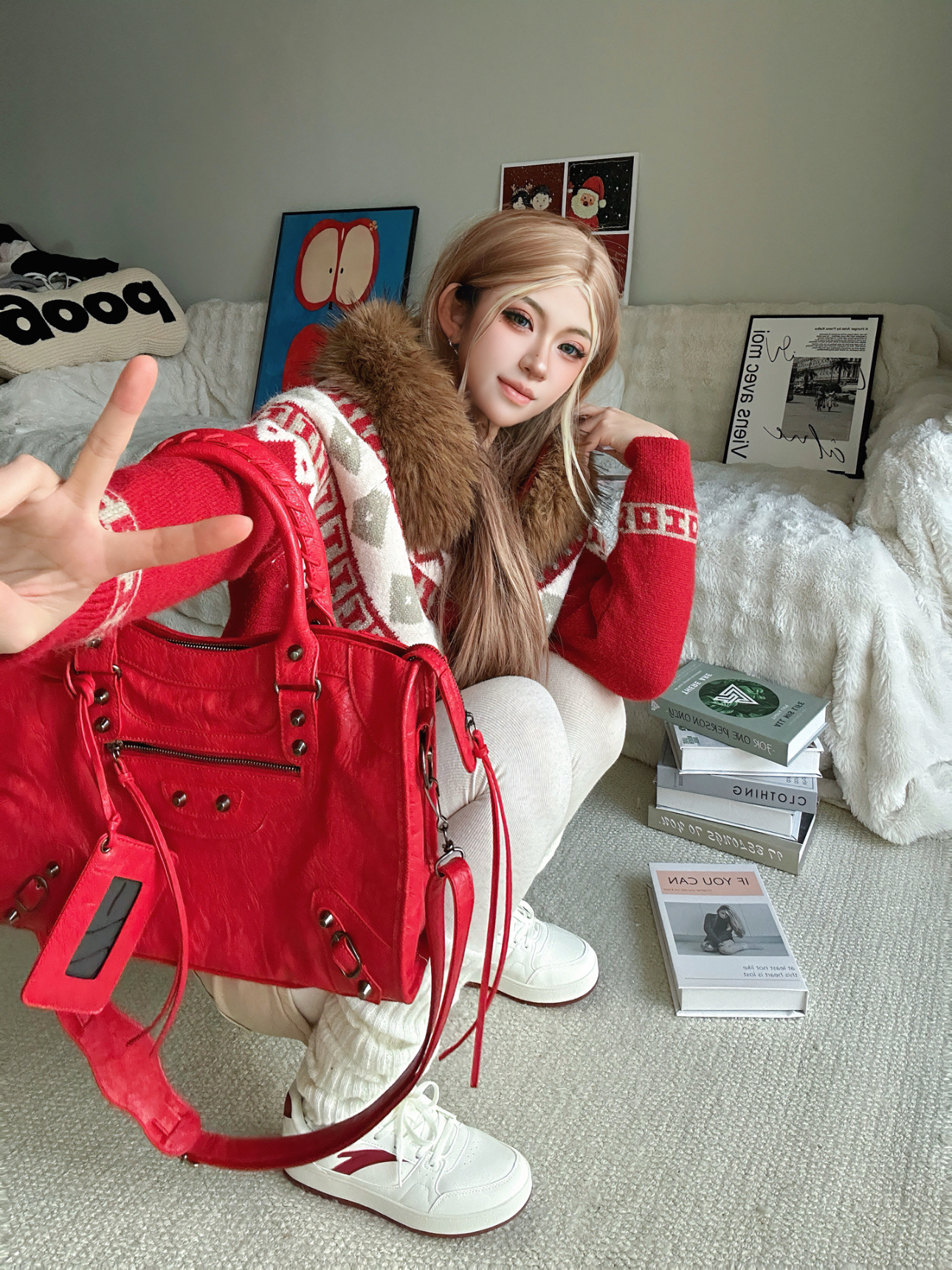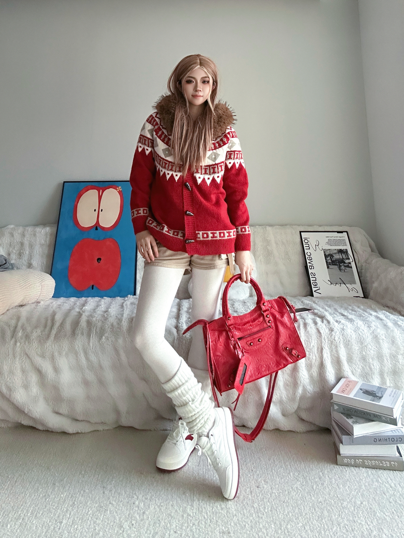 新年氛围感当然少不了红色系😊 今日分享新年喜庆穿搭(˶╹ꇴ╹˶)🧨 ⬇️ 上身红色费尔岛毛衣 加上毛茸茸的毛领设计o(^▽^)o 节假日的氛围感拉满了⬆️ 搭配米白色打底裤➕白色的腿套 鞋子自然也要带点红(◍•ᴗ•◍) 选择了安踏的元年2 老红色经典logo,抬脚鞋底也有细节红 最后拎上红色机车包😎 今年过年预定这套了✅