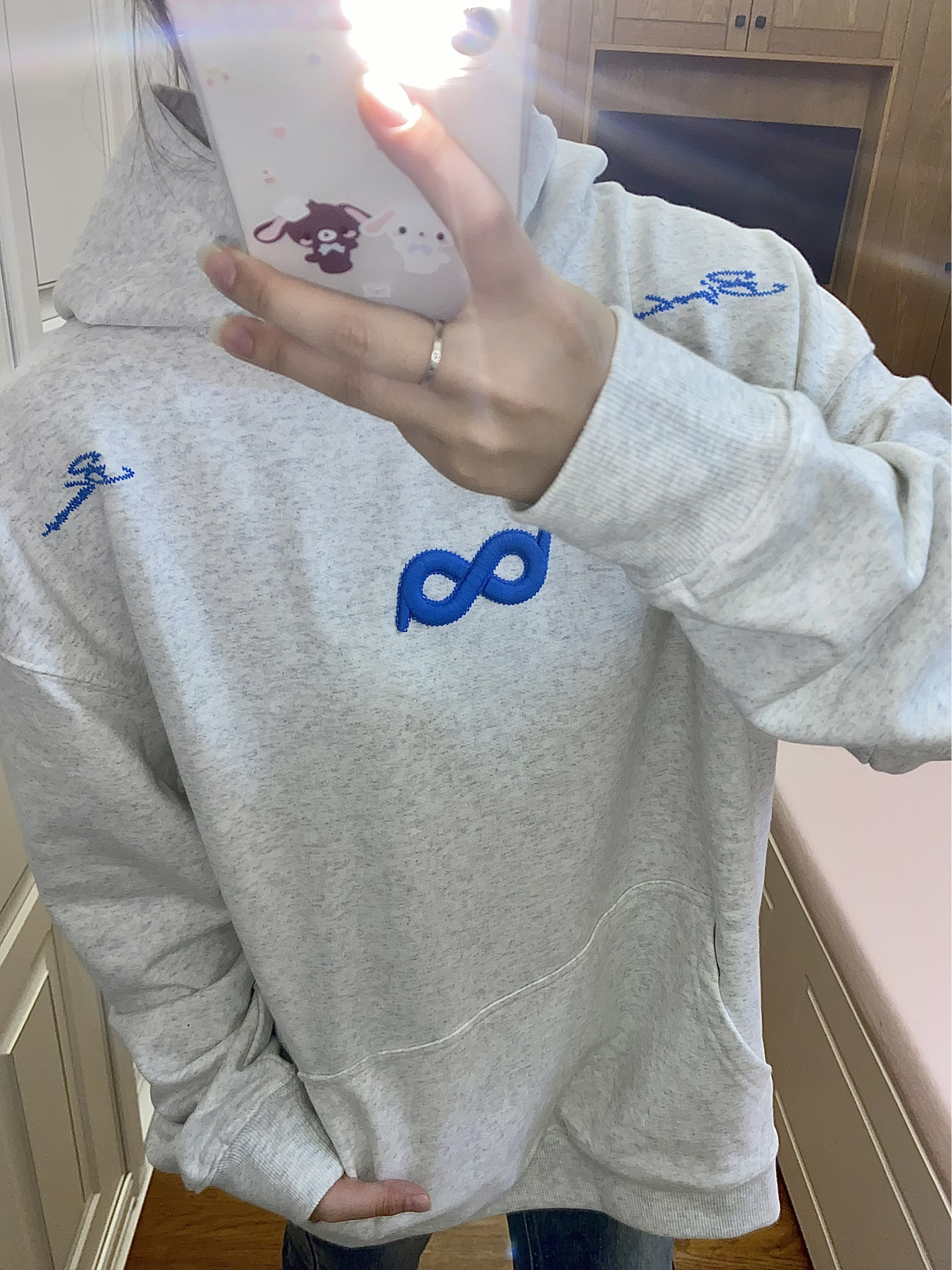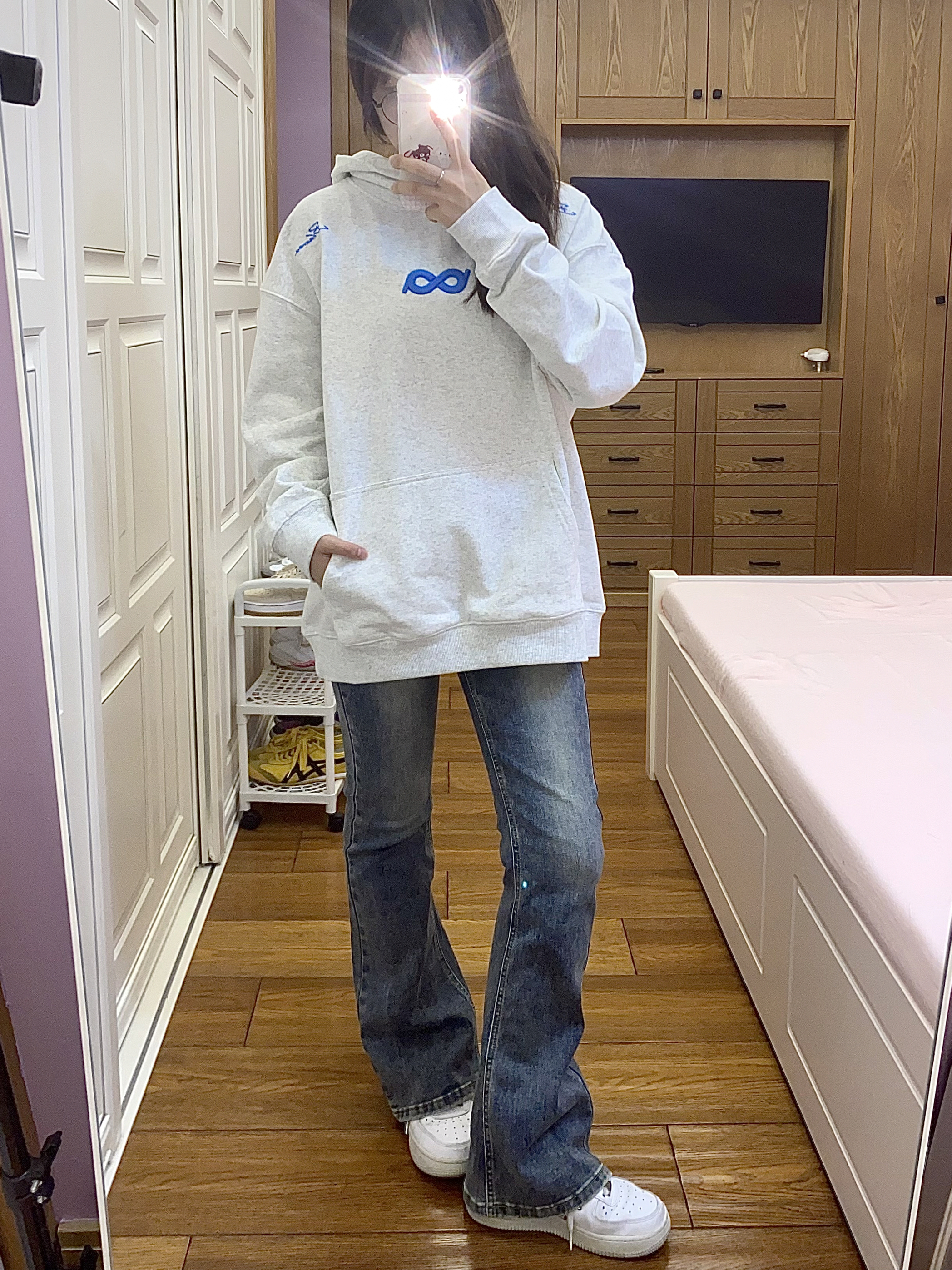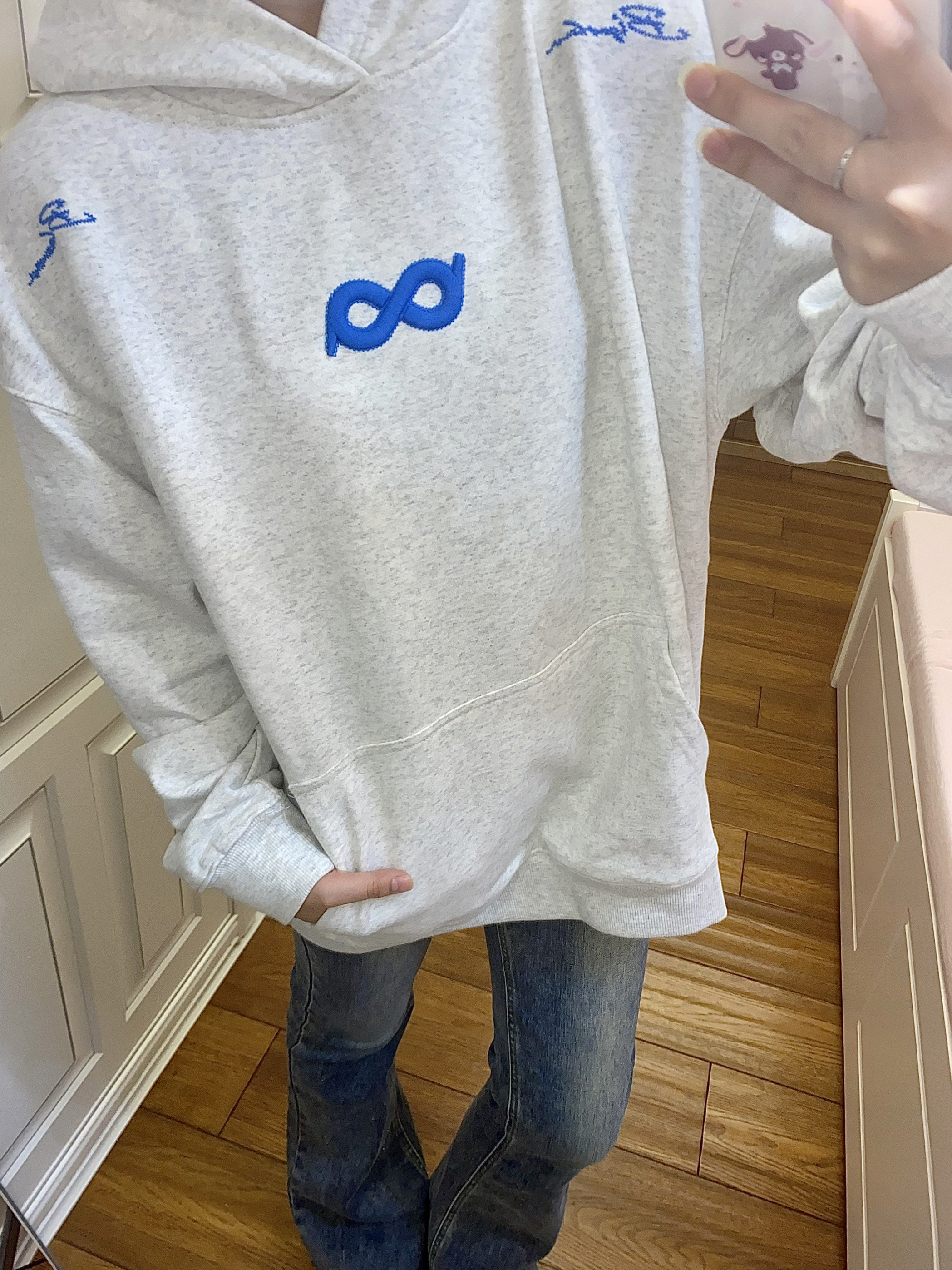 今天穿的是 BIPOLAR ~ 百花灰色系本身就很韩了 搭配蓝色系的logo和莫比乌斯环♾️刺绣 让整体的衣服更加时尚大气~ 经常穿他们家衣服的都知道他们家面料很舒适 穿起来不会显得臃肿也很暖和百搭🥳🥳 我160 93穿s码就很合适啦