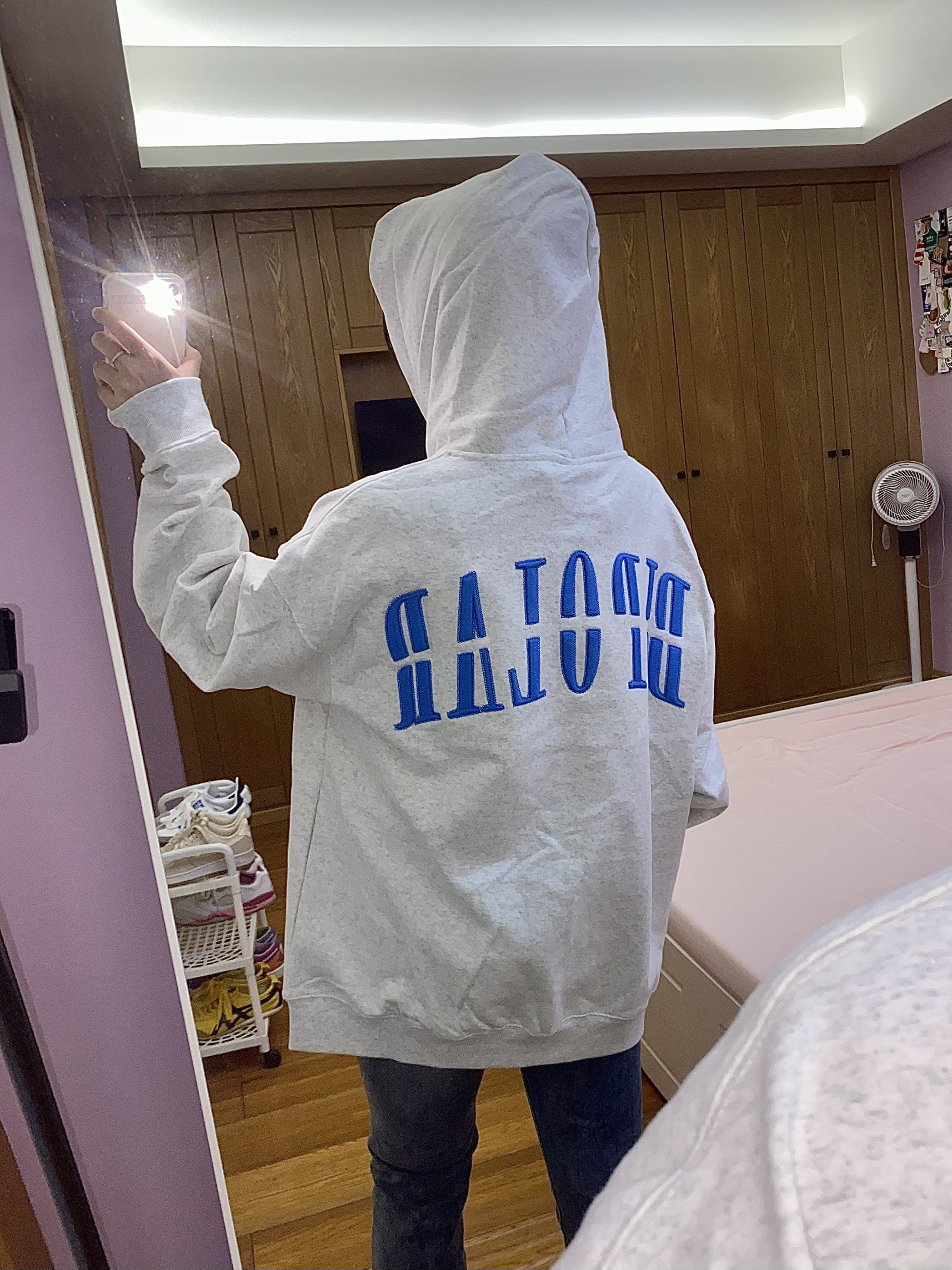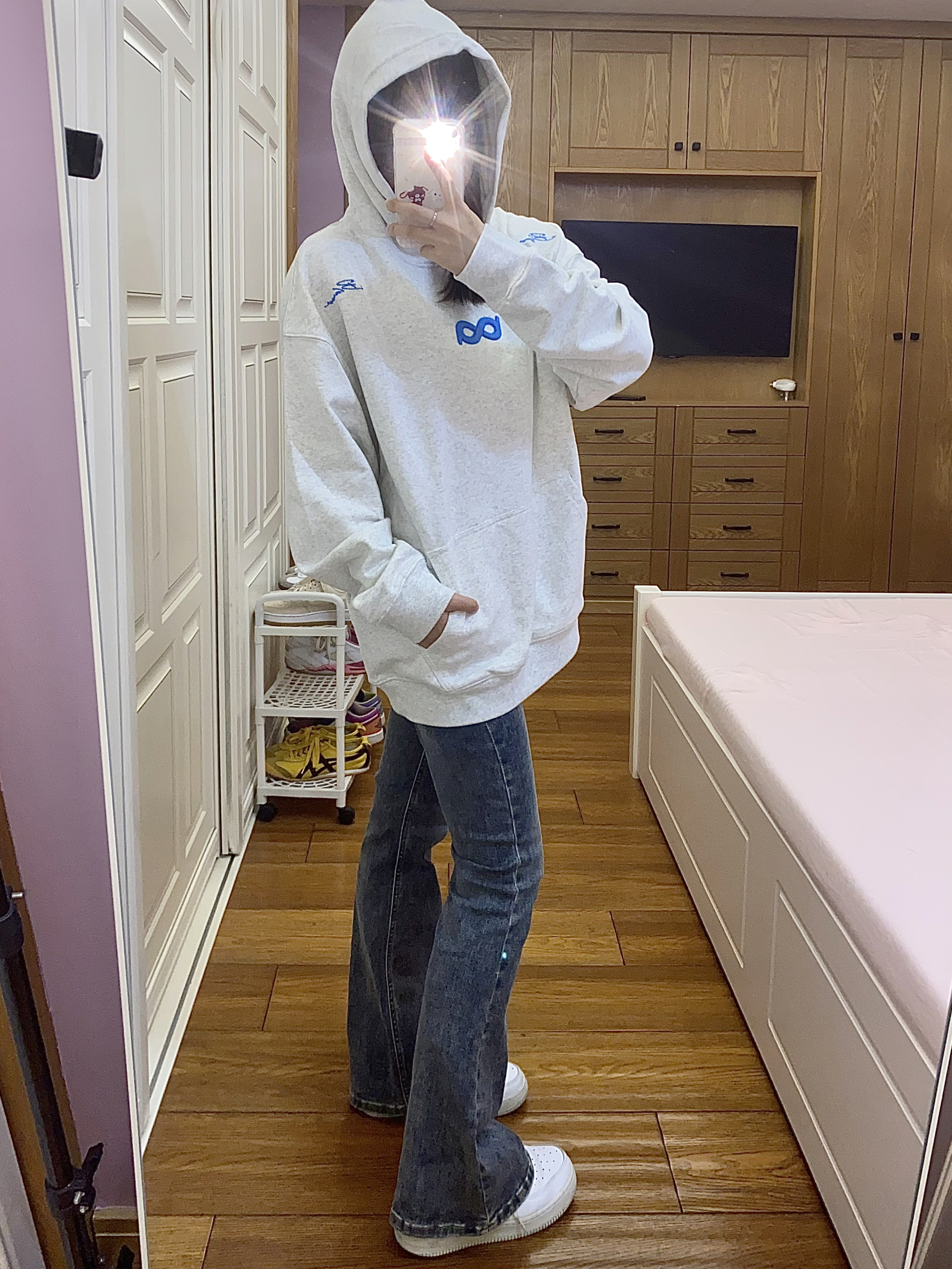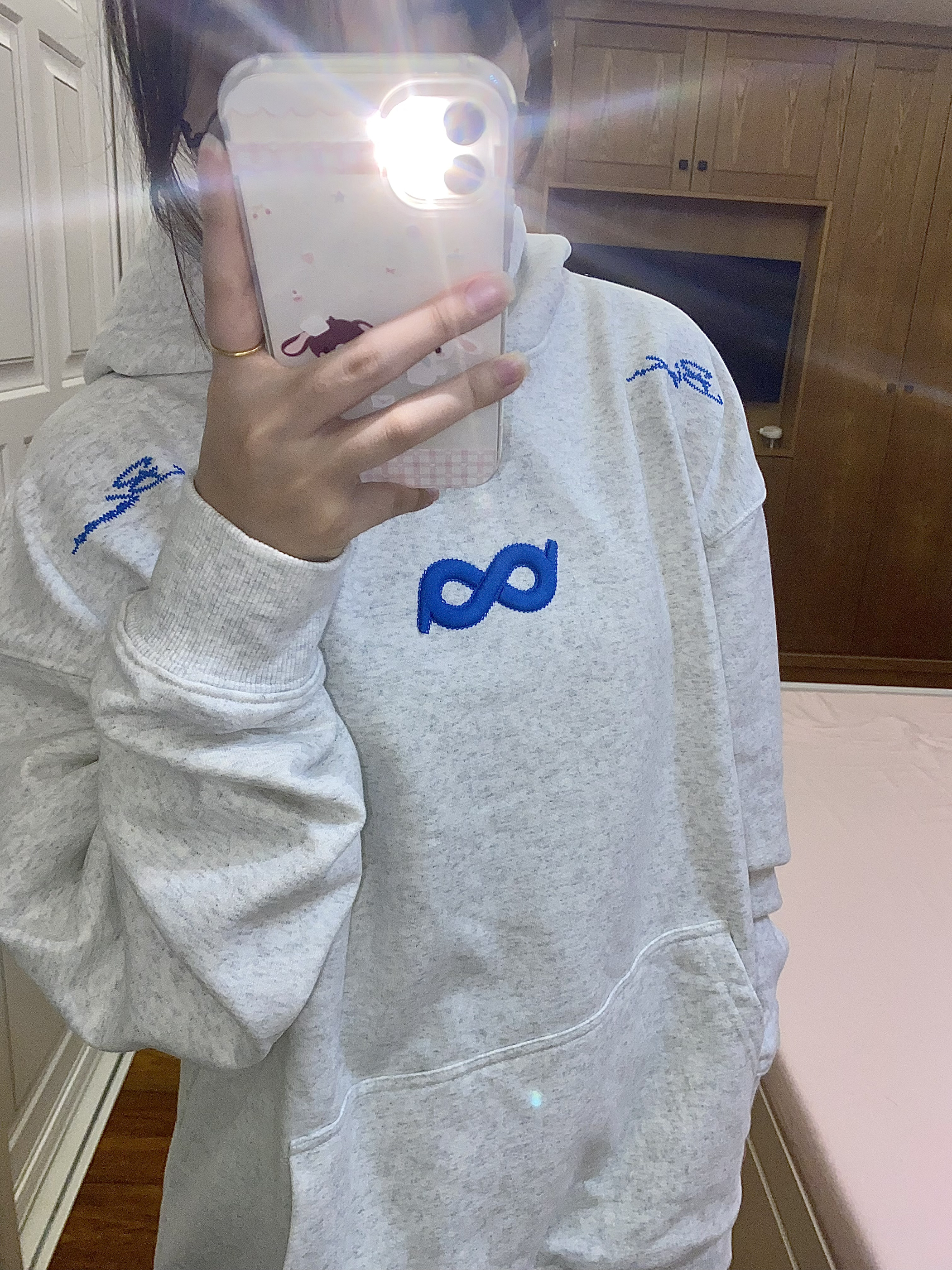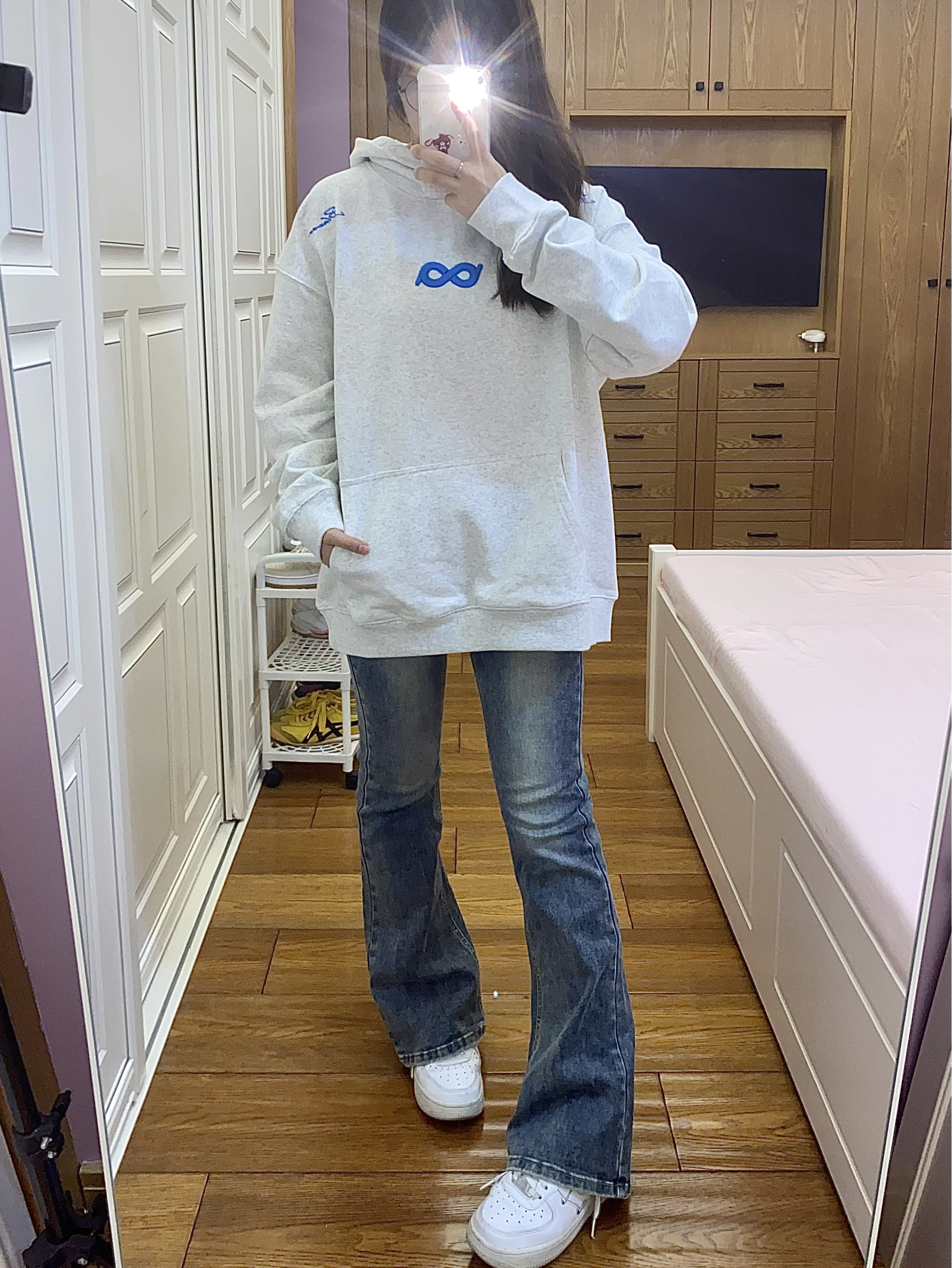 今天穿的是 BIPOLAR ~ 百花灰色系本身就很韩了 搭配蓝色系的logo和莫比乌斯环♾️刺绣 让整体的衣服更加时尚大气~ 经常穿他们家衣服的都知道他们家面料很舒适 穿起来不会显得臃肿也很暖和百搭🥳🥳 我160 93穿s码就很合适啦