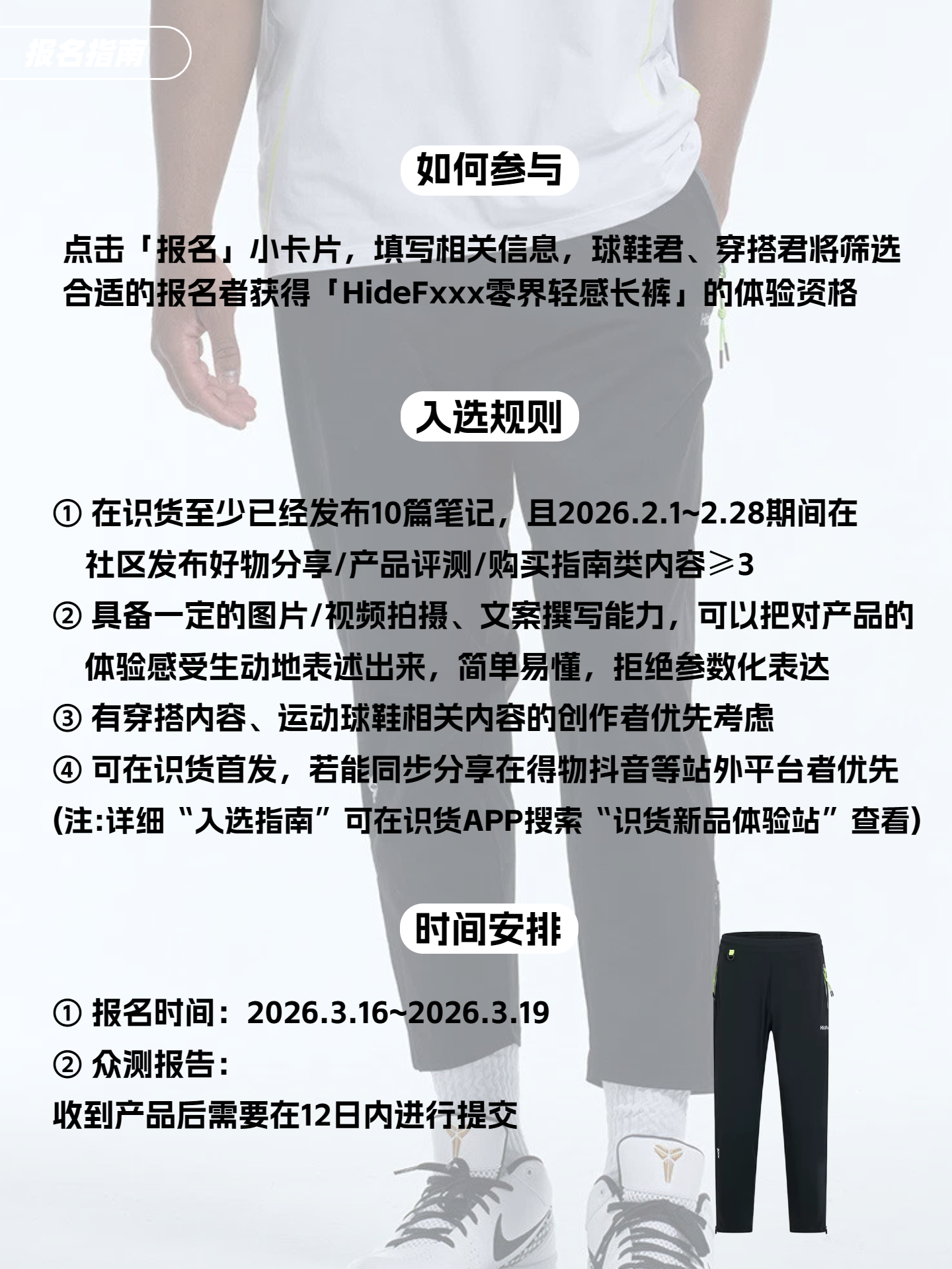招募名额:10名 【如何参与】 点击「报名」小卡片,填写相关信息,穿搭君将筛选合适的报名者获得「HideFxxx零界轻感长裤」的体验资格 【入选规则】 ① 在识货至少已经发布10篇笔记,且2026.2.1~2.28期间在社区发布好物分享/产品评测/购买指南类内容≥1 ② 具备一定的图片/视频拍摄、文案撰写能力,可以把对产品的体验感受生动地表述出来,简单易懂,拒绝参数化表达 ③ 有日常穿搭、休闲...