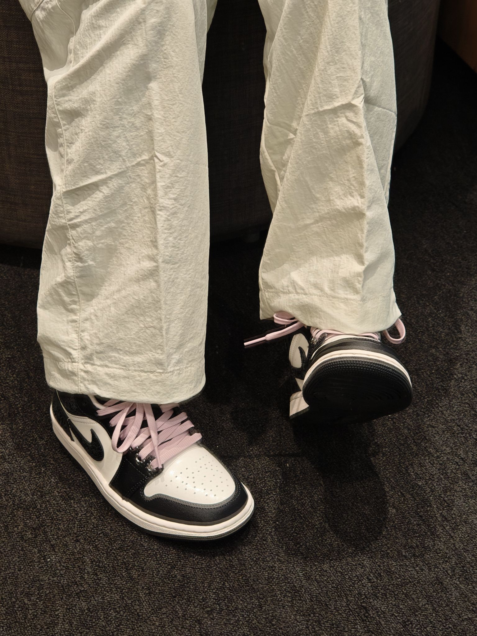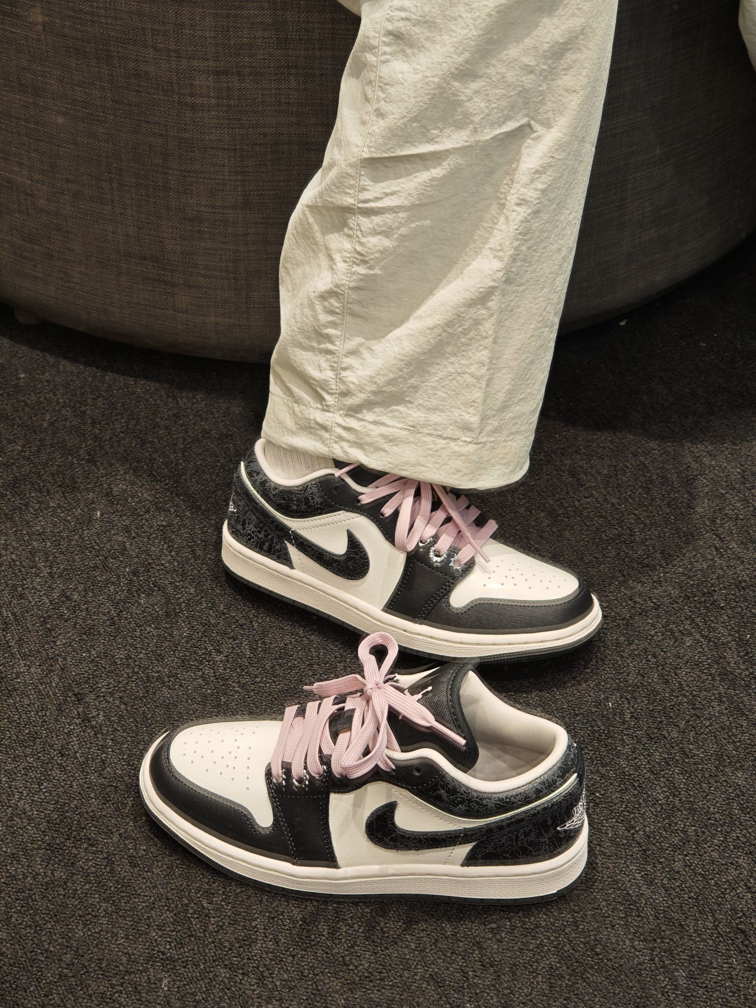 黑白熊猫底+温柔粉鞋带,甜酷感拉满✨ 后跟的暗纹细节超精致,低调又有设计感 搭牛仔裤/百褶裙都好看,春天氛围感稳稳拿捏 上脚软乎乎不磨脚,通勤出街都舒服~
