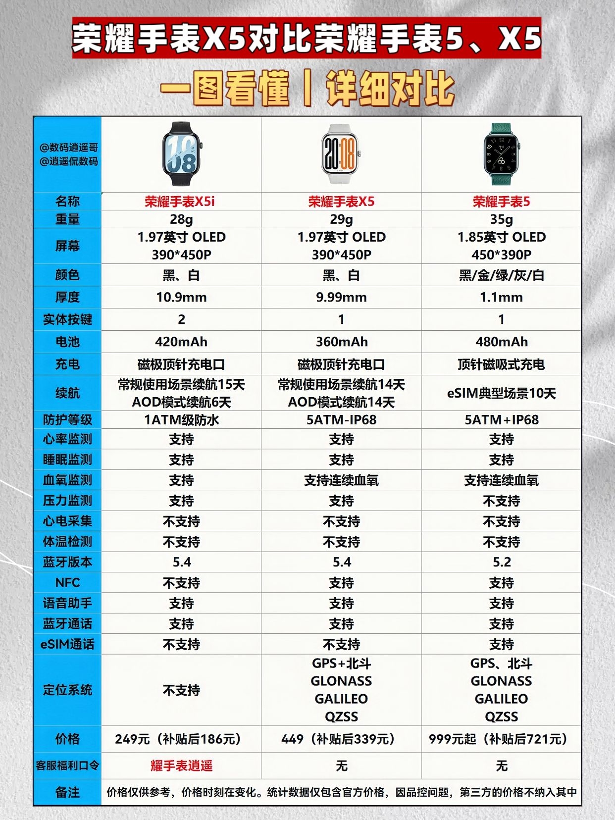 荣耀手表X5i优缺点汇总 9天真实体验感受分享 荣耀手表X5i用了几天时间了,结合大家前几天问的问题和我的使用体验,谈谈这款手表的优缺点 优点:(颜值、佩戴感、基础健康监测功能、生态和续航) 1.外观与佩戴体验出色,机身精致且金属质感中框搭配不锈钢旋转表冠,操作手感顺滑。无论是手感还是质感在这个价位挑不出毛病。 2.基础功能齐全且实用,搭载24小时心率、血氧、压力等健康监测功能,一键检测出数...