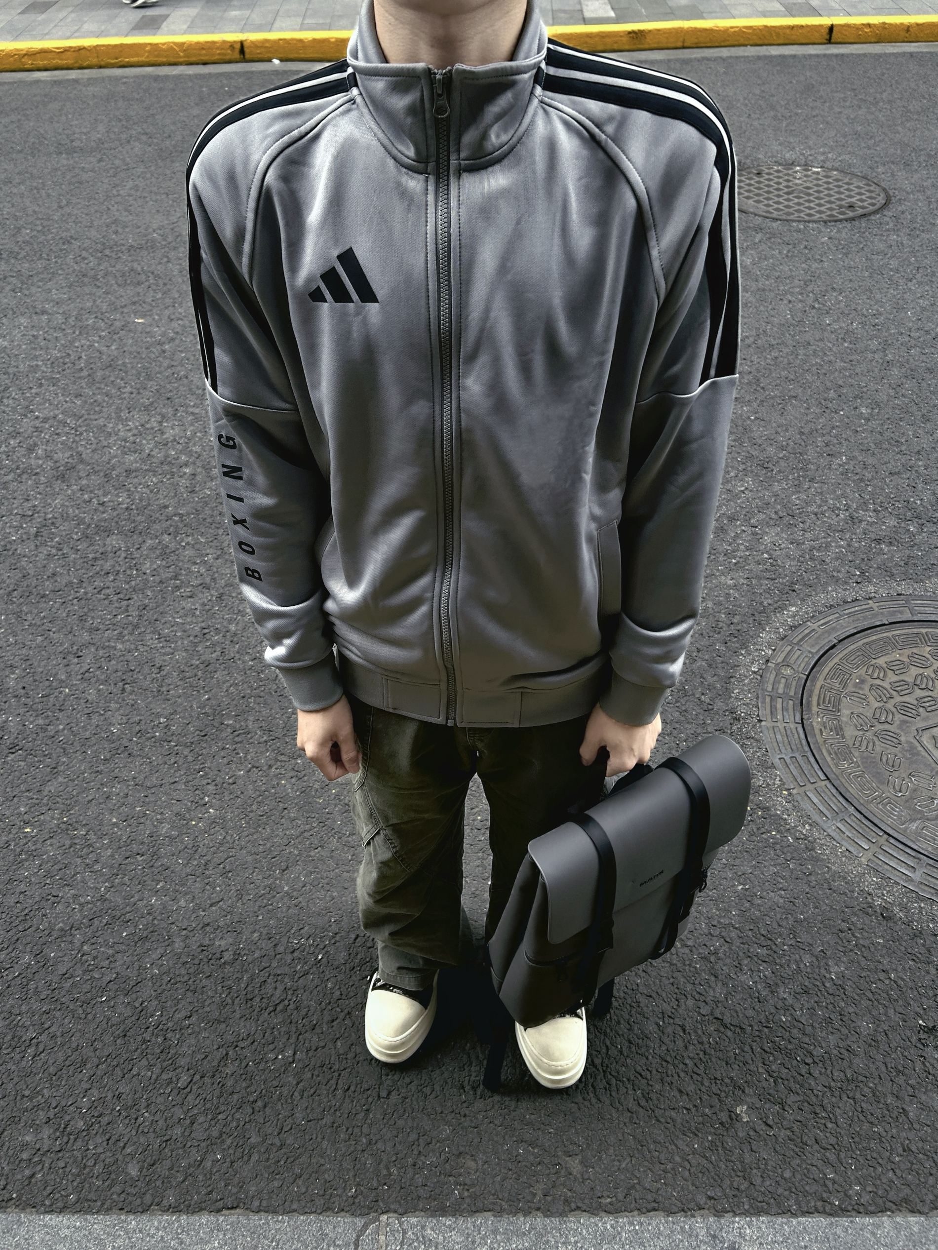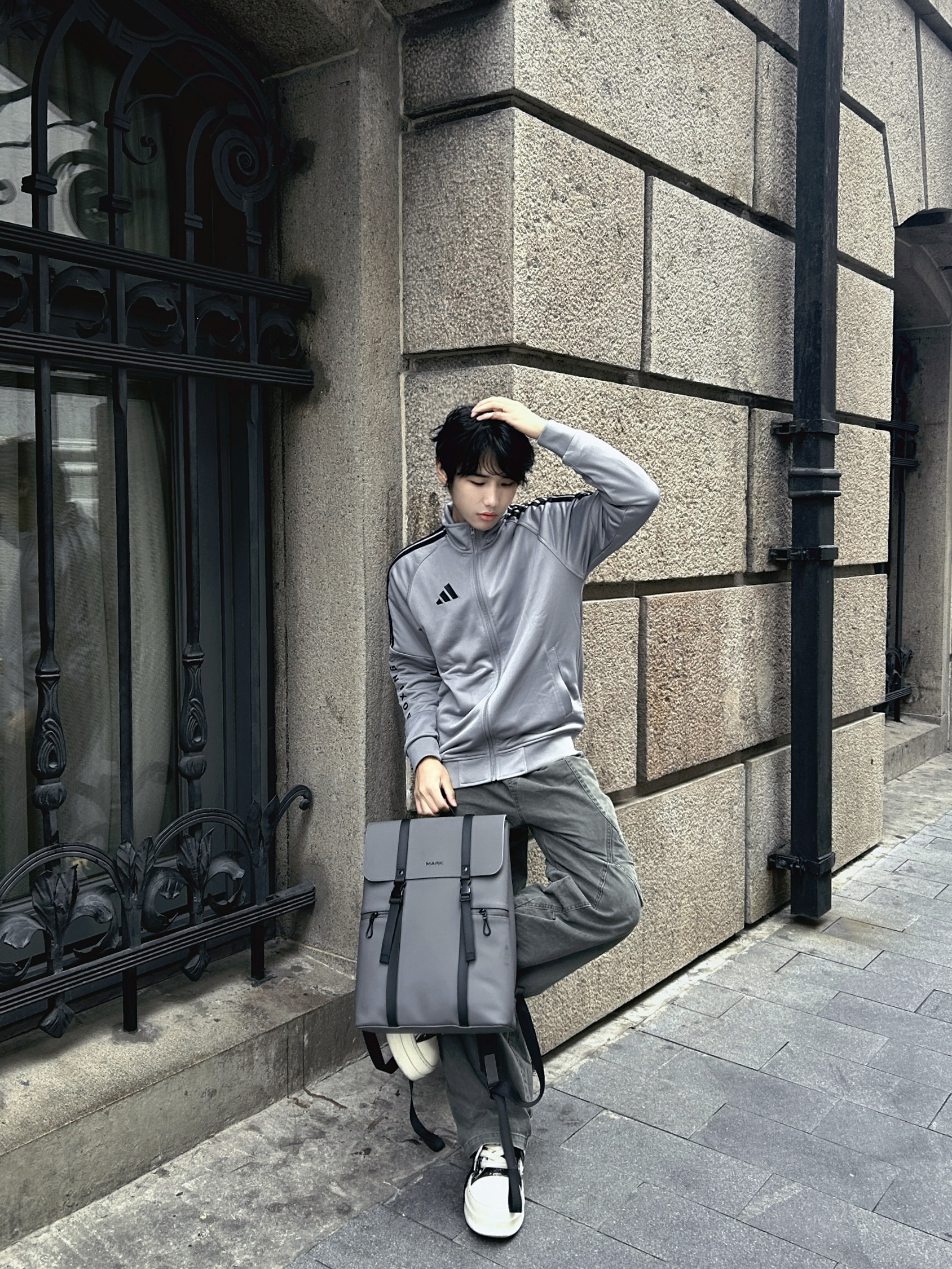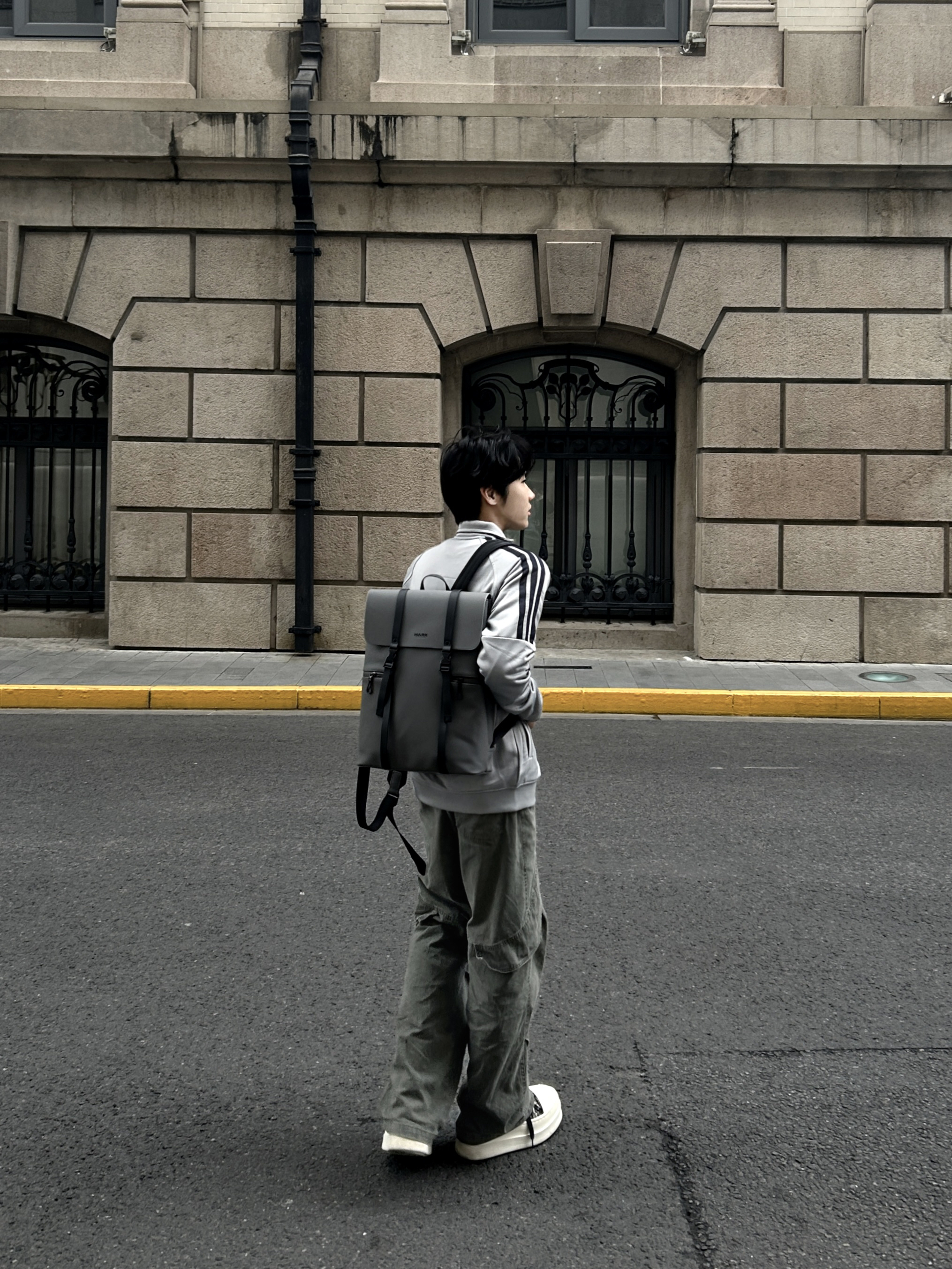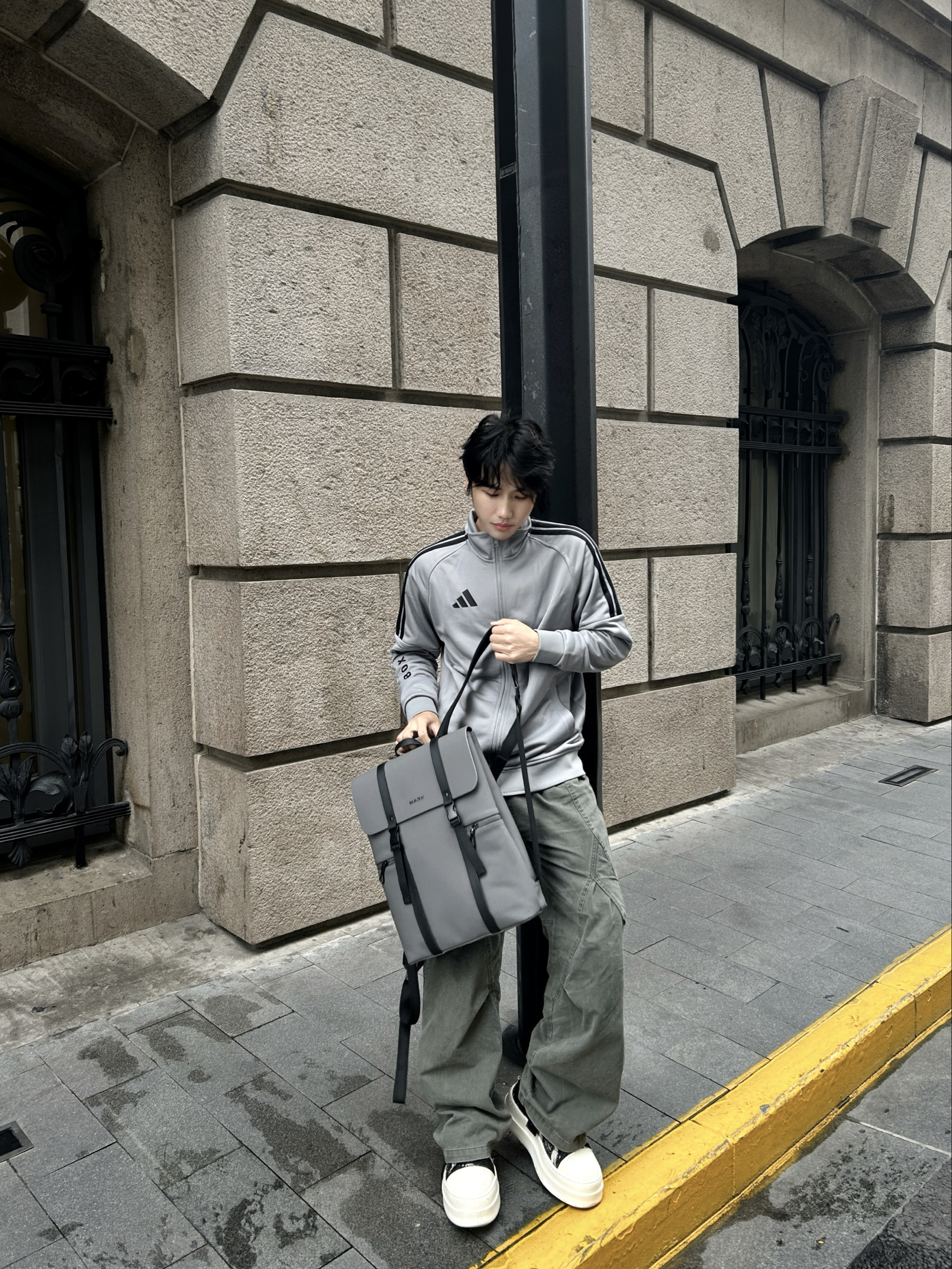 阴雨天的街头 用一身低饱和灰调压住浮躁 Clean Fit的松弛感是最好的情绪解药。👻 挺括版型的灰色侧边条纹运动外套 搭配做旧水洗灰绿工装裤 利落线条中和了宽松廓形的慵懒感 脚踩黑白拼色厚底鞋增加视觉重心👁️🗨️ 再配上同色系方形双肩包 整体简约 Cityboy的松弛感这不就拿捏了~