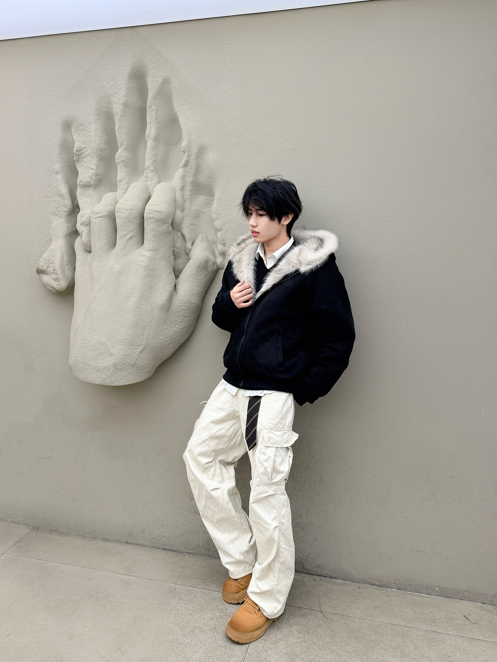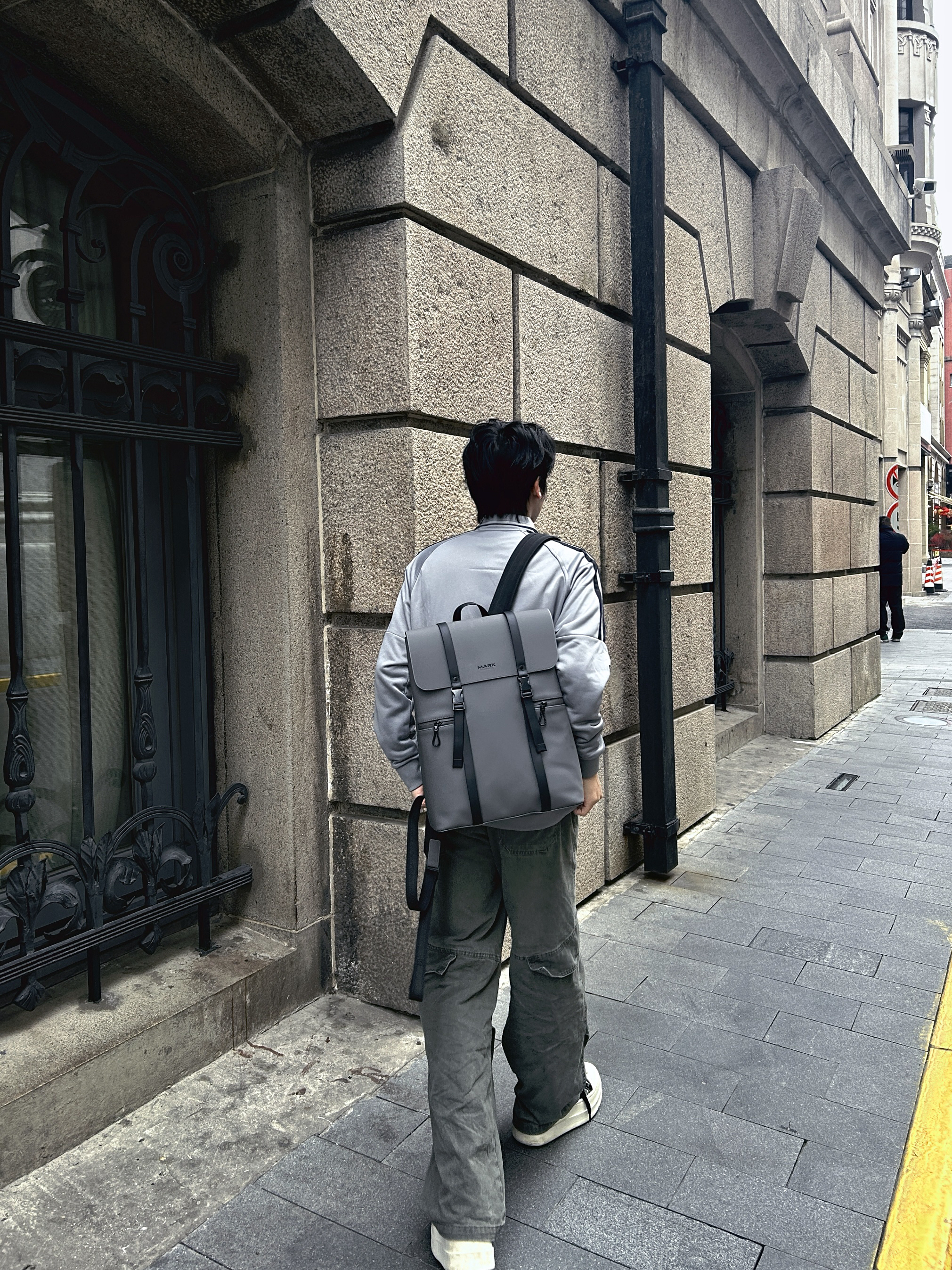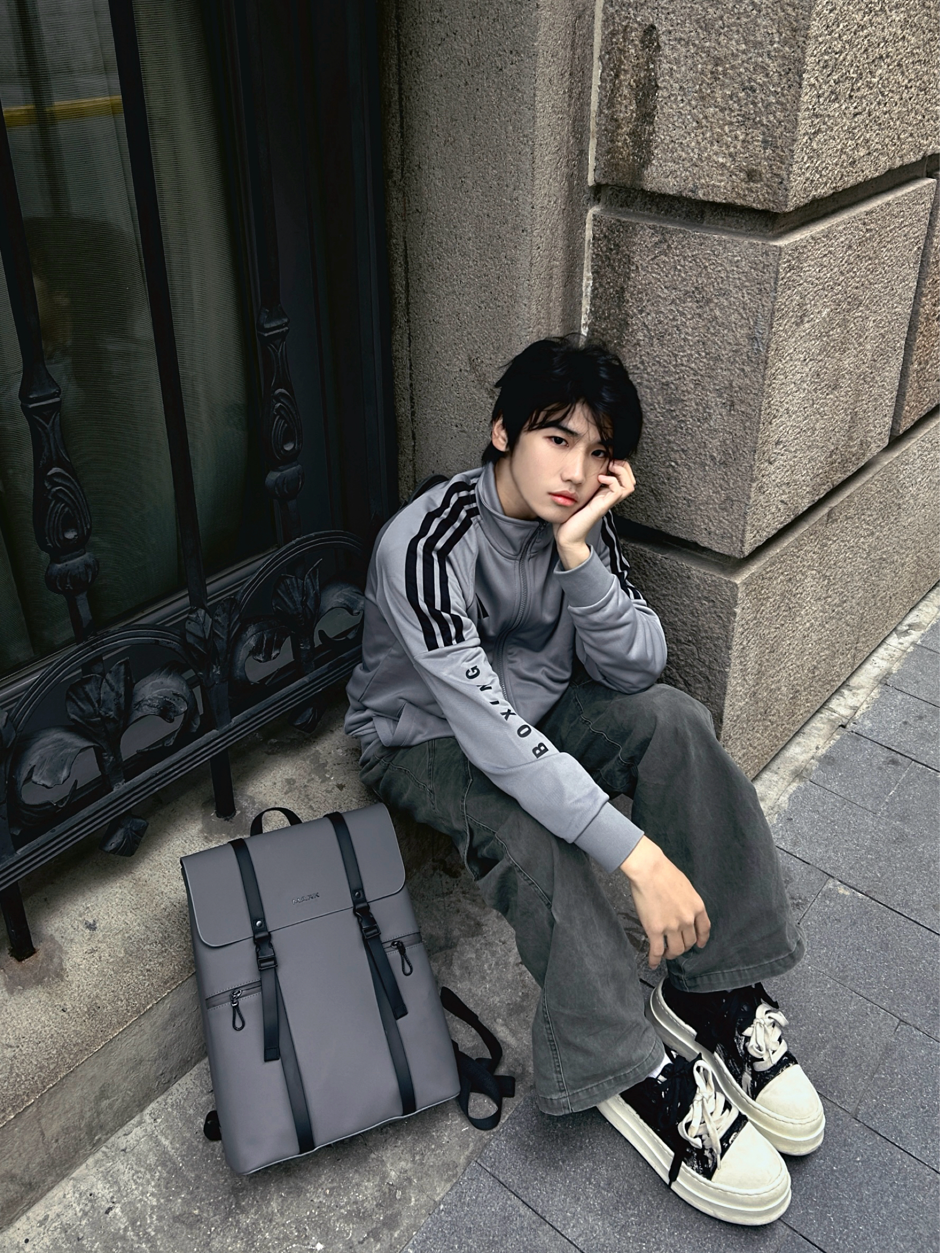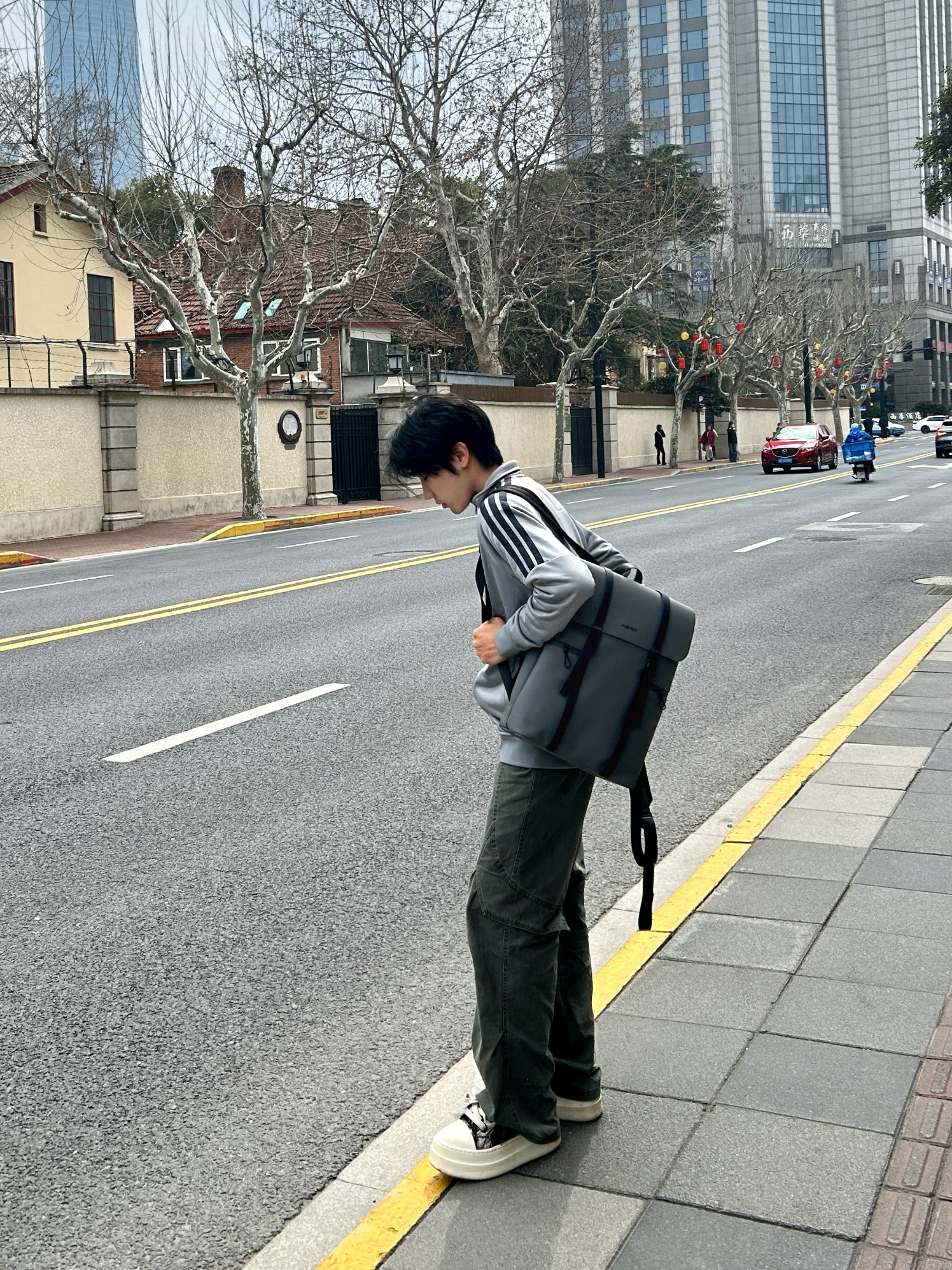 阴雨天的街头 用一身低饱和灰调压住浮躁 Clean Fit的松弛感是最好的情绪解药。👻 挺括版型的灰色侧边条纹运动外套 搭配做旧水洗灰绿工装裤 利落线条中和了宽松廓形的慵懒感 脚踩黑白拼色厚底鞋增加视觉重心👁️🗨️ 再配上同色系方形双肩包 整体简约 Cityboy的松弛感这不就拿捏了~