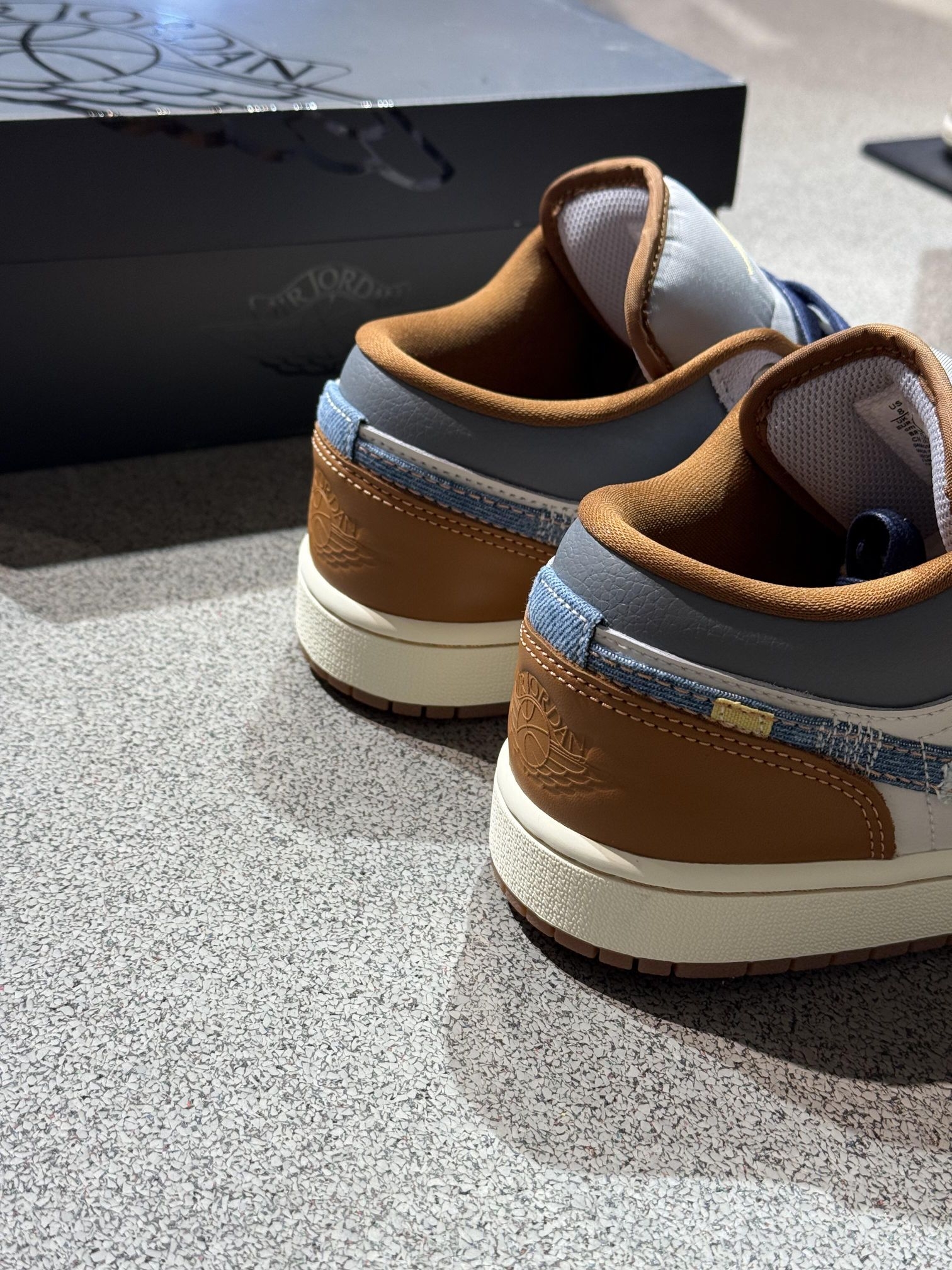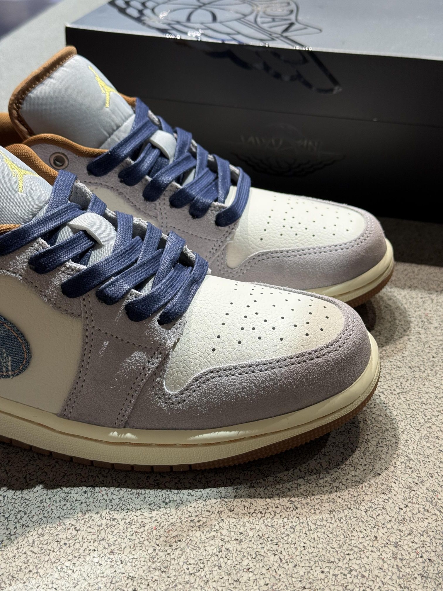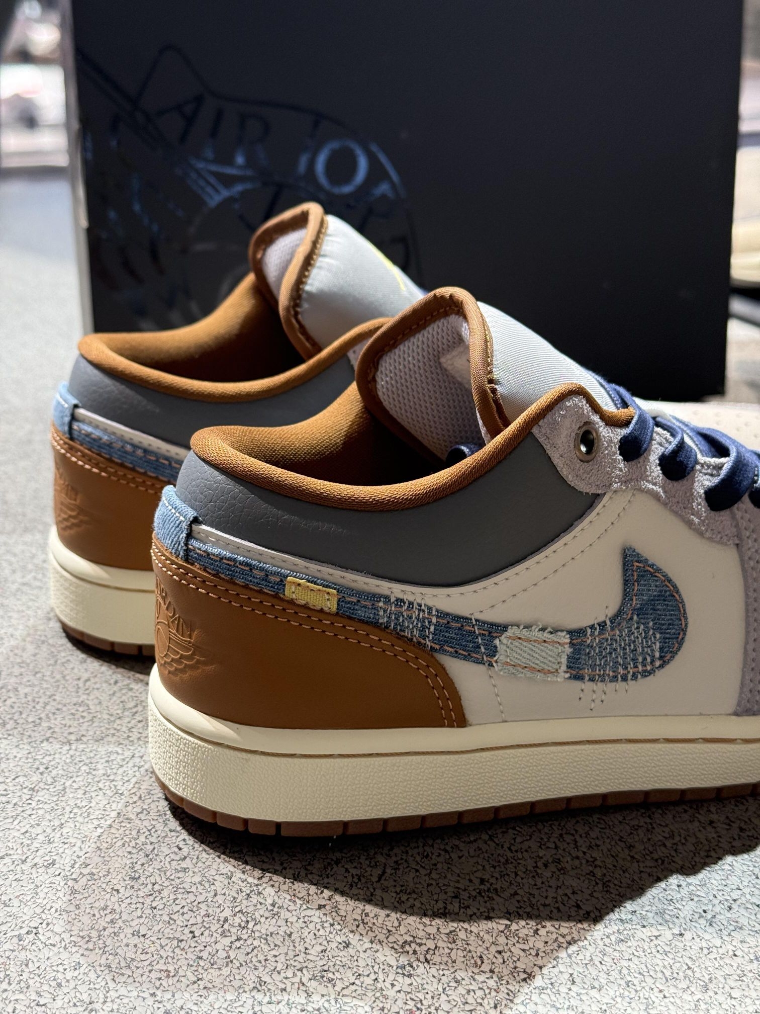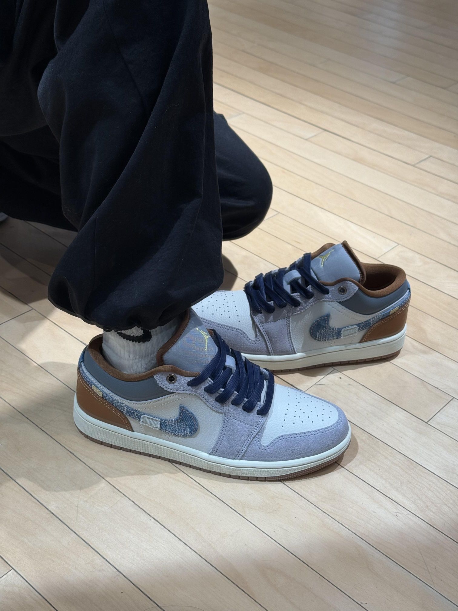 AJ1 Low丹宁牛仔|复古党狂喜💙 白灰麂皮+牛仔勾+焦糖后跟 低帮显腿长,百搭又耐脏 春天的氛围感直接焊在脚上 谁穿谁是美式复古潮人😆